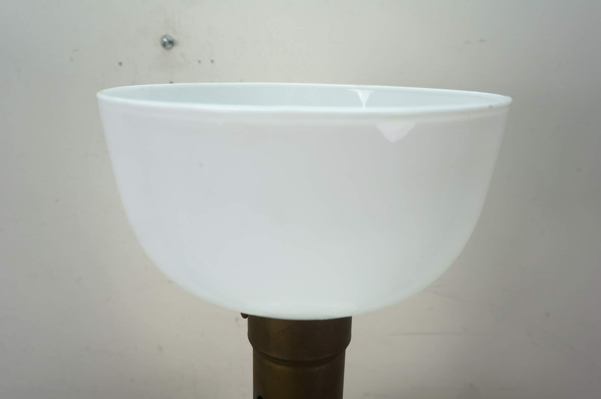 Fair condition, wear and distressing from age and use, some damage to shade - creasing / dents / staining / warping, finish loss / marking to wood base, one missing prong screw for torchiere.