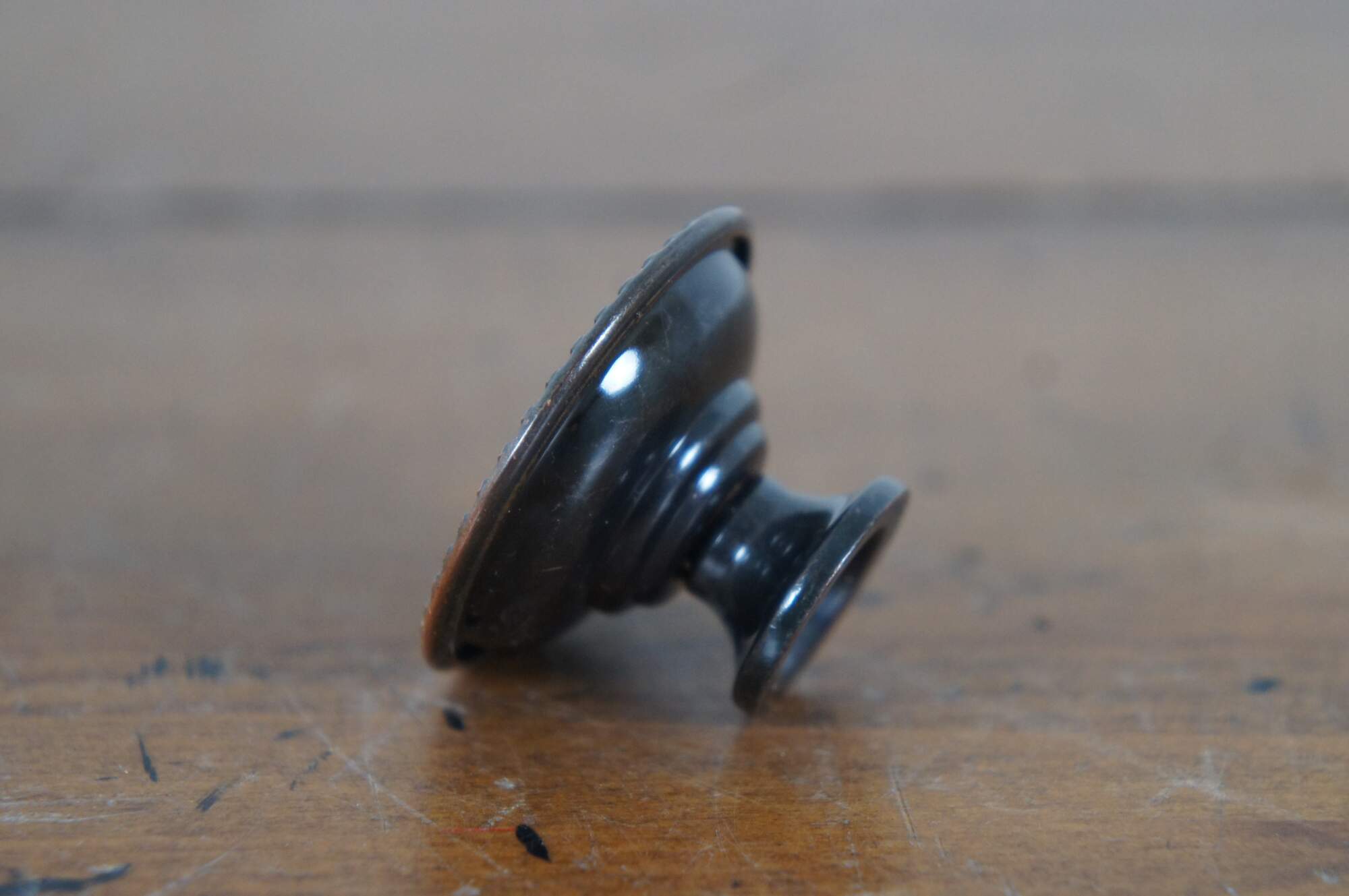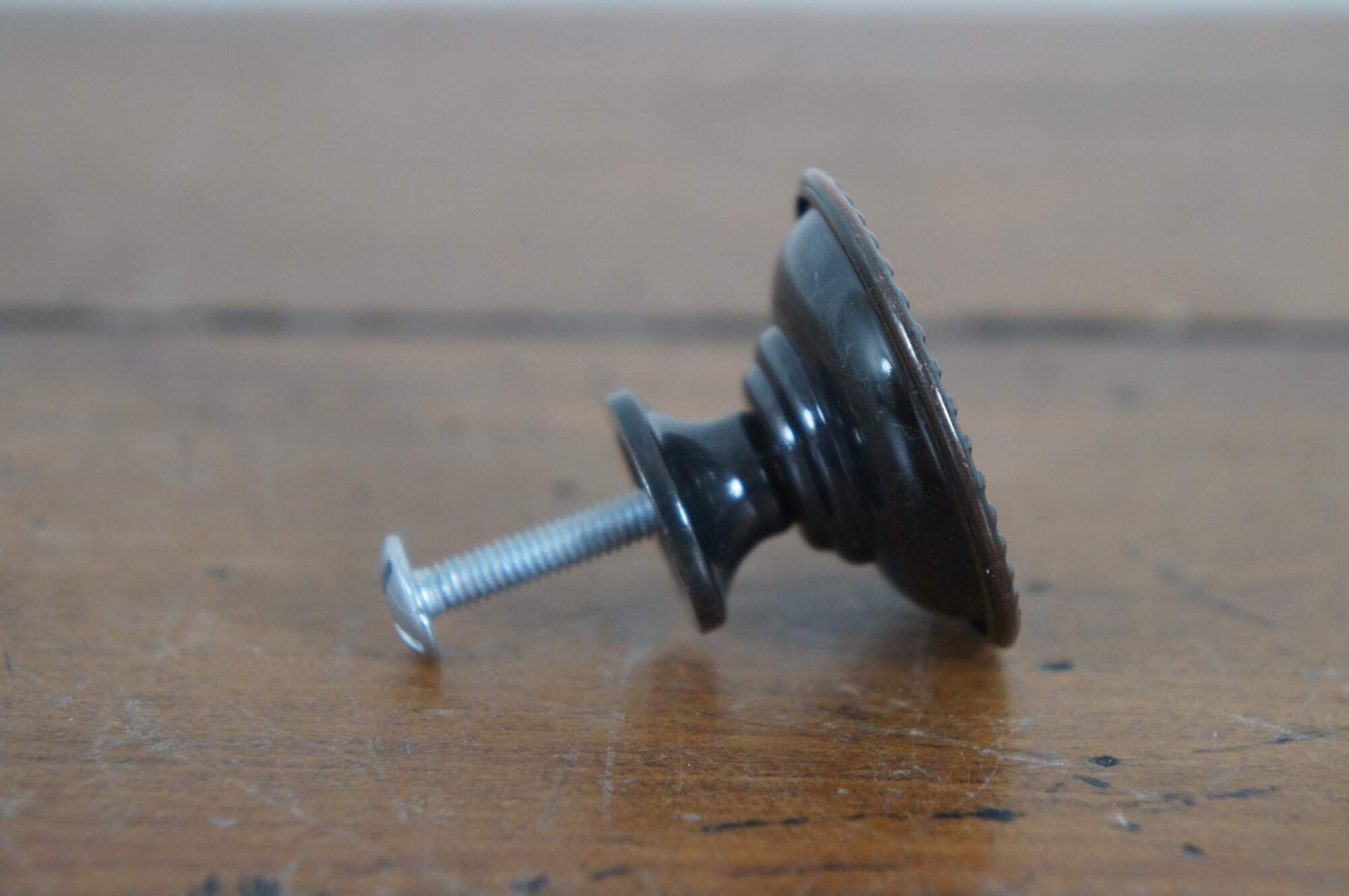 11 Available - Mid to late 20th century old-stock drawer / cabinet pulls. National Lock Company - Medalist, item number C606-10D Knob. Antique bronze finish. Round / circular shape with spiral sunburst at center, framed in concentric grooves and beaded edge.