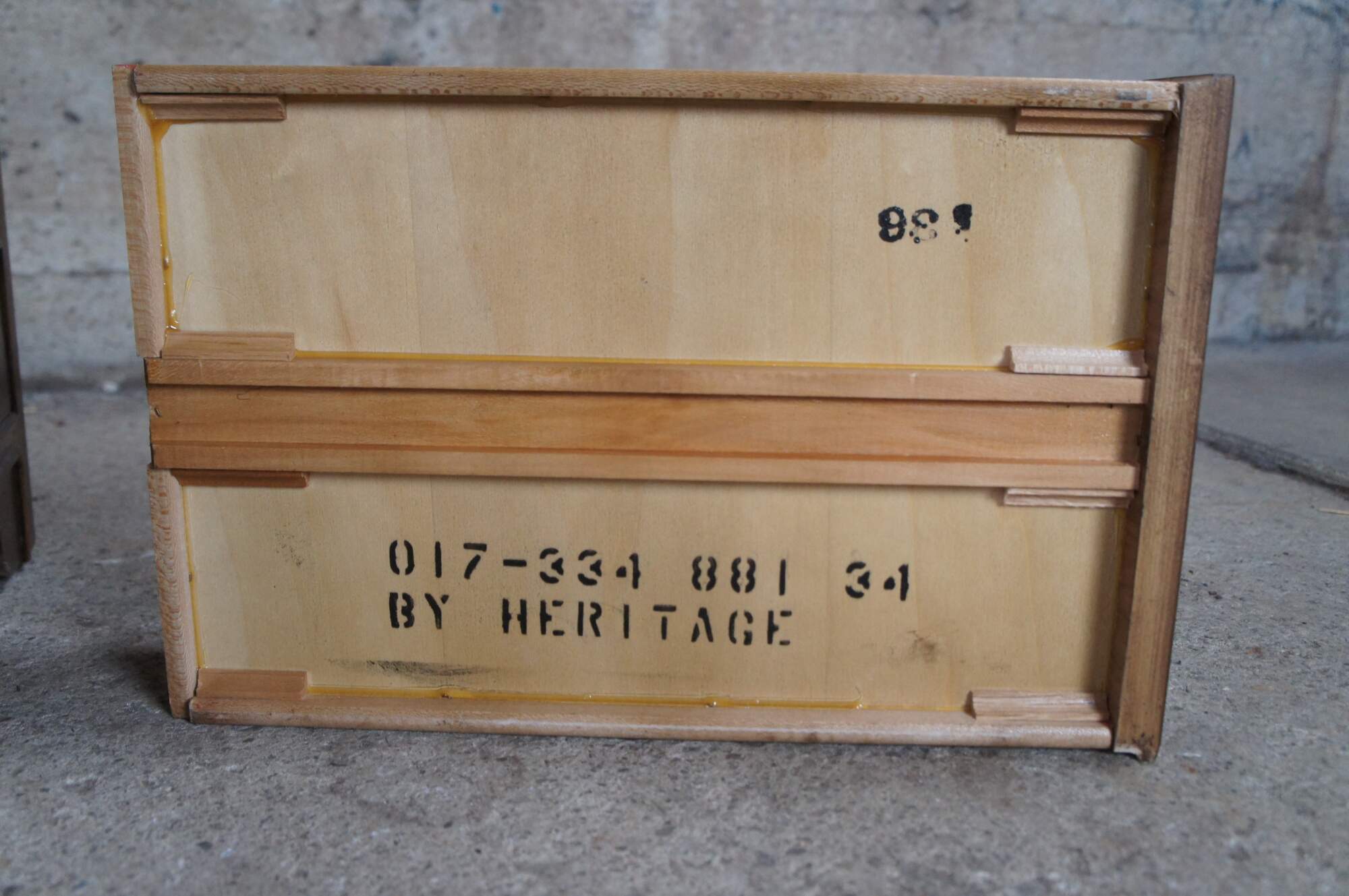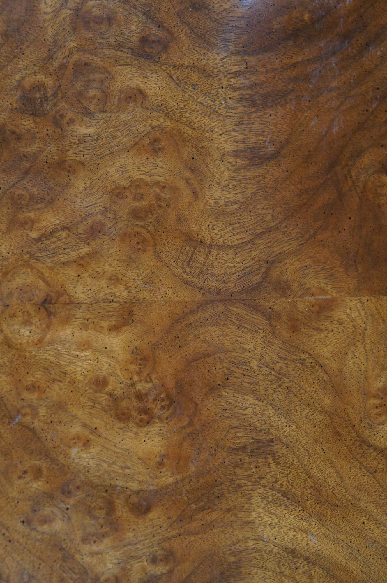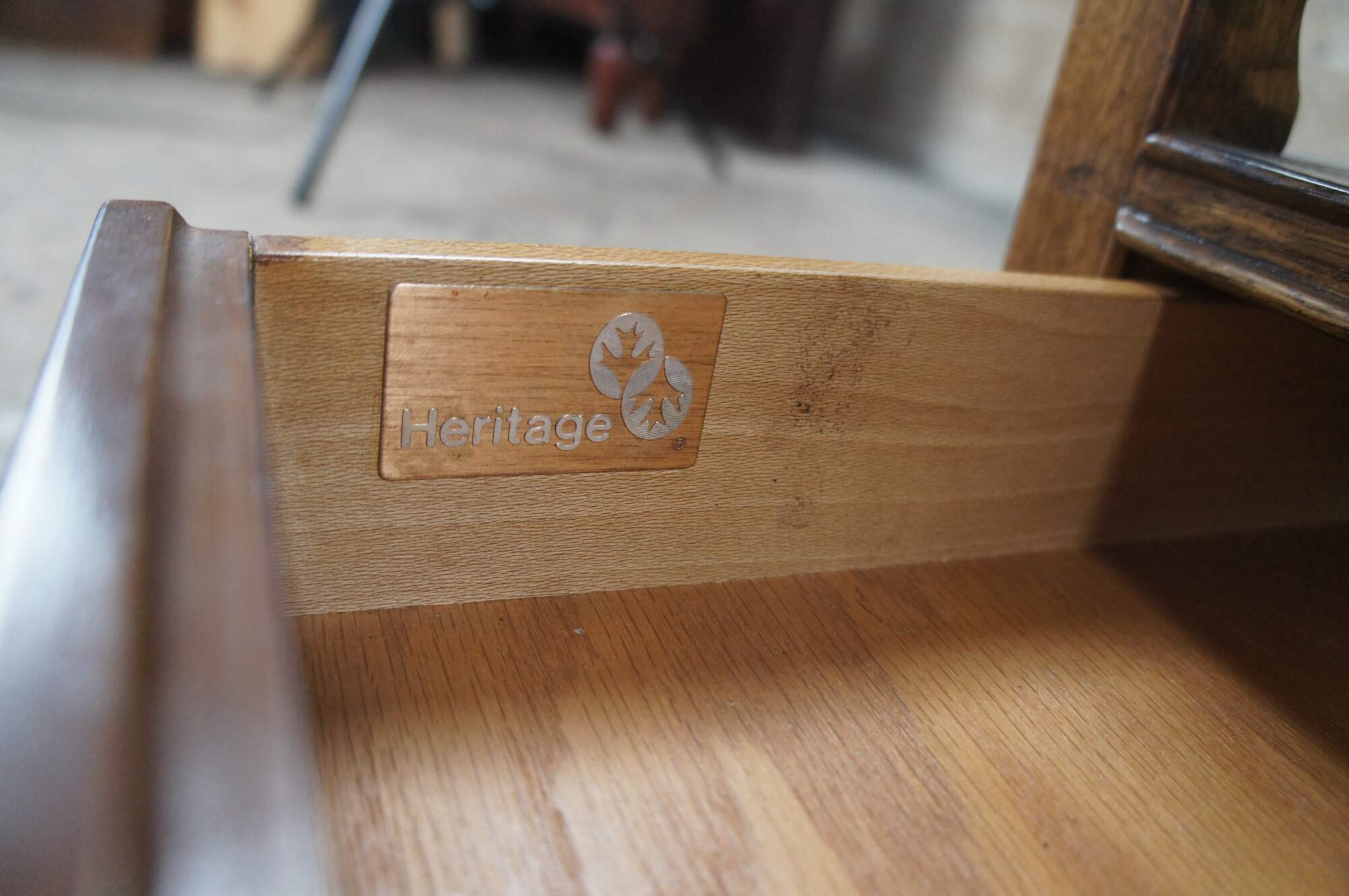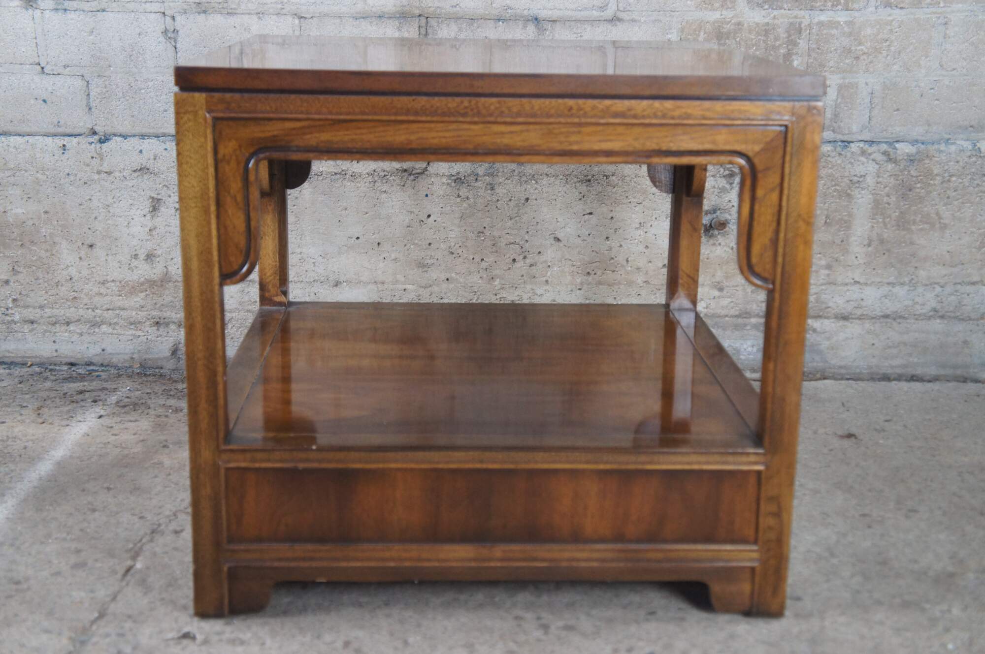 1980s Drexel Heritage Chinoiserie / Campaign style side table. Features a square form walnut with matchbook burl and banded top. The table showcases chinoiserie moulding, a central shelf and two dovetailed drawers with inset brass hardware. Marked Drexel Heritage North Carolina, 017-334, 881