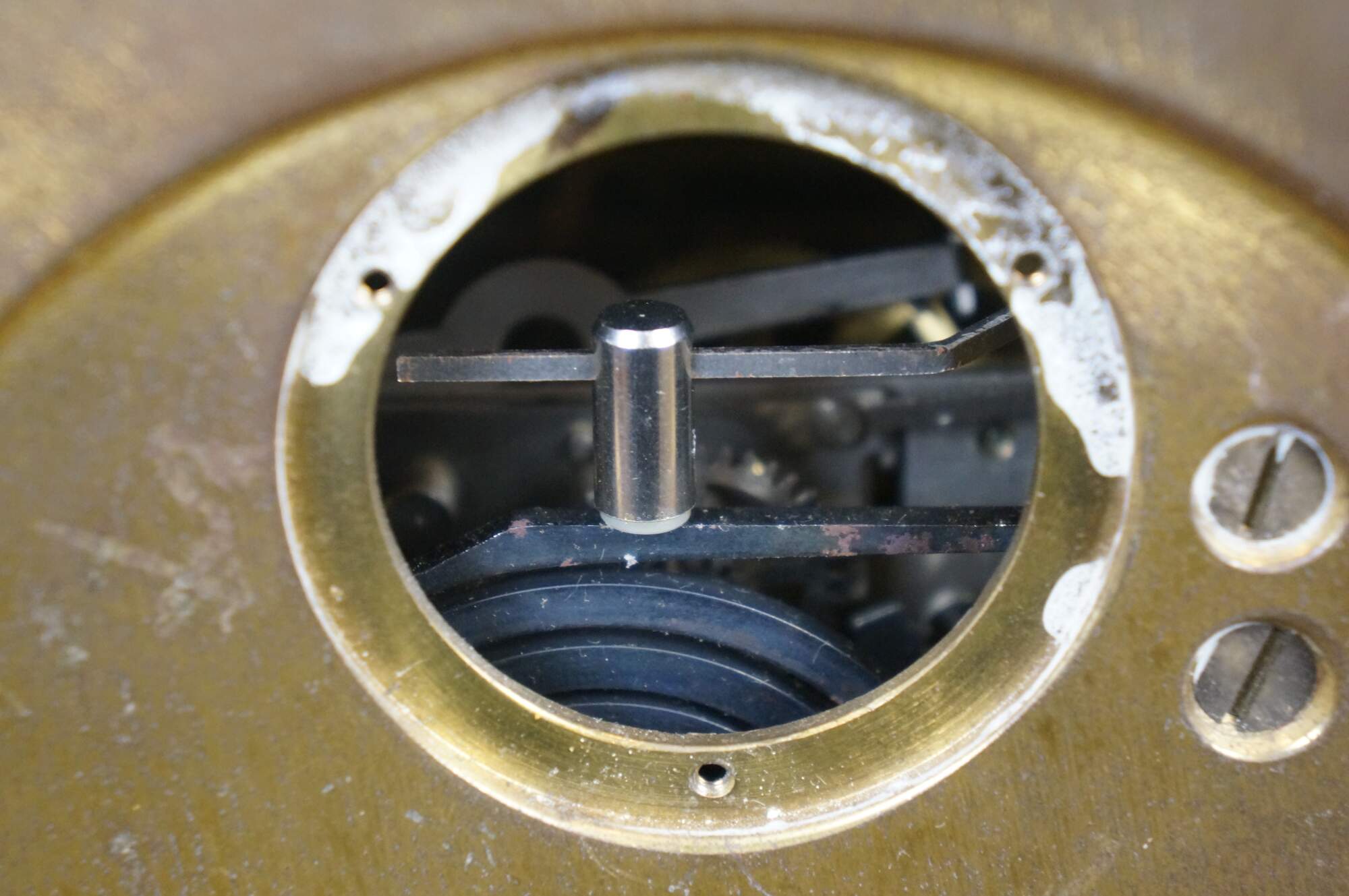 Late 20th century Salem Ships Bell desk / table clock. Brass case in the shape of a porthole surrounded by a ship's wheel / helm, set on a rectangular wood base. Champagne gilt face with black Arabic numerals and hands. Key wound, 8 Day, Jeweled, Switzerland.