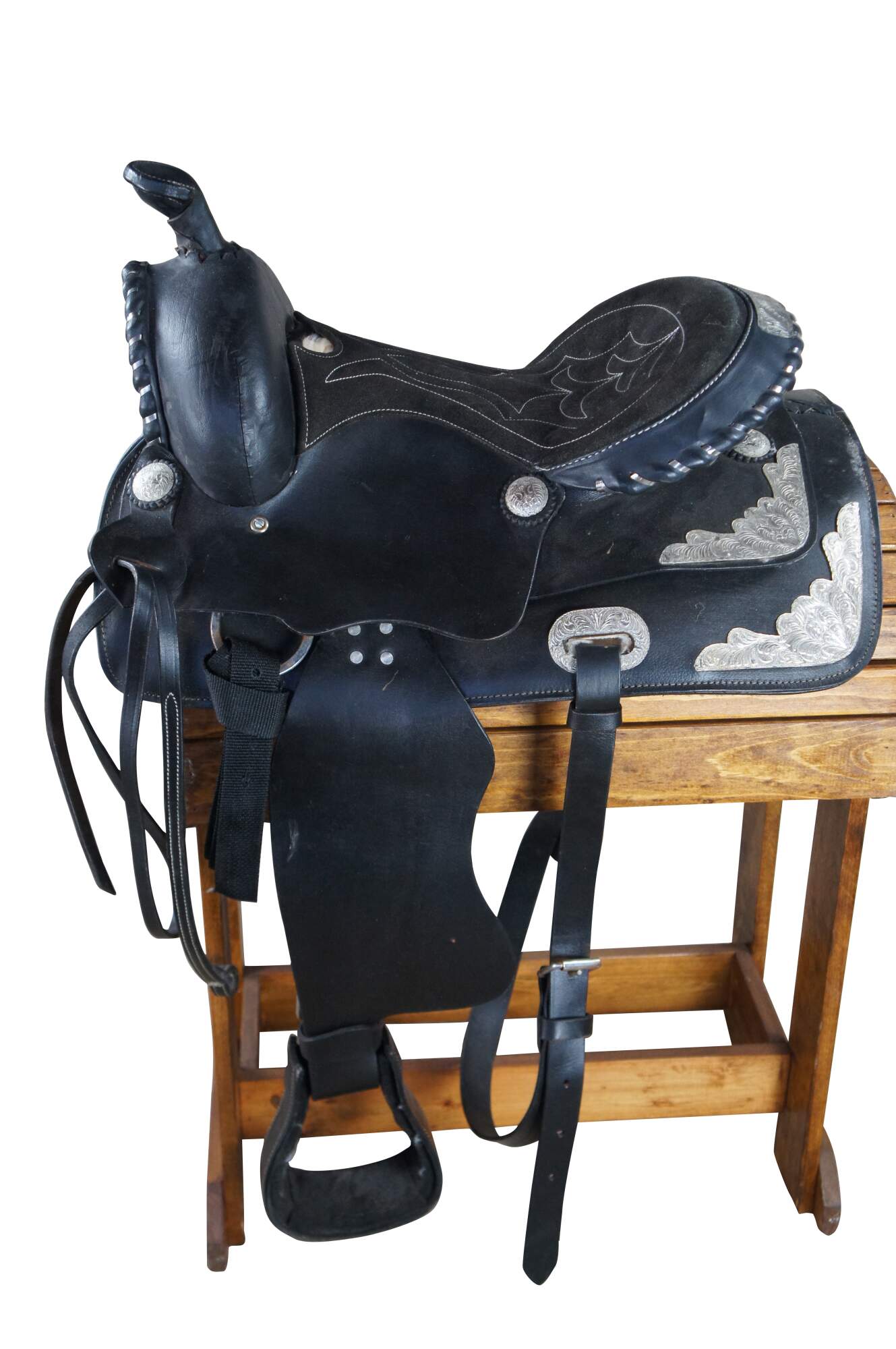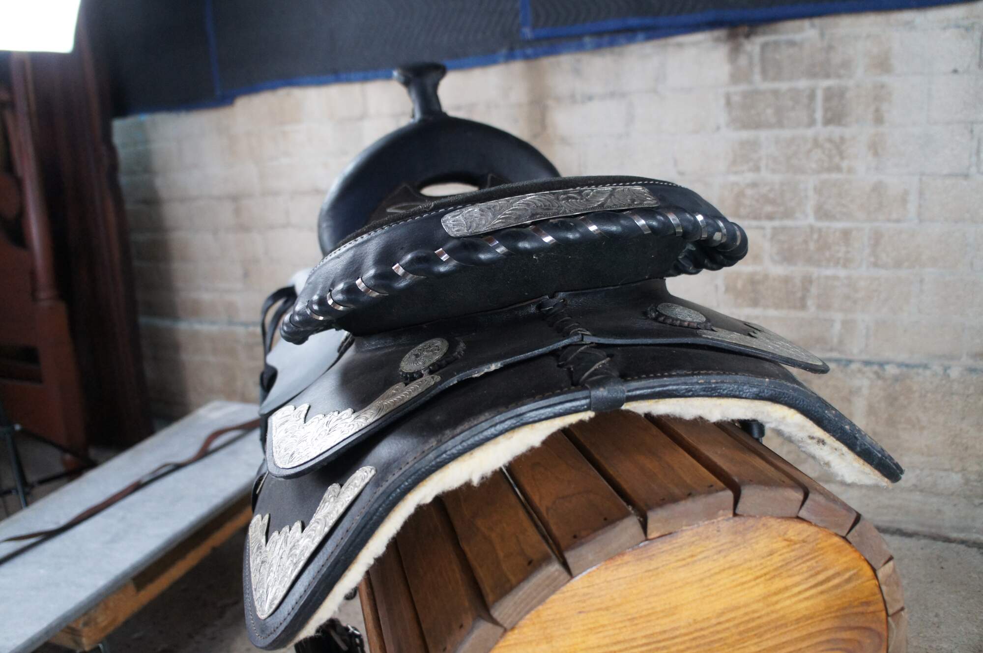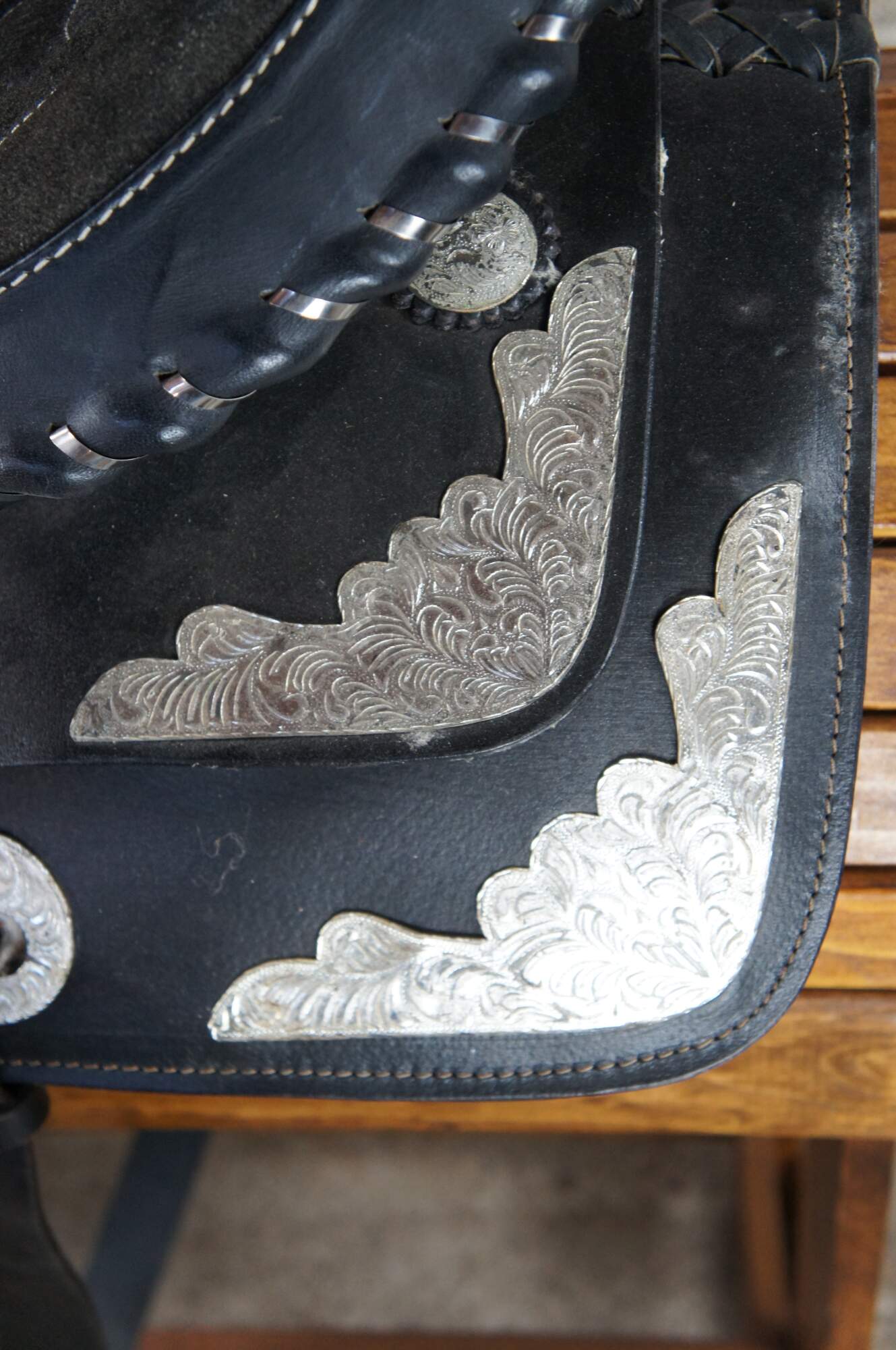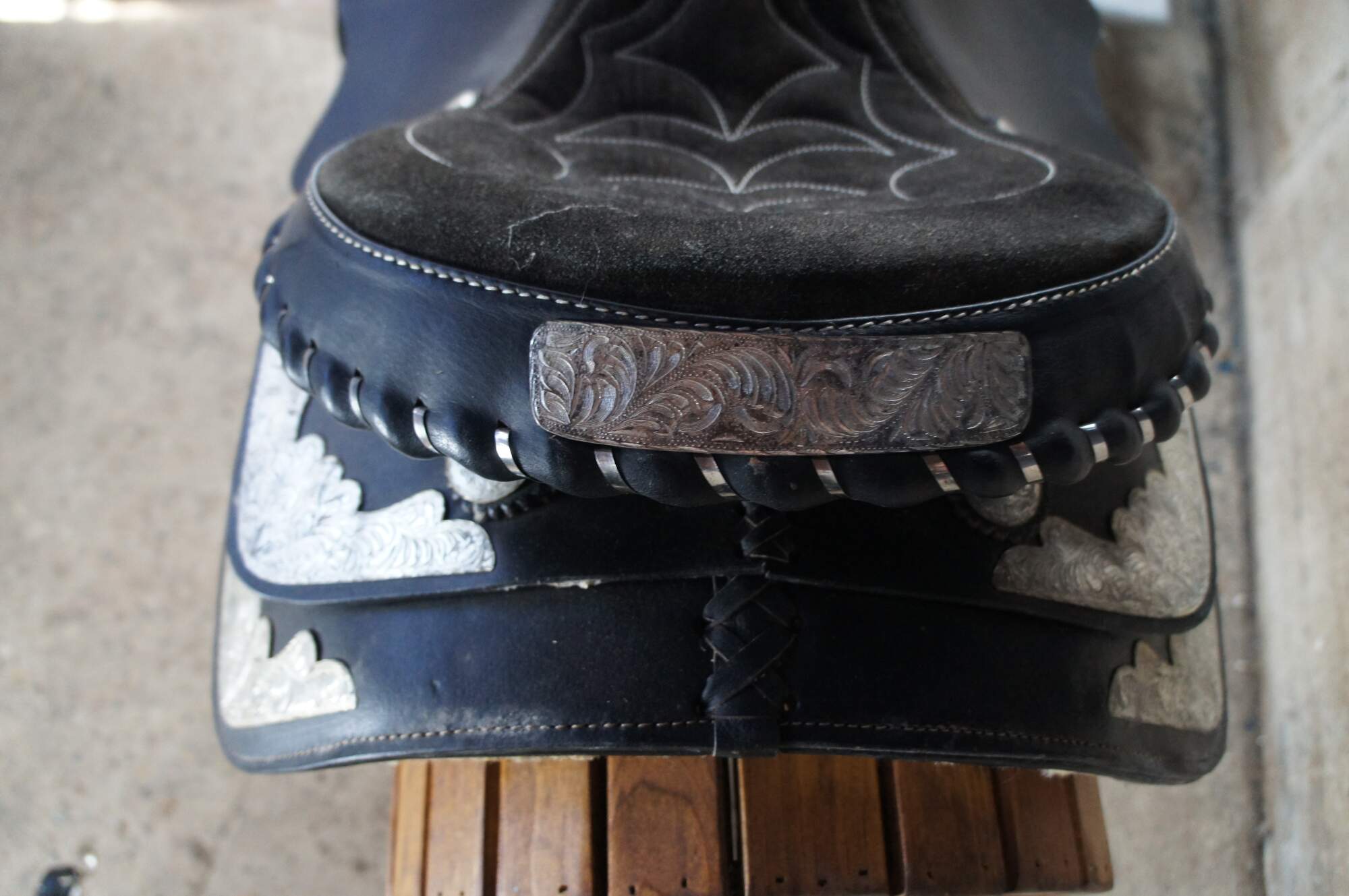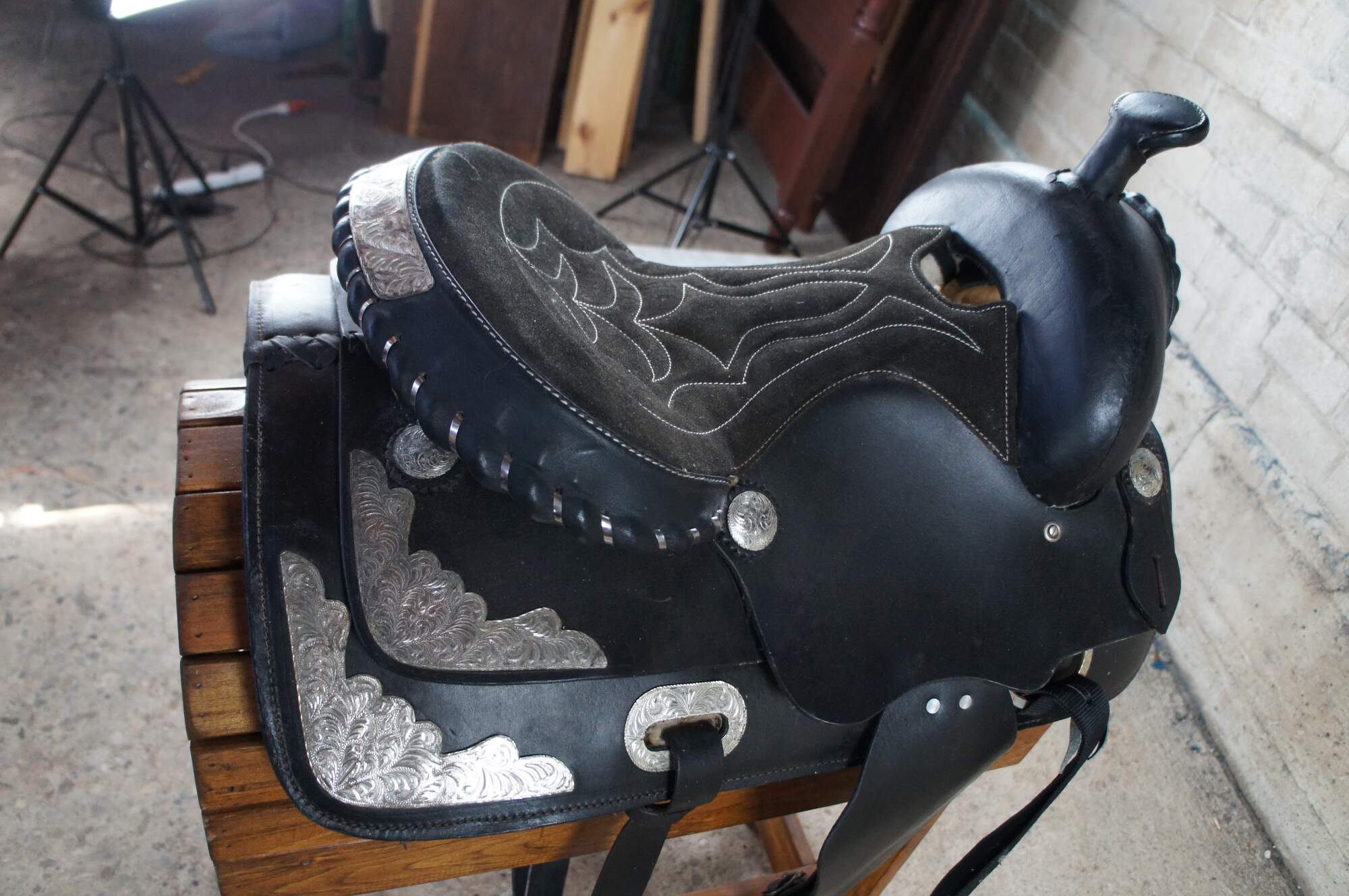 Vintage black and silver tooled leather horse saddle. Originally used at Due Process Horse Stables in NJ.