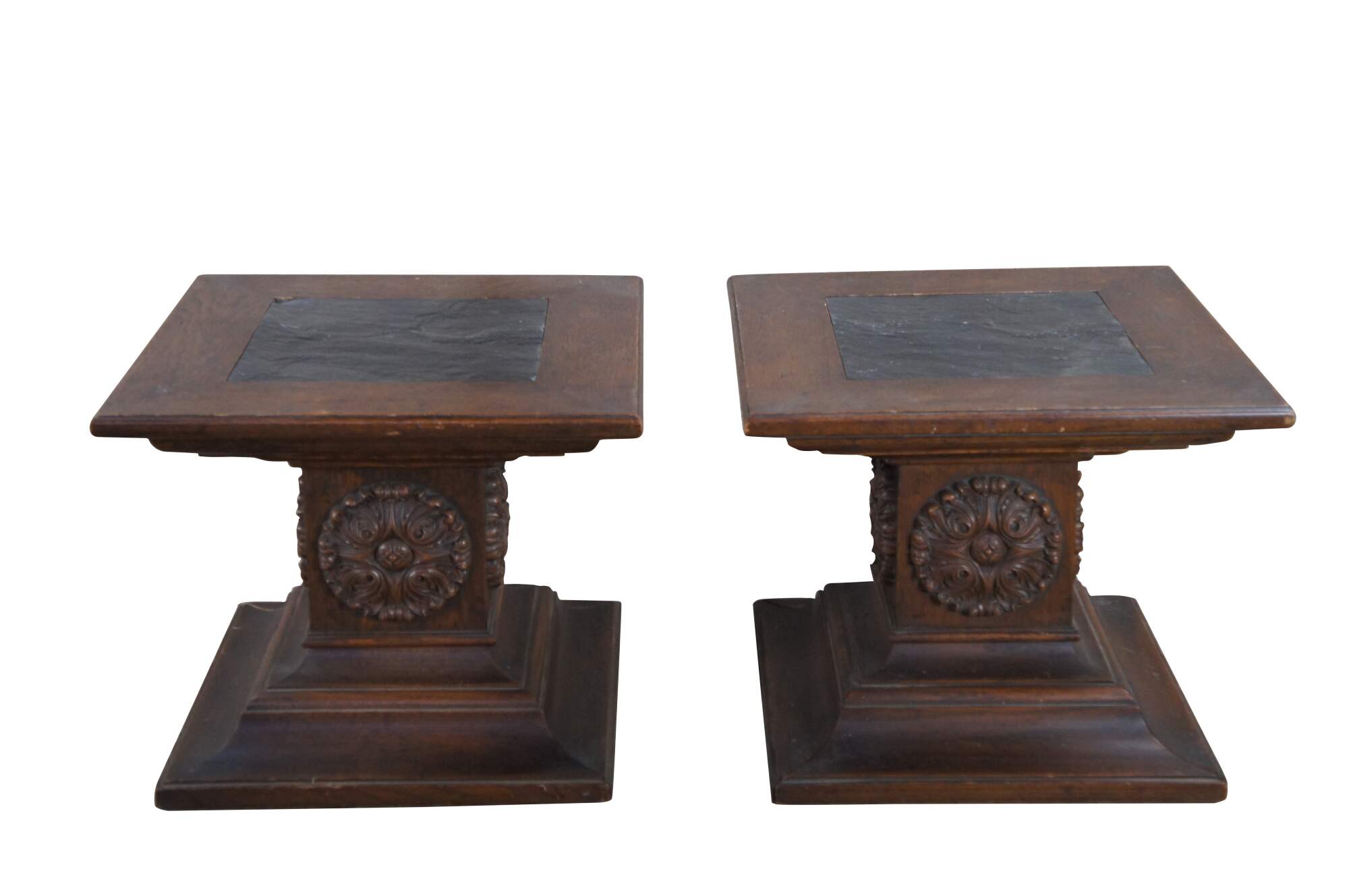 Pair of 1960s Drexel Grand Tour pedestal side tables. Made from oak with an inset slate top over a central column with round carved medallion and stepped plinth base. Marked along underside Heritage Grand Tour, 23-507-43. Great for use as end tables, pushed together for use as a coffee table or sculpture / plant stands.