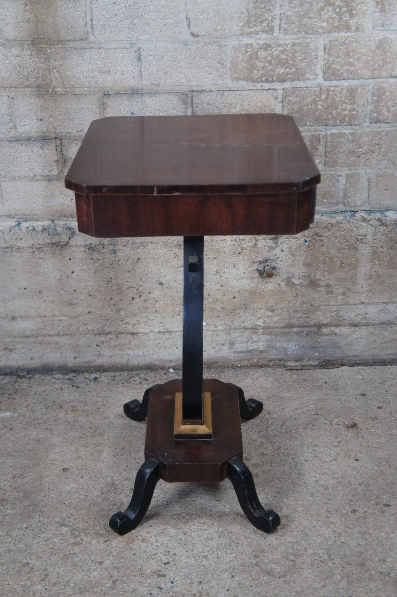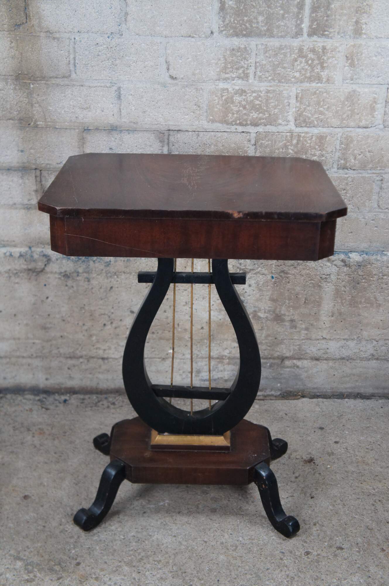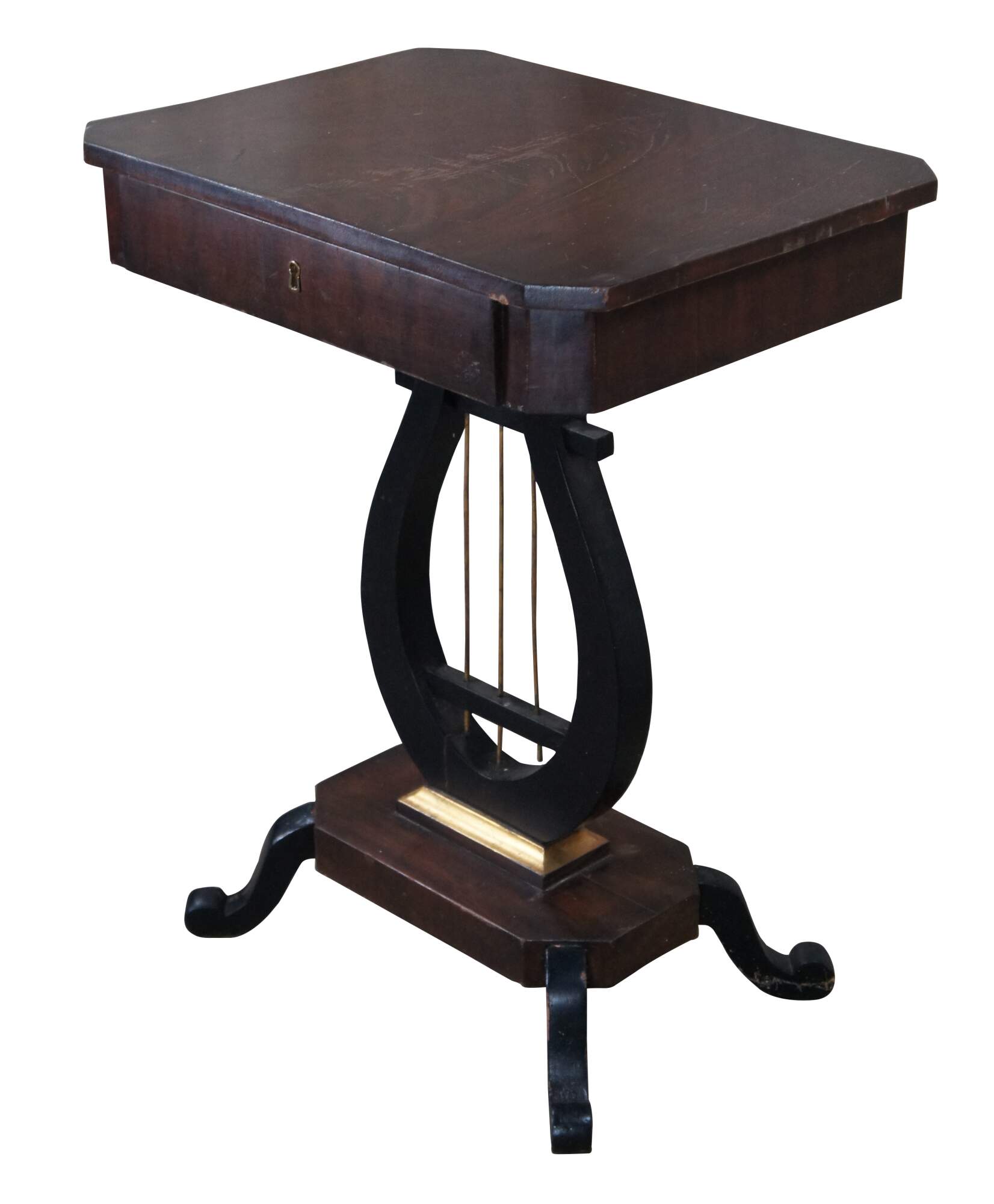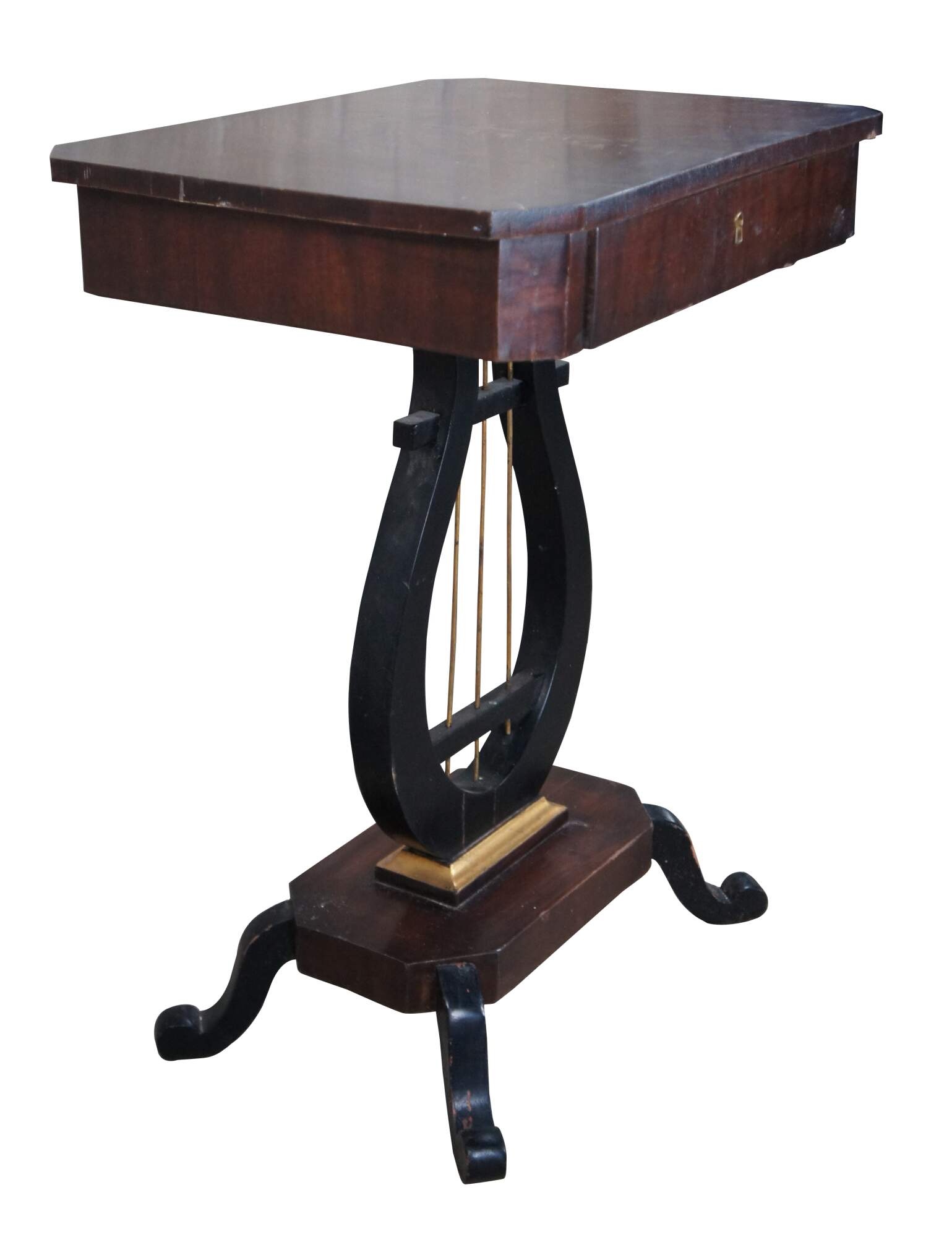 Early 20th Century Duncan Phyfe Style Occasional Sewing or Spool Table. Features a crotch mahogany frame over ebonized lyre base with brass rods and downswept scrolled feet. Includes a divided pine dovetailed drawer.