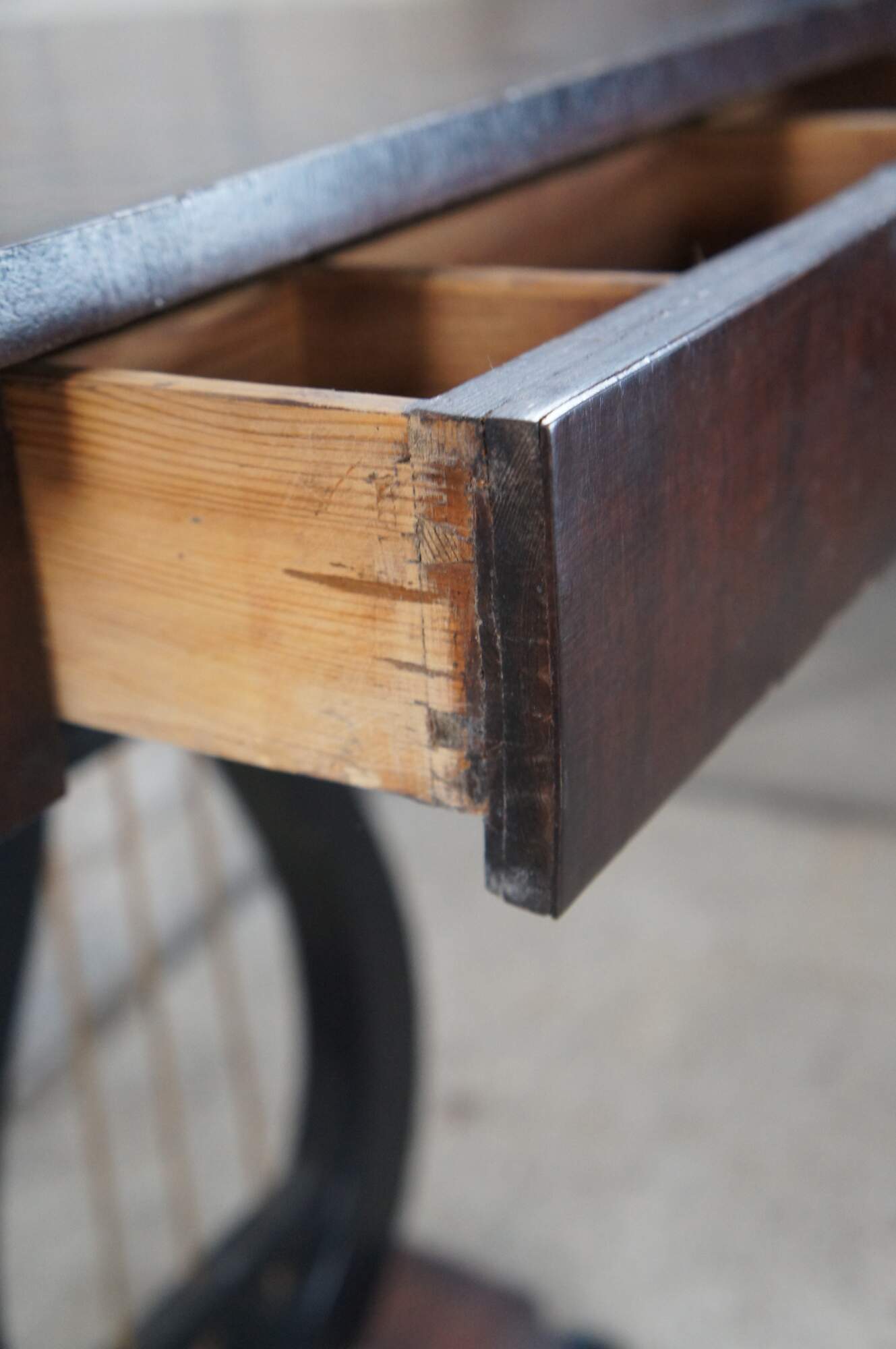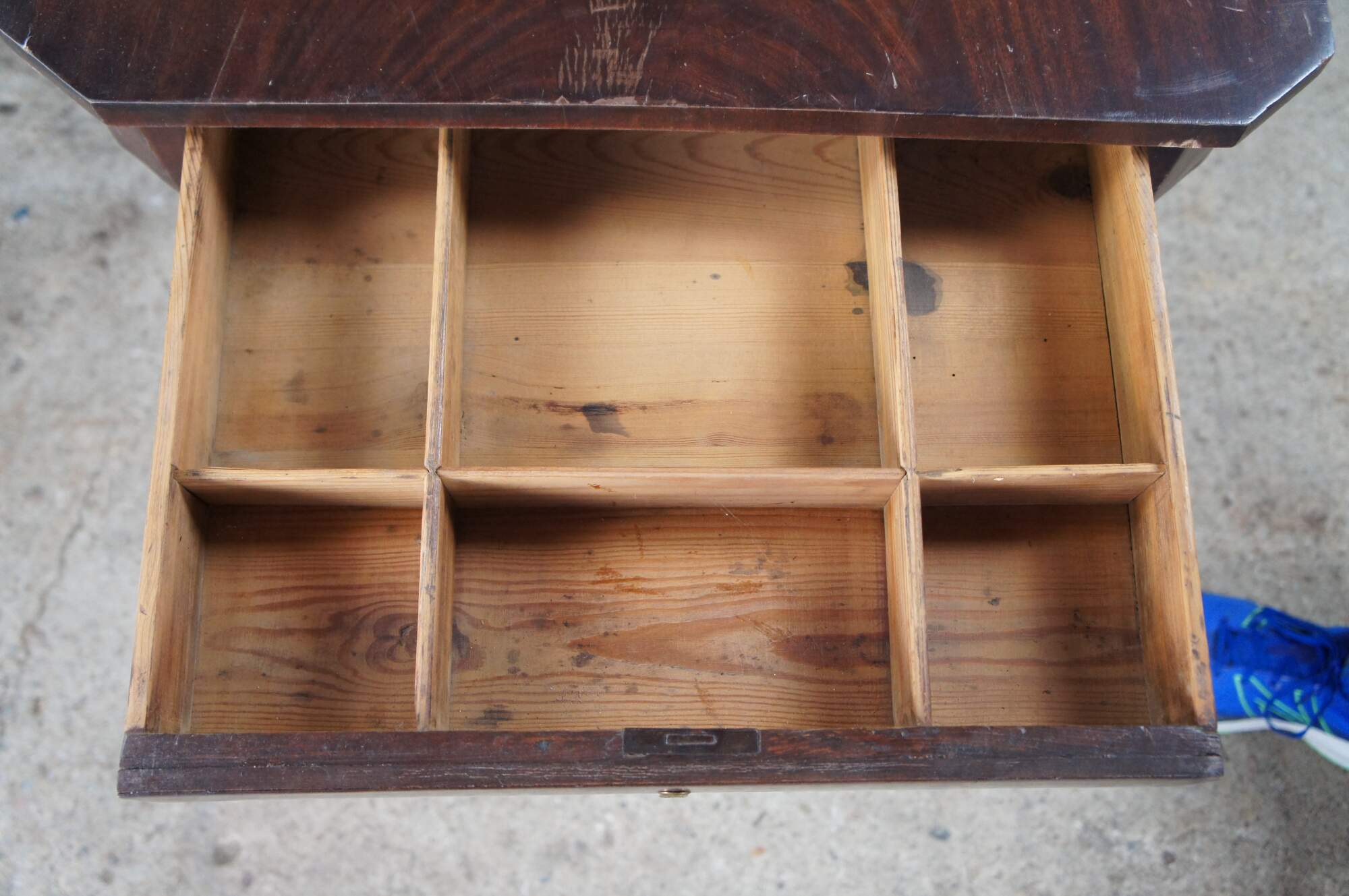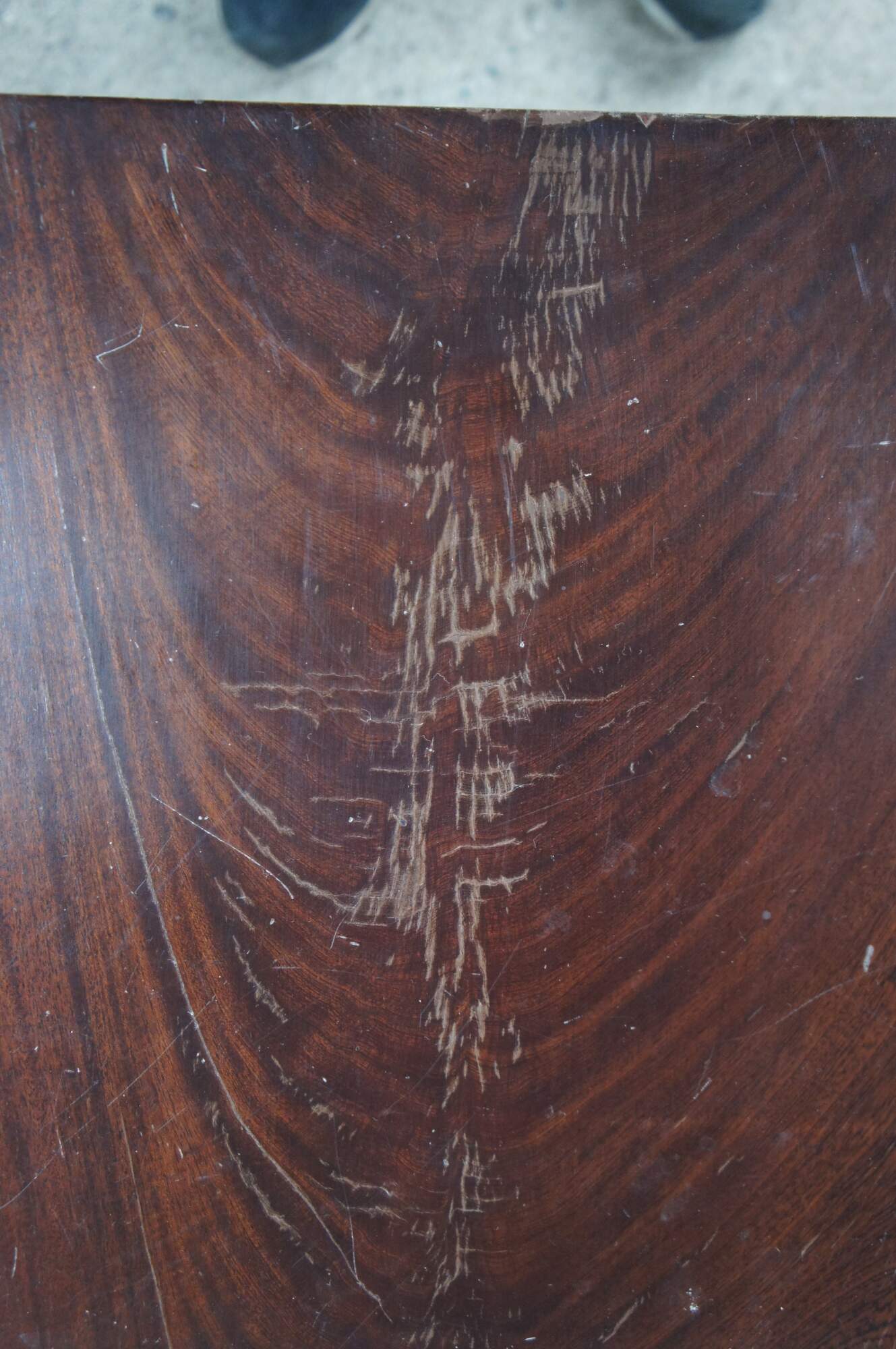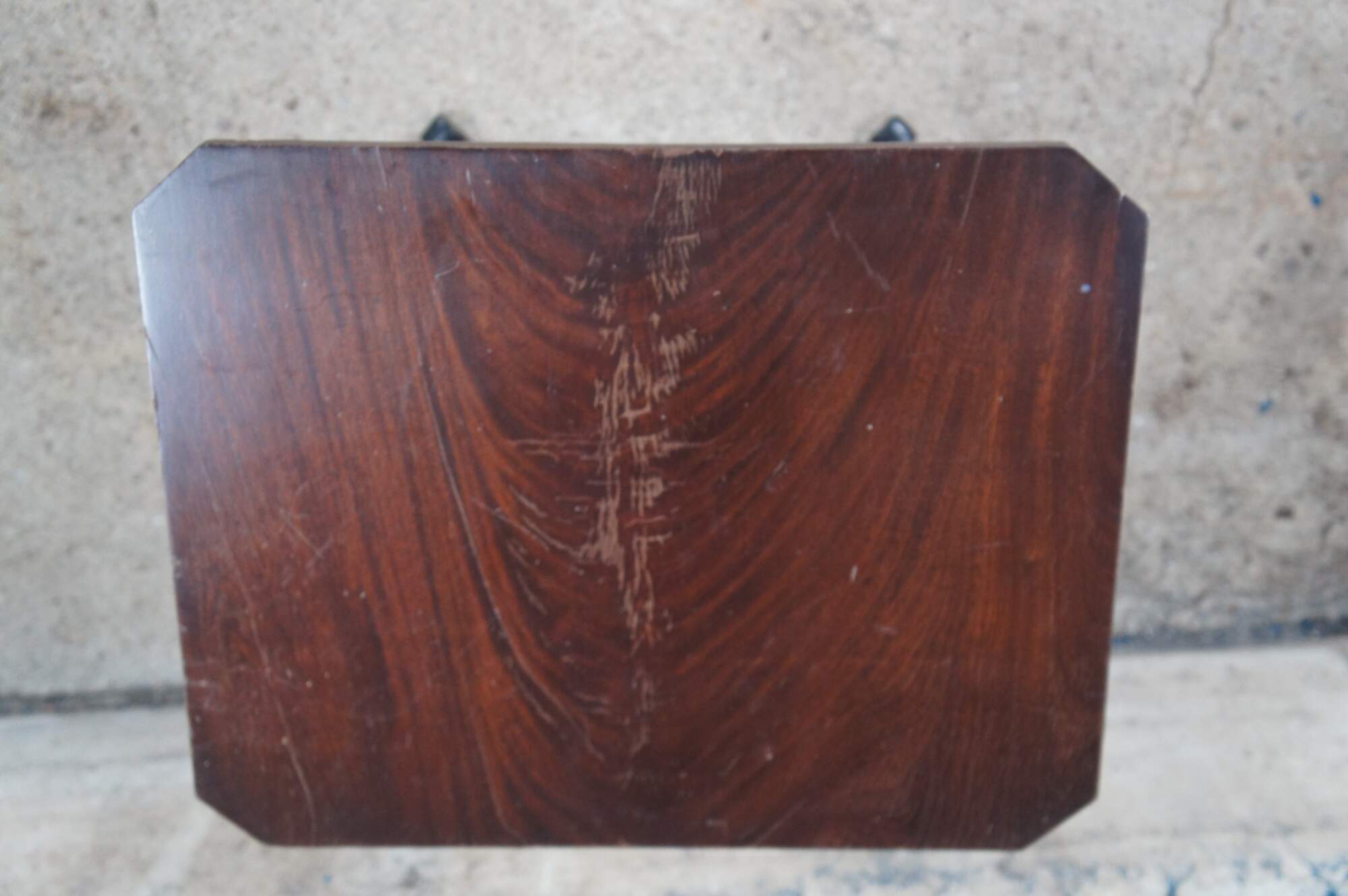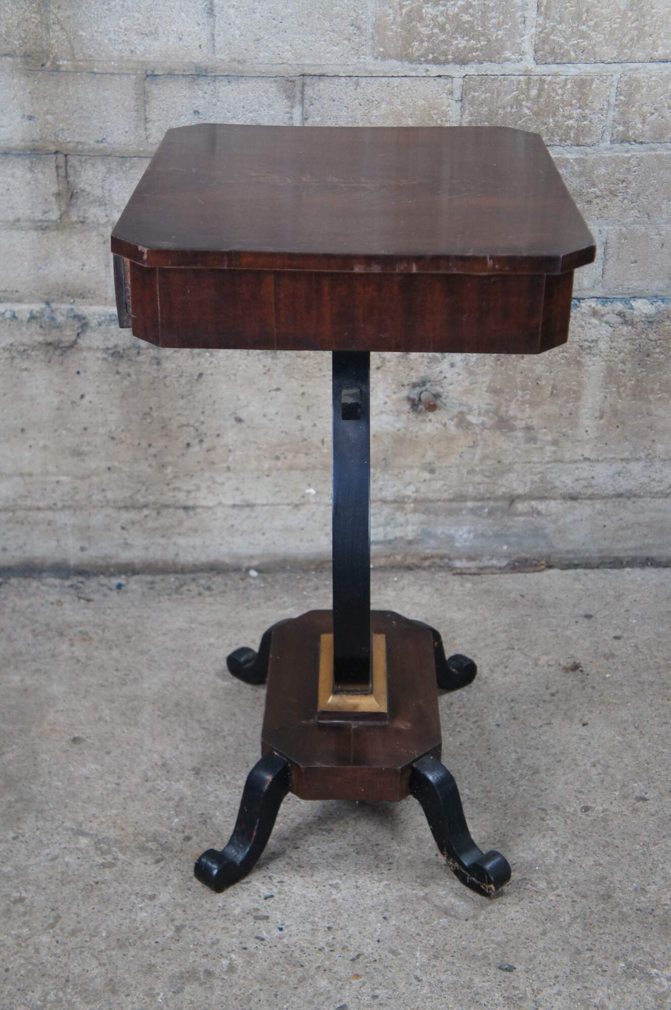 Early 20th Century Duncan Phyfe Style Occasional Sewing or Spool Table. Features a crotch mahogany frame over ebonized lyre base with brass rods and downswept scrolled feet. Includes a divided pine dovetailed drawer.