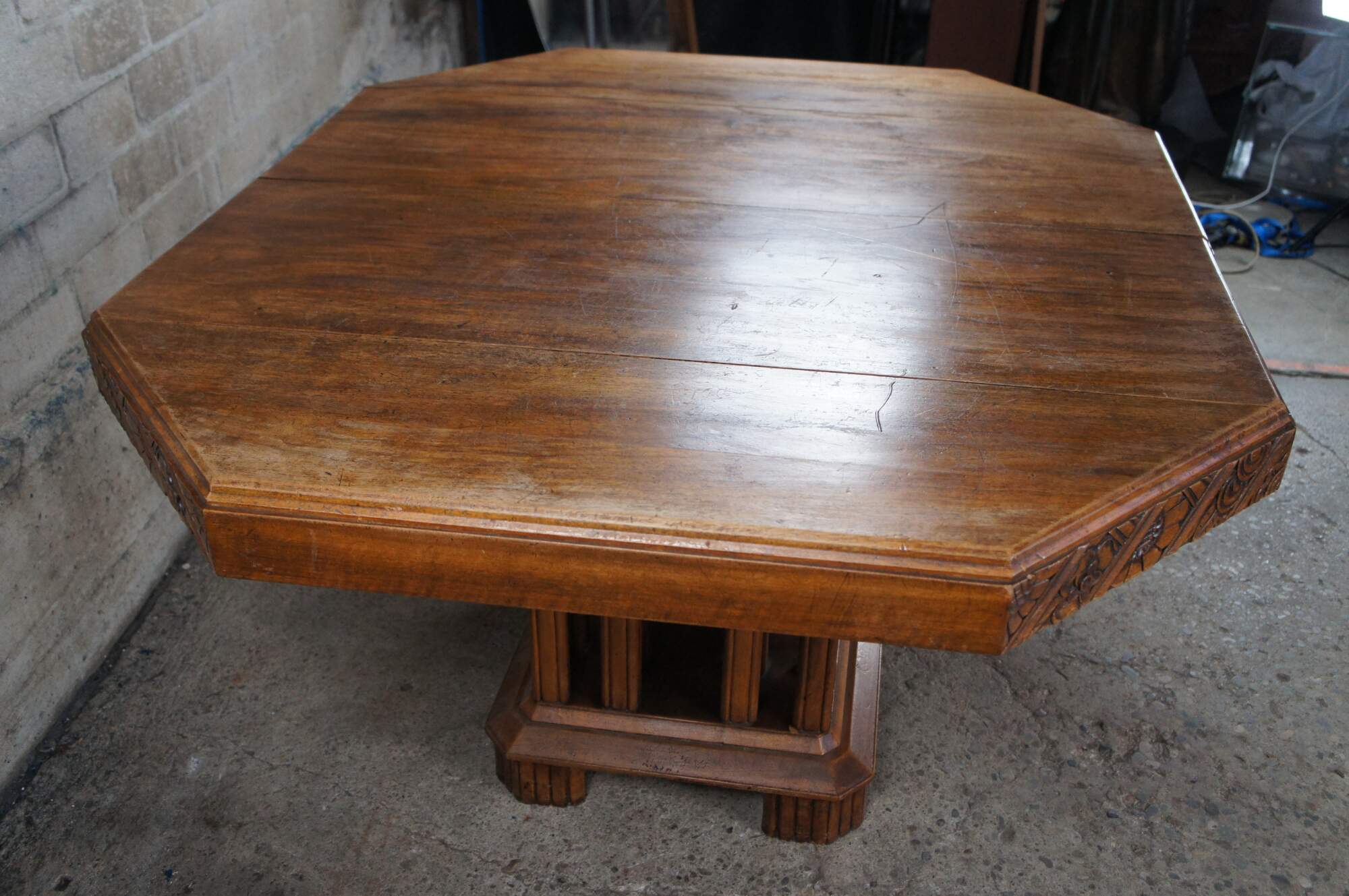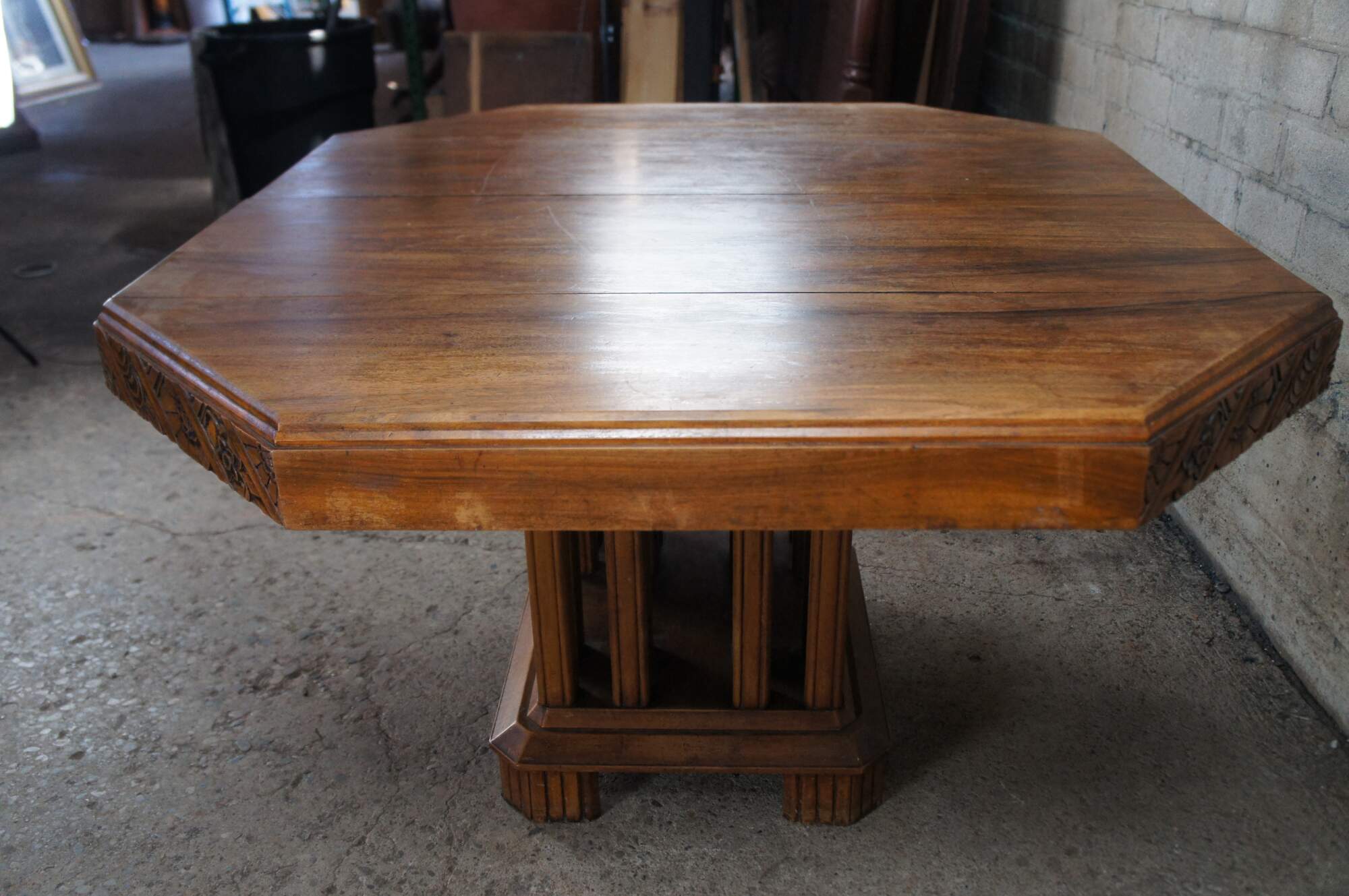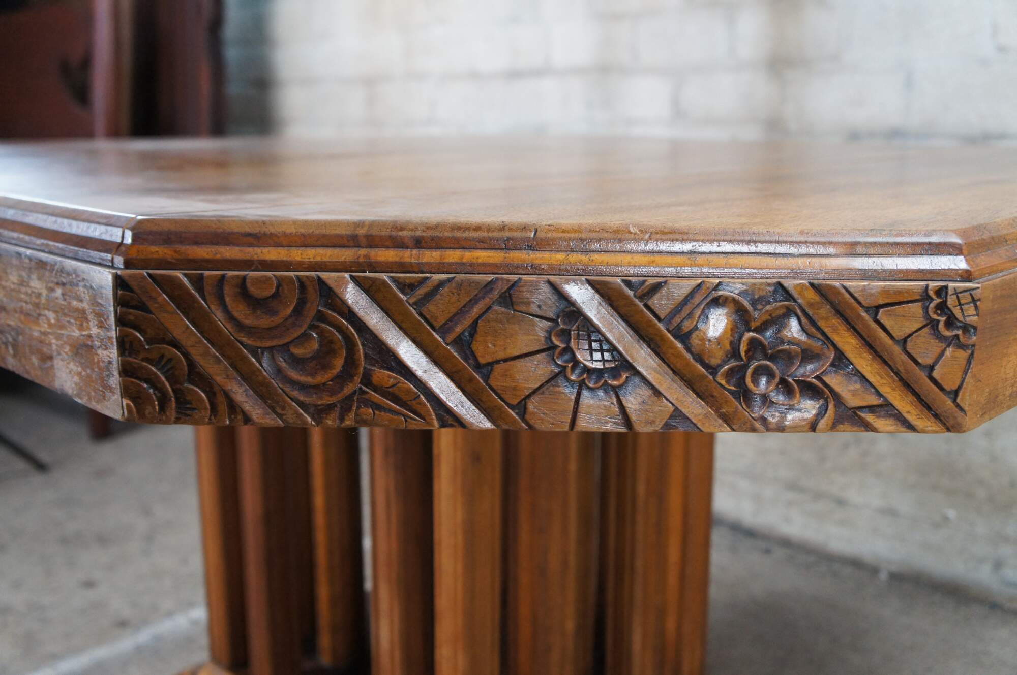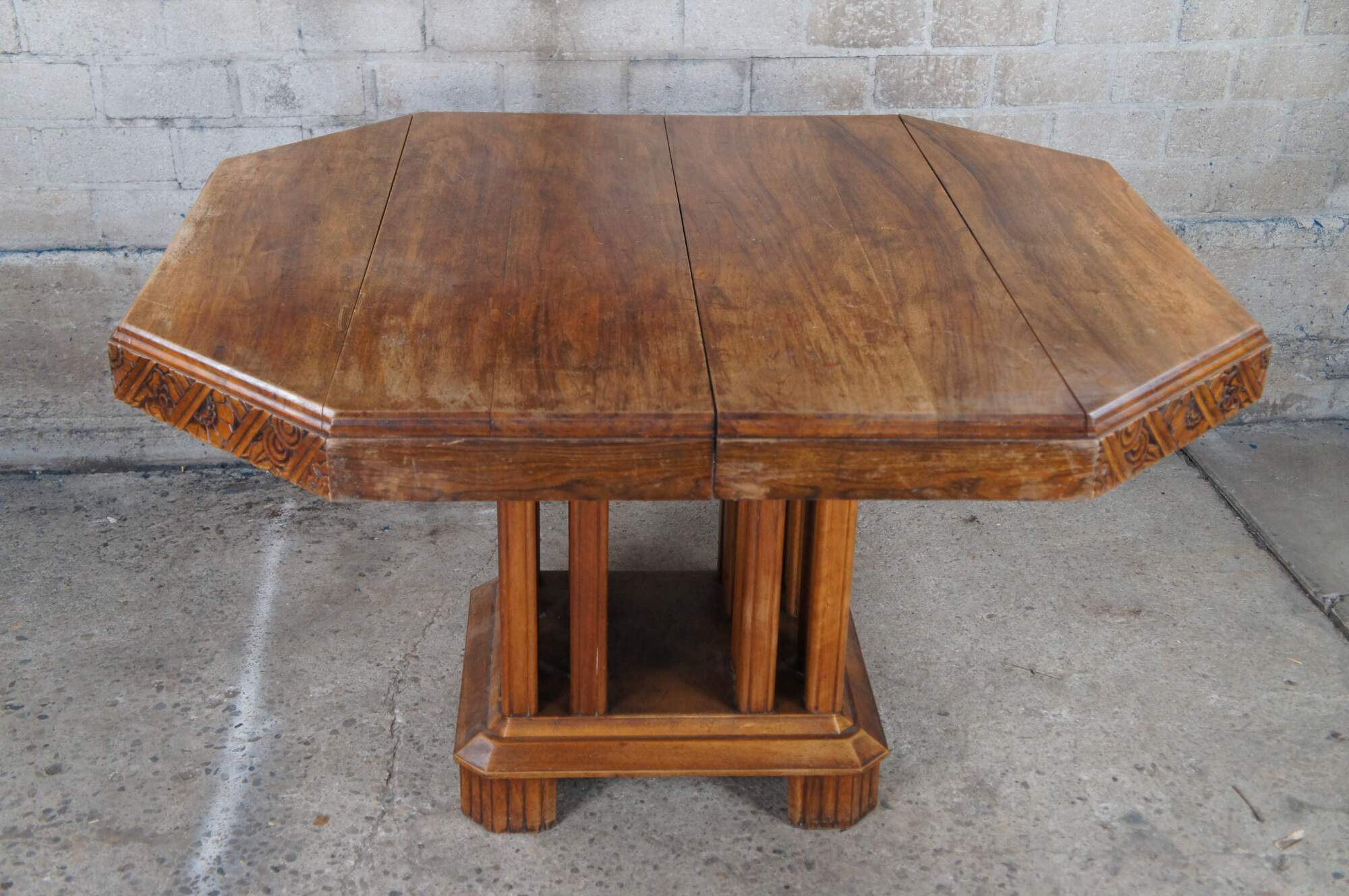 Stunning French Art Deco Period Dining Table. Features a hexagonal top made from walnut with beautiful floral carved corners over a fluted and footed base with vertical stiles or posts. The table can be extended with leaves which we can have made for an additional cost.