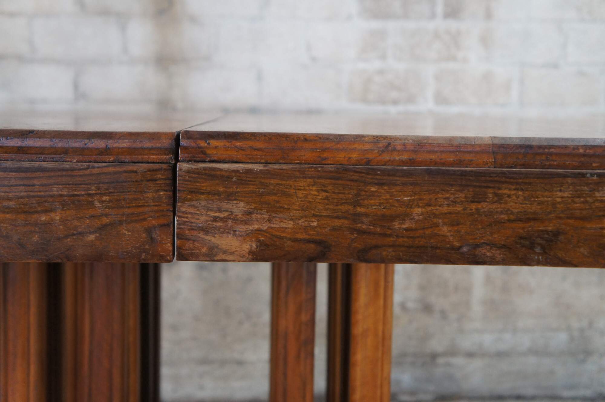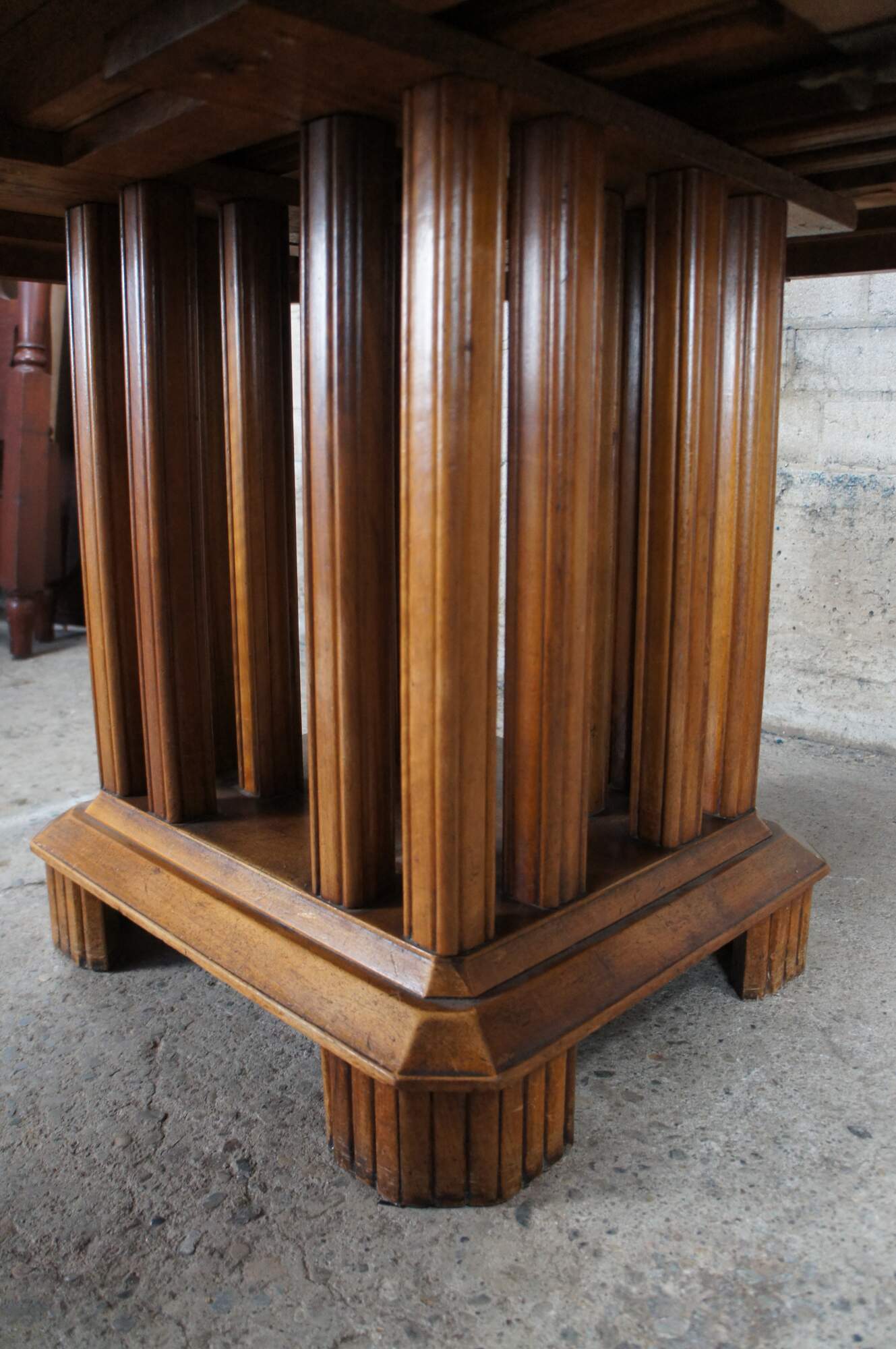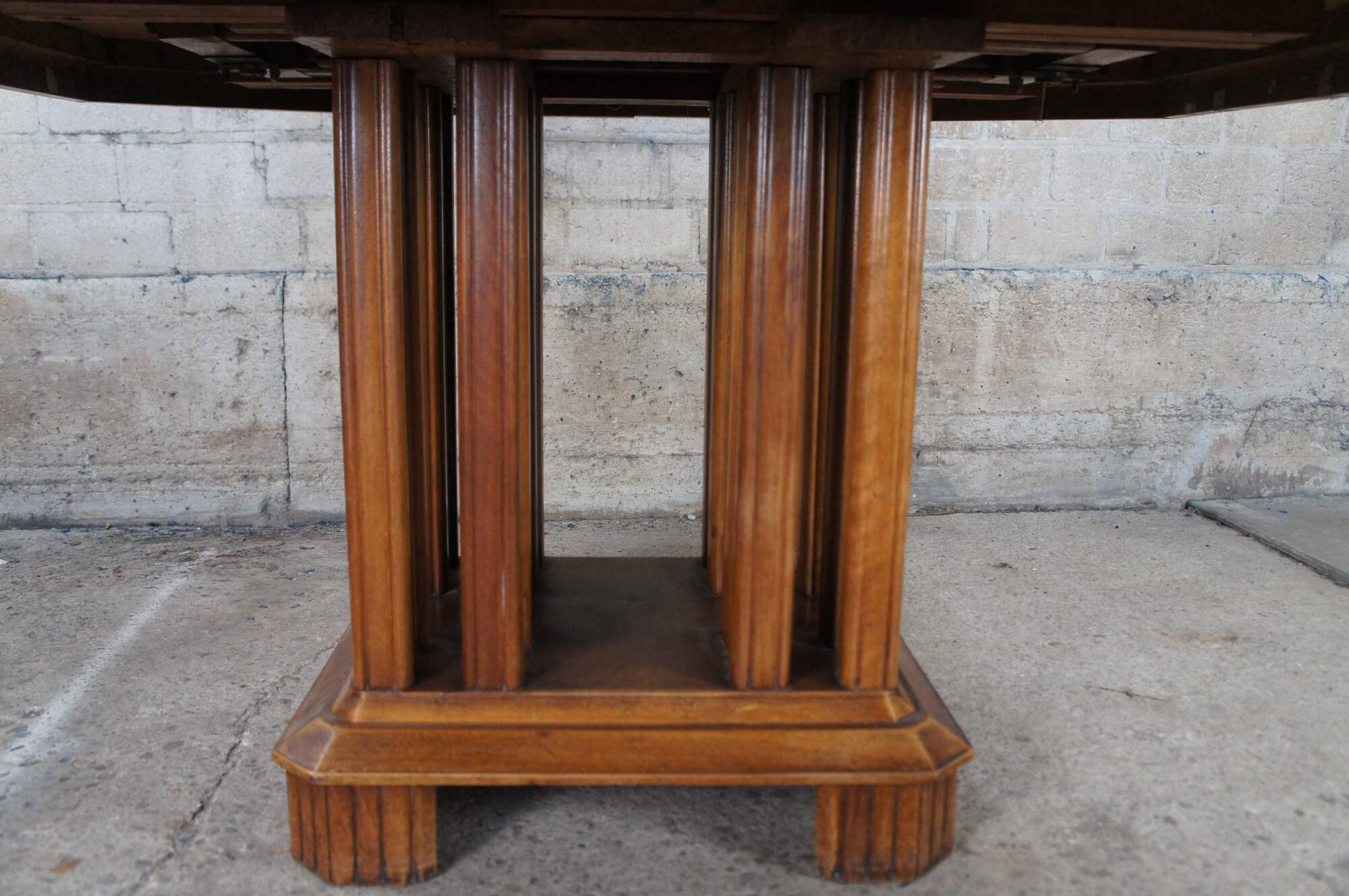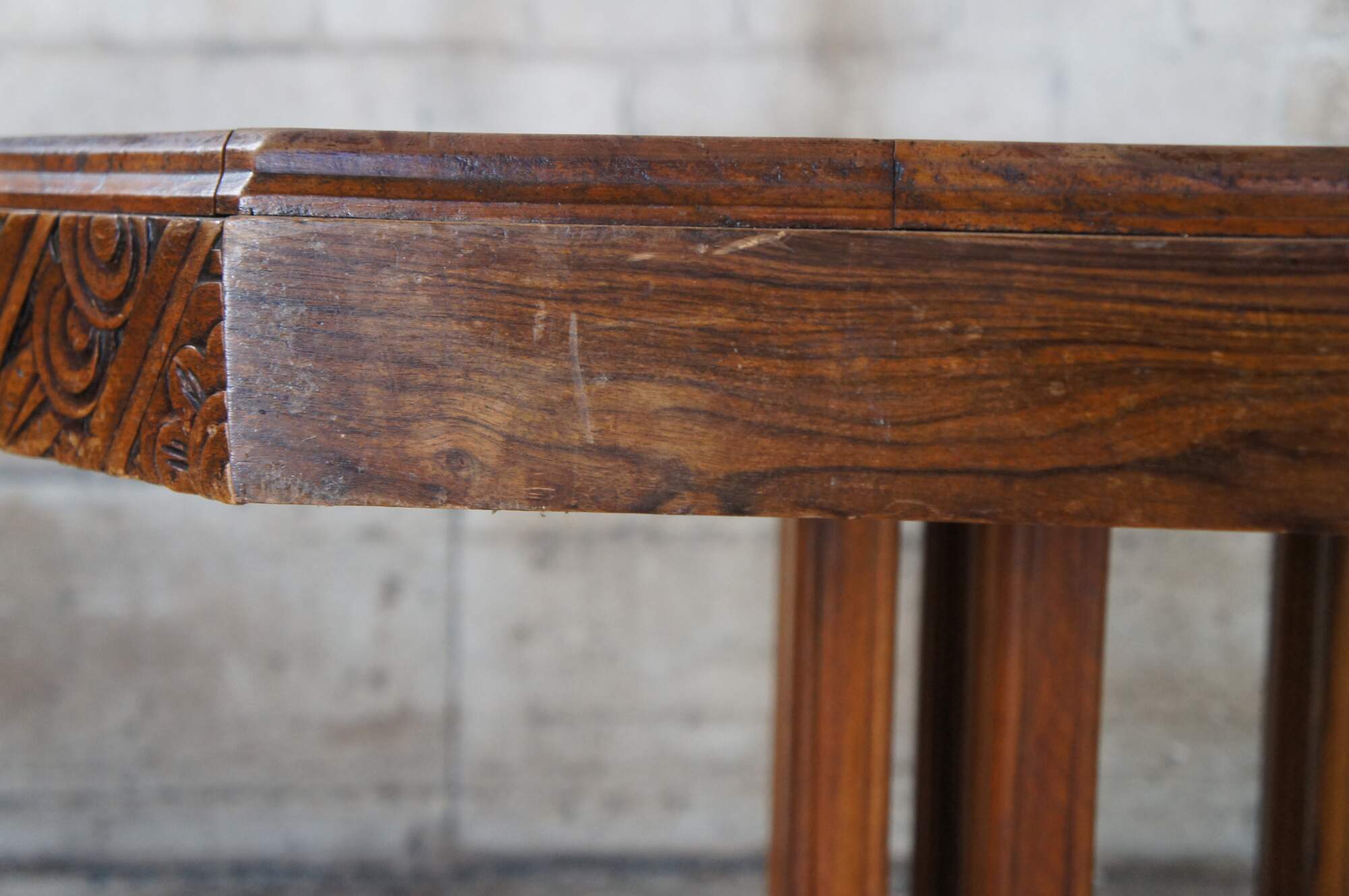 Stunning French Art Deco Period Dining Table. Features a hexagonal top made from walnut with beautiful floral carved corners over a fluted and footed base with vertical stiles or posts. The table can be extended with leaves which we can have made for an additional cost.