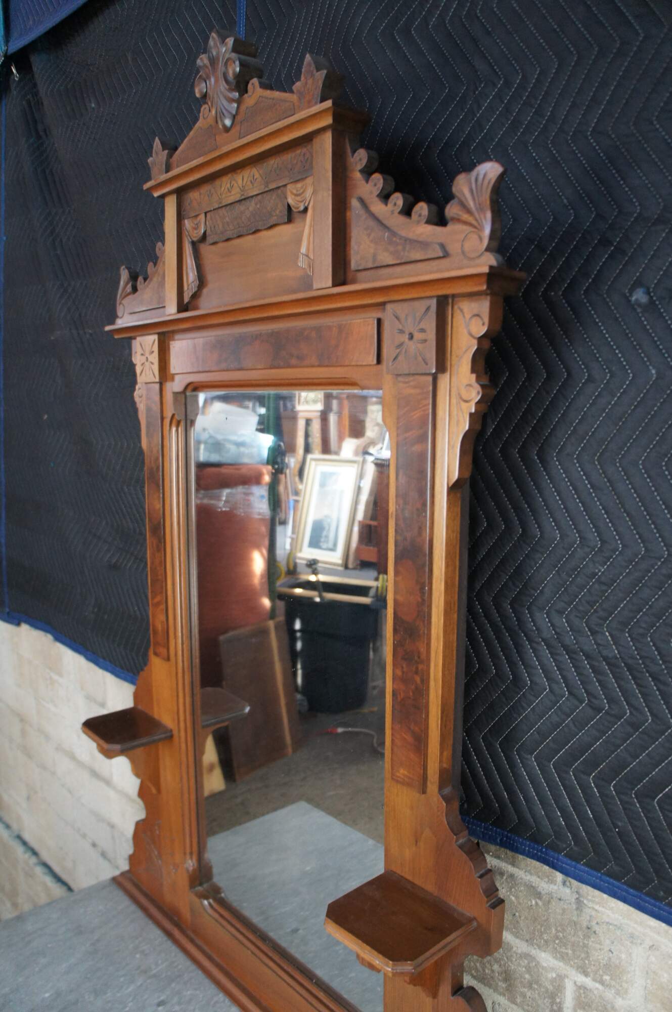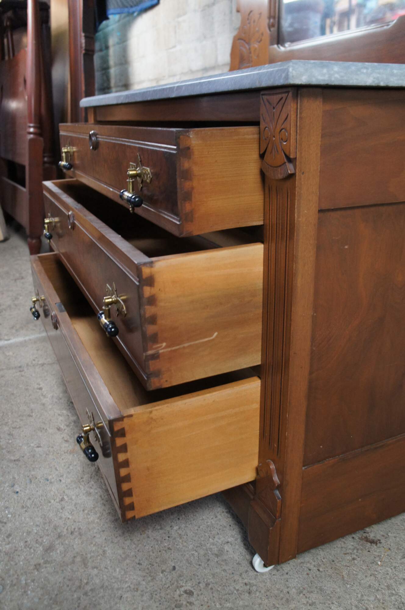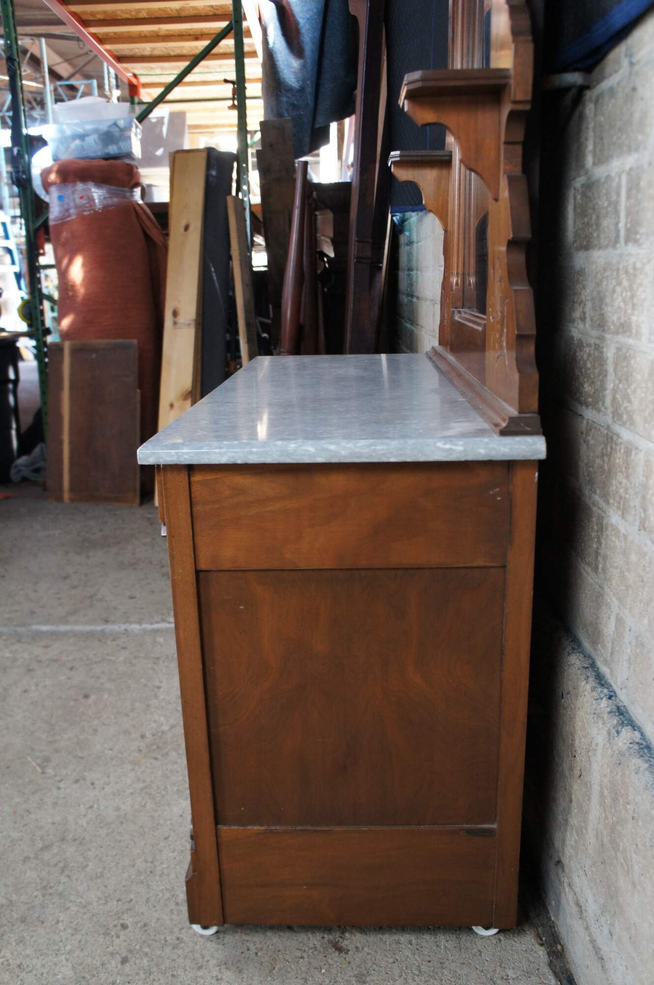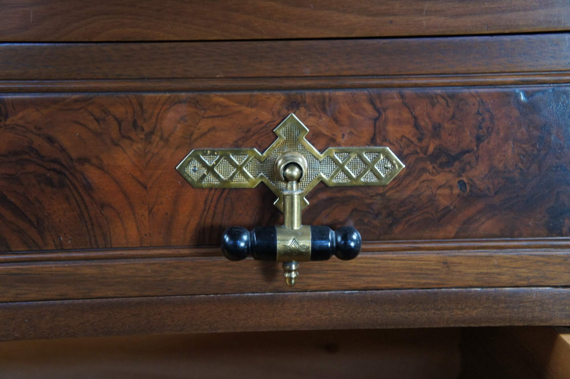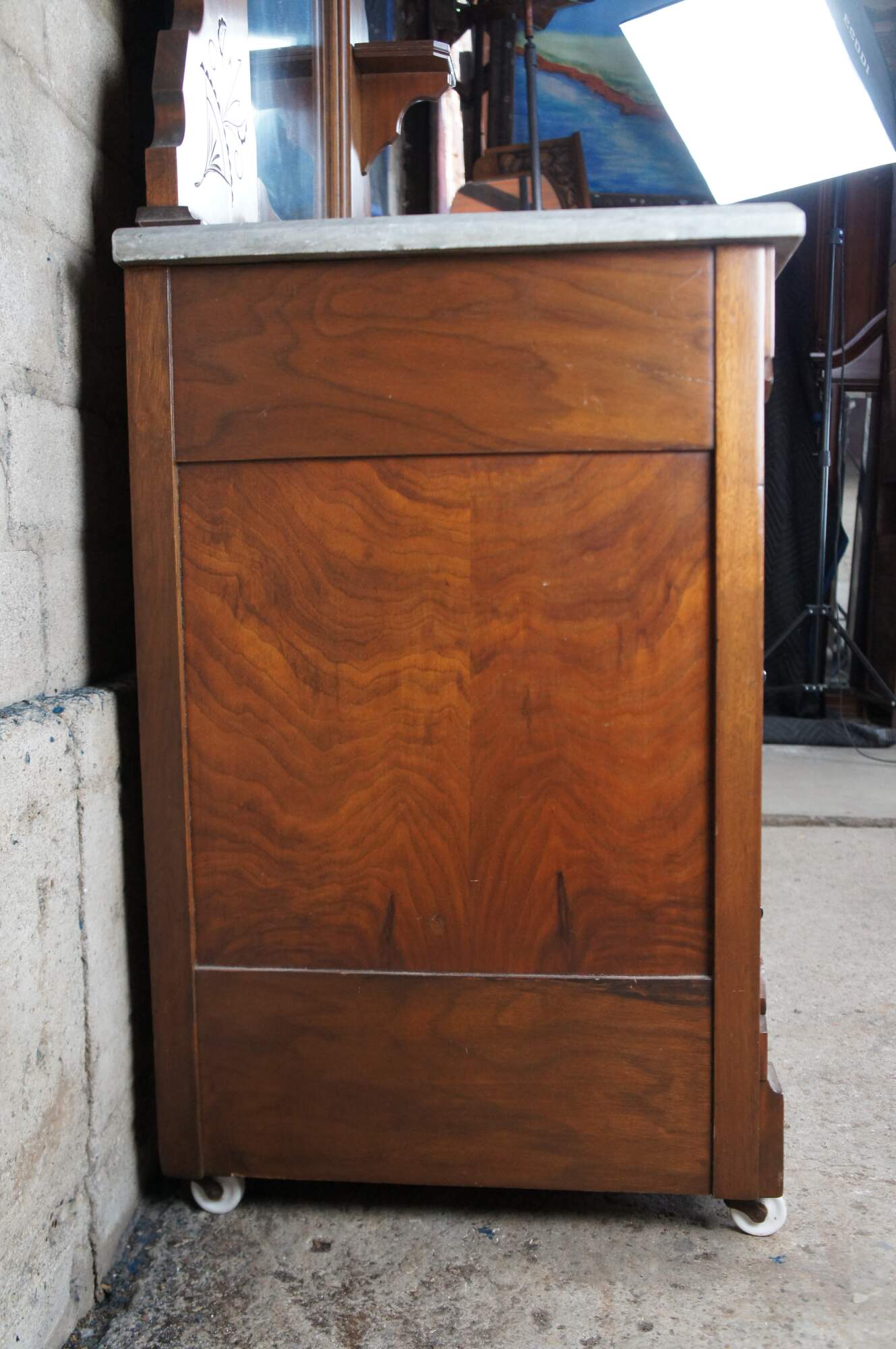 A charming antique Victorian Renaissance Revival dresser & mirror, circa 1880s. Made from walnut with vibrant burled panels along the front and matchbook burling along the sides. It features a large ornately carved mirror with looking glass set between two shelves over a marble chest of drawers. Dovetailed drawers are between fluted stiles with ornate brass knocker pulls and keyhole escutcheons. The dresser is set over porcelain casters for ease of movement.