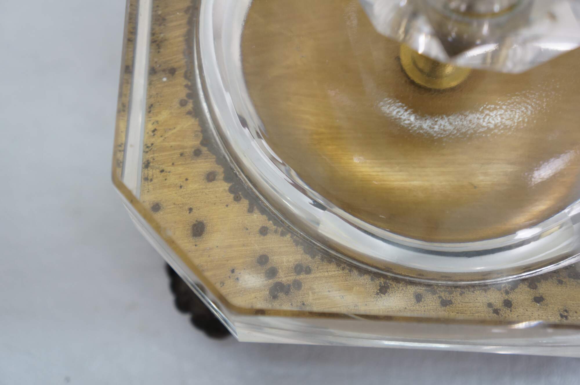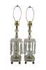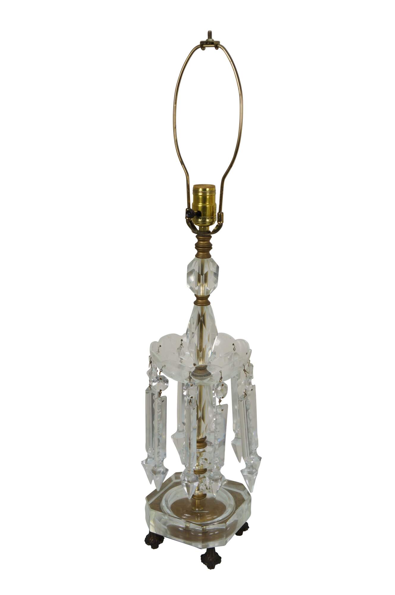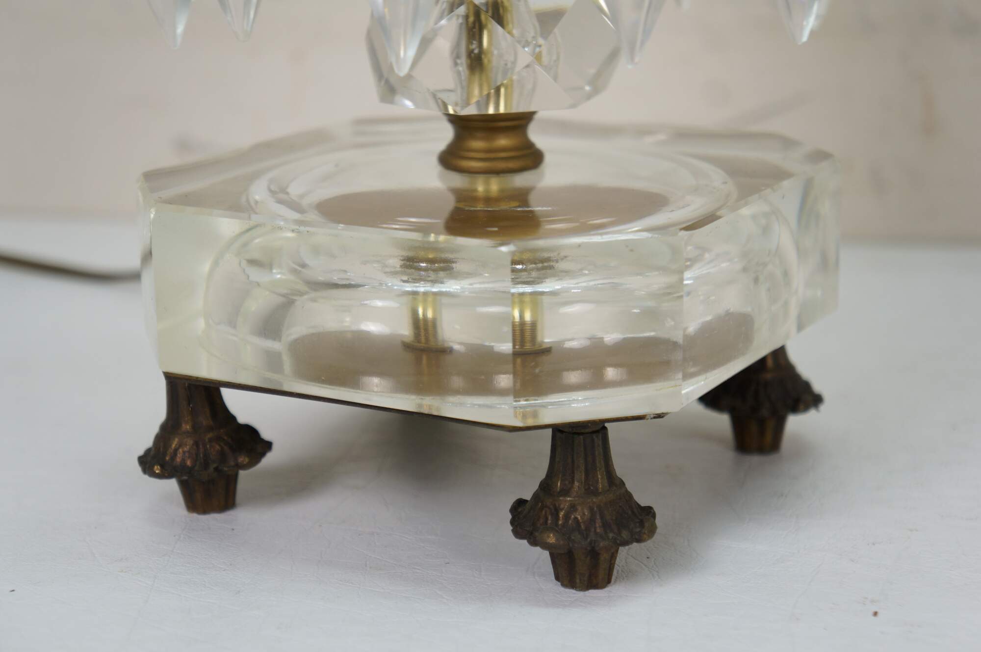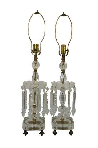 Pair of mid 20th century drop crystal luster table lamps - cut corner base standing on four brass feet, faceted stacked crystal body with scalloped candle cup style top hung with 10 cut drop crystals. Includes harps.