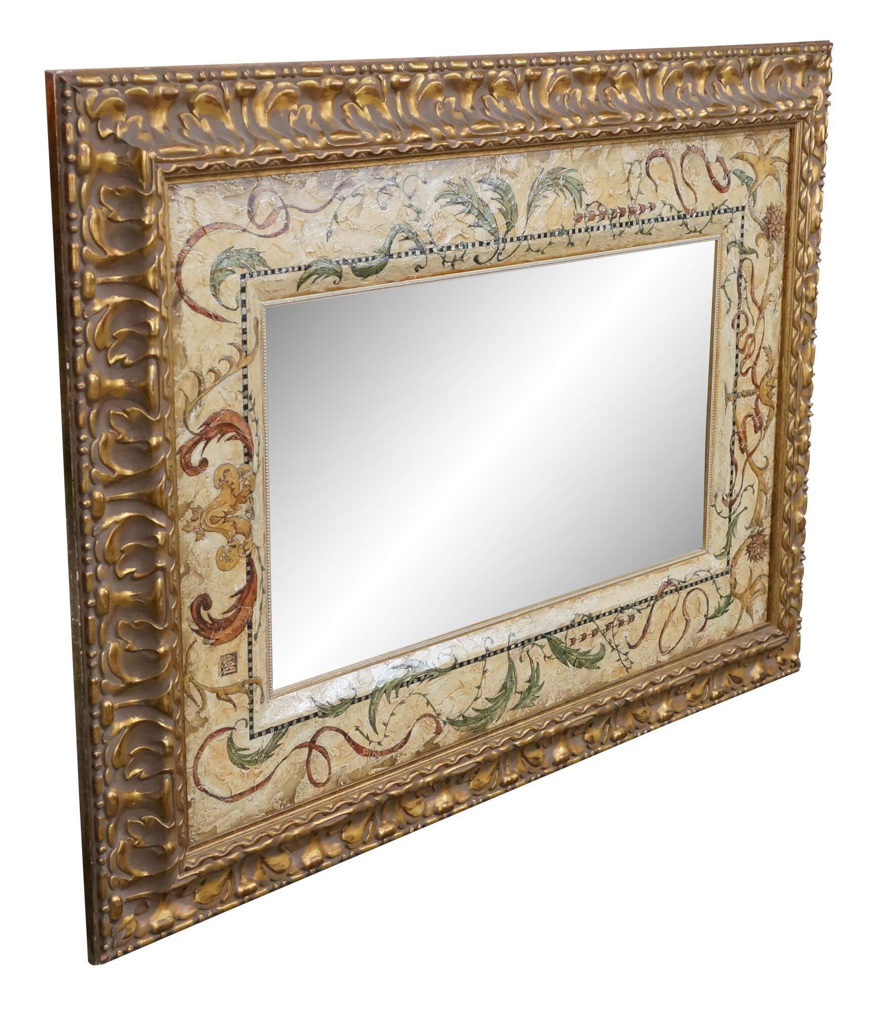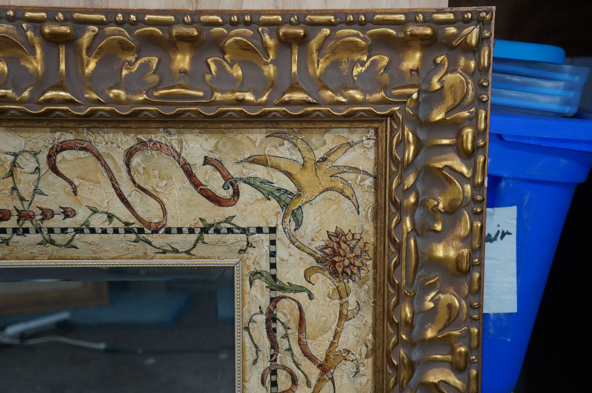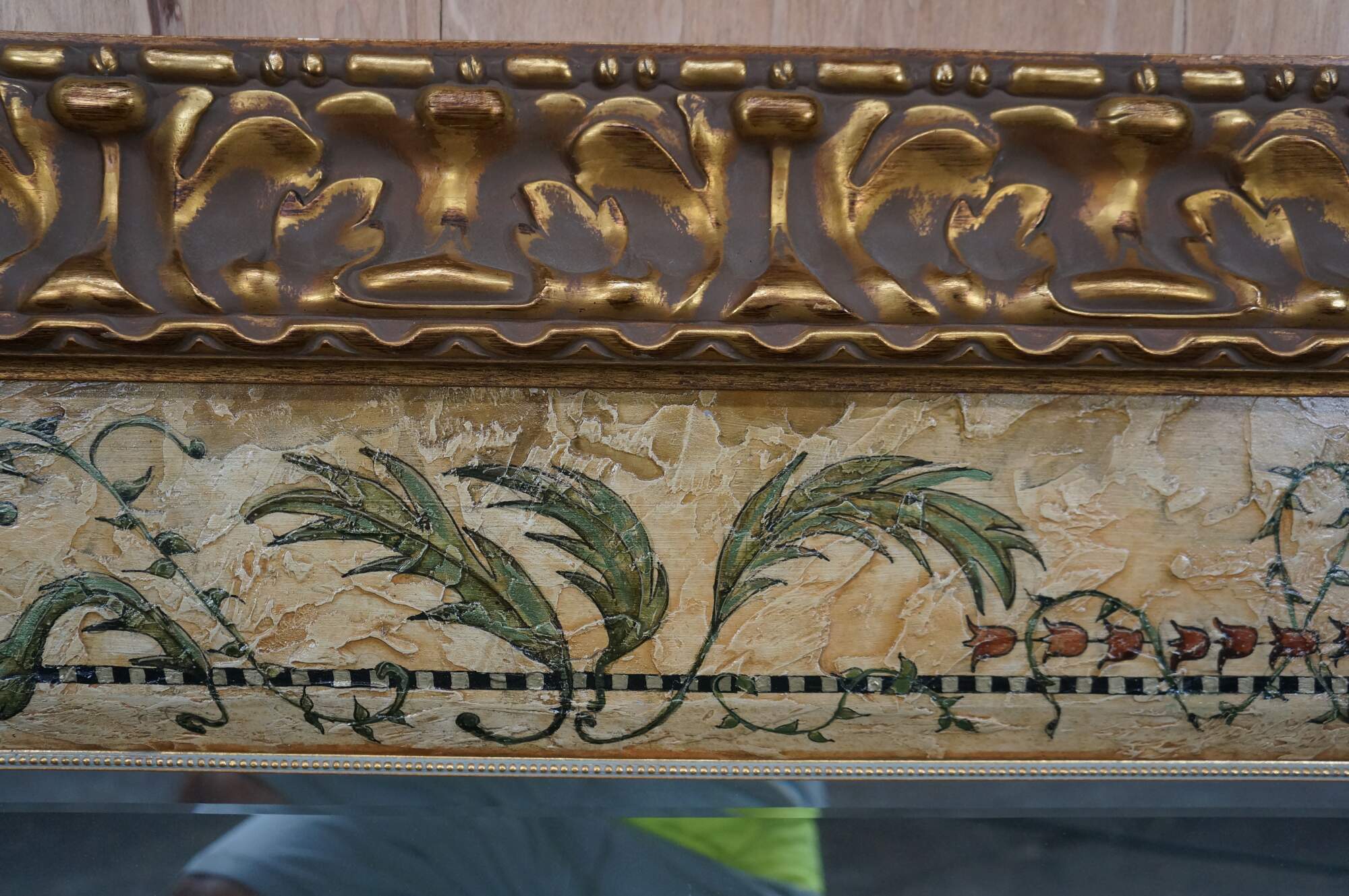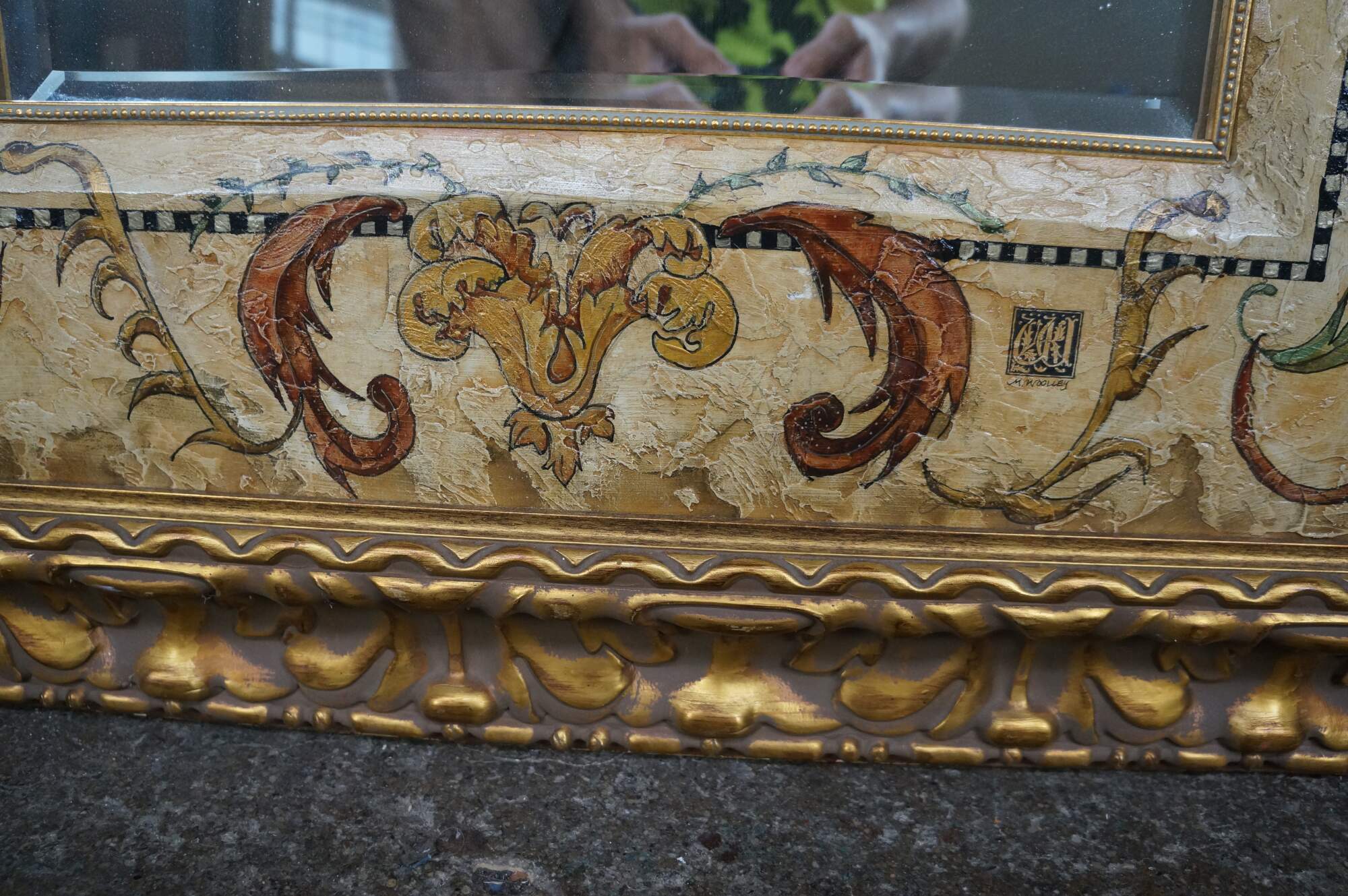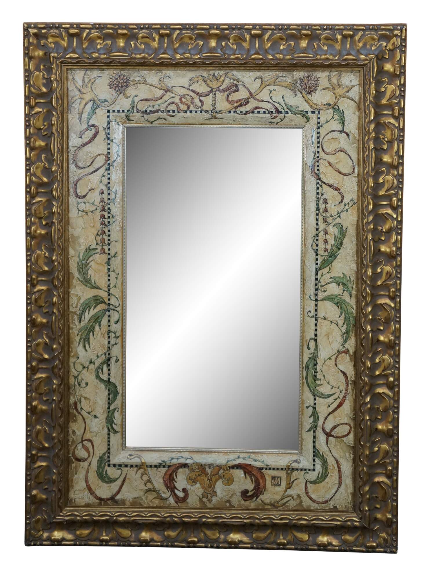 Michelle Woolley hand painted custom made mirror. Features a blend of Chinoiserie and Florentine styling. The rectangular beveled glass is surrounded by a painted motif of foliate and framed in a gold finished acanthus leaf frame.