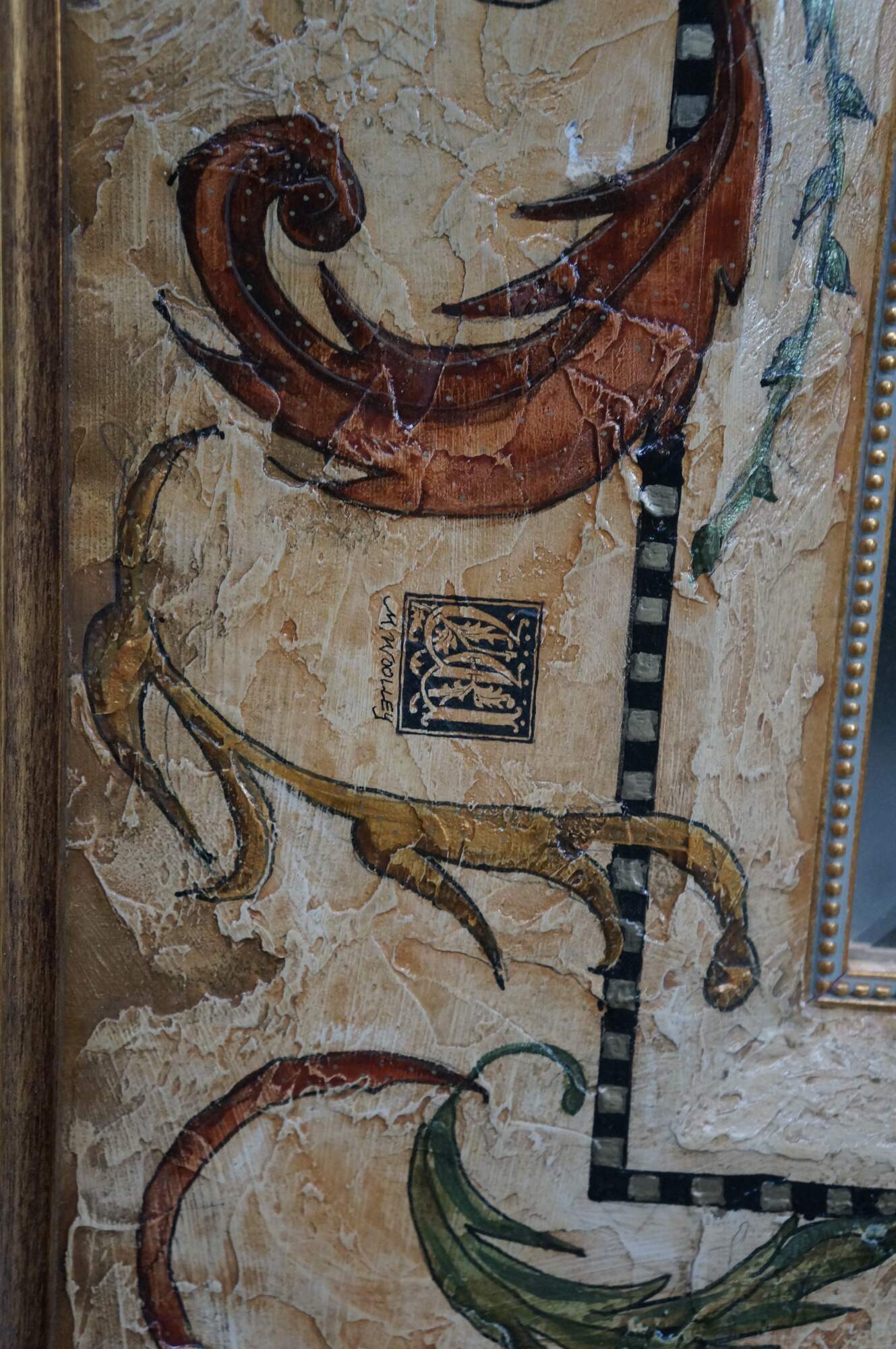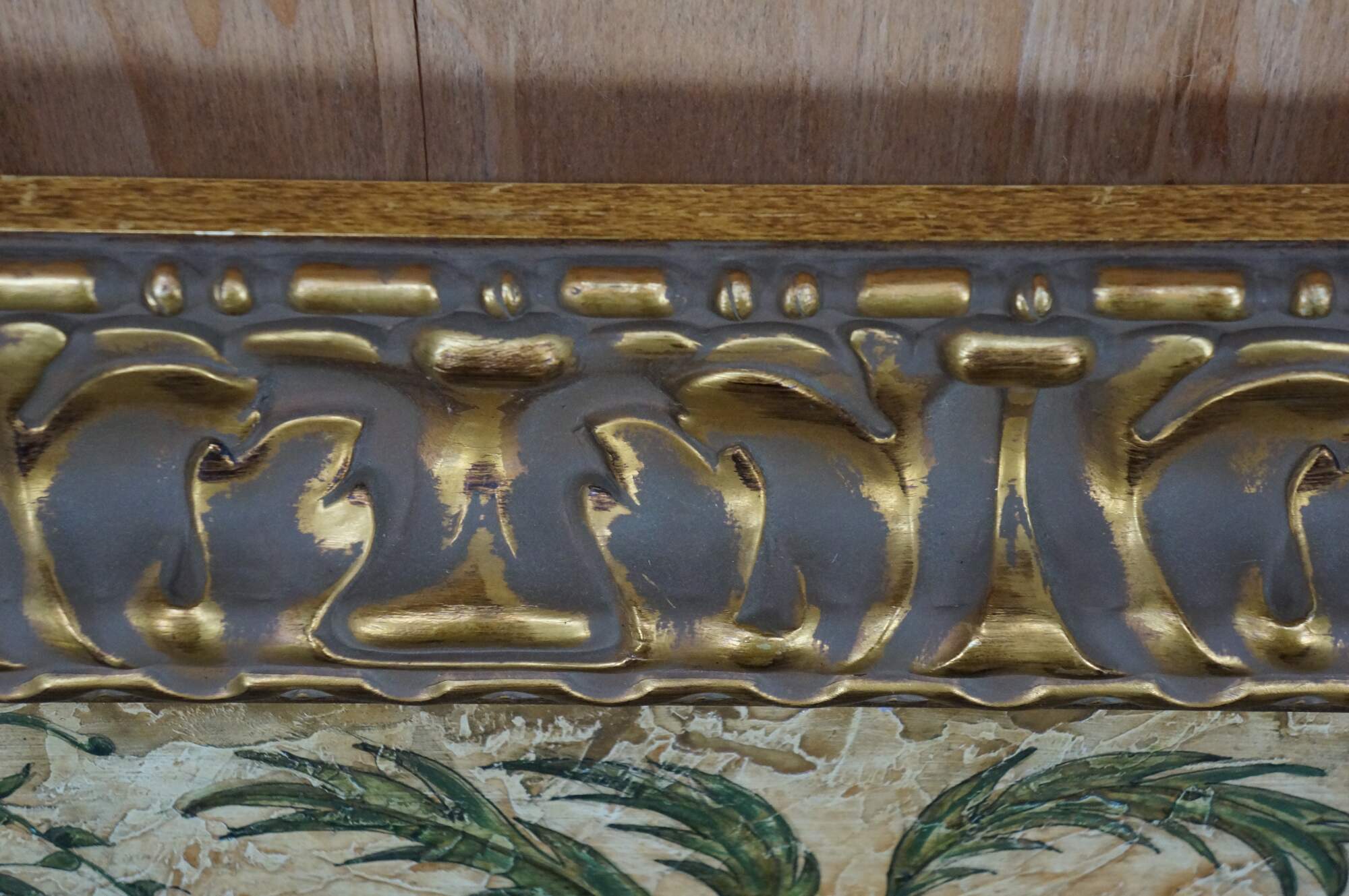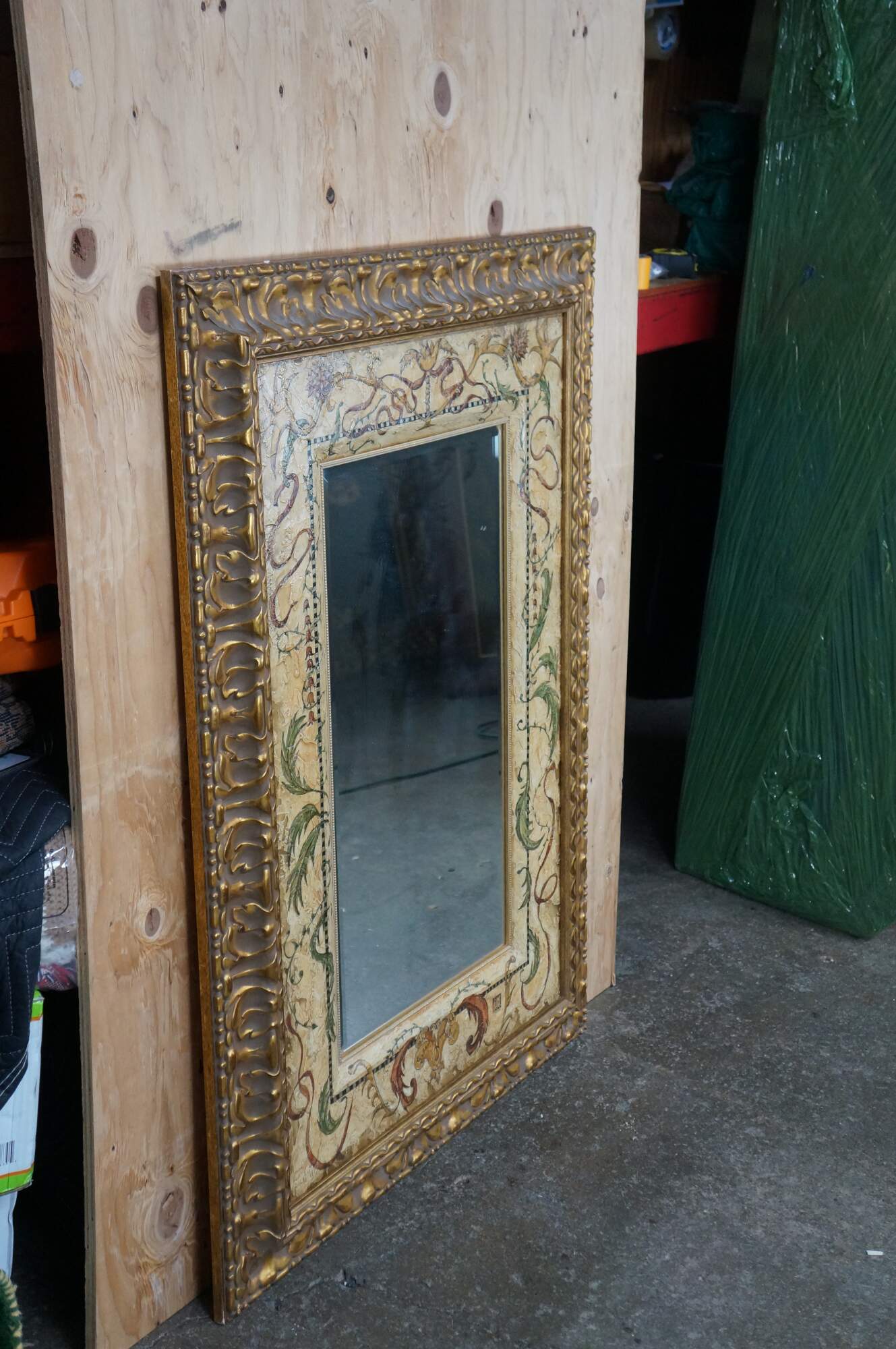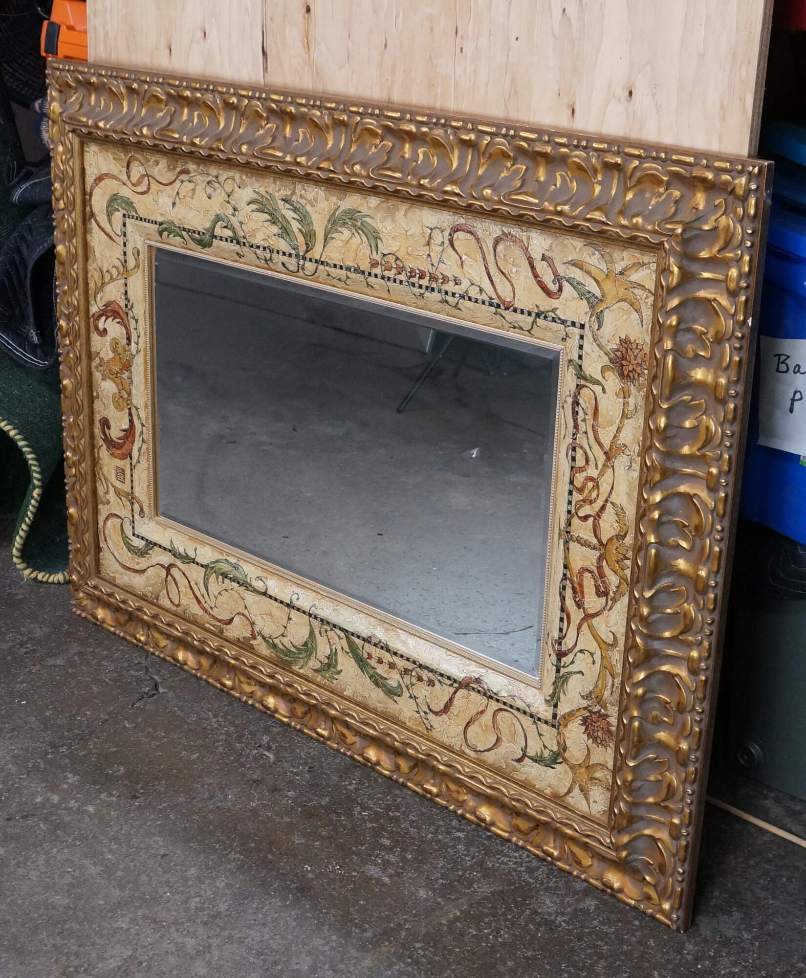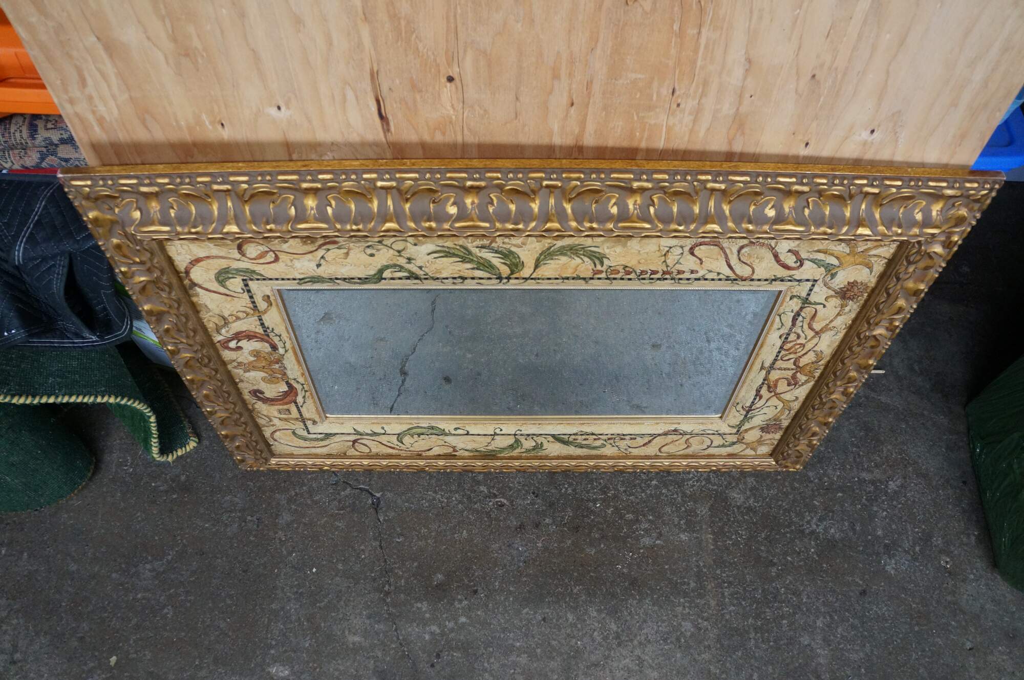 Michelle Woolley hand painted custom made mirror. Features a blend of Chinoiserie and Florentine styling. The rectangular beveled glass is surrounded by a painted motif of foliate and framed in a gold finished acanthus leaf frame.