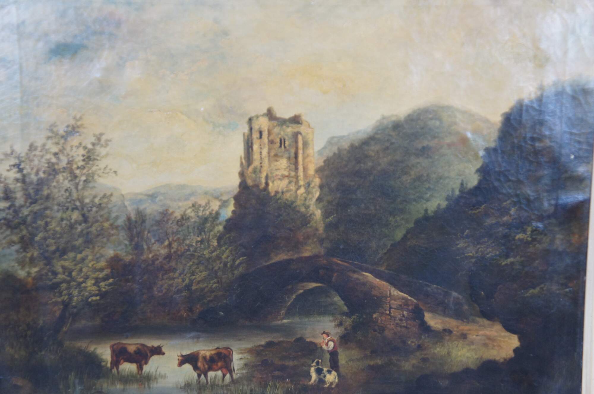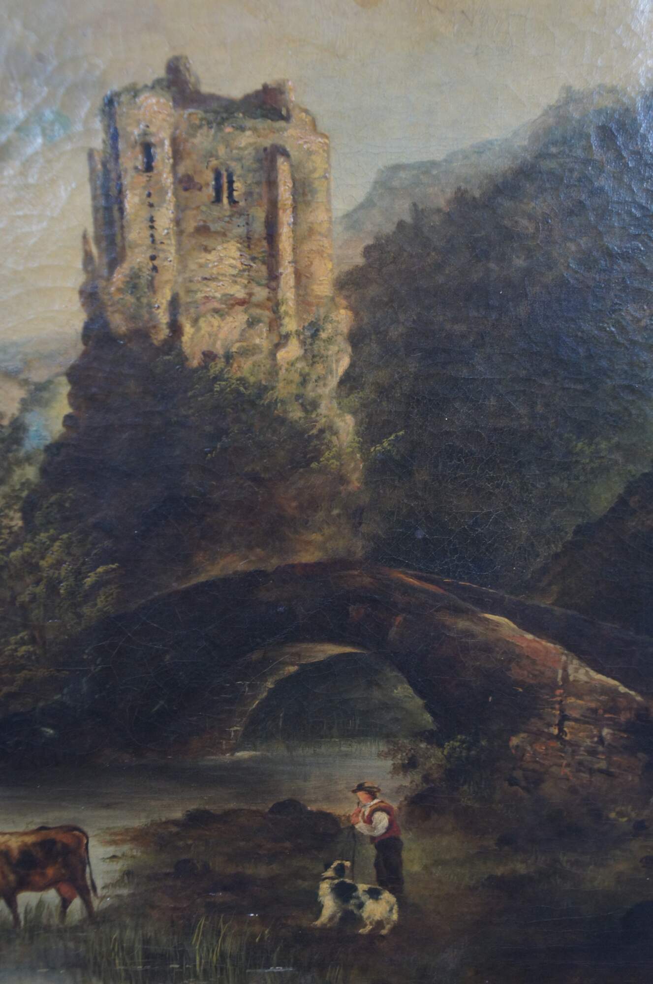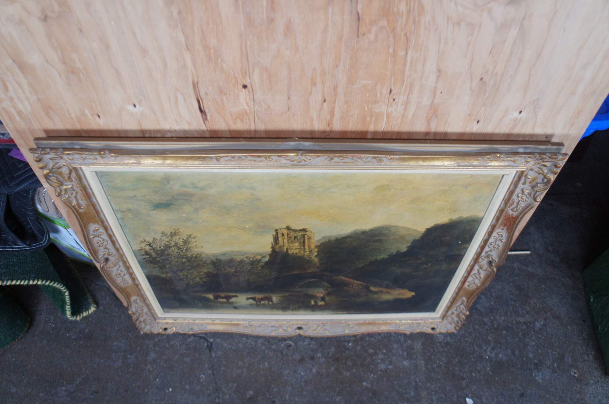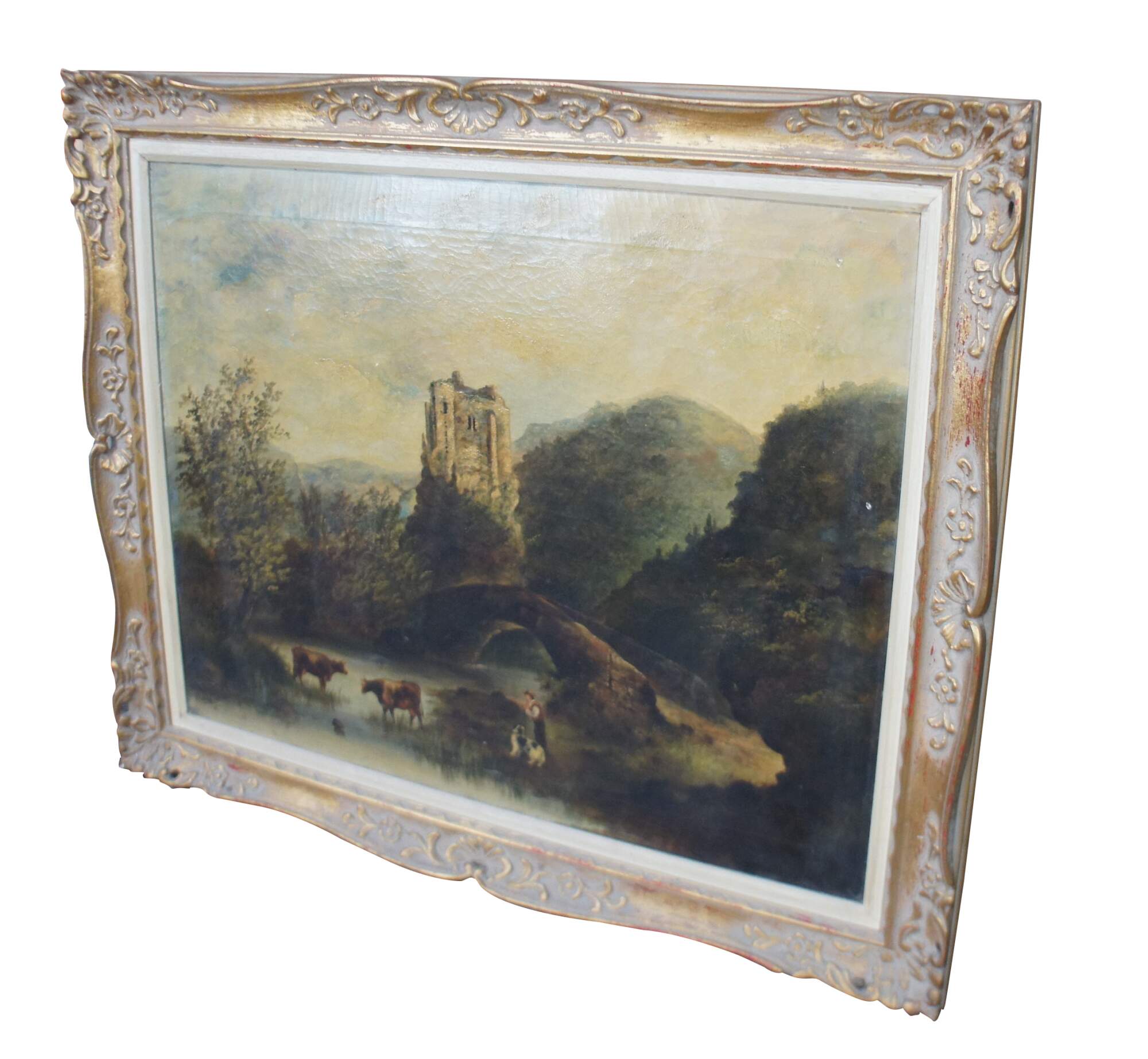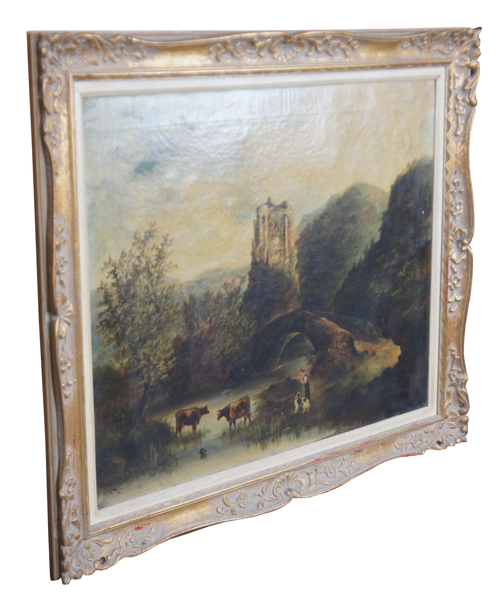 A large antique 19th-century oil painting. The painting showcases a European landscape with castle ruins in the background. The foreground shows a farmer with dog and two cattle grazing in the river. The oil painting is on canvas and set in a modern frame.