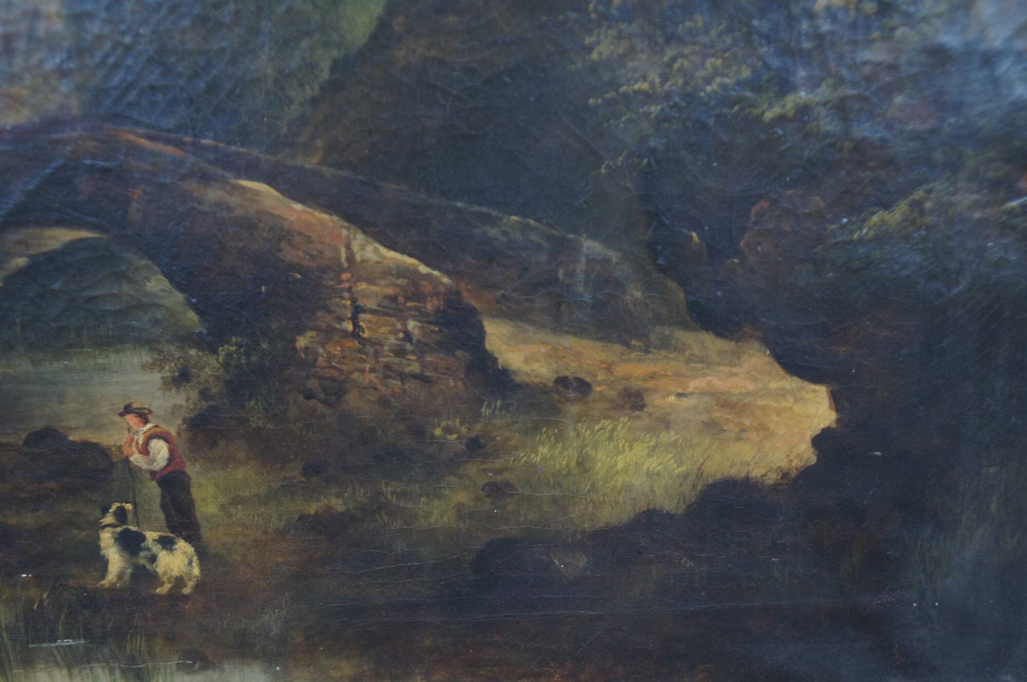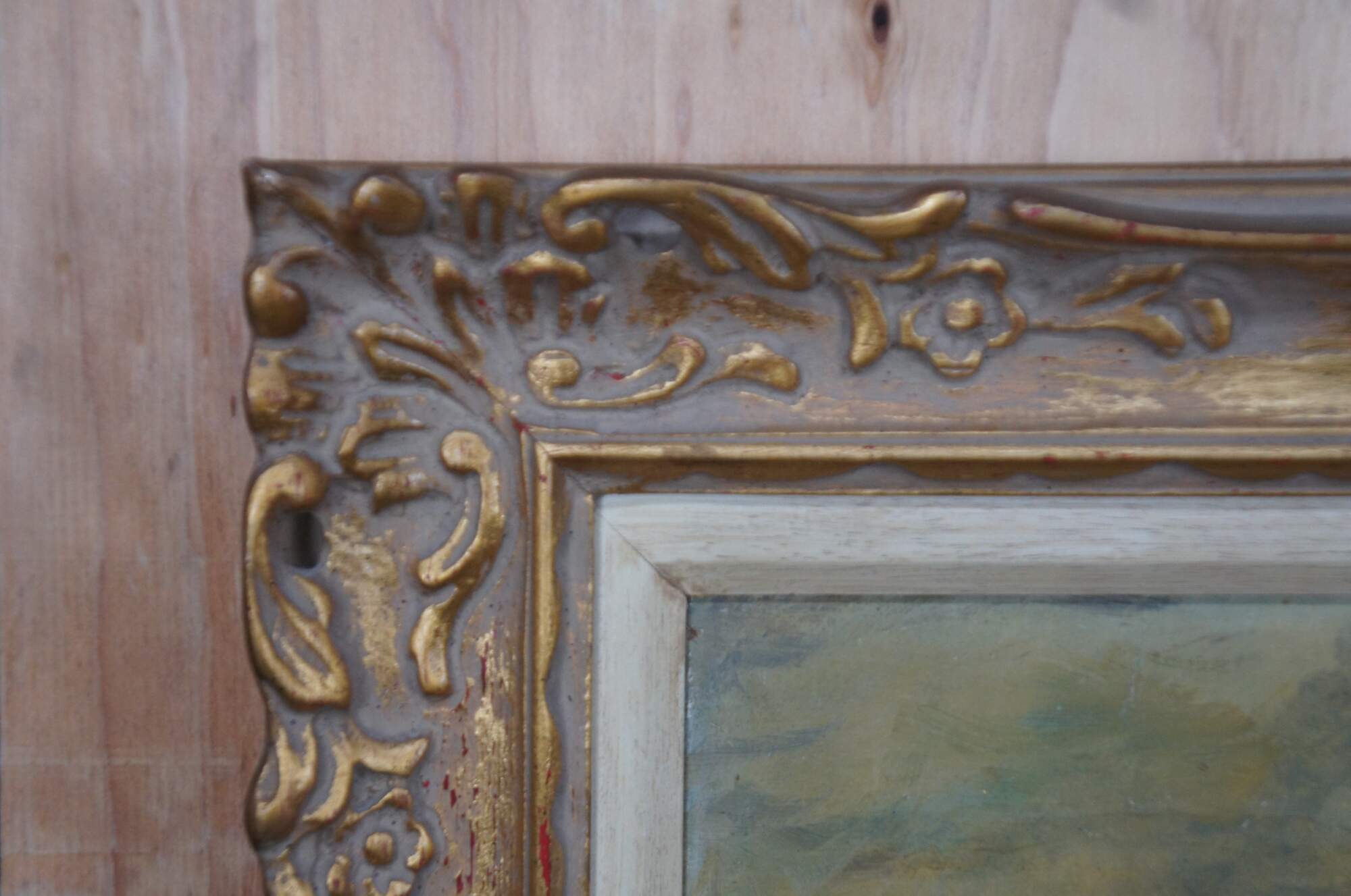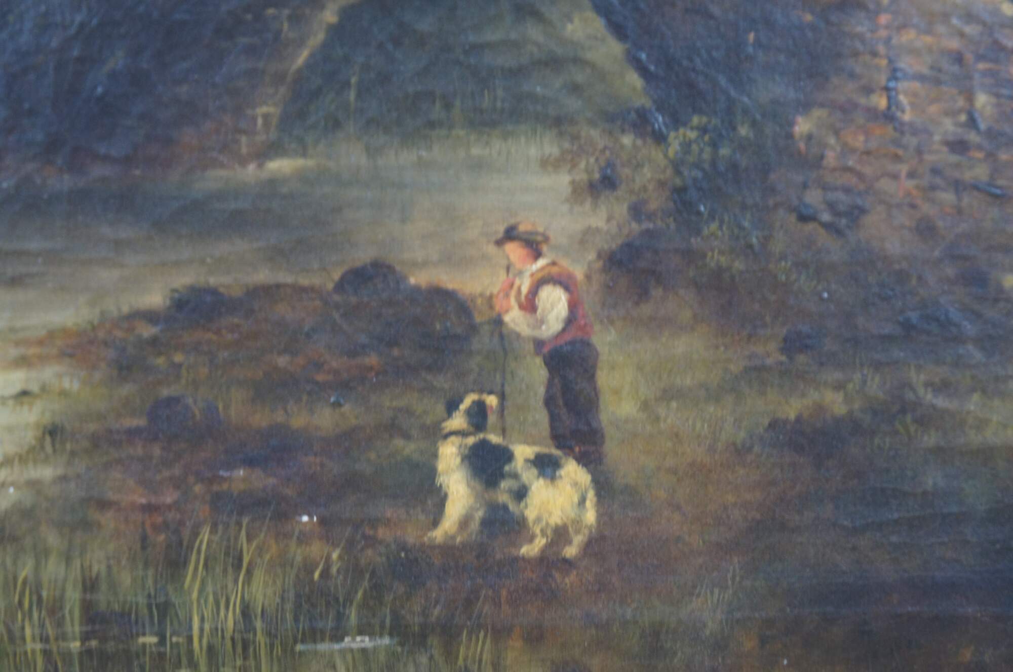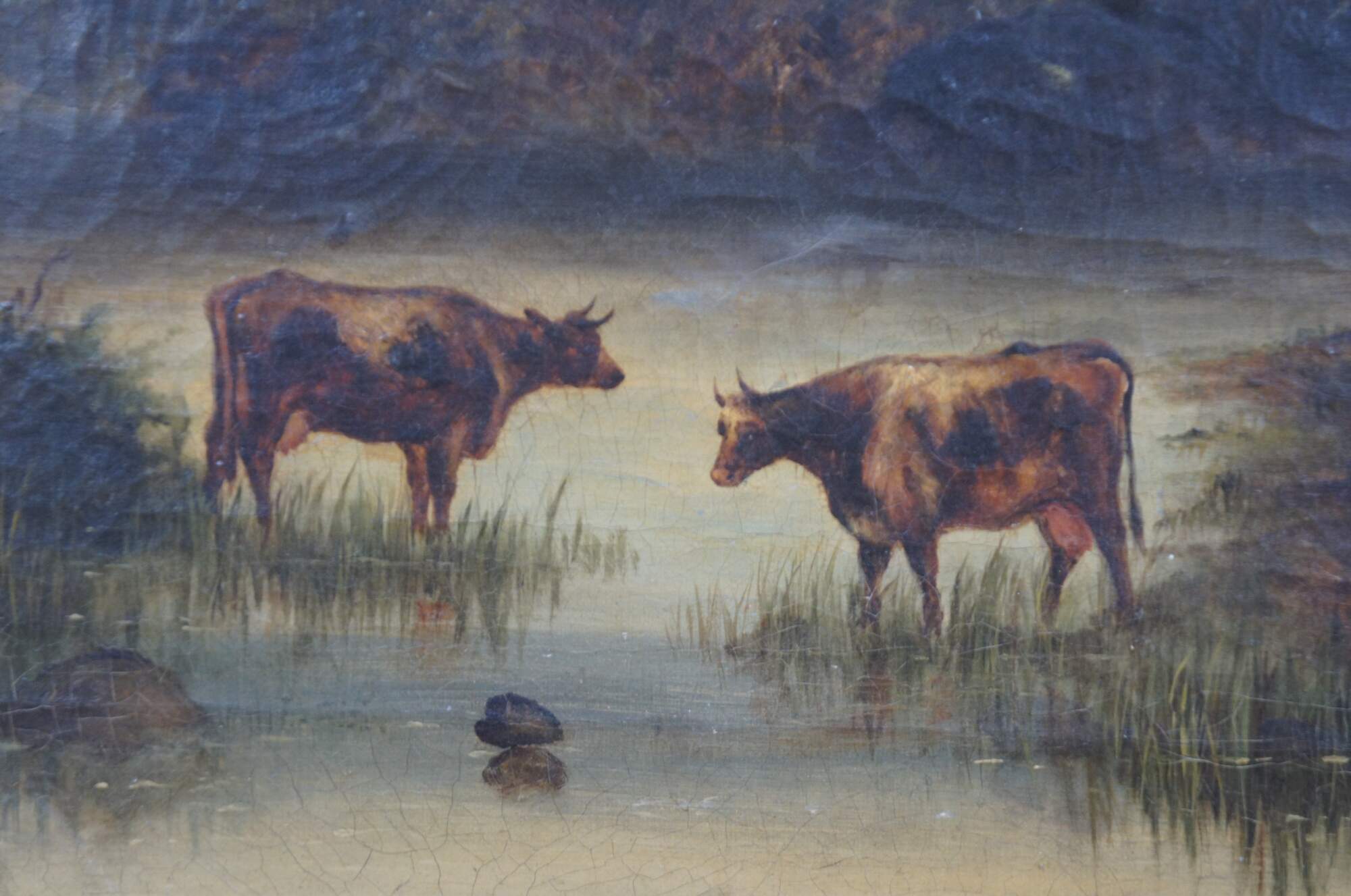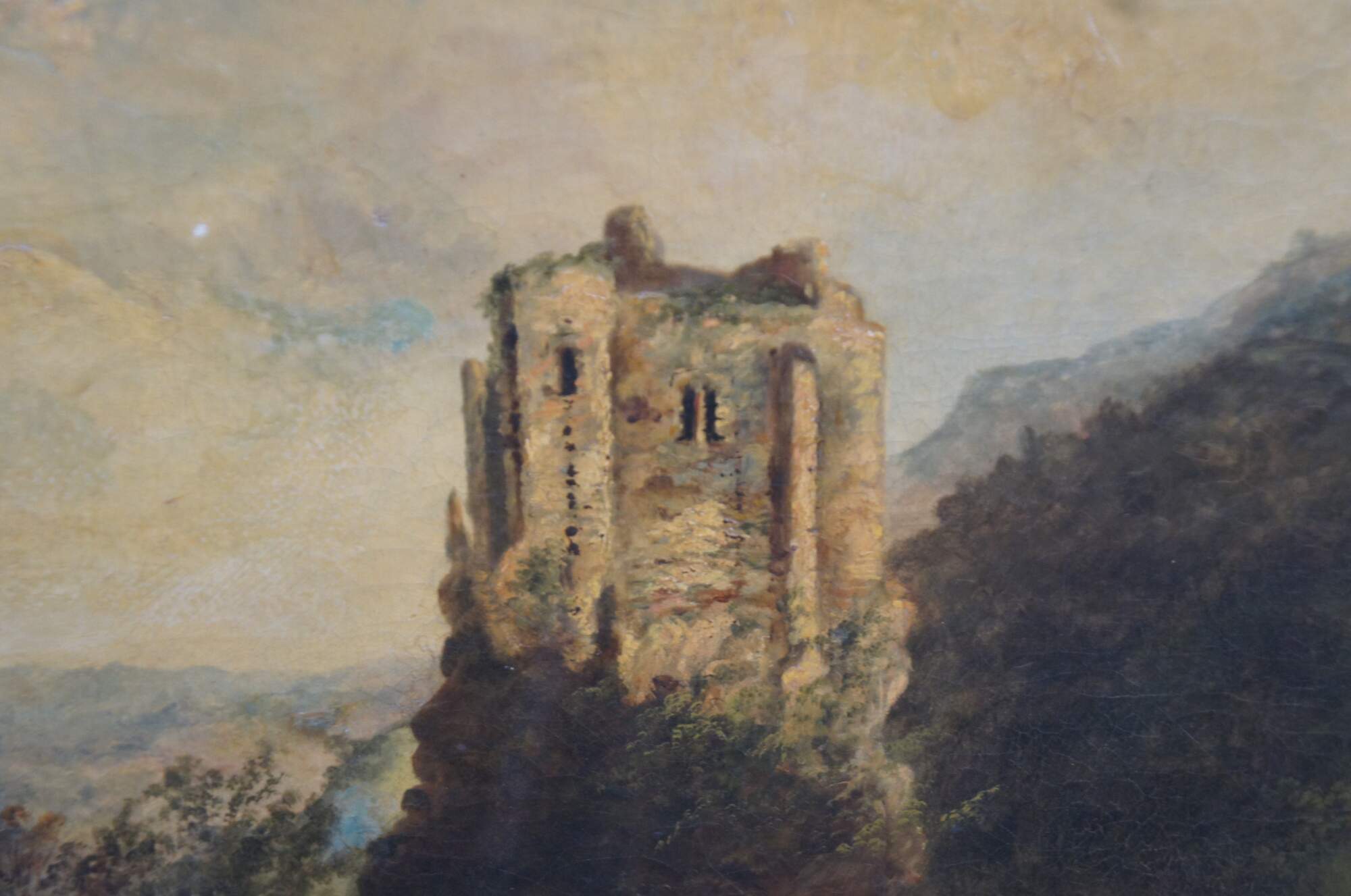 A large antique 19th-century oil painting. The painting showcases a European landscape with castle ruins in the background. The foreground shows a farmer with dog and two cattle grazing in the river. The oil painting is on canvas and set in a modern frame.