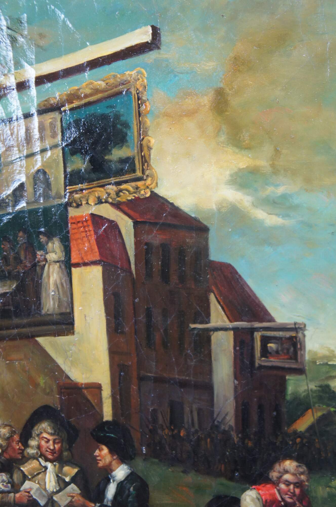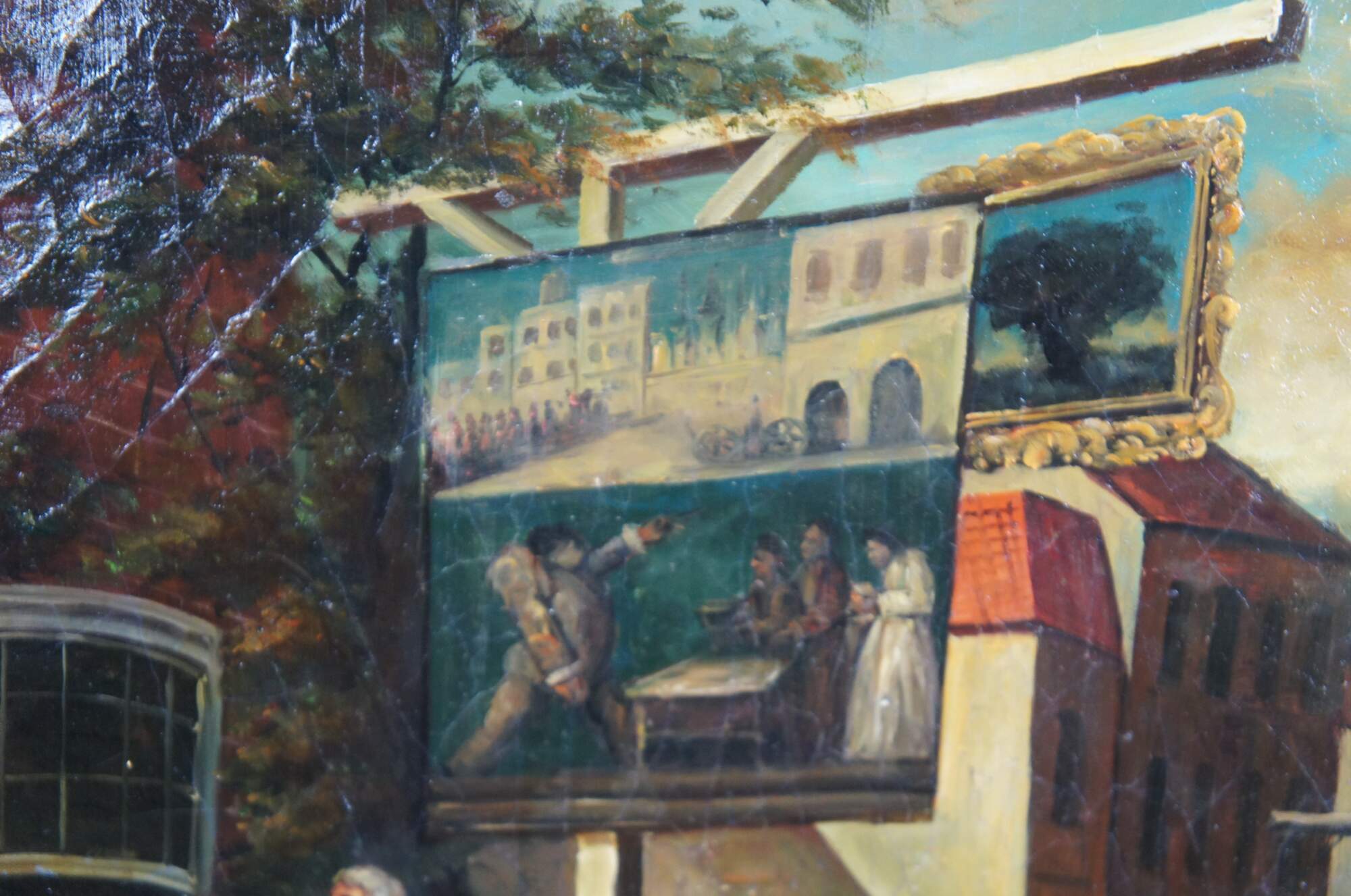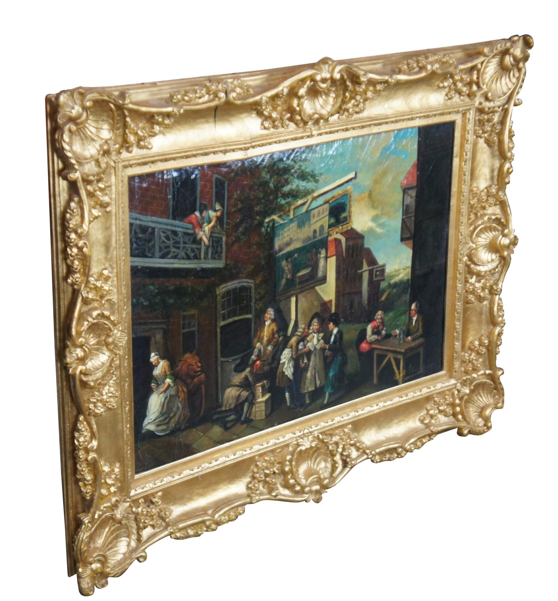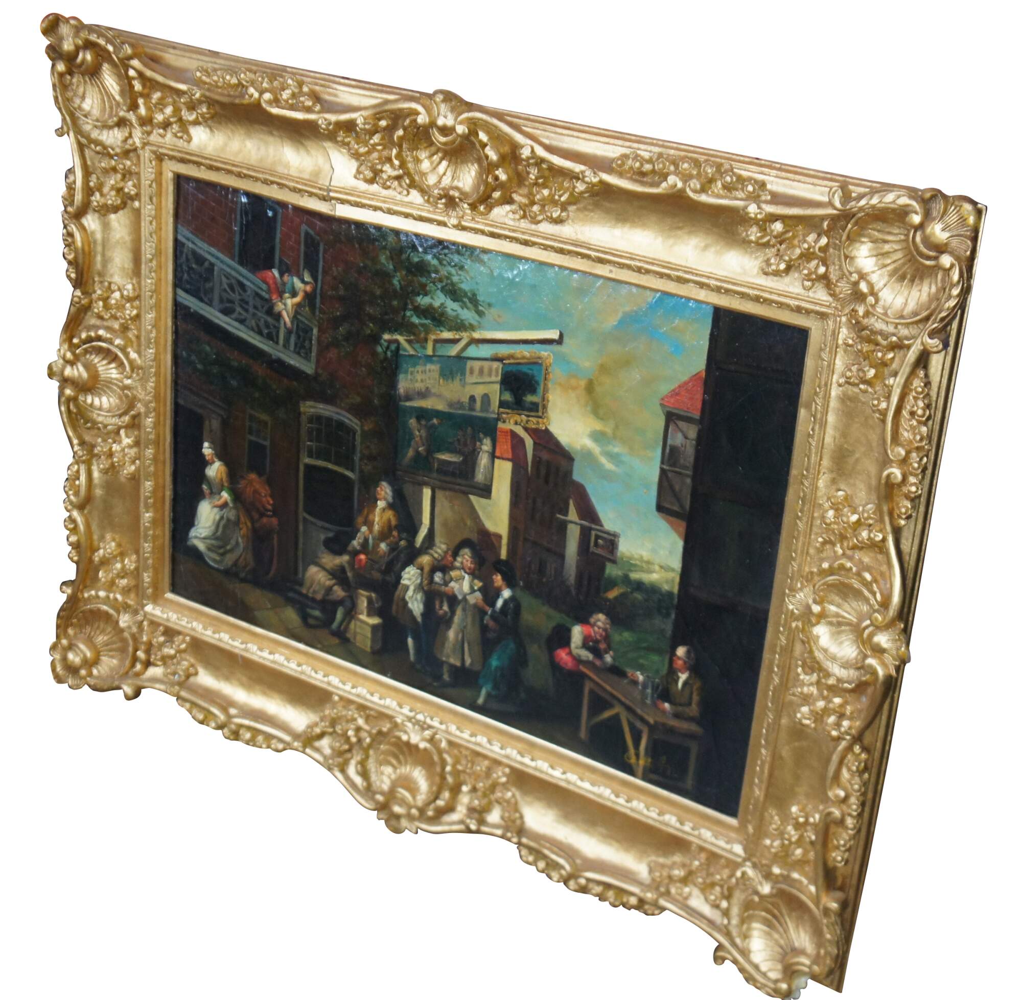 The oil painting offers a whimsical view of a cityscape showing patrons voting in a village. The painting has natural craquelure to give the sign of age. Signed lower right, unknown. Ornately framed with scalloping and a gold finish.