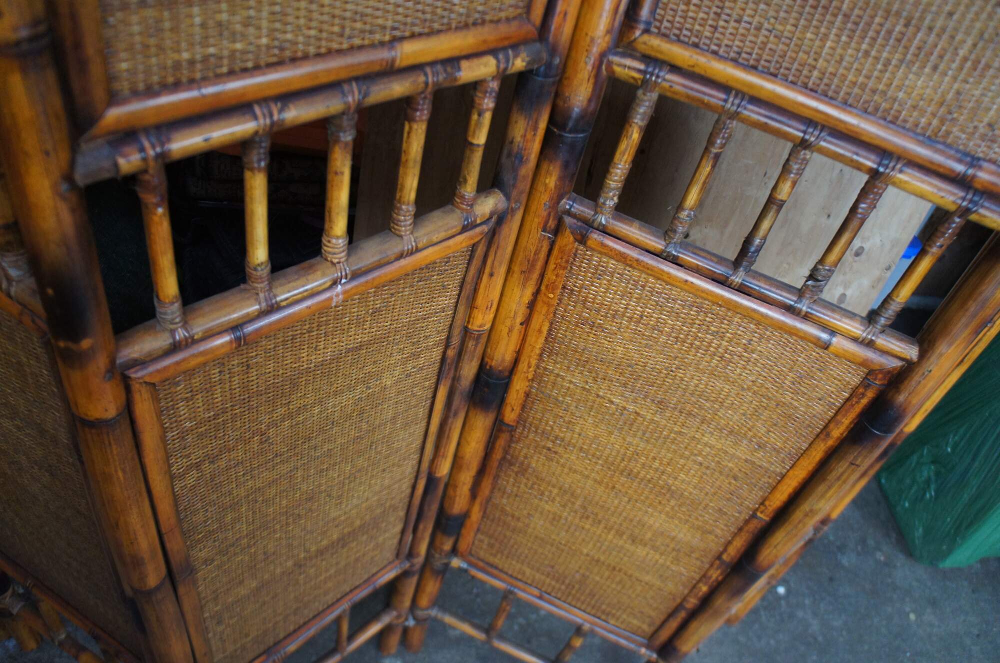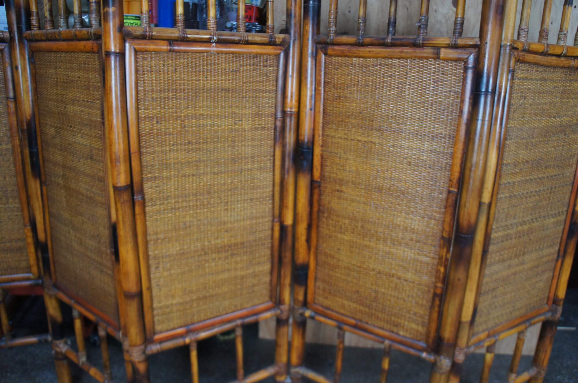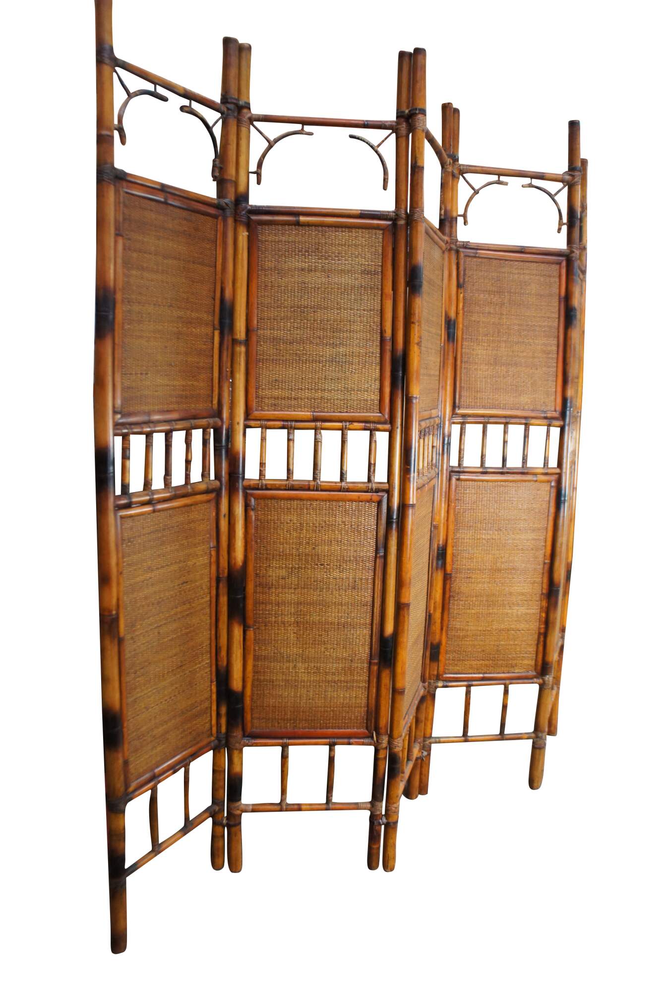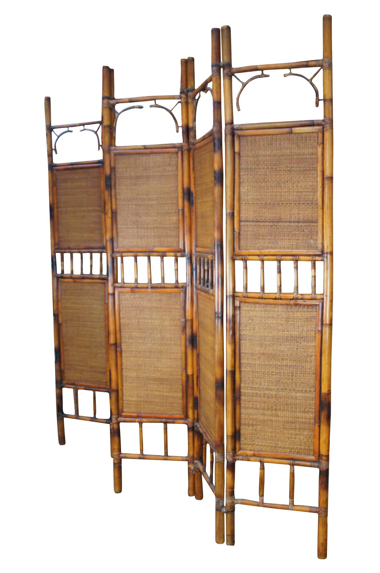 Late 20th Century Chinoiserie folding screen or room divider. Made from bamboo with rattan inserts and a spindled center.