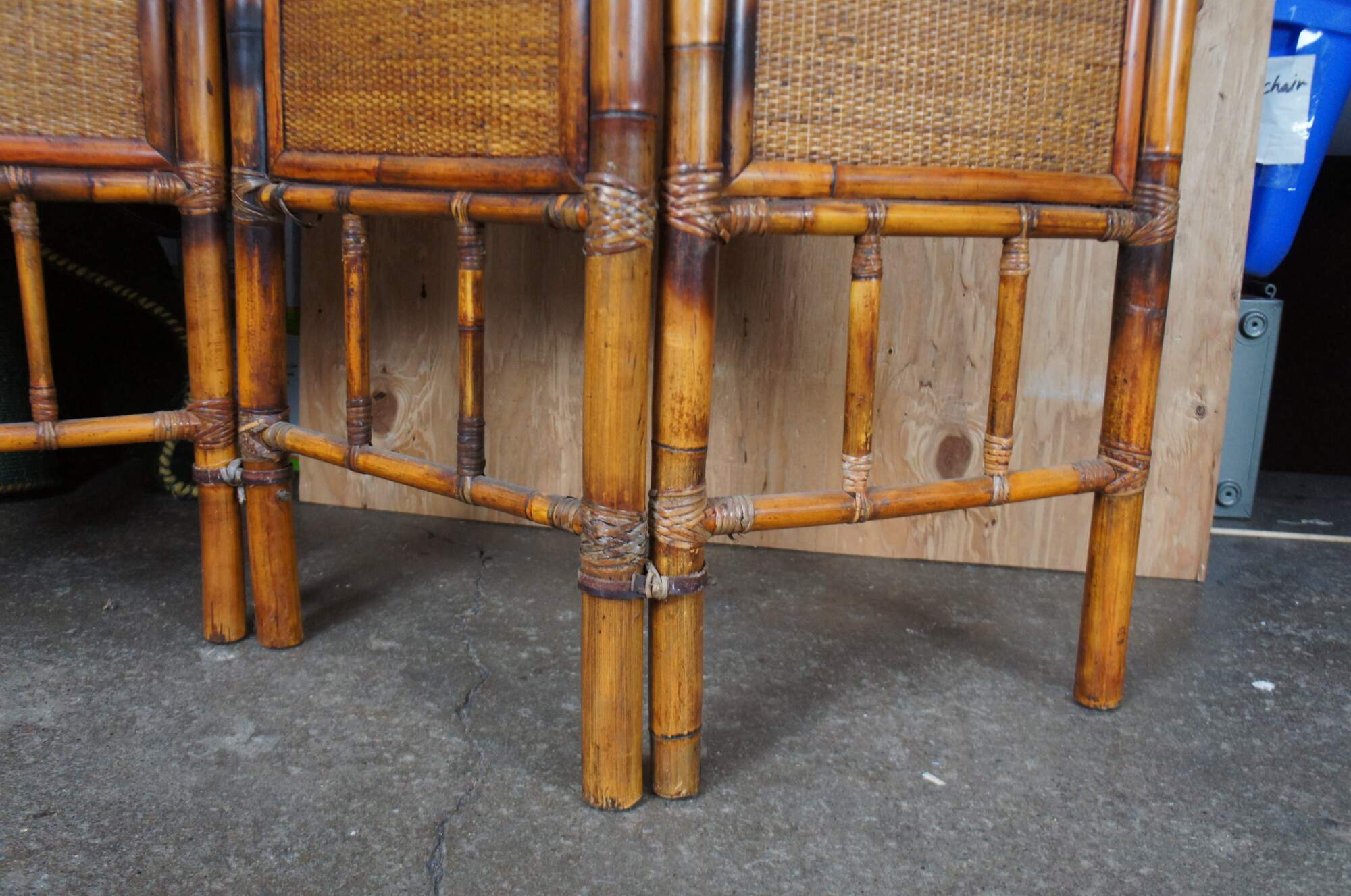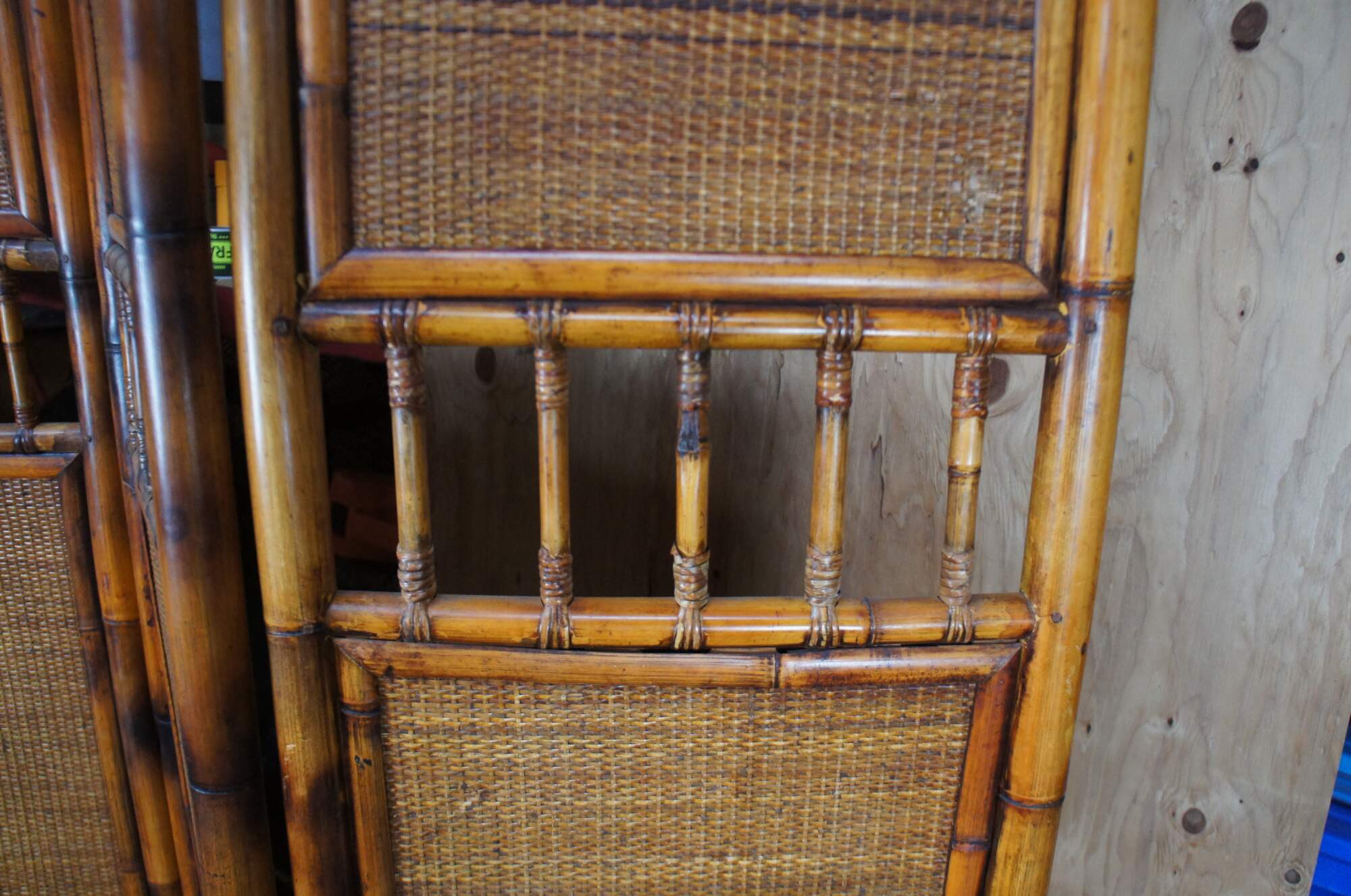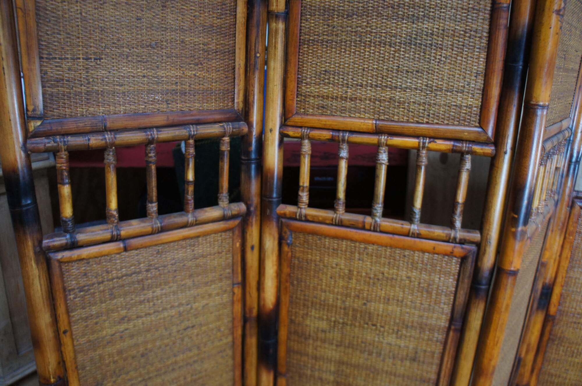 Late 20th Century Chinoiserie folding screen or room divider. Made from bamboo with rattan inserts and a spindled center.