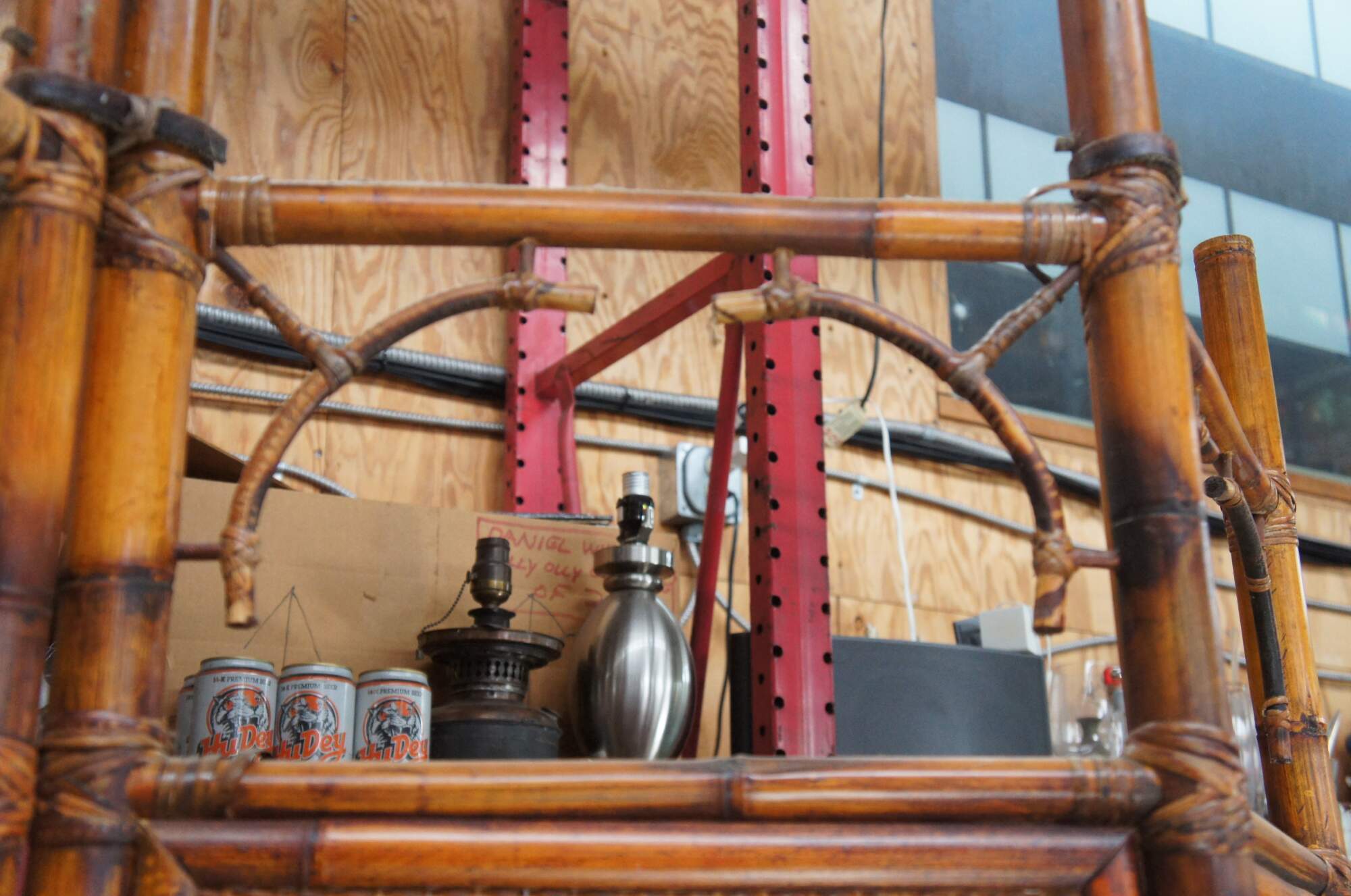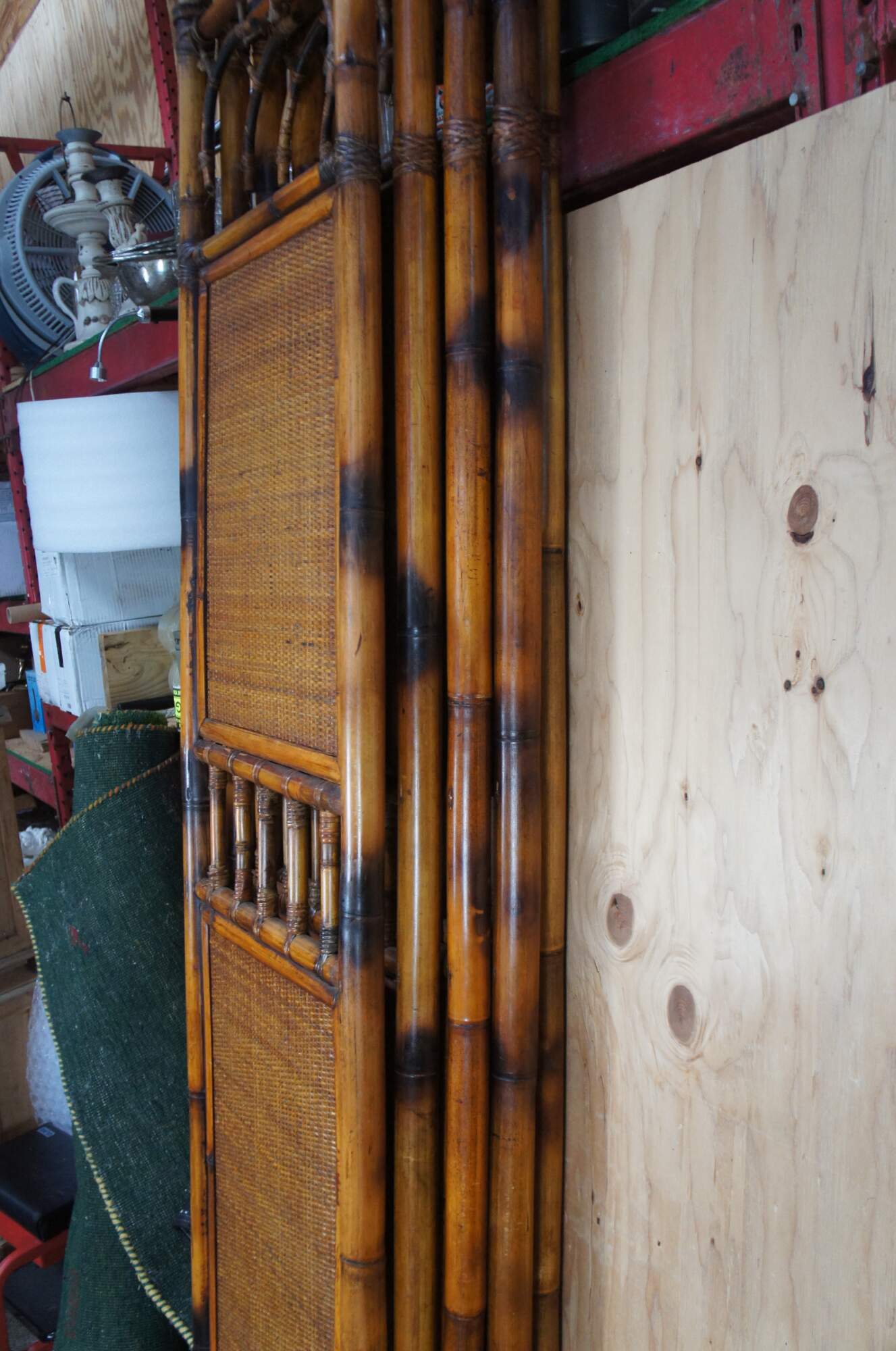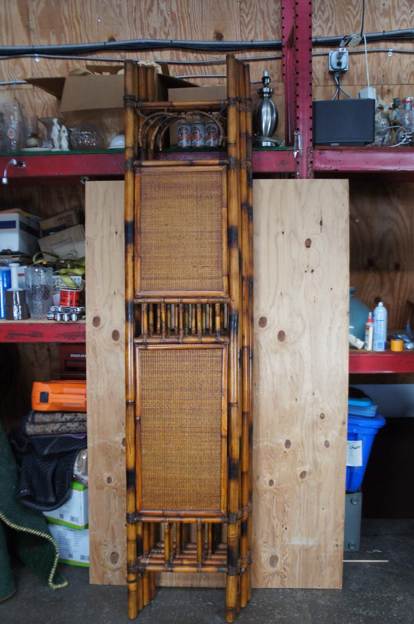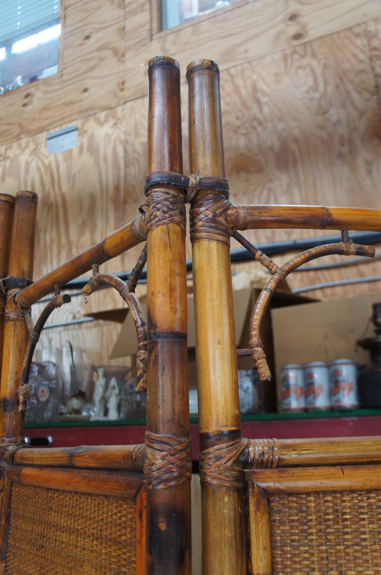 Late 20th Century Chinoiserie folding screen or room divider. Made from bamboo with rattan inserts and a spindled center.