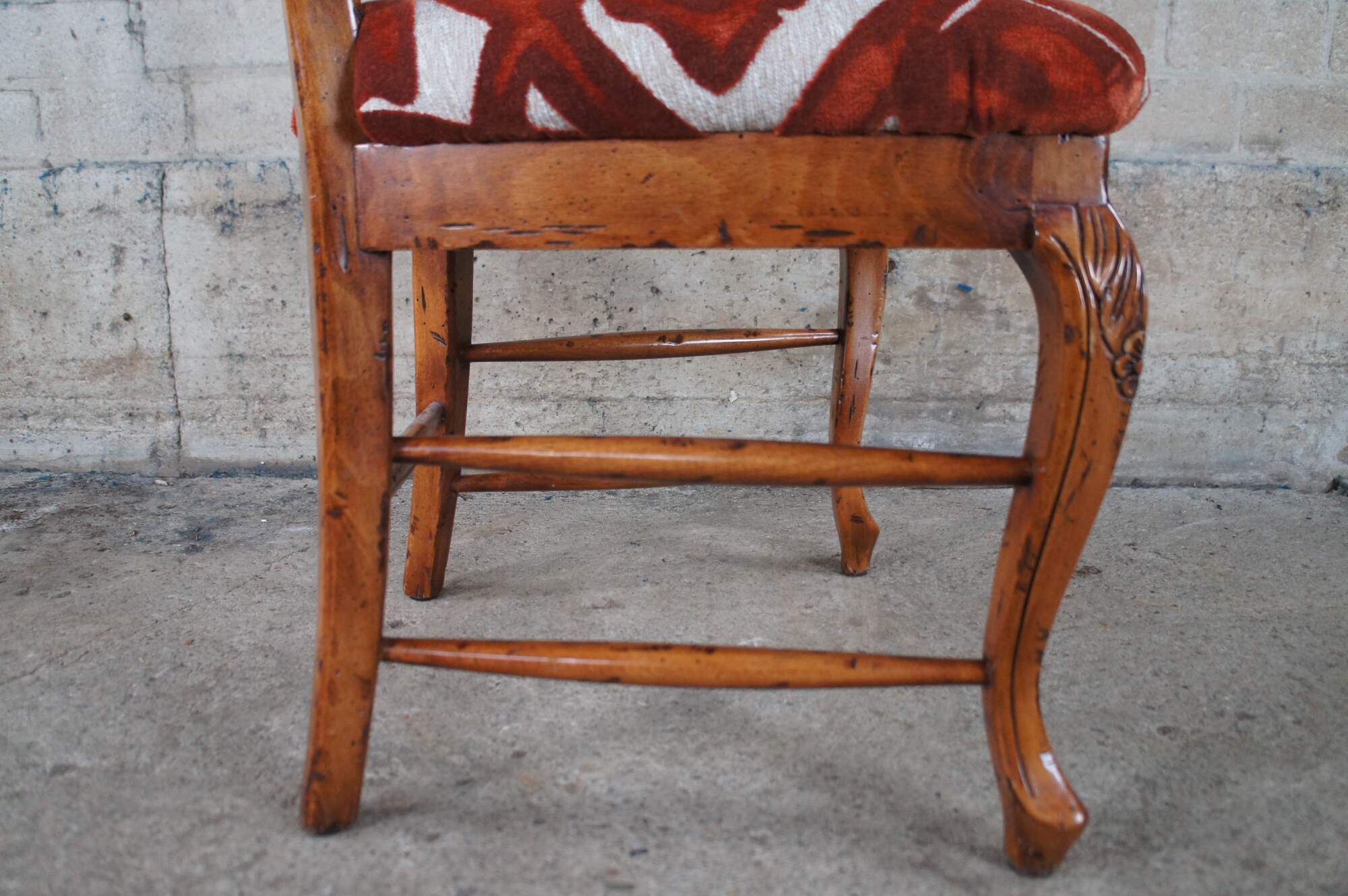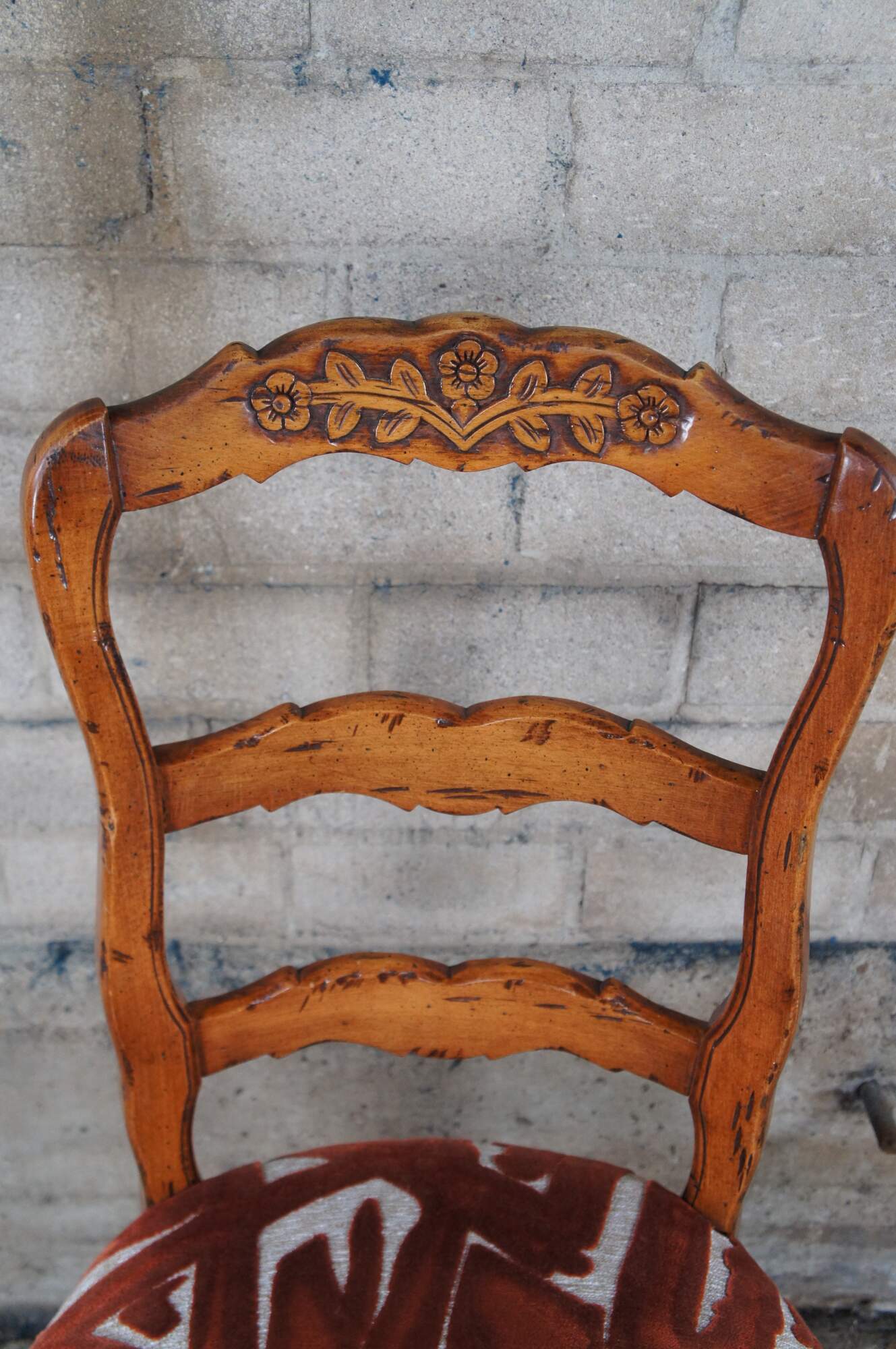 Set of ten vintage ladderback dining chairs featuring French country styling with carved serpentine and floral design. Made in Spain.