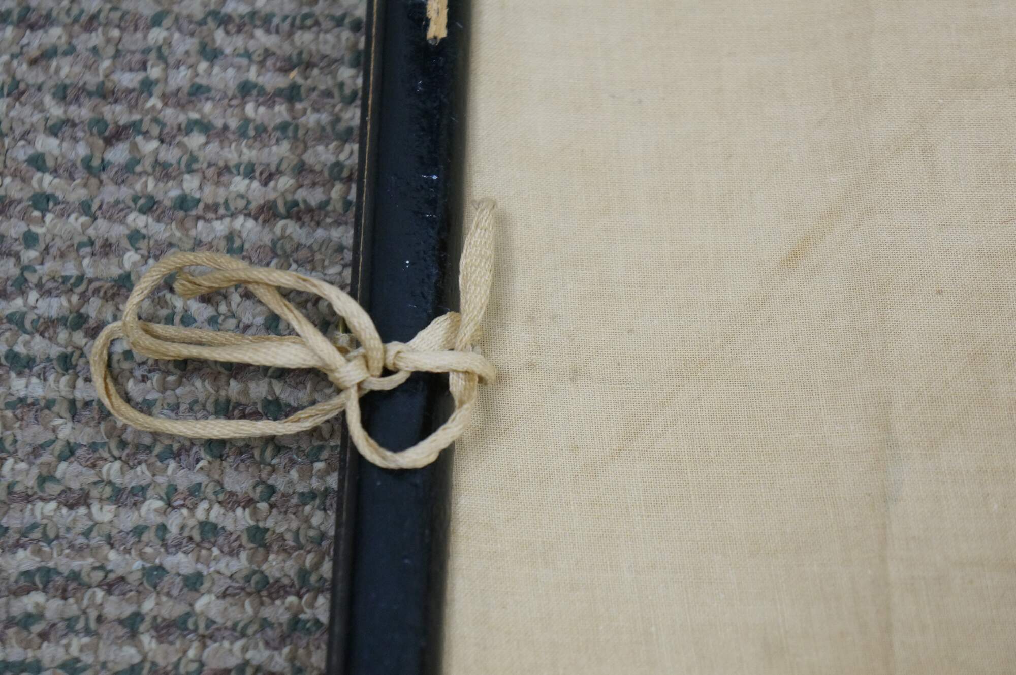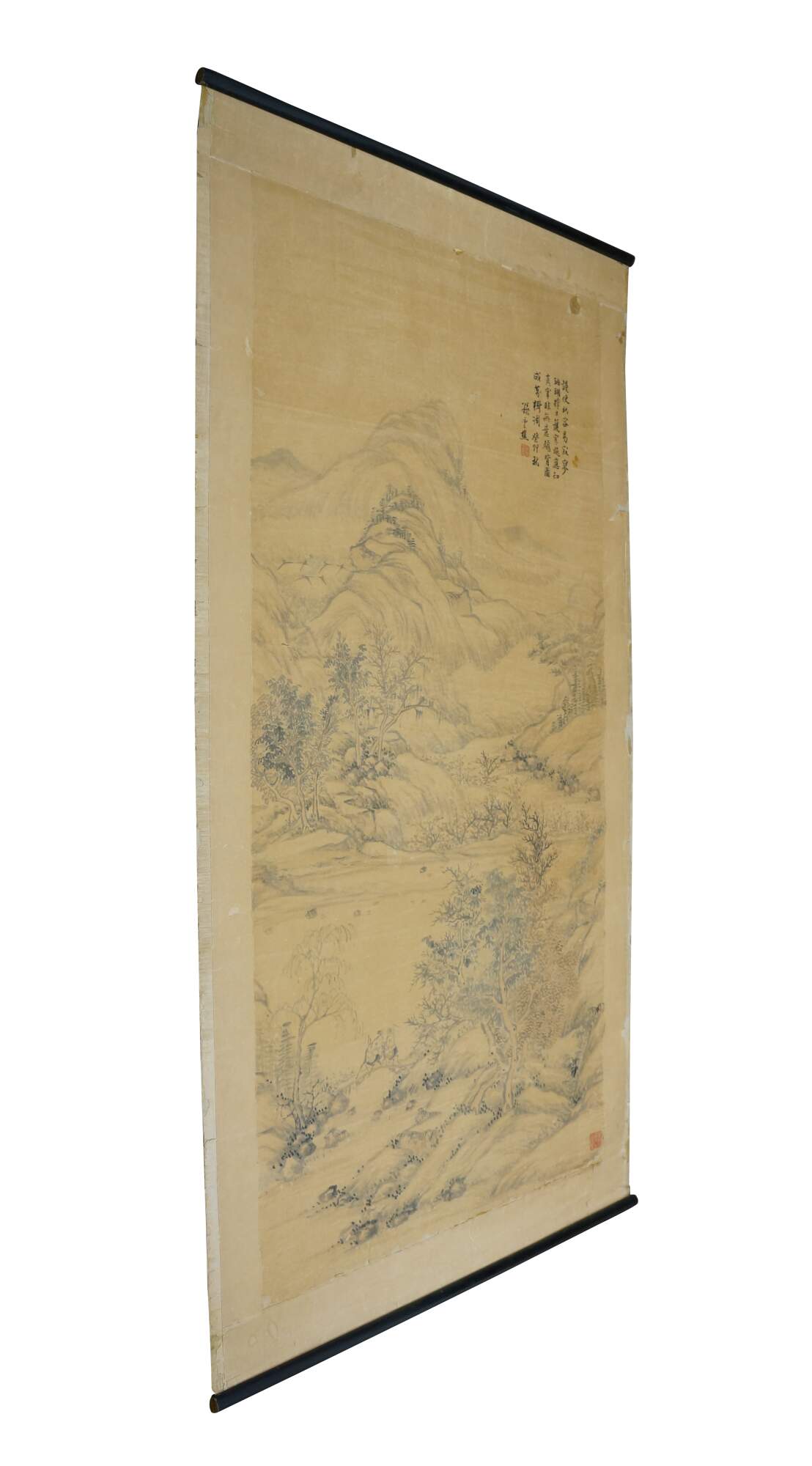 Mid to early century Chinese wall hanging scroll, painted with a pair of figures riding donkeys, crossing a bridge against a landscape of mountains and gnarled pines; by artist Sun Yunqiao. Sealed in the lower right corner. Paper on silk.