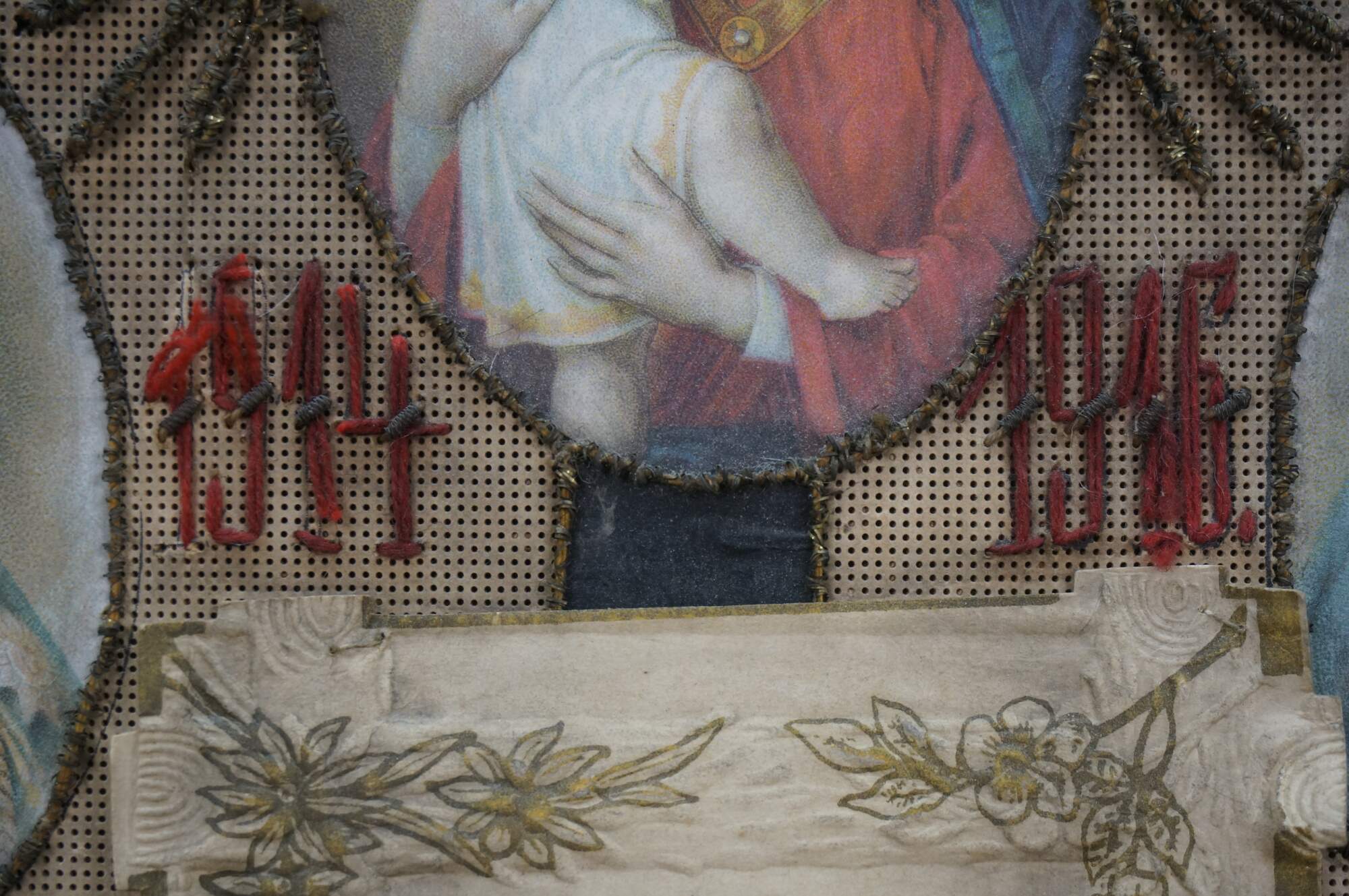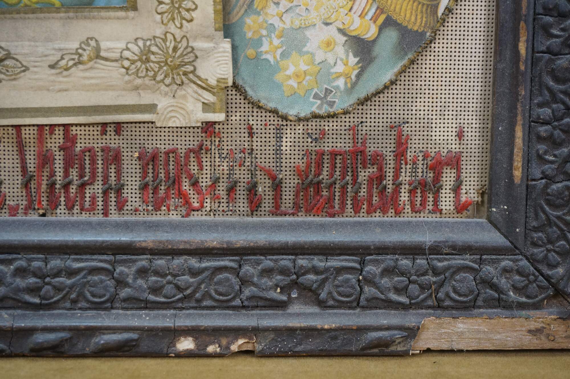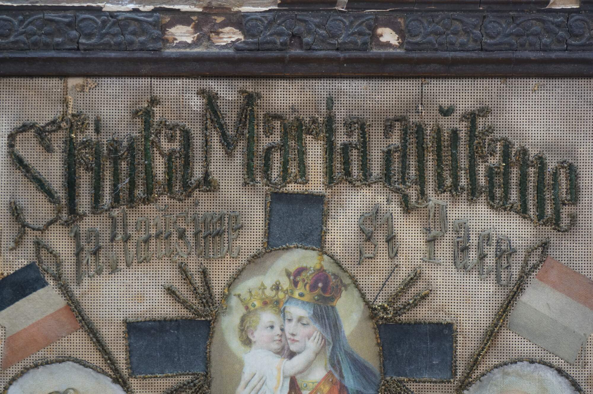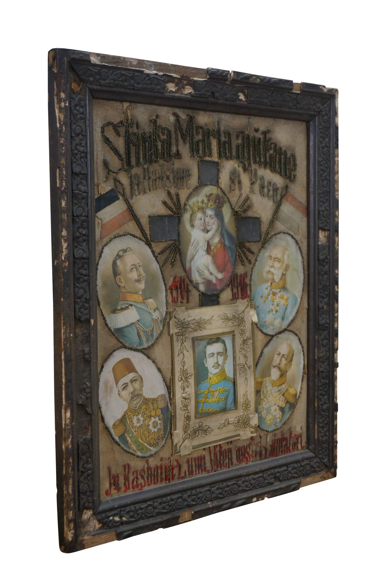 Antique World War I era militaria collage combining lithograph images of the Virgin Mary and Baby Jesus, Kaiser Wilhelm II of Germany, Sultan Mehmed V Reshad of Turkey, Emperor Franz Josef of Austria, Tsar Ferdinand I of Bulgaria, and Emperor Karl I of Austria with silk accents and embroidered details and text. Dated 1914-1916 the text appears to be a call to Mary for peace and help. Heavily worn, black painted, floral carved wood frame.