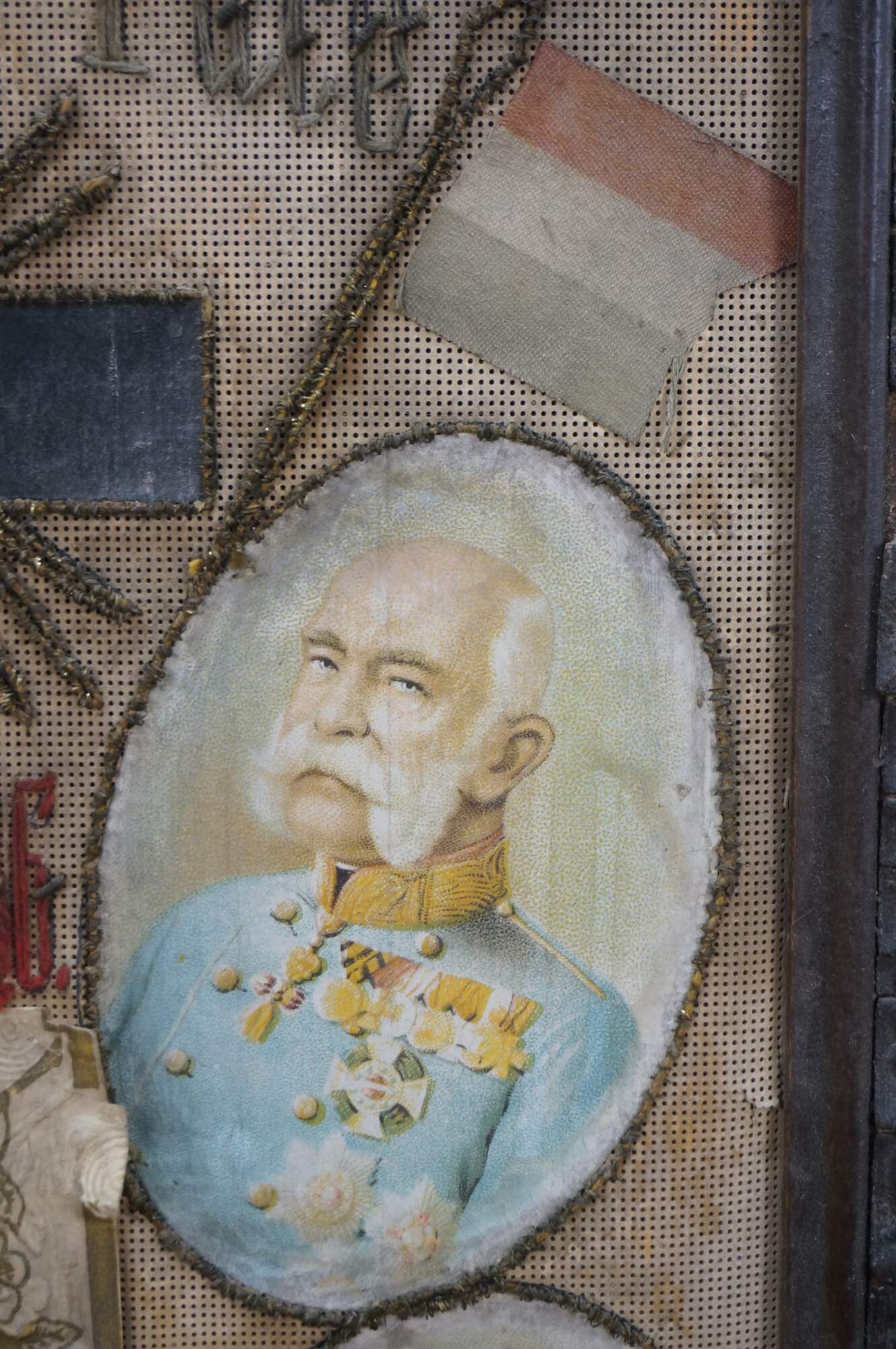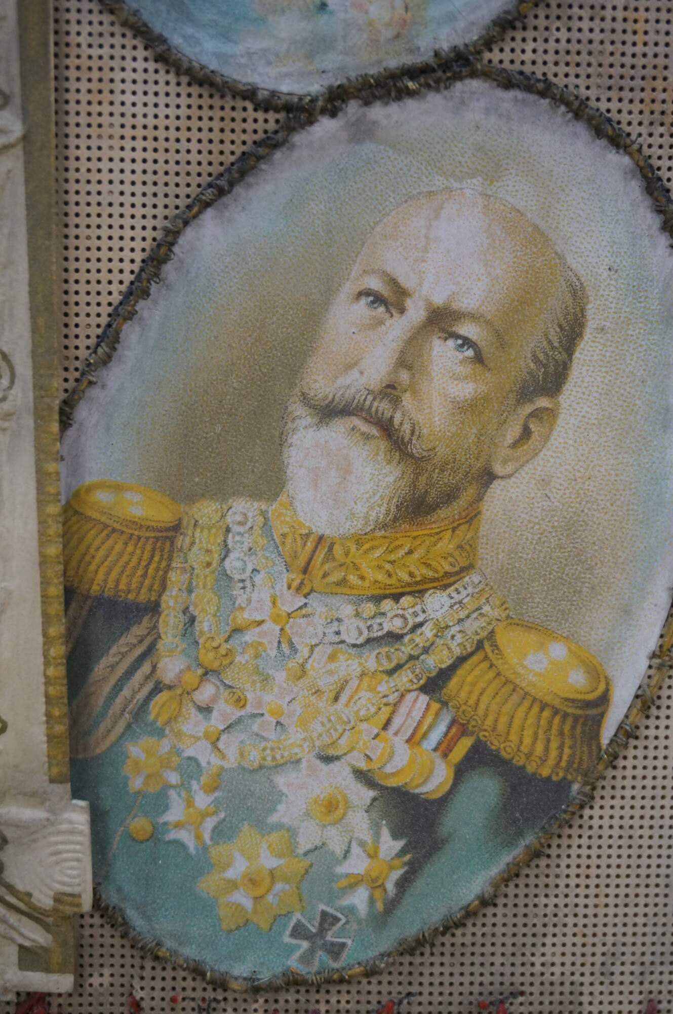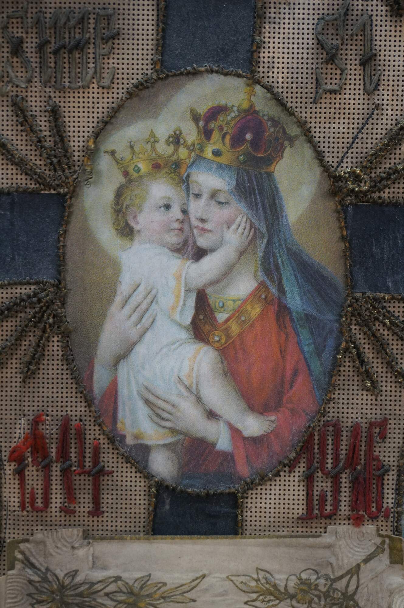 Antique World War I era militaria collage combining lithograph images of the Virgin Mary and Baby Jesus, Kaiser Wilhelm II of Germany, Sultan Mehmed V Reshad of Turkey, Emperor Franz Josef of Austria, Tsar Ferdinand I of Bulgaria, and Emperor Karl I of Austria with silk accents and embroidered details and text. Dated 1914-1916 the text appears to be a call to Mary for peace and help. Heavily worn, black painted, floral carved wood frame.