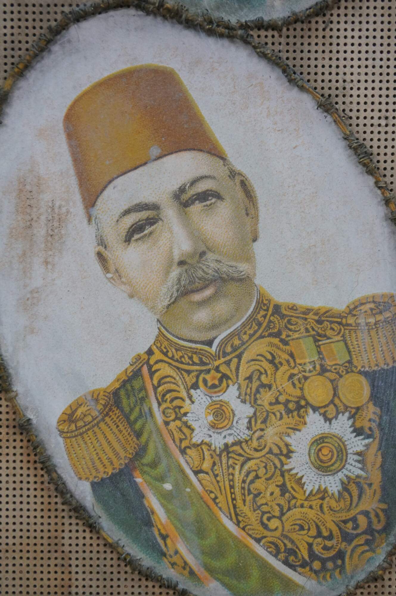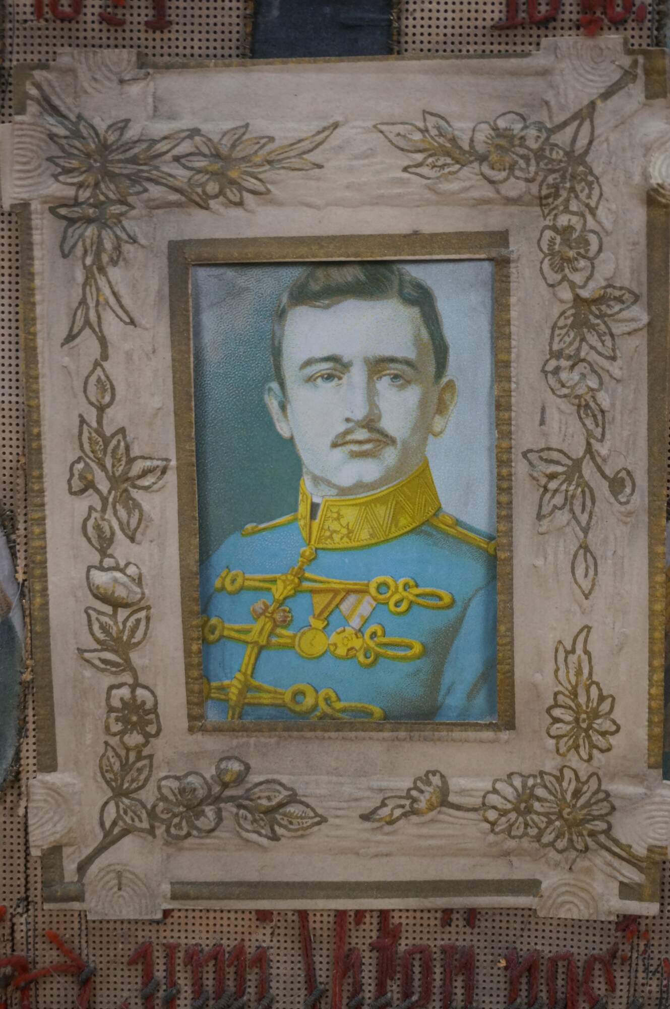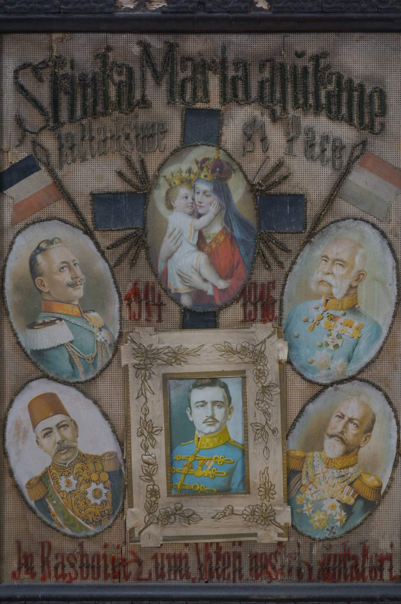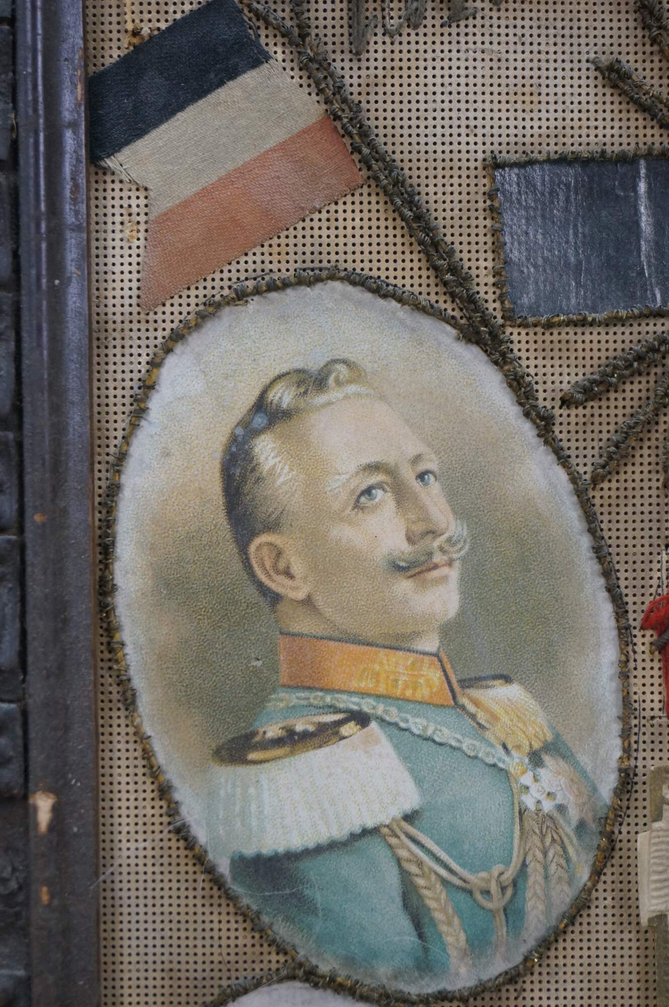 Antique World War I era militaria collage combining lithograph images of the Virgin Mary and Baby Jesus, Kaiser Wilhelm II of Germany, Sultan Mehmed V Reshad of Turkey, Emperor Franz Josef of Austria, Tsar Ferdinand I of Bulgaria, and Emperor Karl I of Austria with silk accents and embroidered details and text. Dated 1914-1916 the text appears to be a call to Mary for peace and help. Heavily worn, black painted, floral carved wood frame.