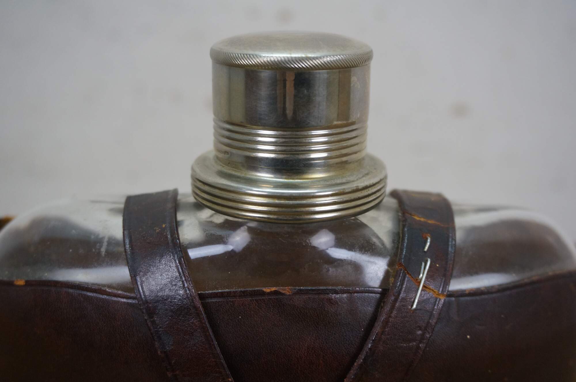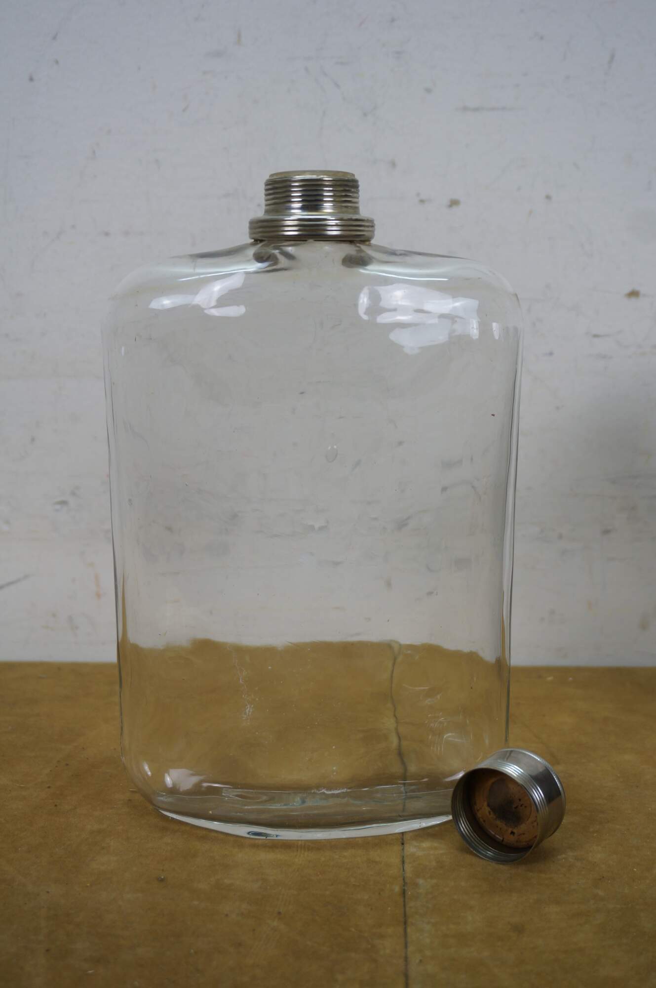 Circa mid-20th century oversized glass hip flask with silver plate screw cap and brown leather case. Purchased from the EH Crump Estate, accompanied by a business card from an antique store where it was likely purchased.