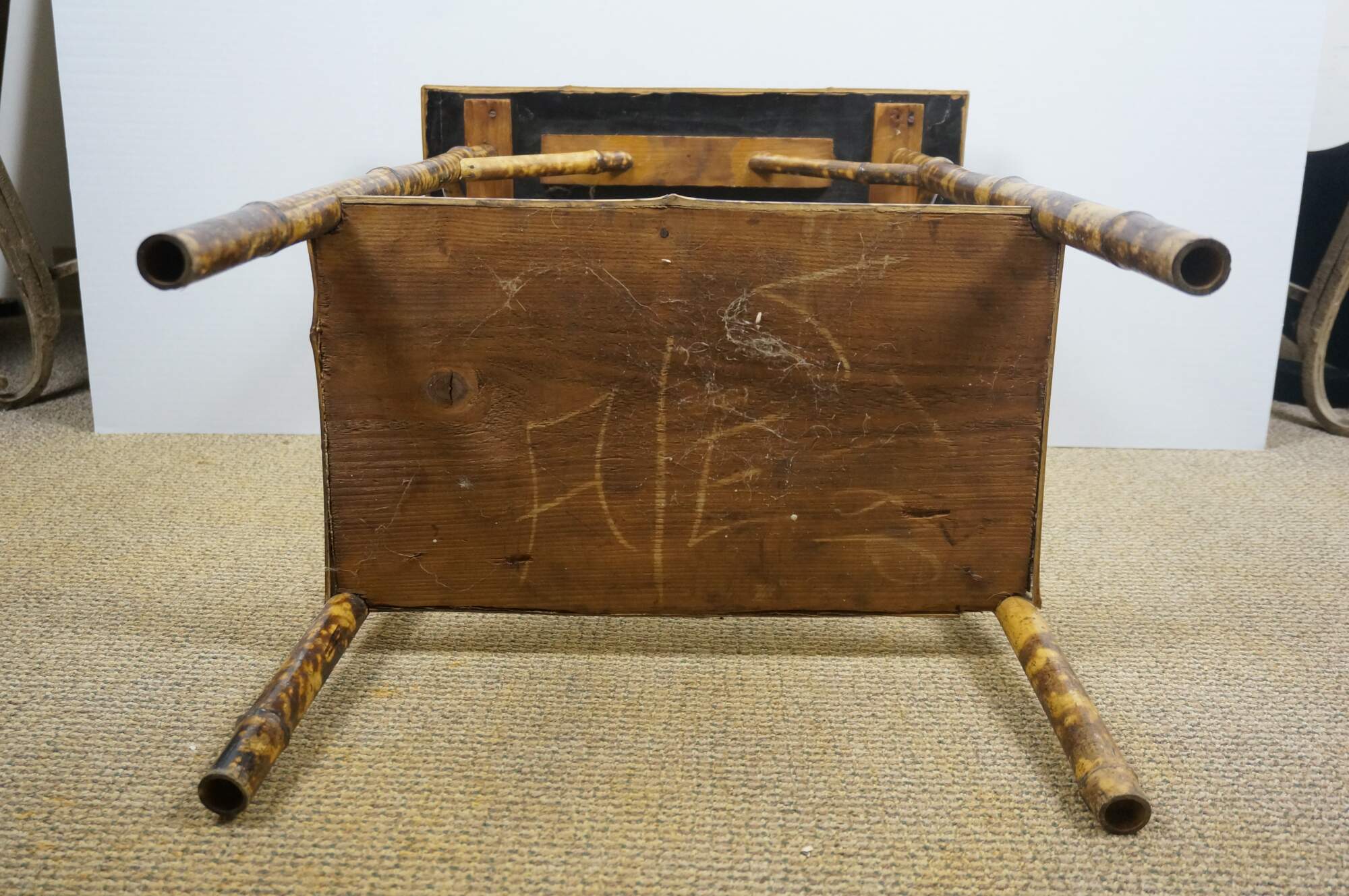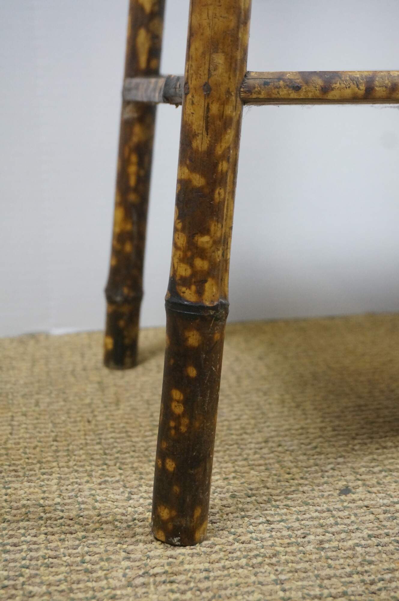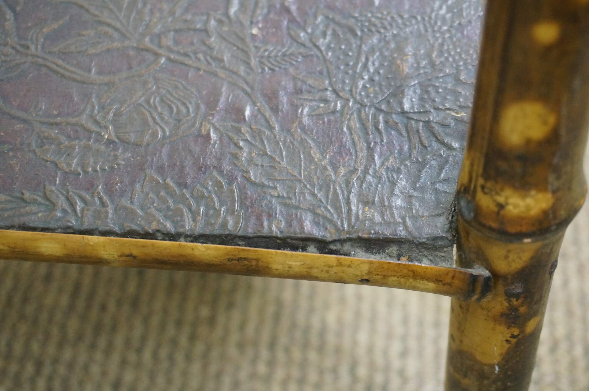 Mid to early 20th century scorched bamboo occasional / accent table with painted lacquer top. Made of tortoiseshell patterned bamboo with an inset black lacquer top stamped with a semi-abstracted chinoiserie design of a hummingbird flying through foliage and a stalk of flowers. Lower shelf is topped with tooled embossed floral / acanthus leather.