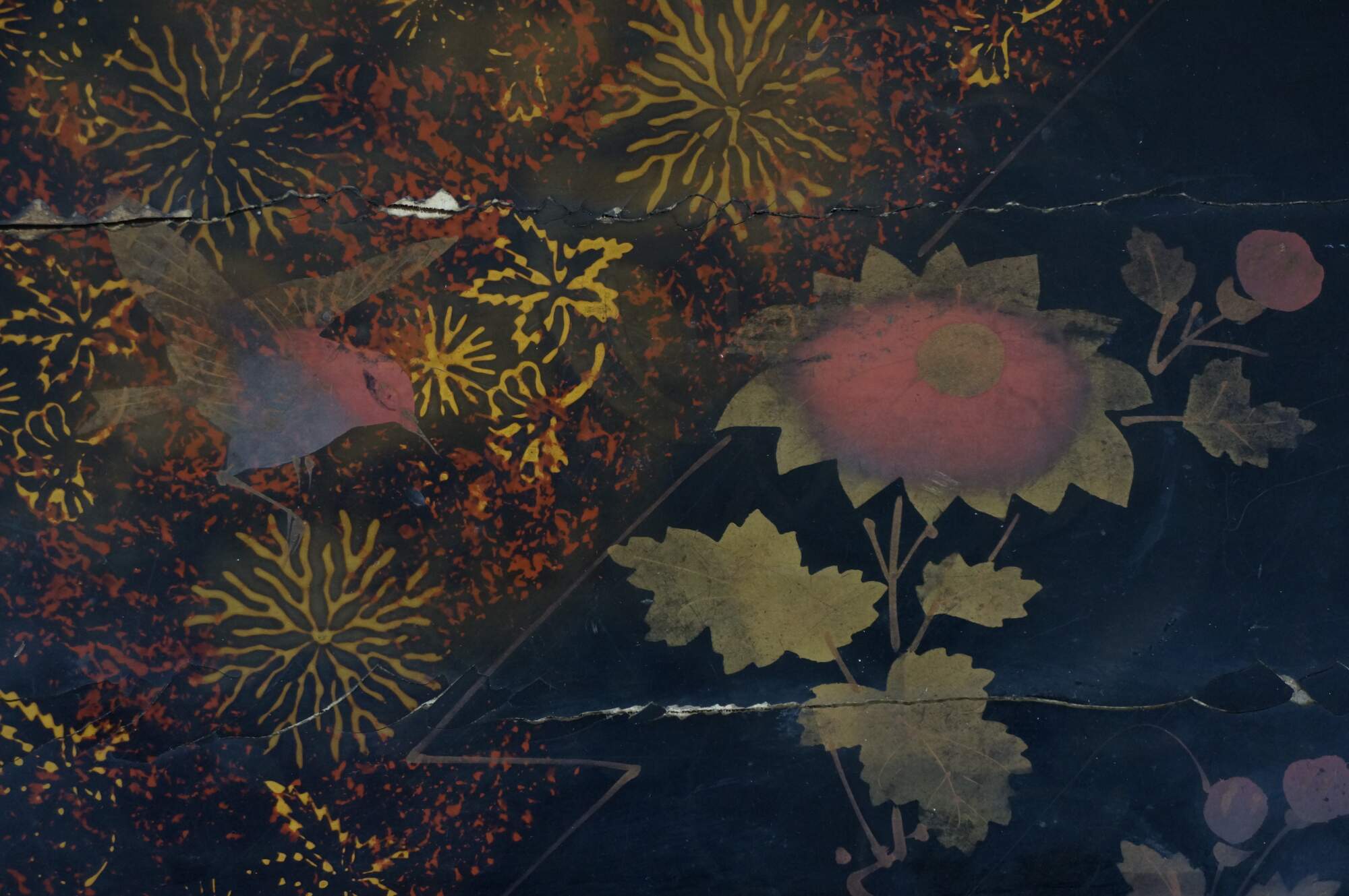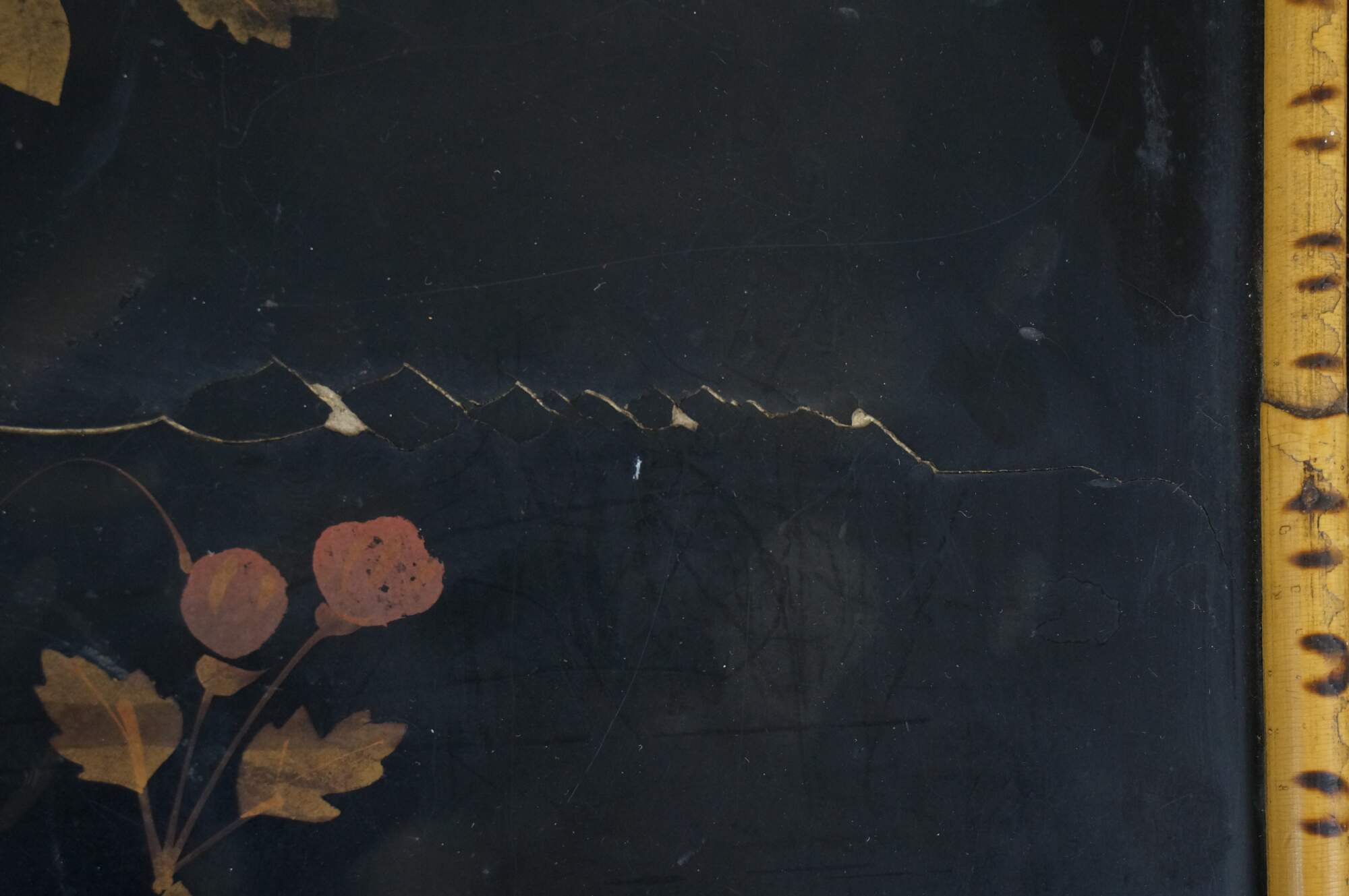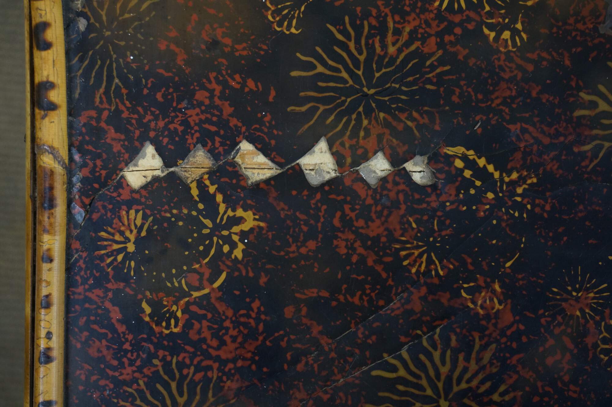 Mid to early 20th century scorched bamboo occasional / accent table with painted lacquer top. Made of tortoiseshell patterned bamboo with an inset black lacquer top stamped with a semi-abstracted chinoiserie design of a hummingbird flying through foliage and a stalk of flowers. Lower shelf is topped with tooled embossed floral / acanthus leather.