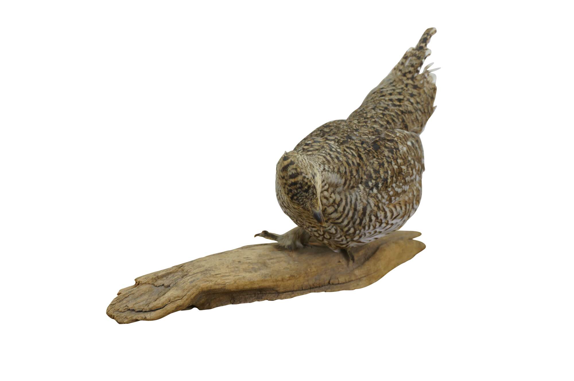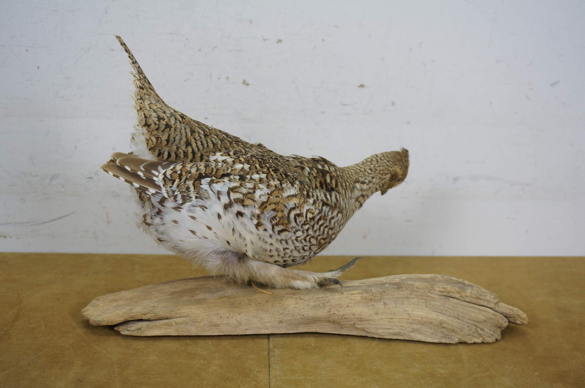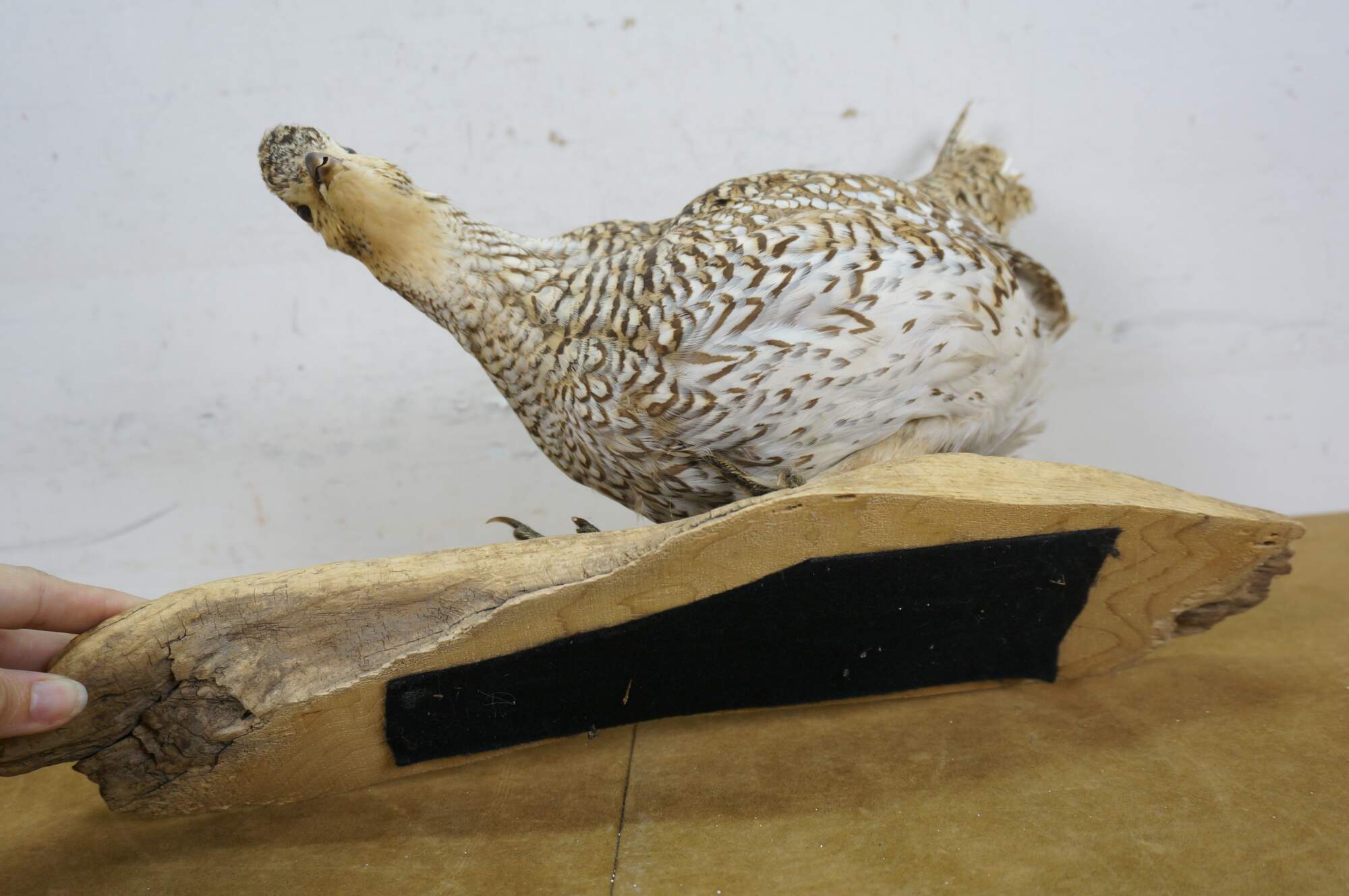 Vintage Sharptail Grouse game bird taxidermy mount on driftwood base.