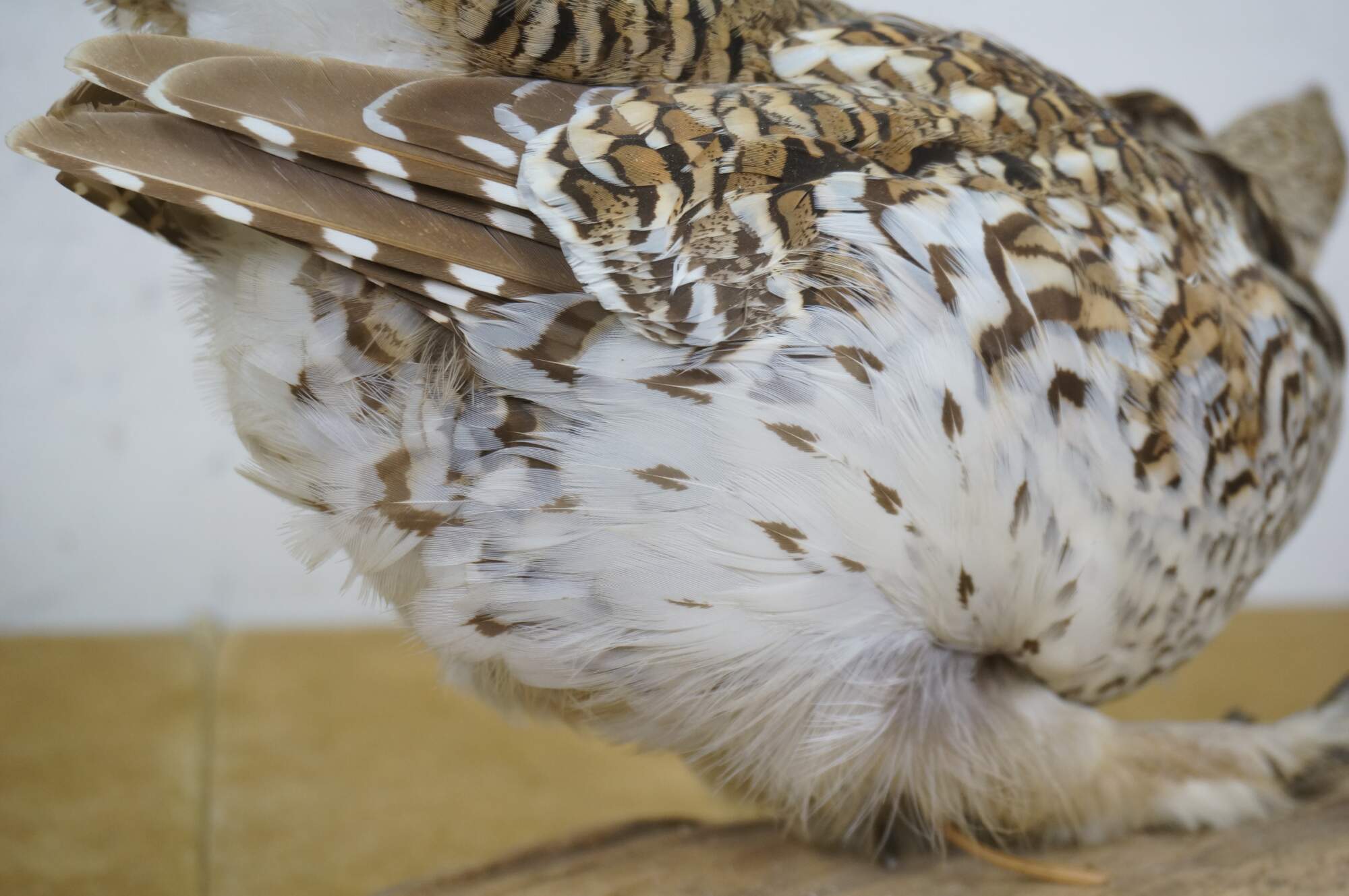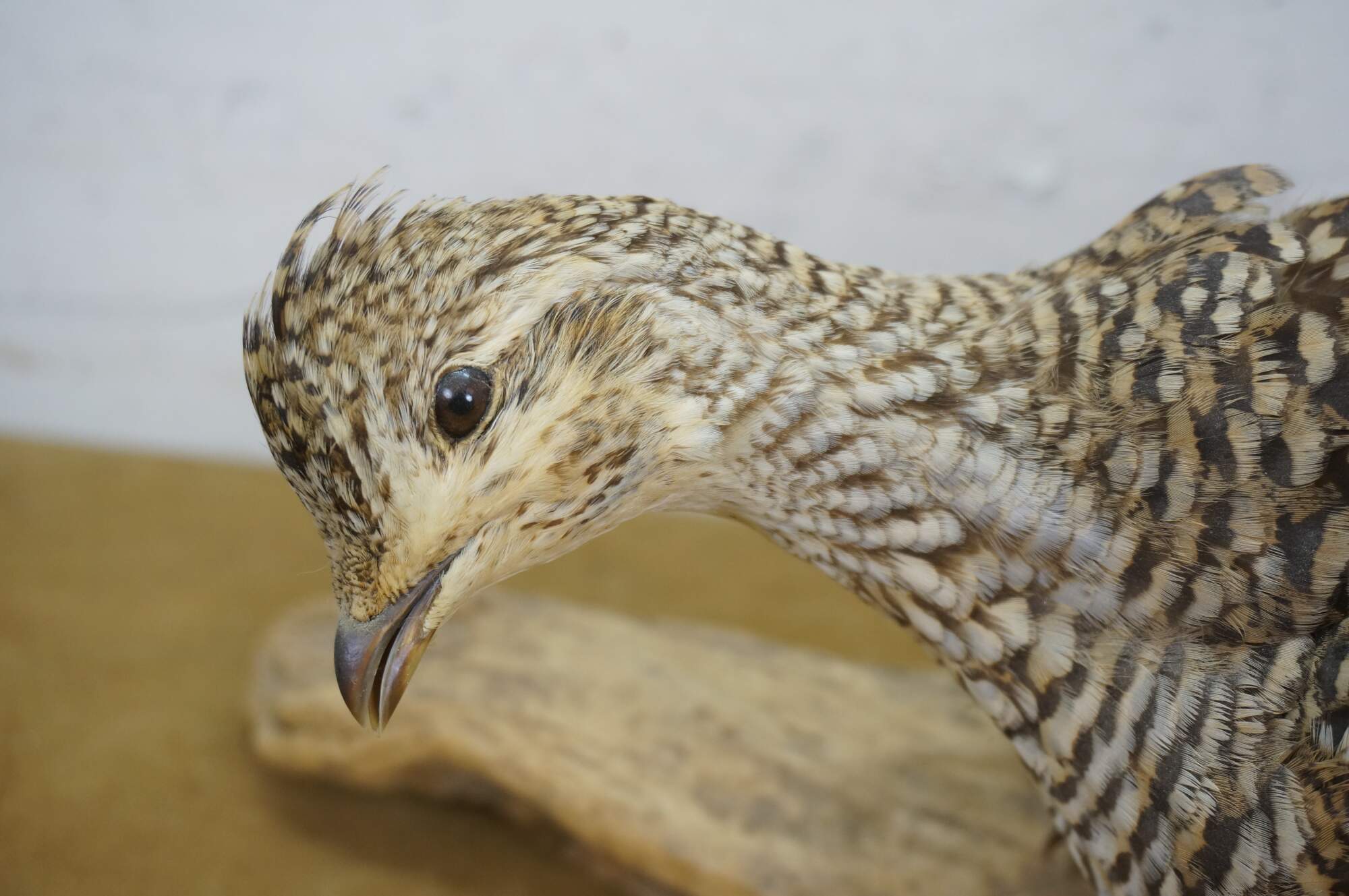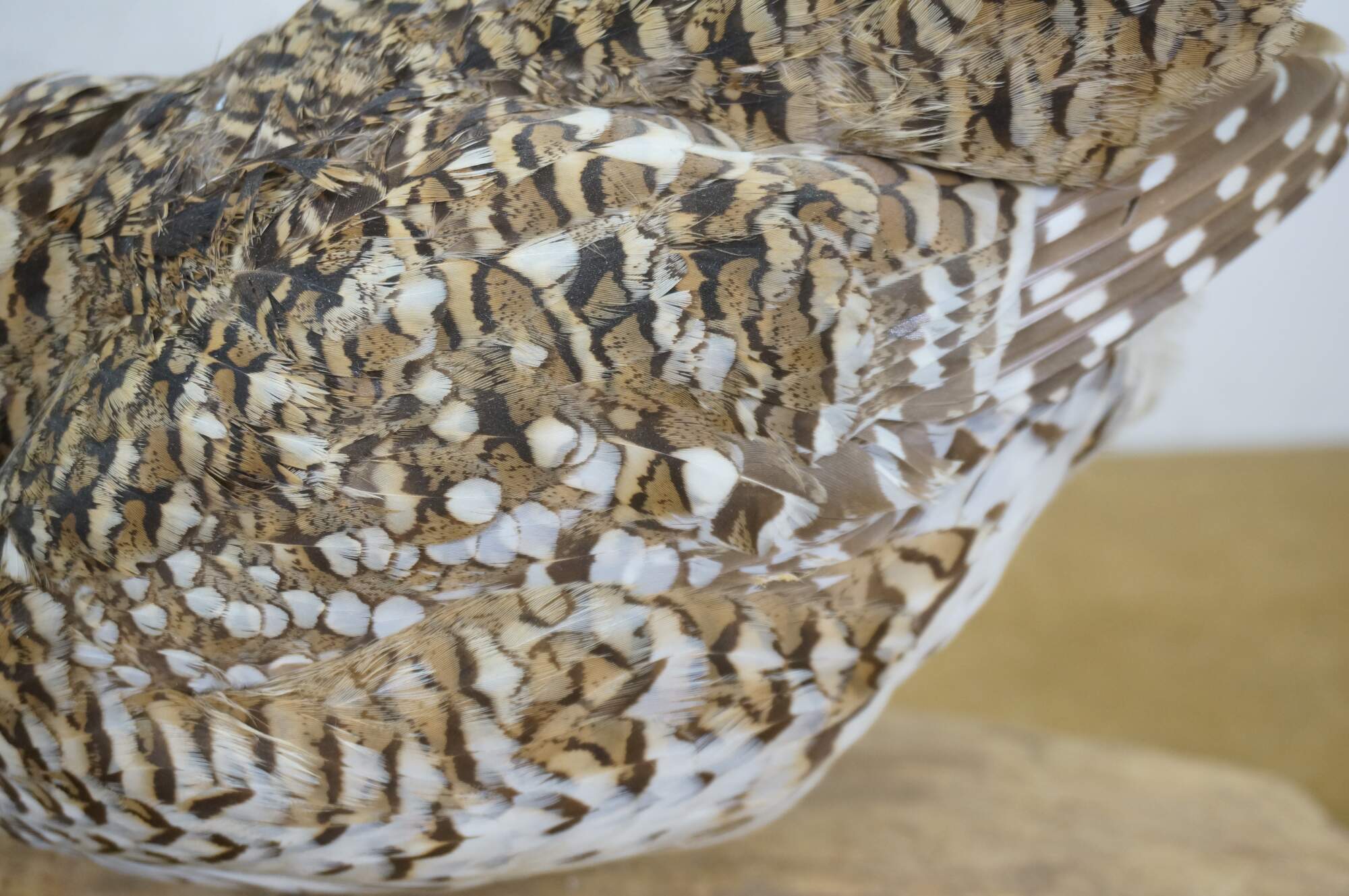 Vintage Sharptail Grouse game bird taxidermy mount on driftwood base.