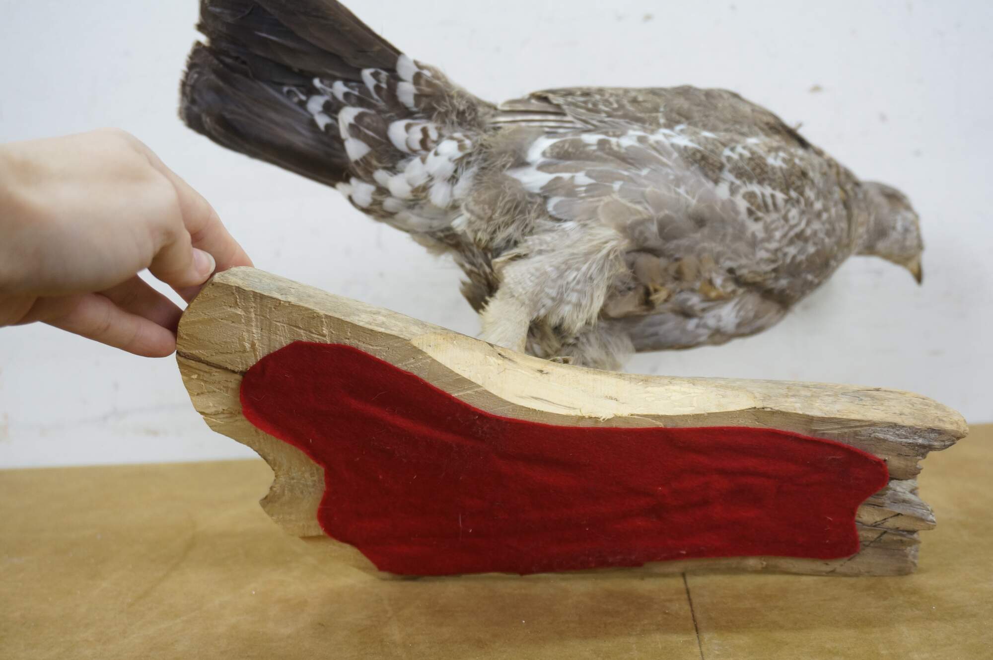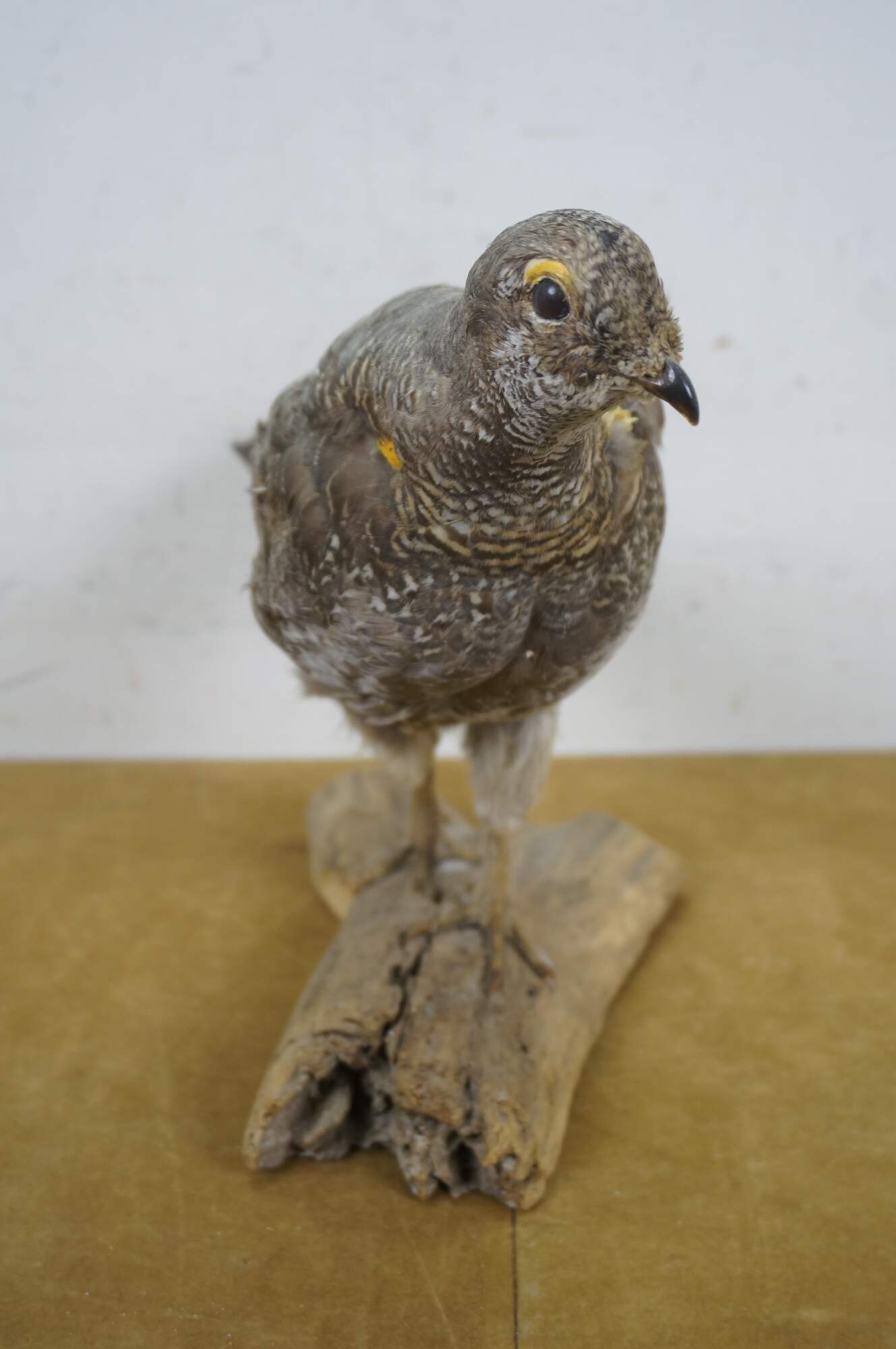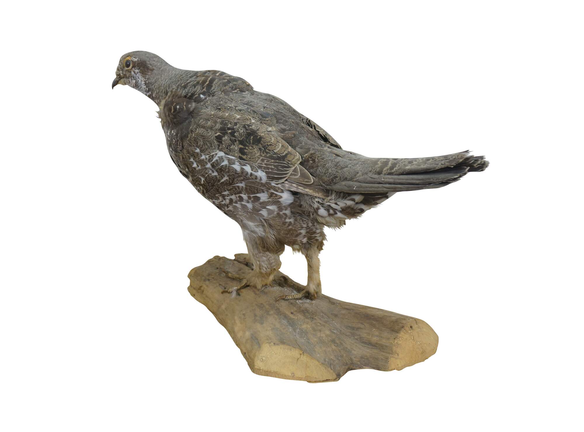 Vintage Spruce Grouse game bird taxidermy mount on driftwood base.