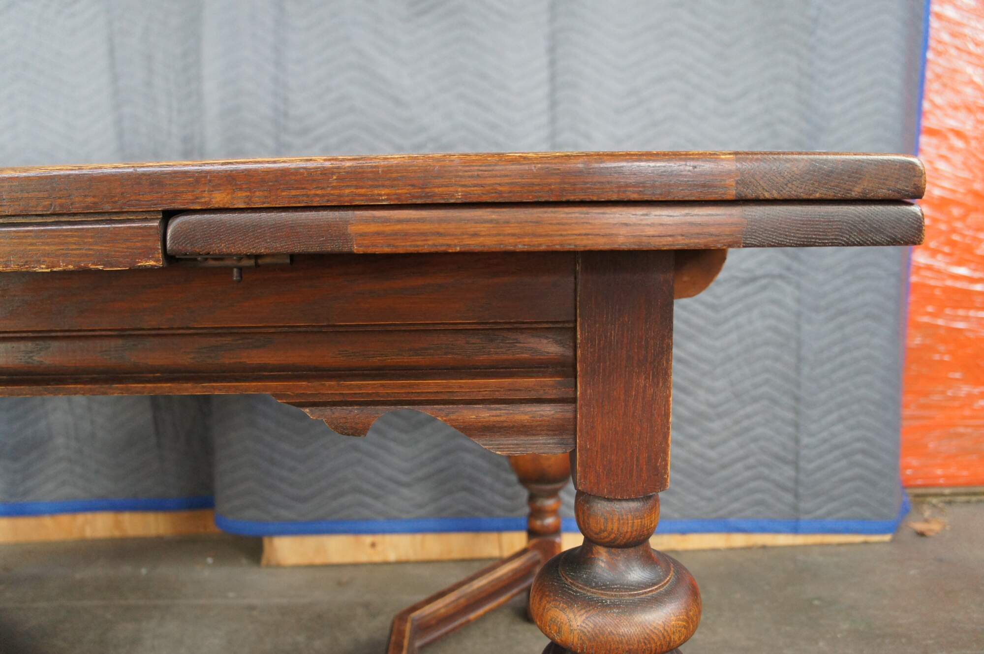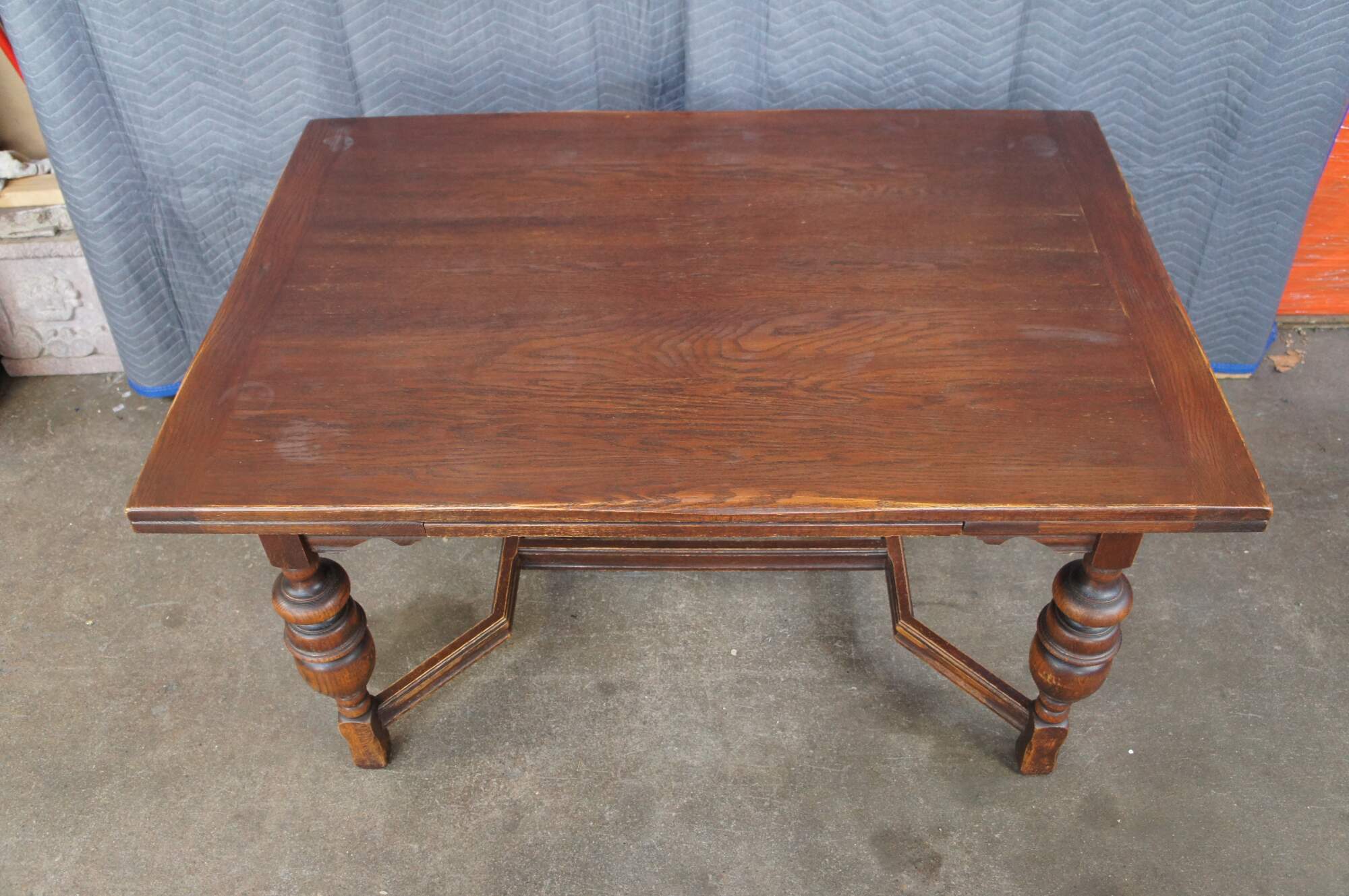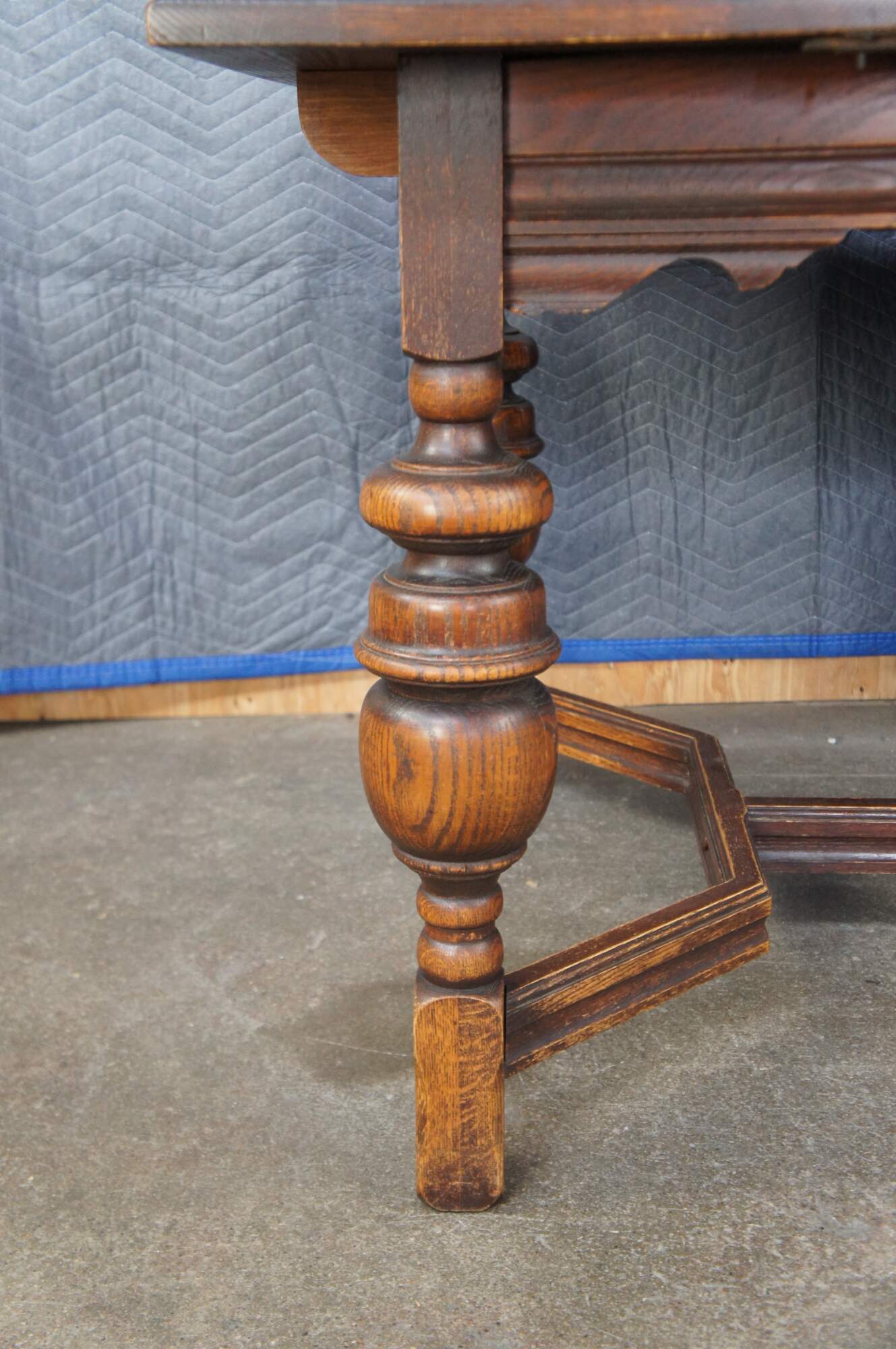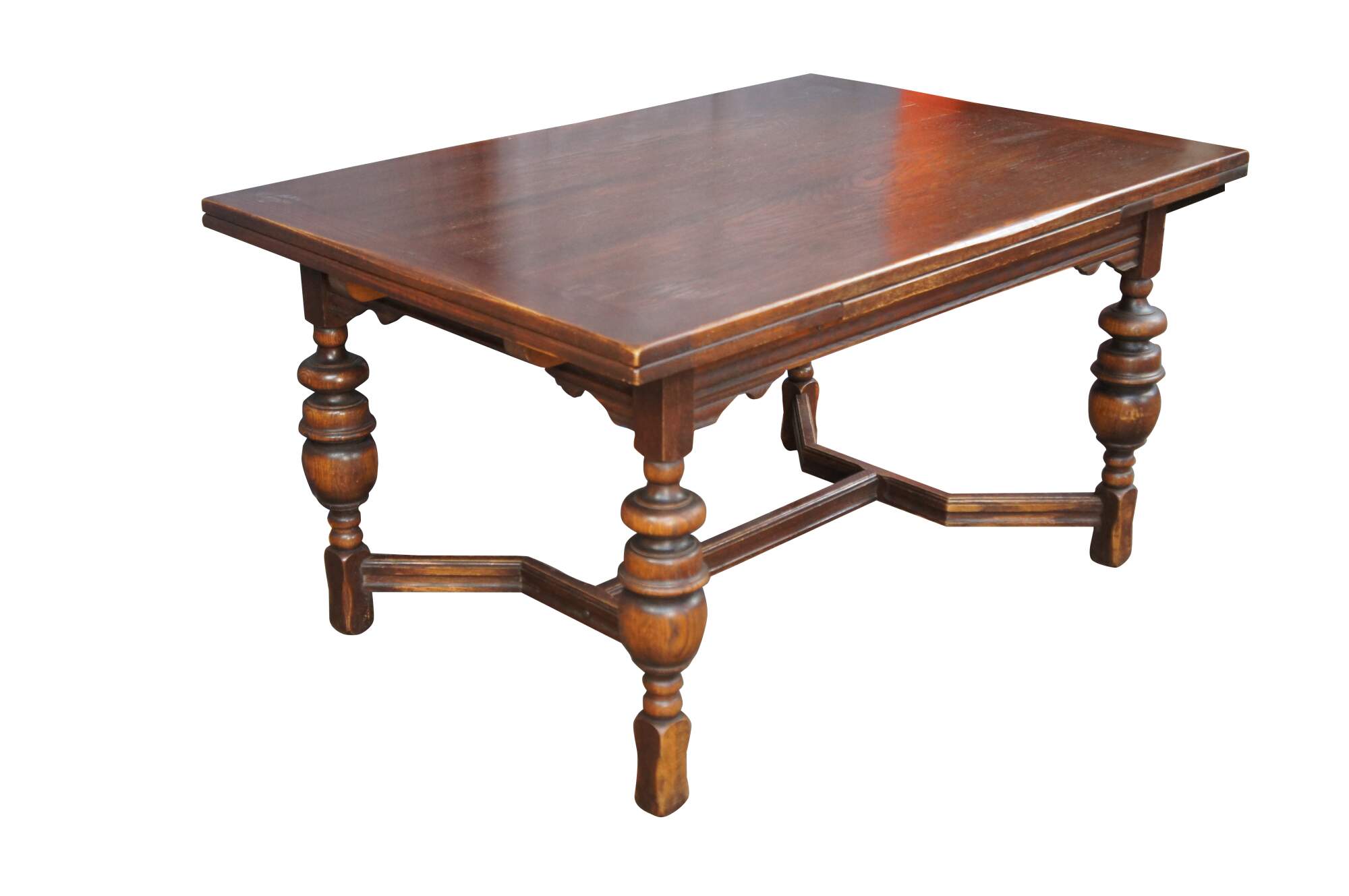 Early 20th Century Jacobean style draw leaf dining table. Features a rectangular form with two 15" draw leaves over a serpentine cut skirt, connected to a robust baluster turned trestle base.