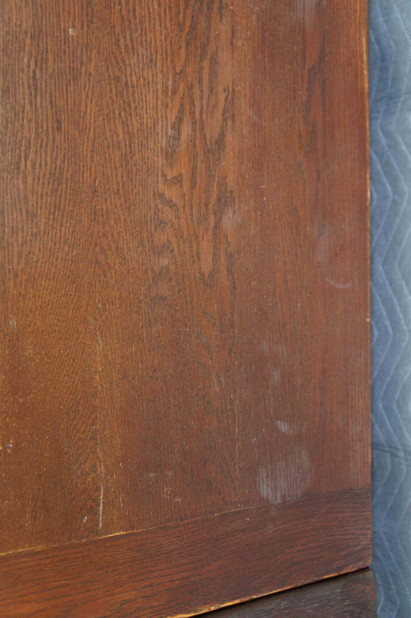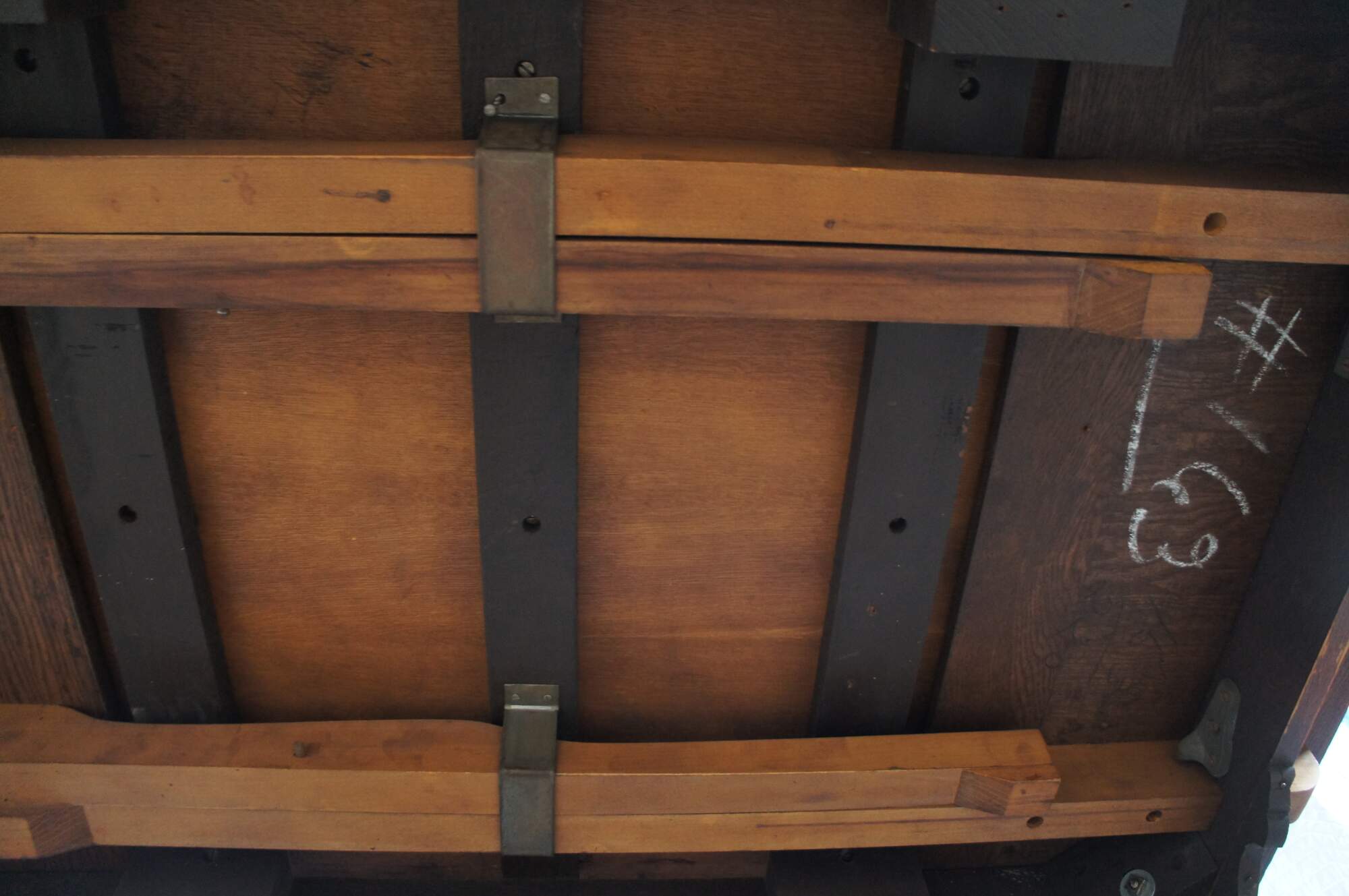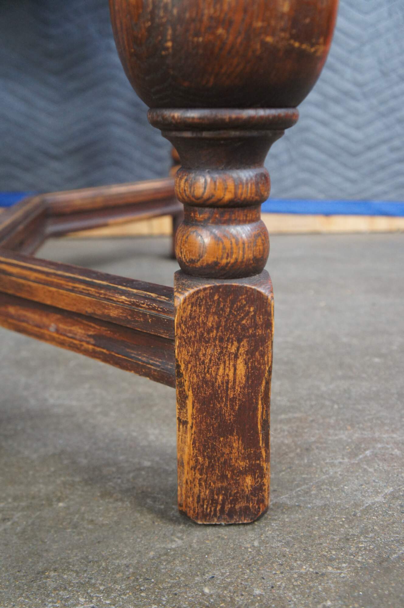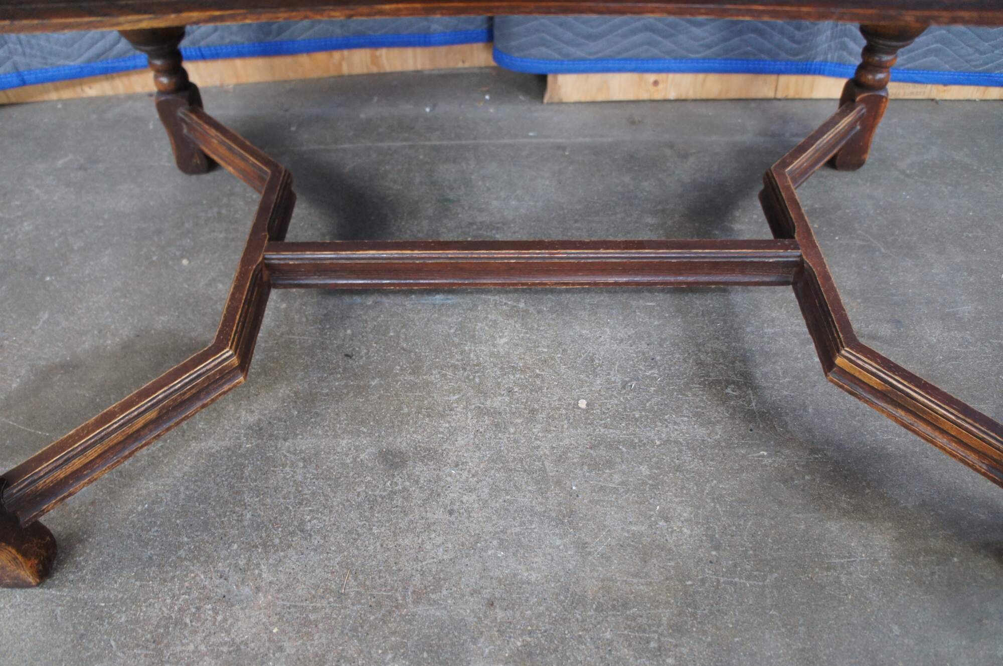Early 20th Century Jacobean style draw leaf dining table. Features a rectangular form with two 15" draw leaves over a serpentine cut skirt, connected to a robust baluster turned trestle base.