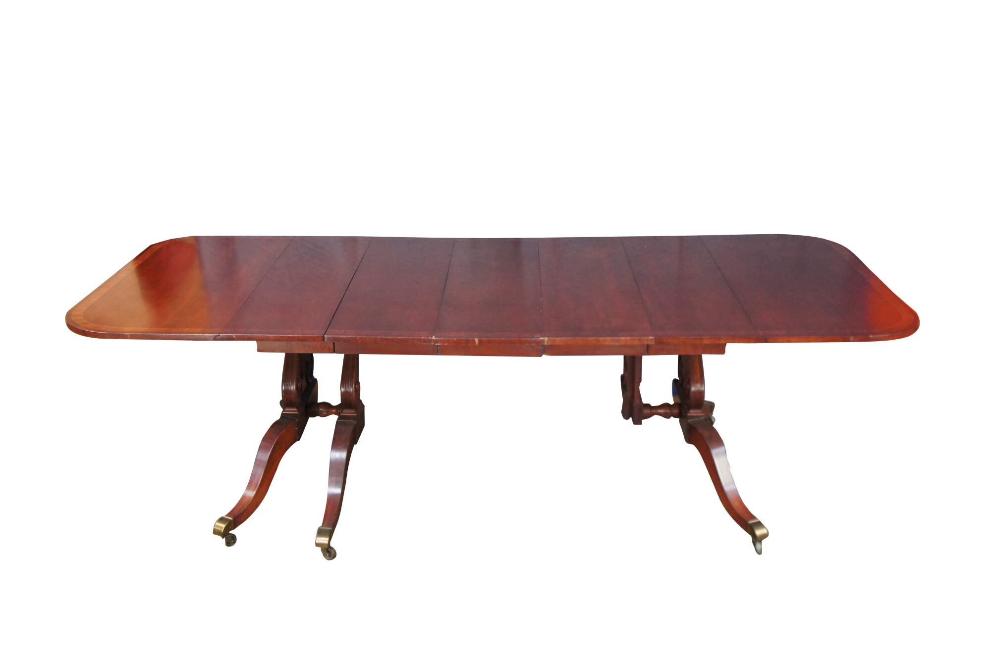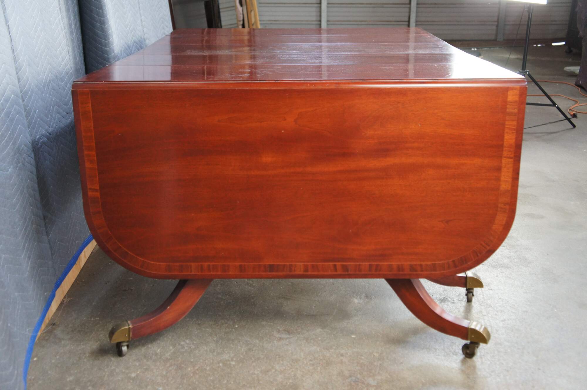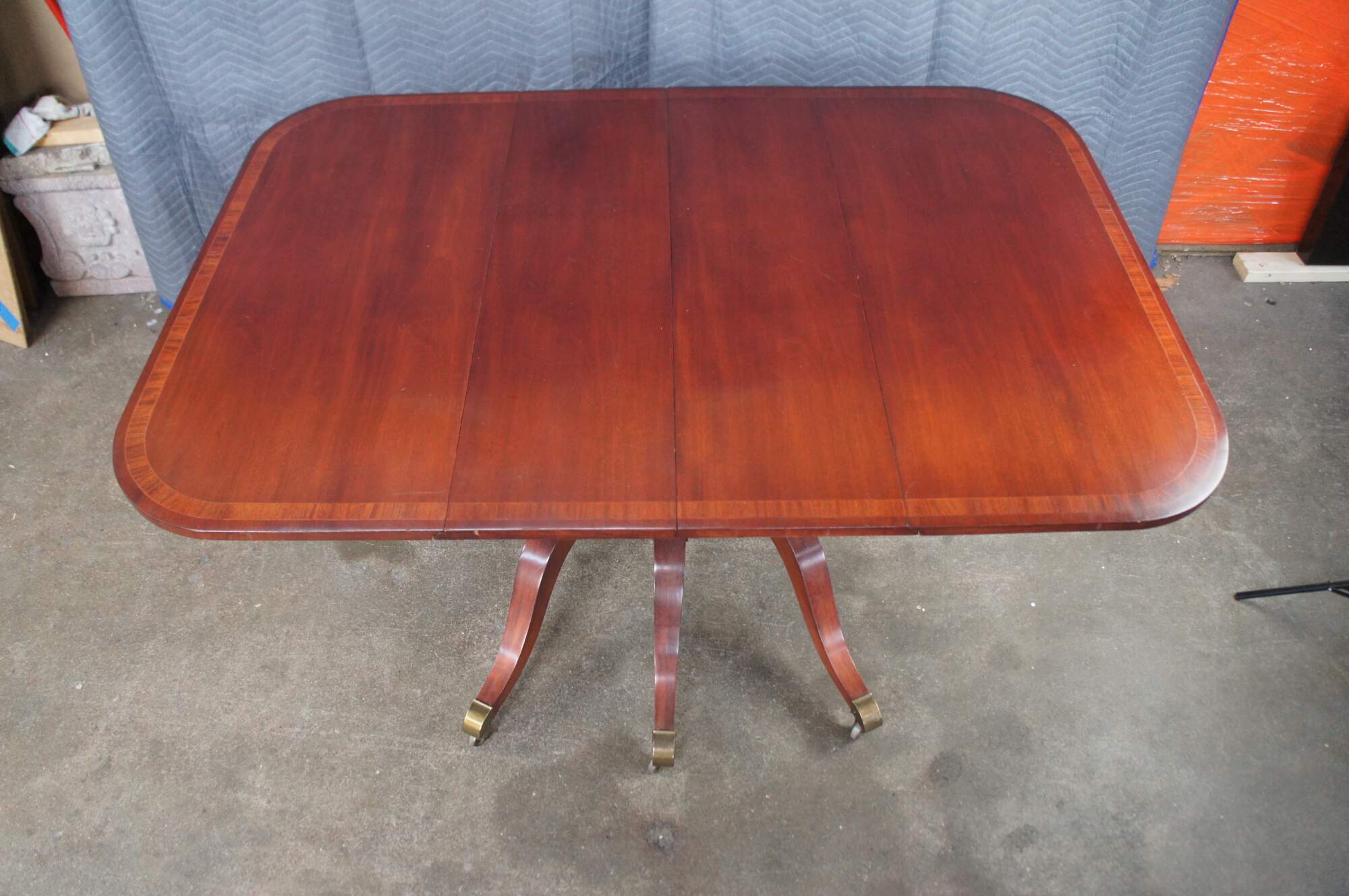 Mid-20th Century Union National Duncan Phyfe Style Drop Leaf Extendable Dining Table. Made from American mahogany with a banded top. Features a harp or lyre carved pedestal base leading to six downswept legs with brass capped feet and castors. This beautiful table will be the center of attention in any dining or breakfast room. For those with larger spaces it can be stowed away along a wall and used as a console when not in service and rolled into place for large gatherings. Includes three leaves for expansion up to 98.5"