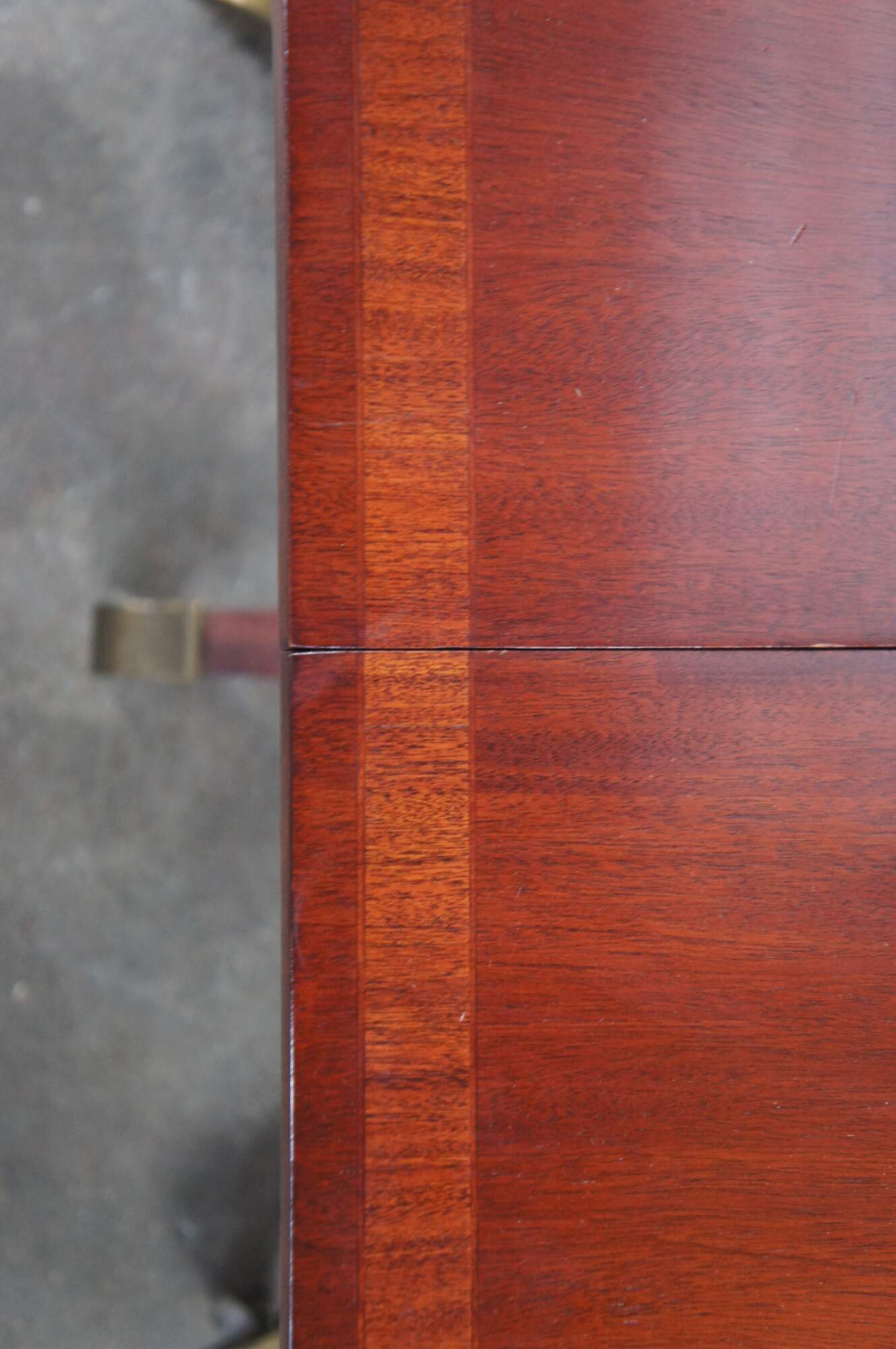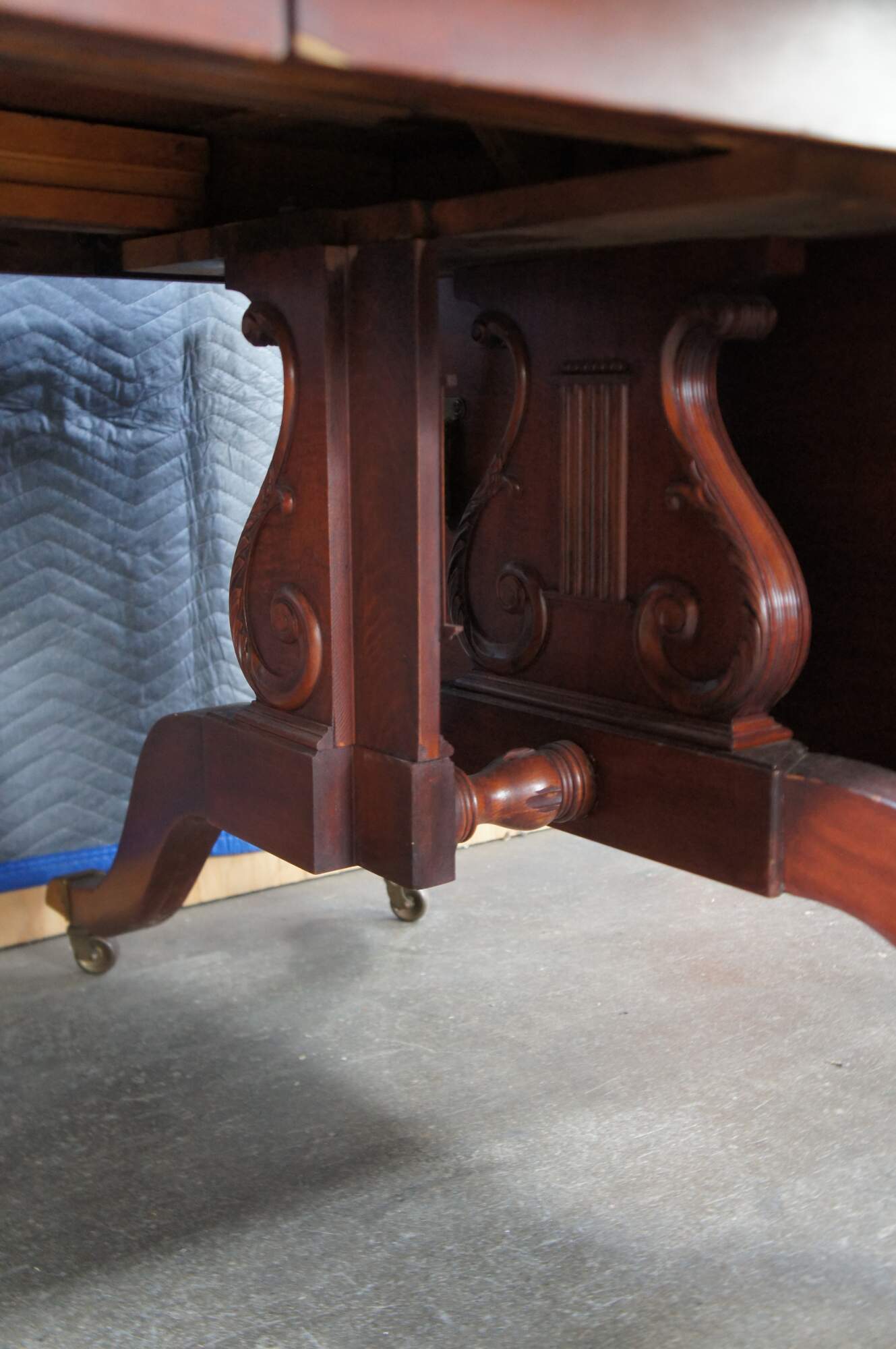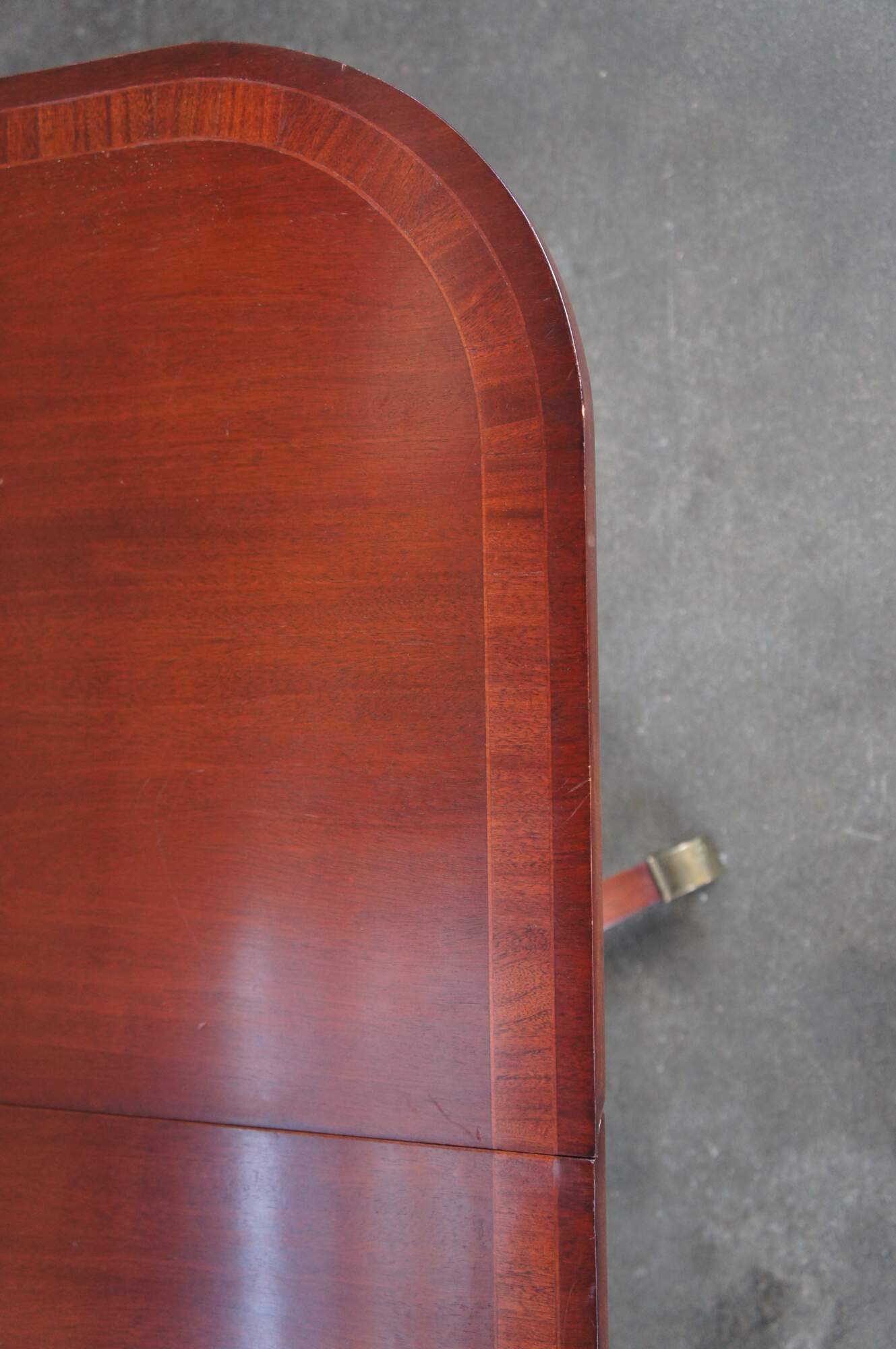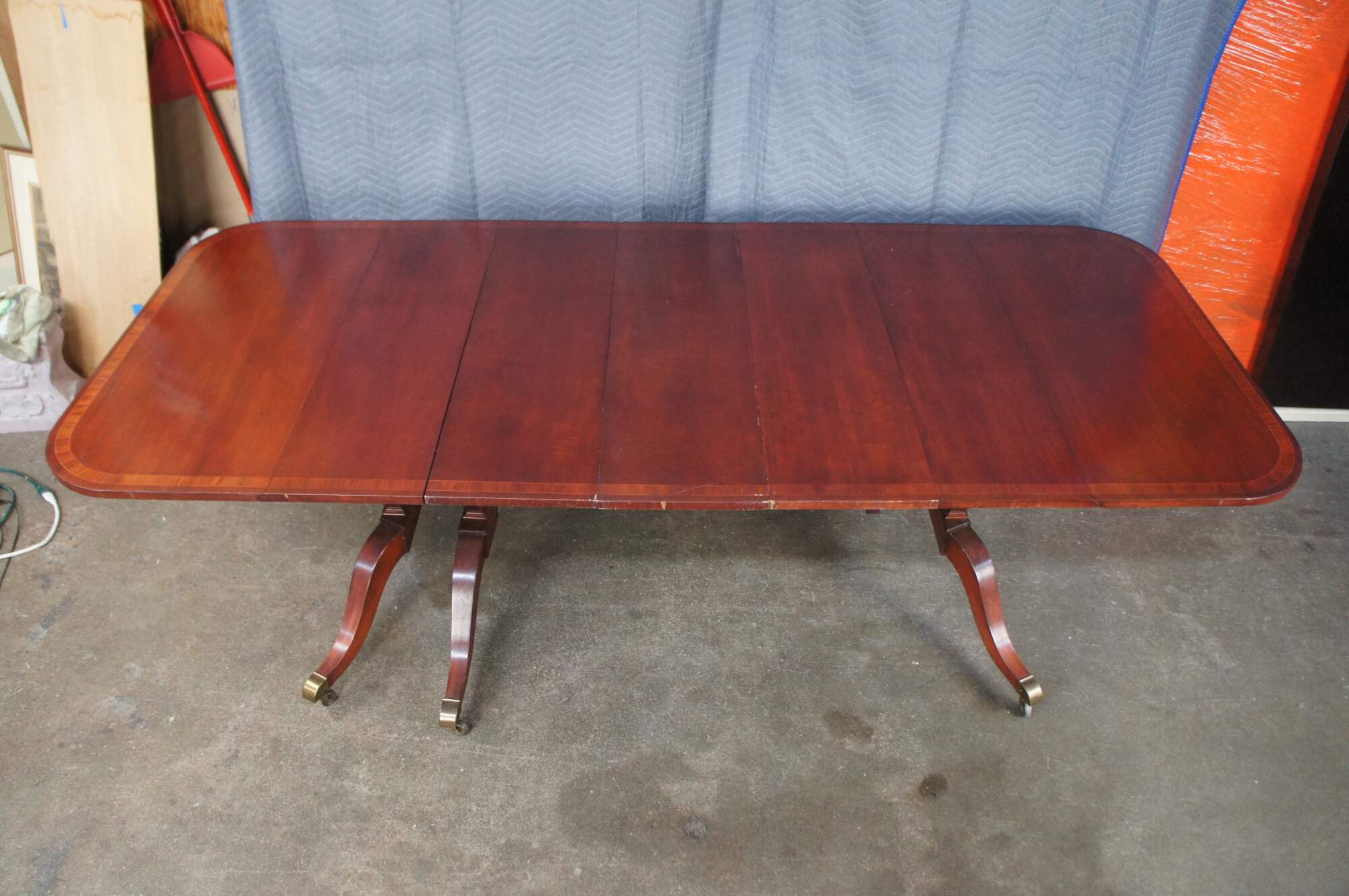 Mid-20th Century Union National Duncan Phyfe Style Drop Leaf Extendable Dining Table. Made from American mahogany with a banded top. Features a harp or lyre carved pedestal base leading to six downswept legs with brass capped feet and castors. This beautiful table will be the center of attention in any dining or breakfast room. For those with larger spaces it can be stowed away along a wall and used as a console when not in service and rolled into place for large gatherings. Includes three leaves for expansion up to 98.5"