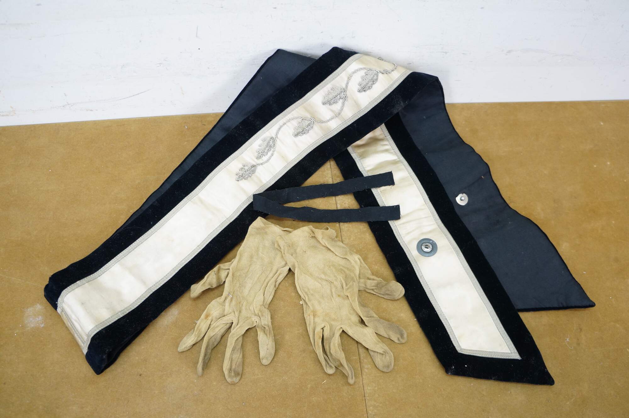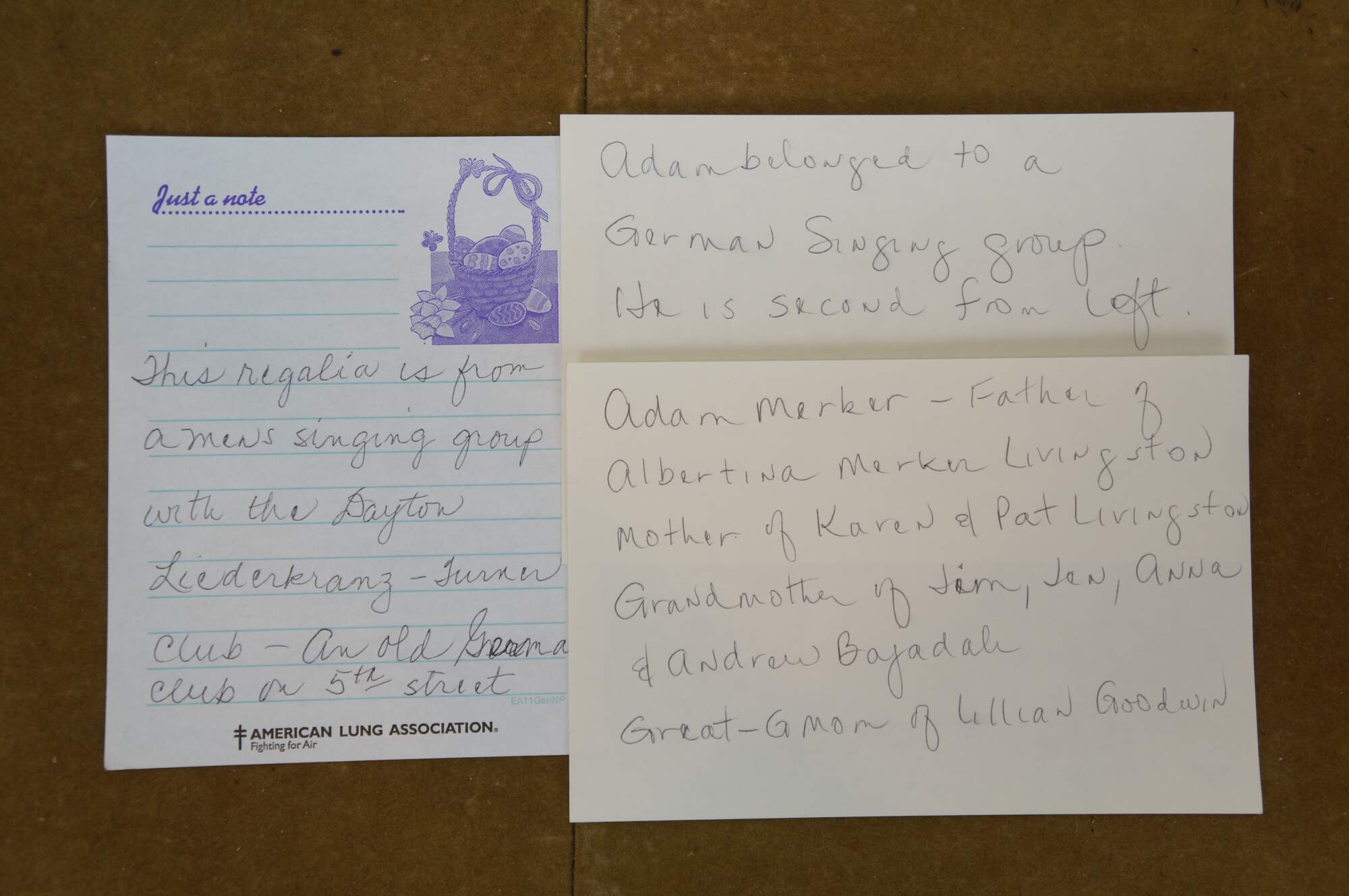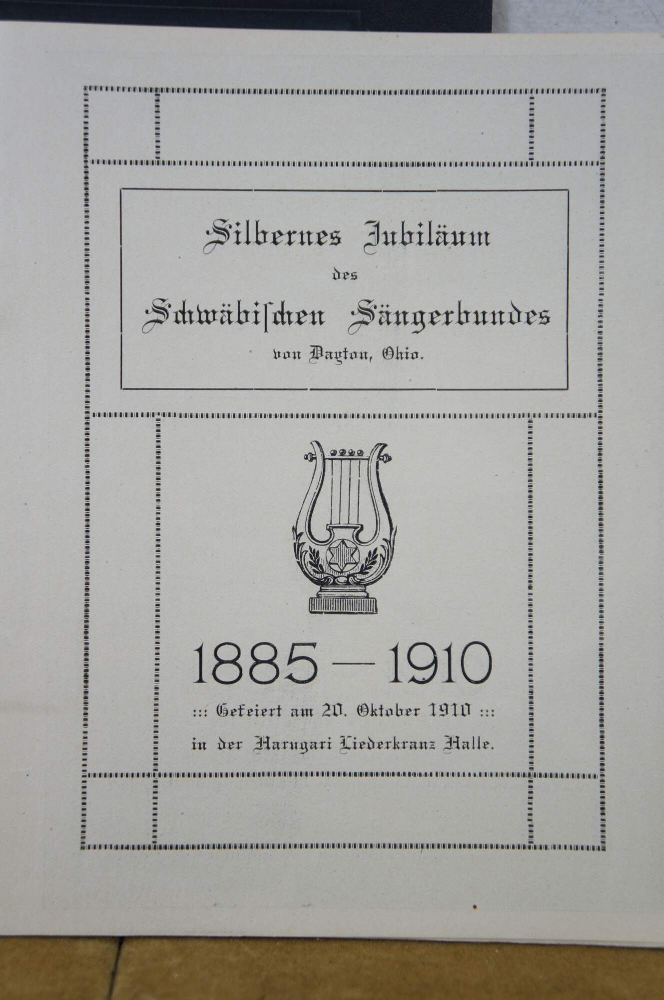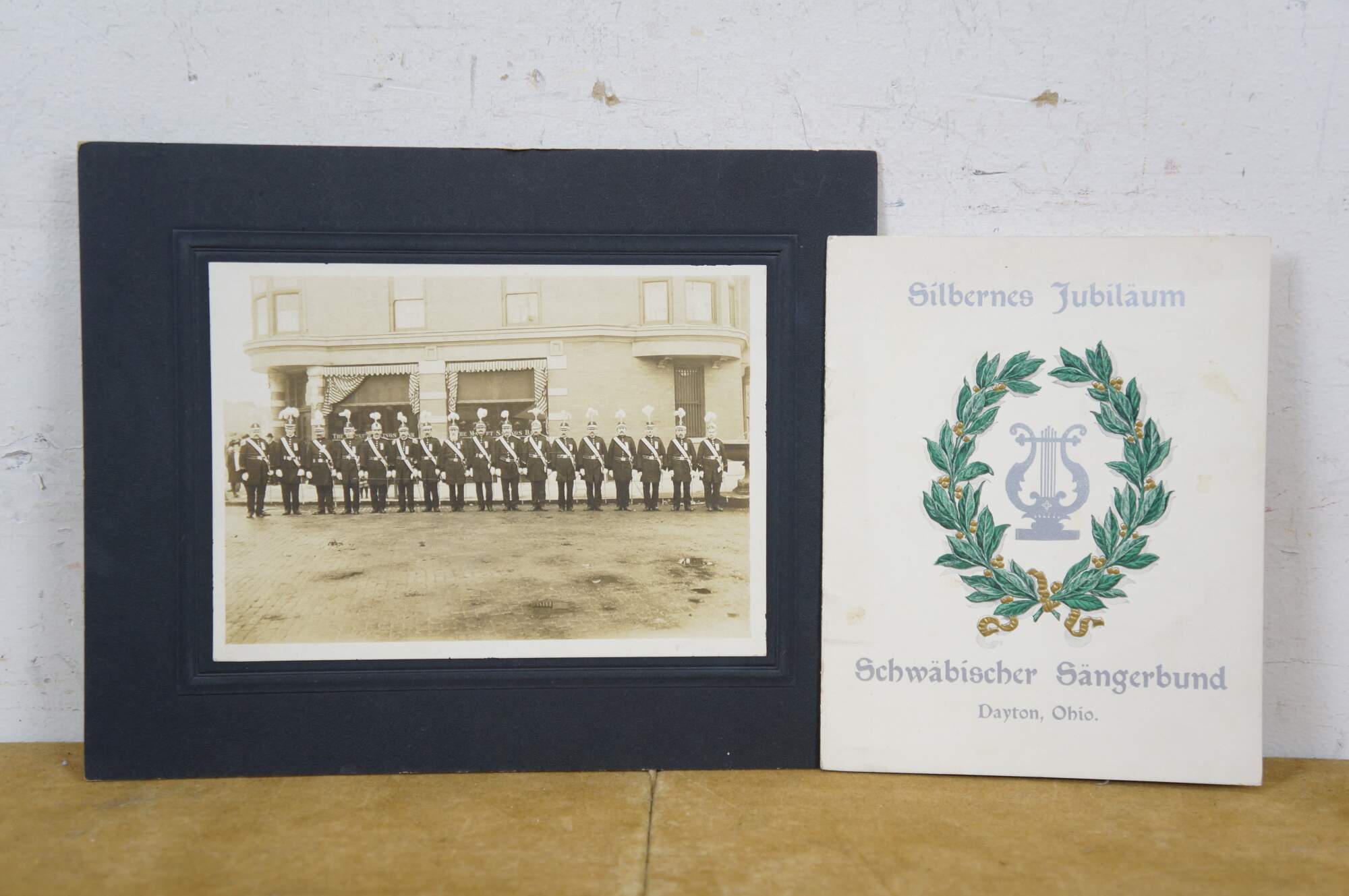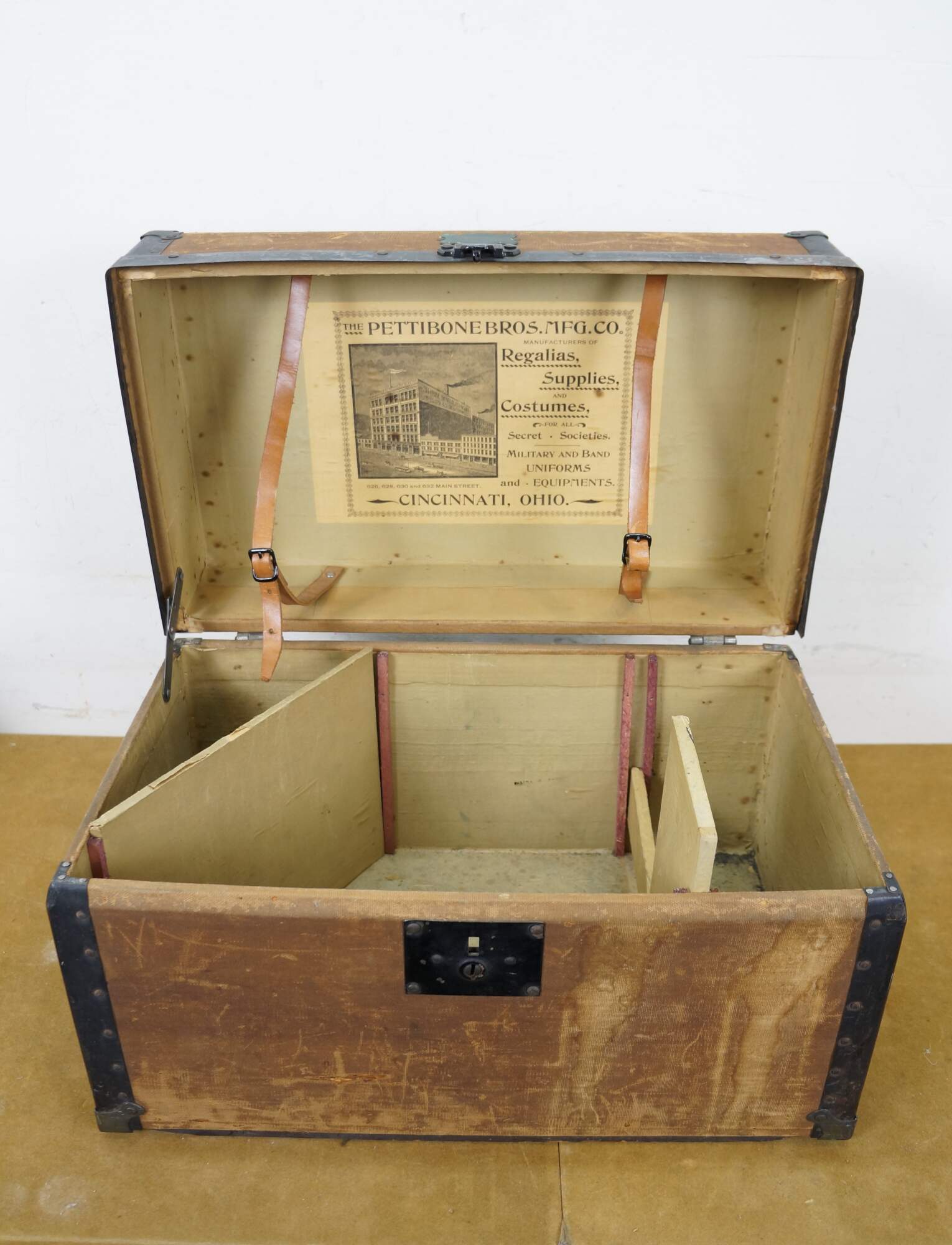 Antique 13 piece lot of of early 20th century German band uniform accessories. Lot includes: pamphlet commemorating the "Silver Jubilee of the Swabian Singers' Associationg of Dayton, Ohio - 1885-1910 - Celebrated on October 20, 1910 in the Harugari Liederkranz Hall" (now the Dayton Liederkranz-Turner Club), photograph showing the singing club including the original owner Adam Merker, pair of gloves, sash, leather sword belt with chains, kepi / cap with brim, protective cover for cap, helmet with two interchangable spikes, chin strap chain, and storage trunk with personalized name plate. Manufactured by the Pettibone Brothers Manufacturing Company - Manufacturers of Regalias, Supplies, and costumes for All Secret Societies, Military and Band Uniforms and Equipments - Cincinnati, Ohio.