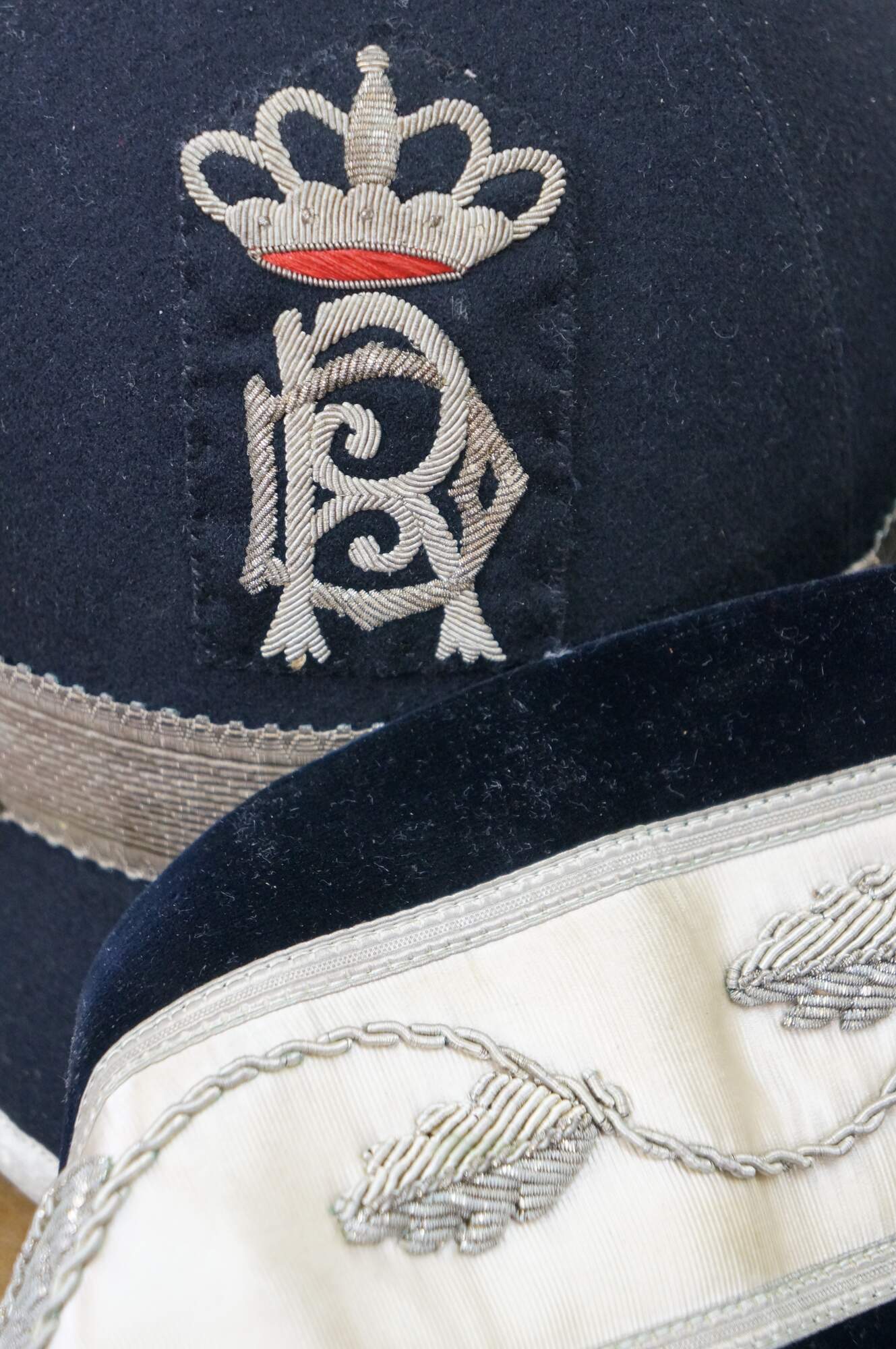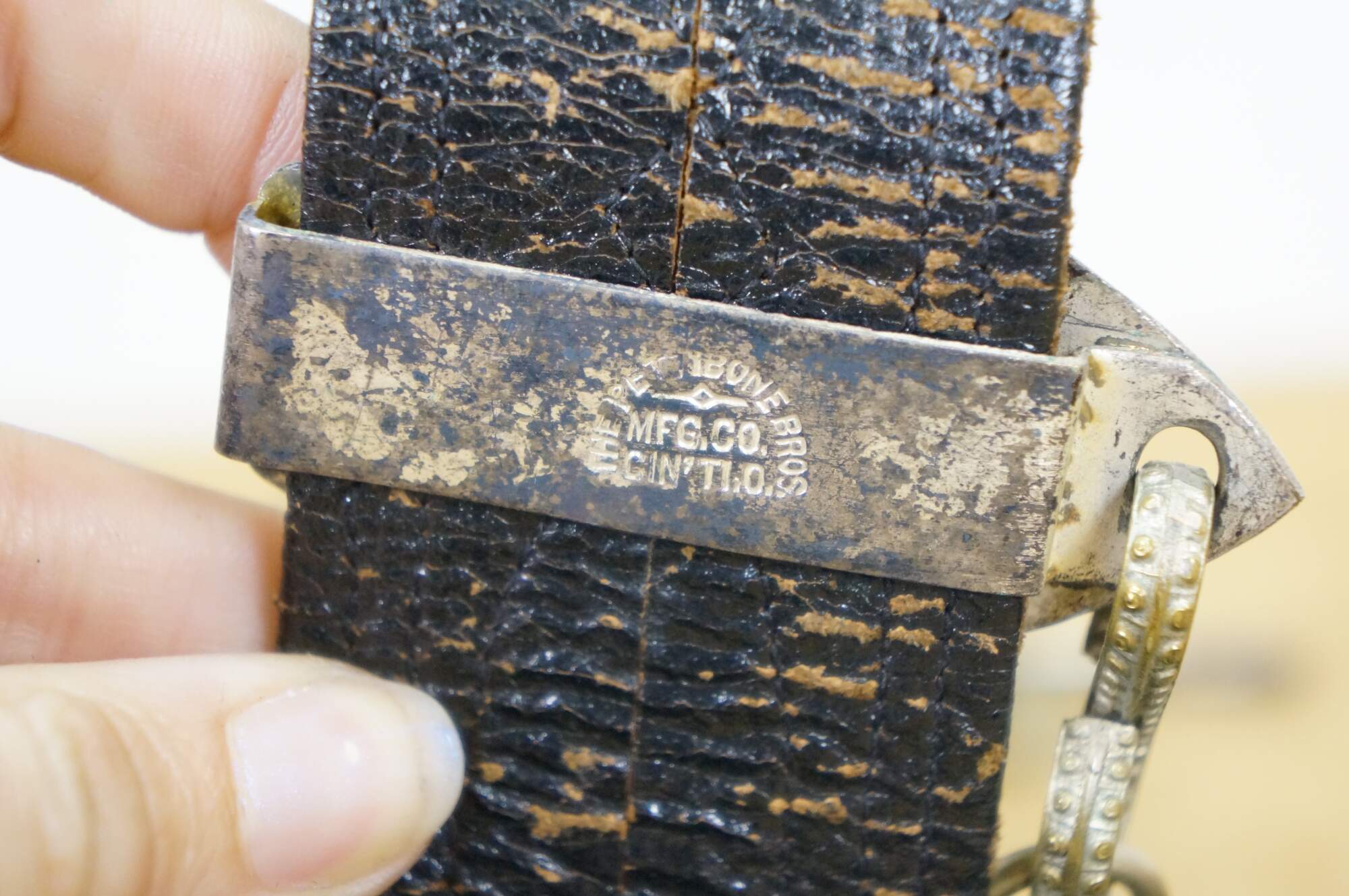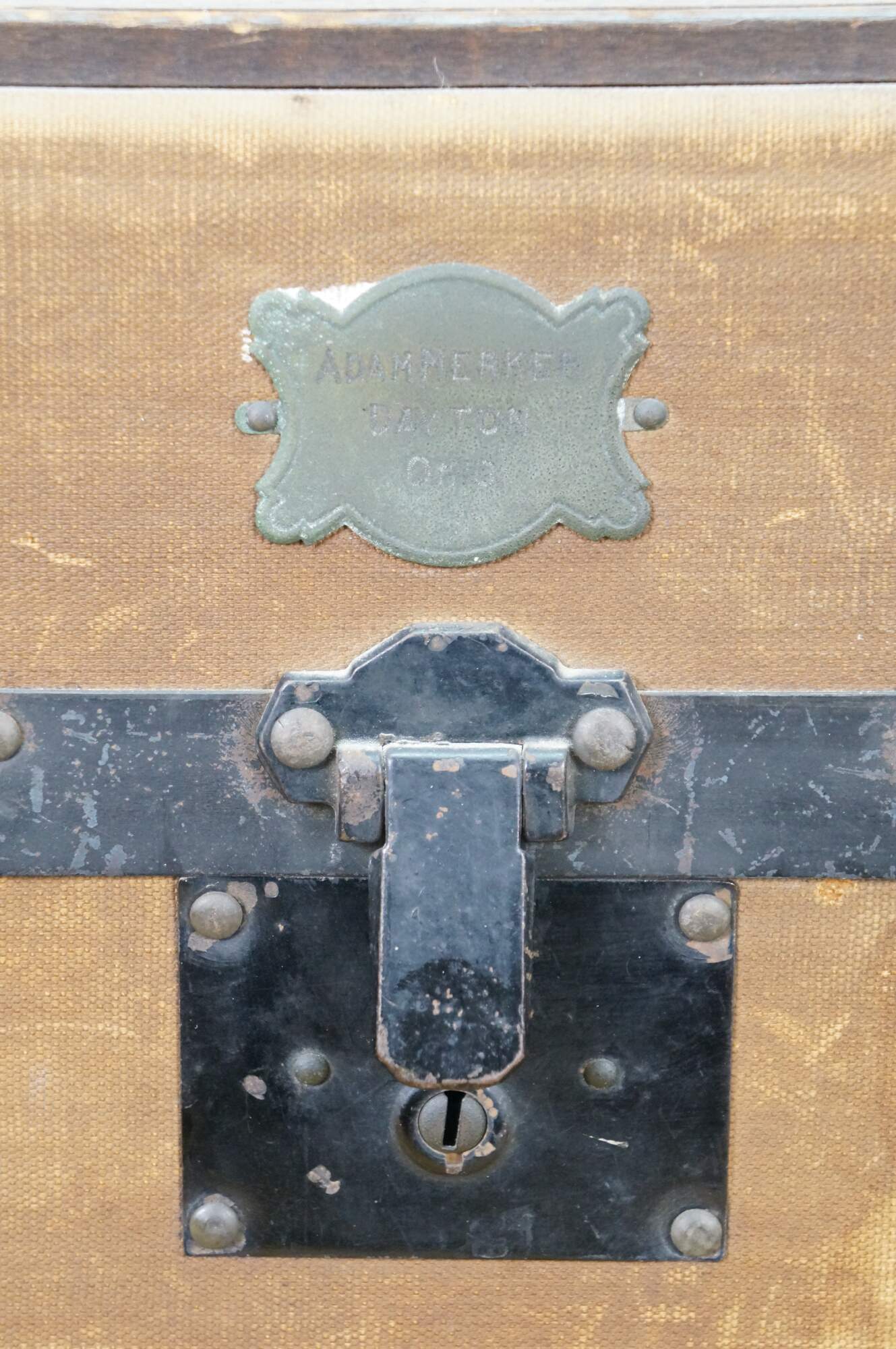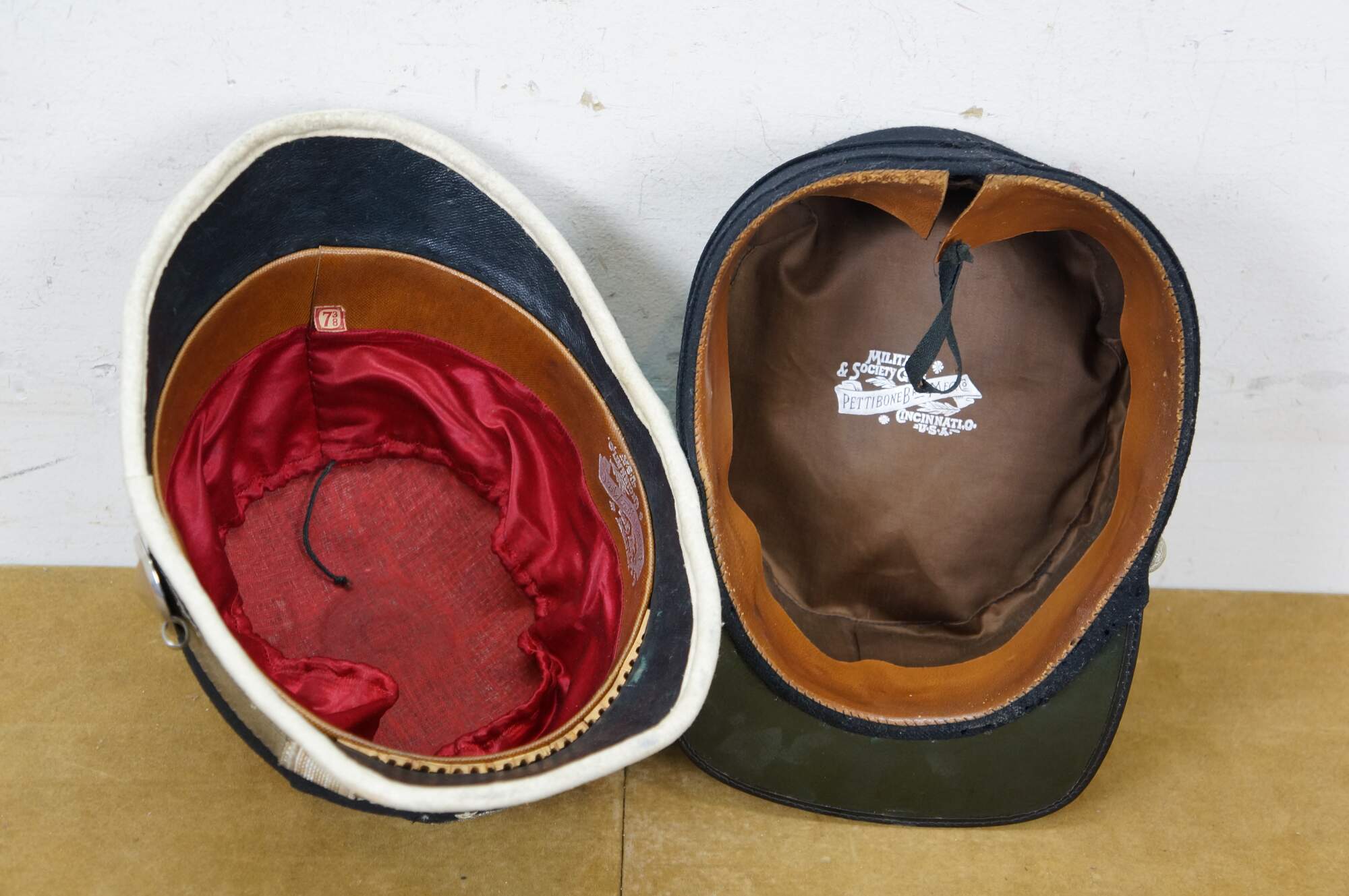 Antique 13 piece lot of of early 20th century German band uniform accessories. Lot includes: pamphlet commemorating the "Silver Jubilee of the Swabian Singers' Associationg of Dayton, Ohio - 1885-1910 - Celebrated on October 20, 1910 in the Harugari Liederkranz Hall" (now the Dayton Liederkranz-Turner Club), photograph showing the singing club including the original owner Adam Merker, pair of gloves, sash, leather sword belt with chains, kepi / cap with brim, protective cover for cap, helmet with two interchangable spikes, chin strap chain, and storage trunk with personalized name plate. Manufactured by the Pettibone Brothers Manufacturing Company - Manufacturers of Regalias, Supplies, and costumes for All Secret Societies, Military and Band Uniforms and Equipments - Cincinnati, Ohio.