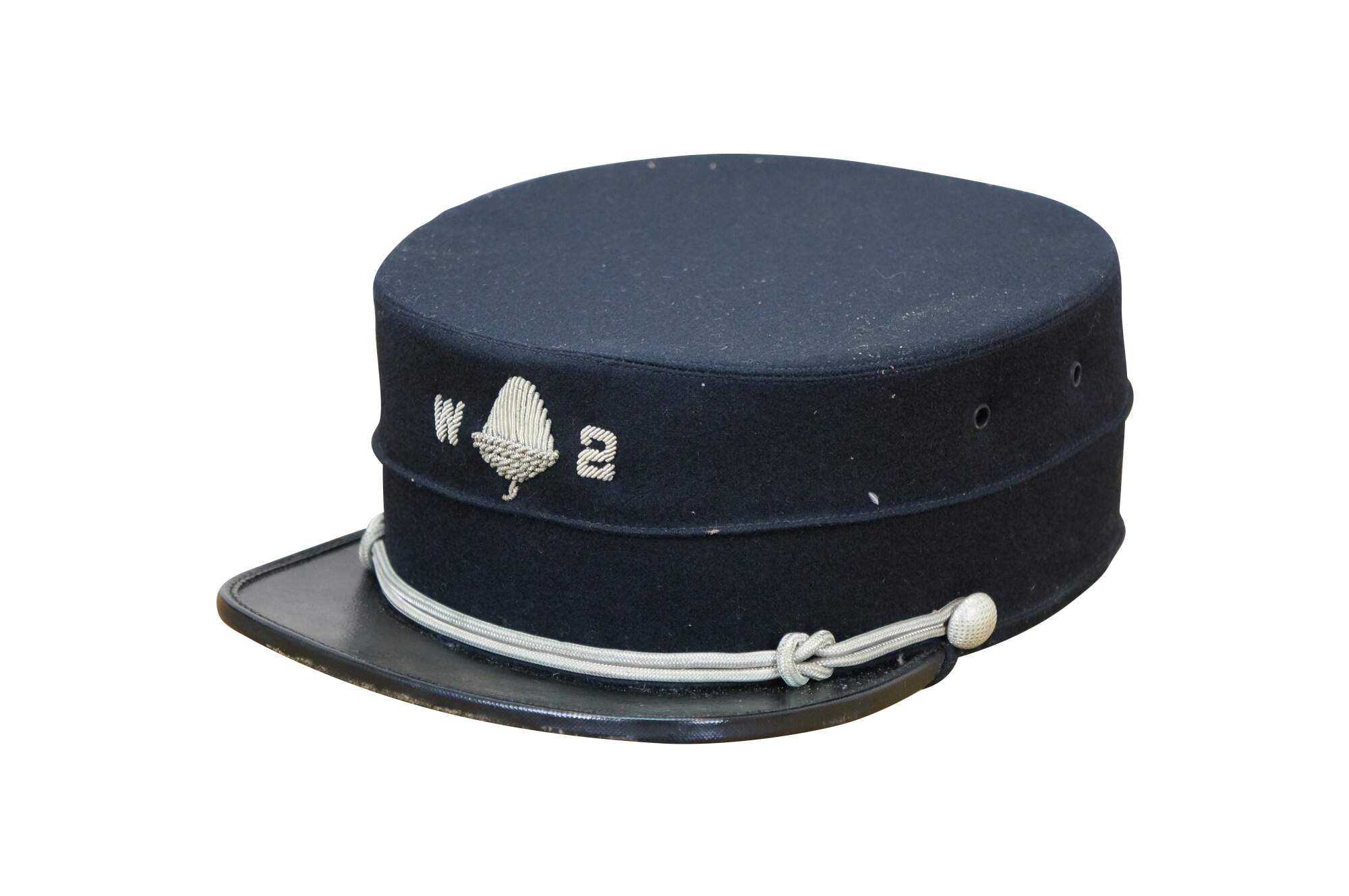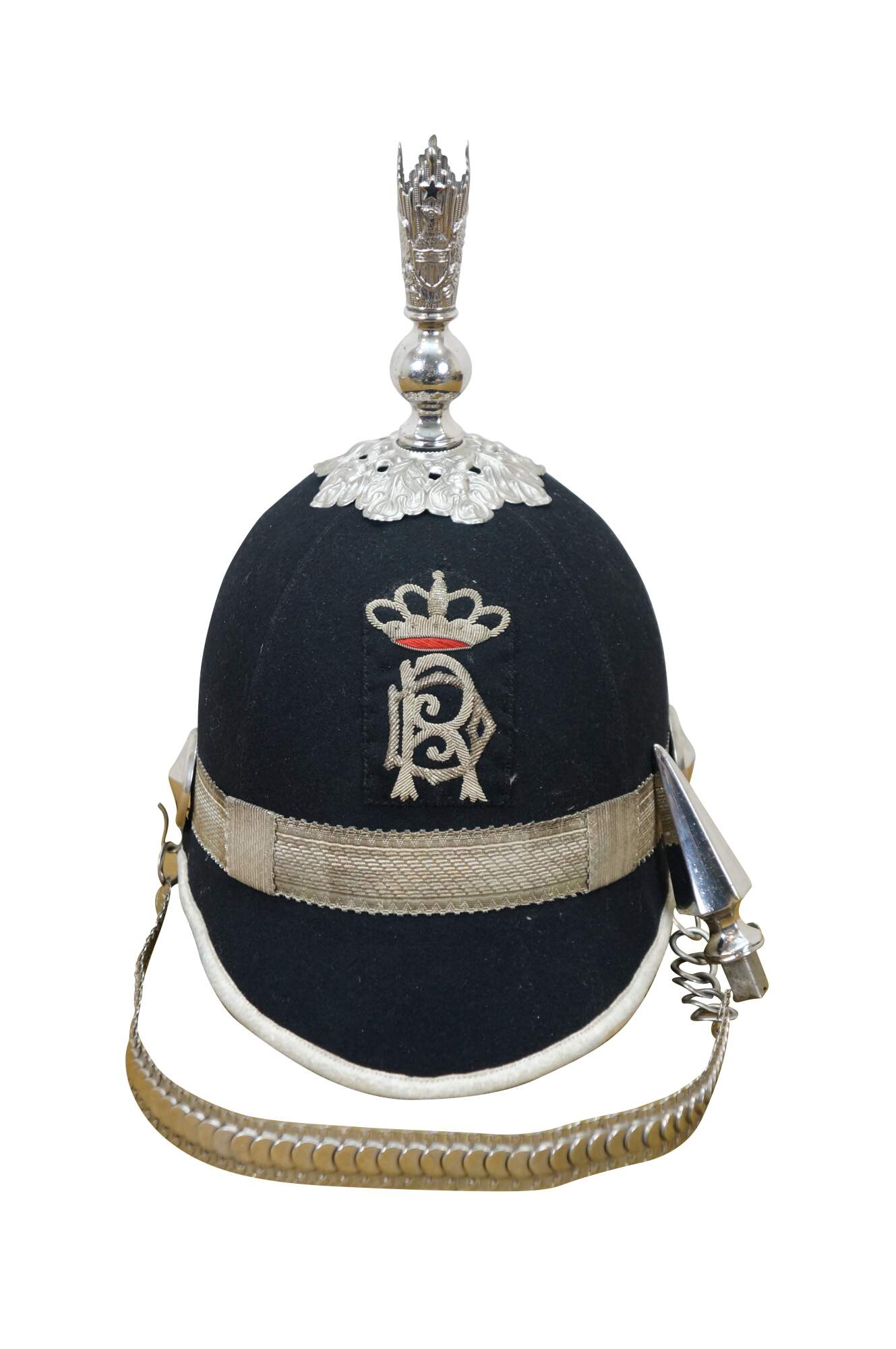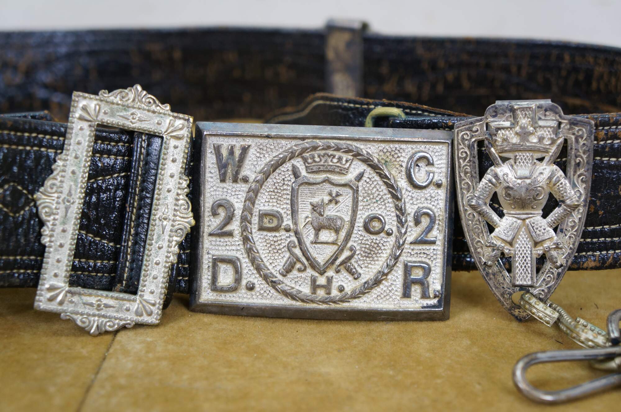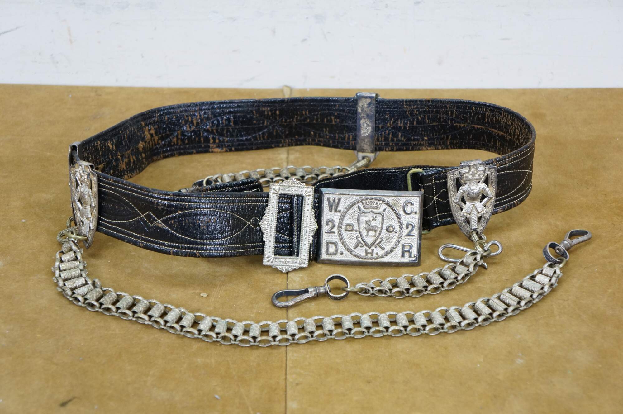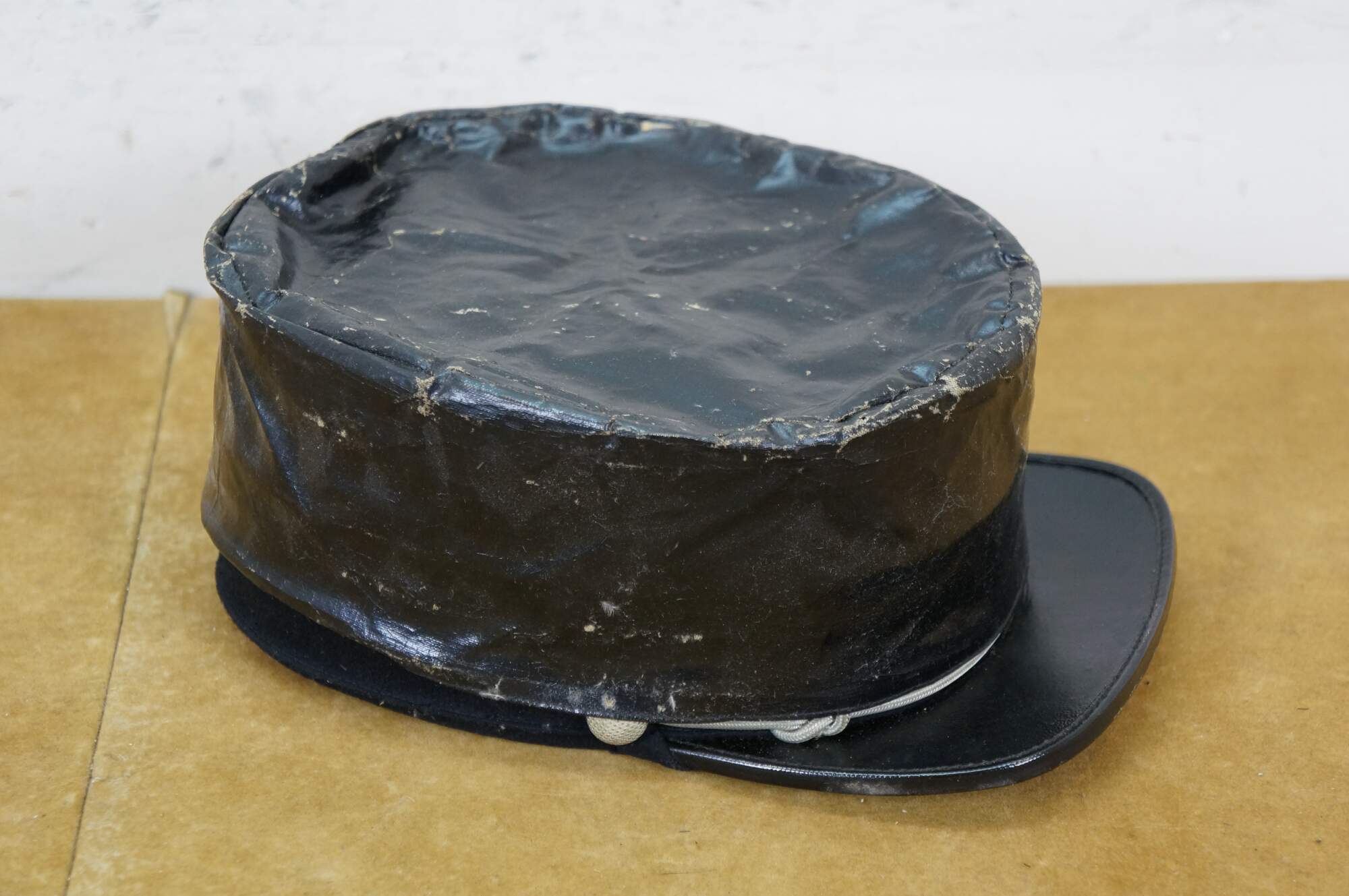Antique 13 piece lot of of early 20th century German band uniform accessories. Lot includes: pamphlet commemorating the "Silver Jubilee of the Swabian Singers' Associationg of Dayton, Ohio - 1885-1910 - Celebrated on October 20, 1910 in the Harugari Liederkranz Hall" (now the Dayton Liederkranz-Turner Club), photograph showing the singing club including the original owner Adam Merker, pair of gloves, sash, leather sword belt with chains, kepi / cap with brim, protective cover for cap, helmet with two interchangable spikes, chin strap chain, and storage trunk with personalized name plate. Manufactured by the Pettibone Brothers Manufacturing Company - Manufacturers of Regalias, Supplies, and costumes for All Secret Societies, Military and Band Uniforms and Equipments - Cincinnati, Ohio.