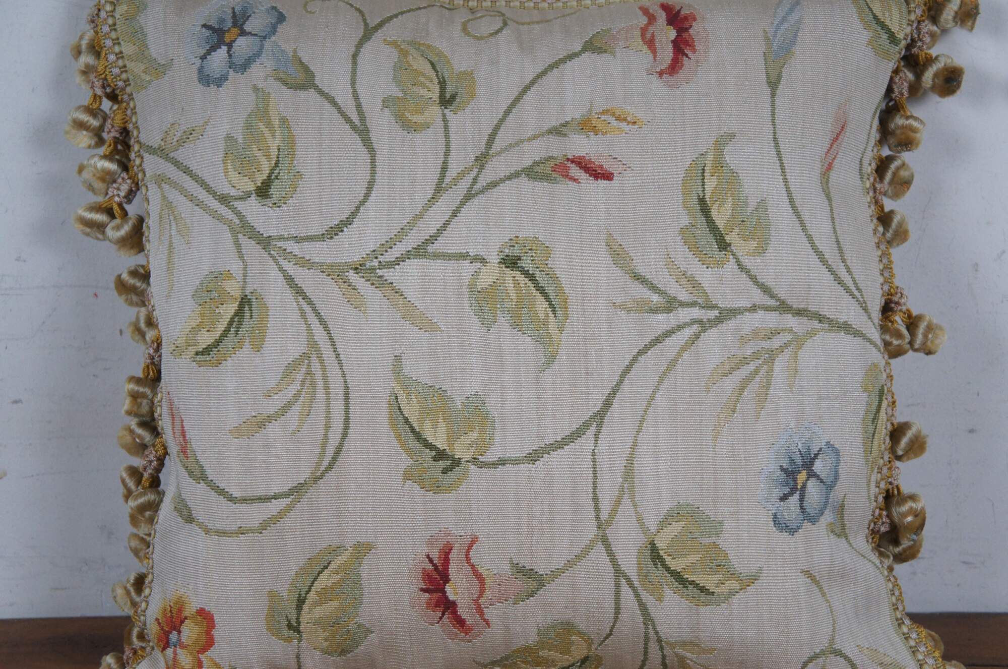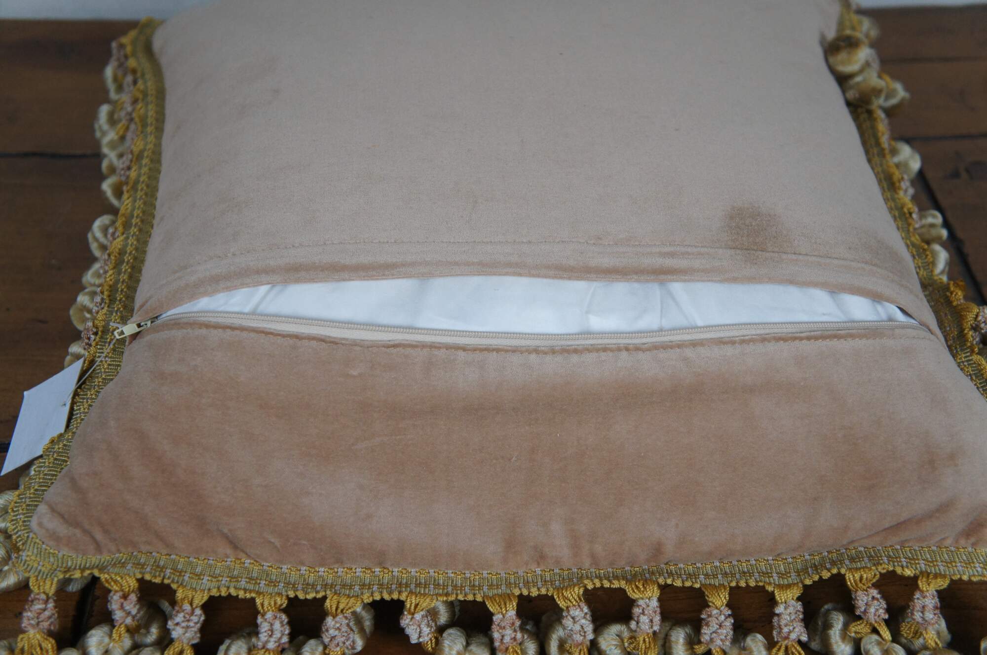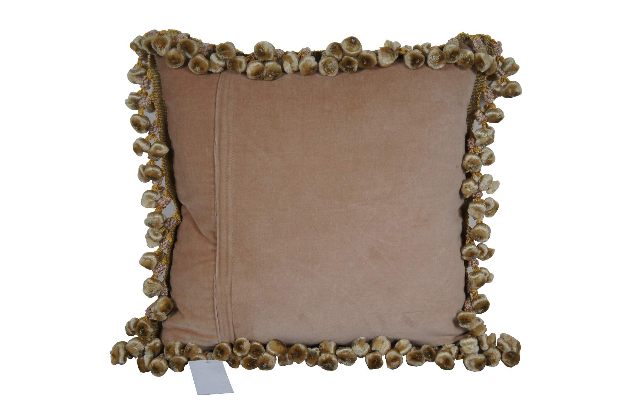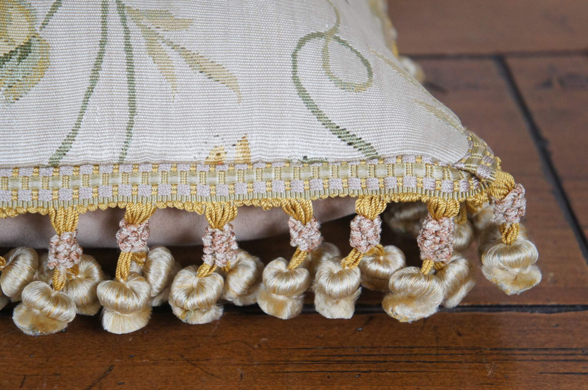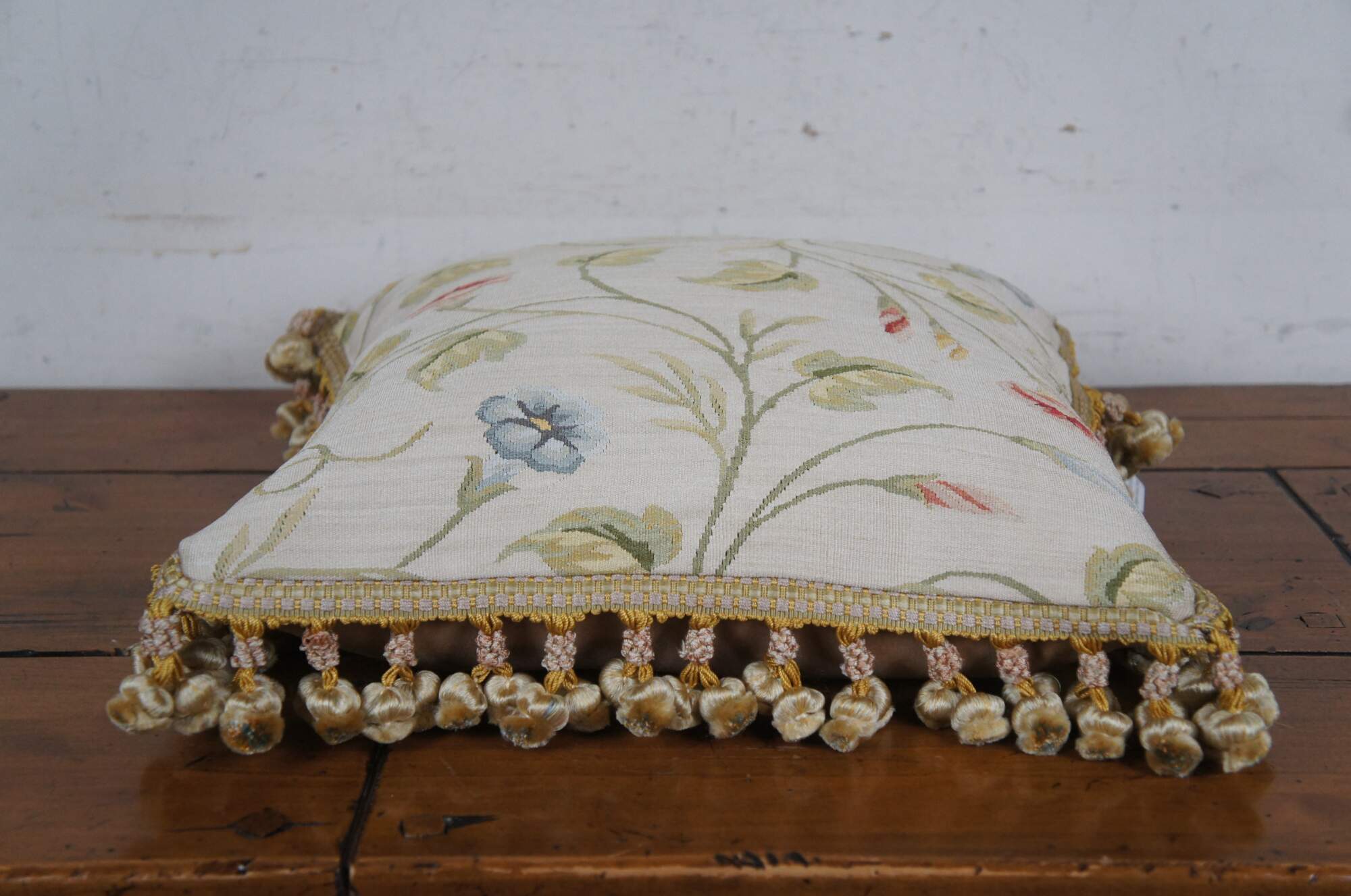 20th century square throw pillow, embroidered in silk with twisting green leafy stems sporting pink, blue, and orange morning glories. Cream and gold ball tassel trim. Beige velour back with zipper closure. Down filled.