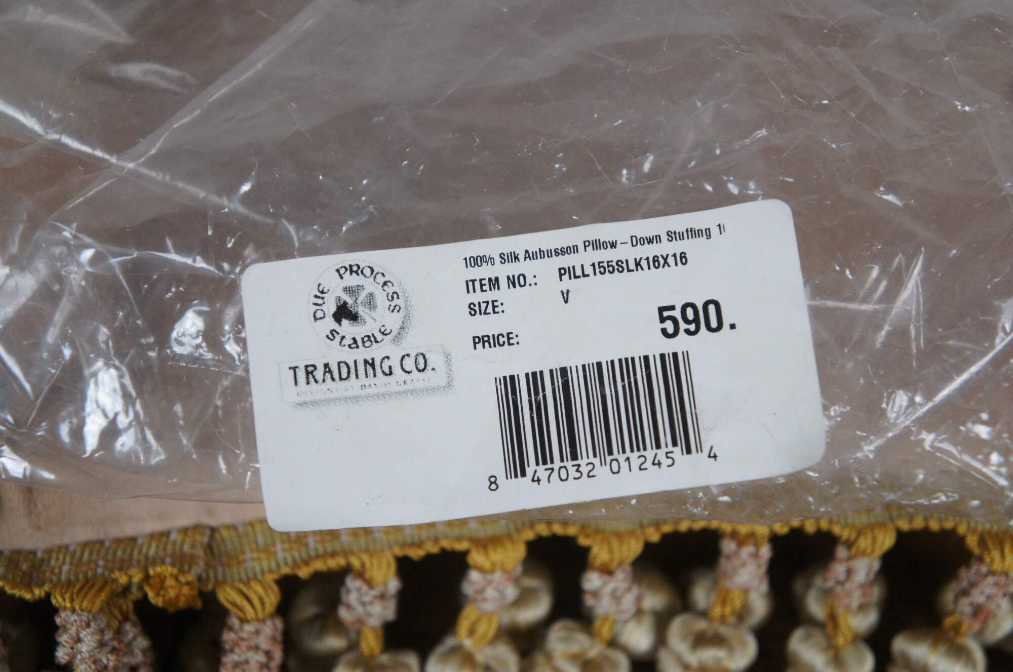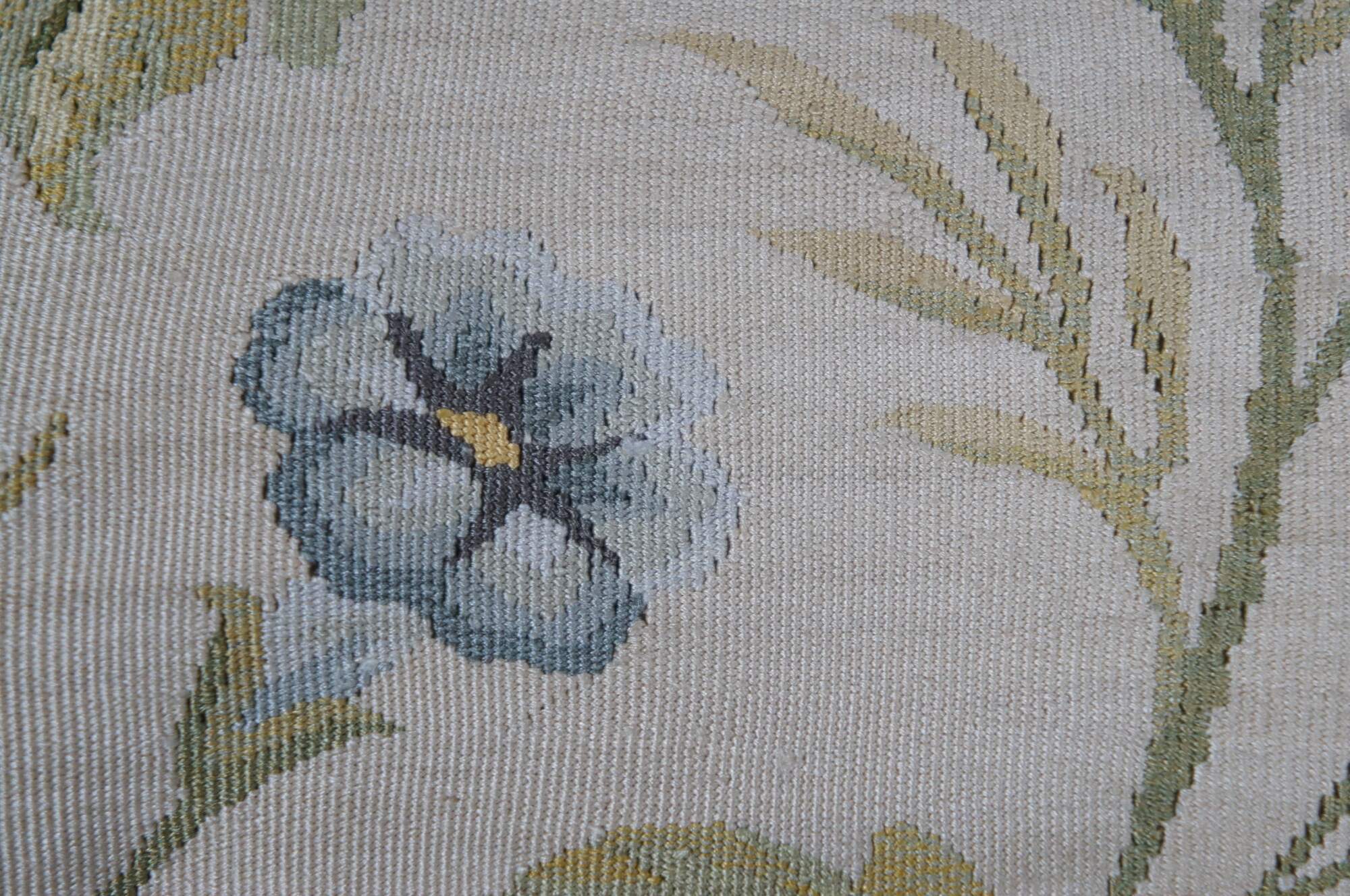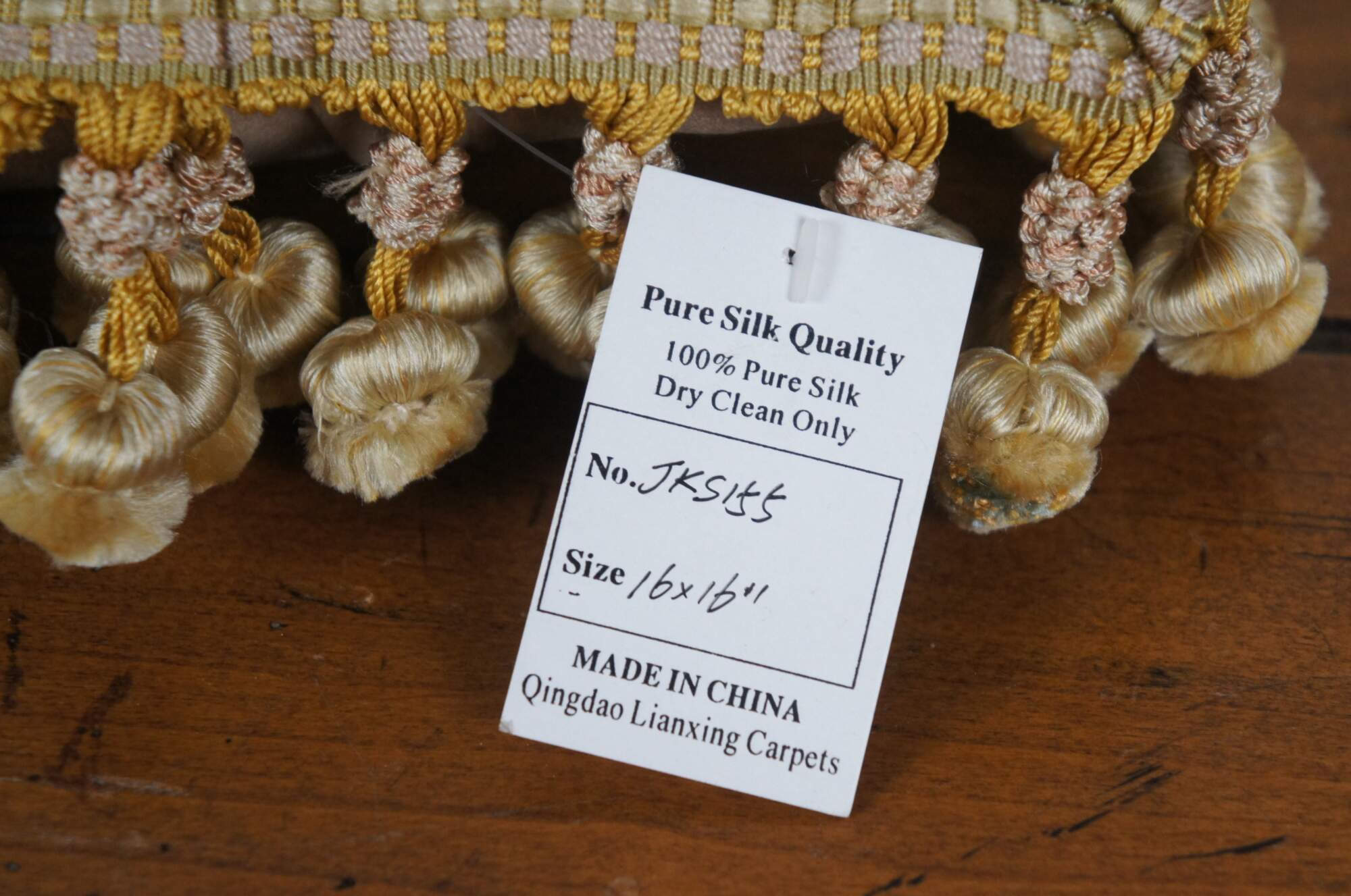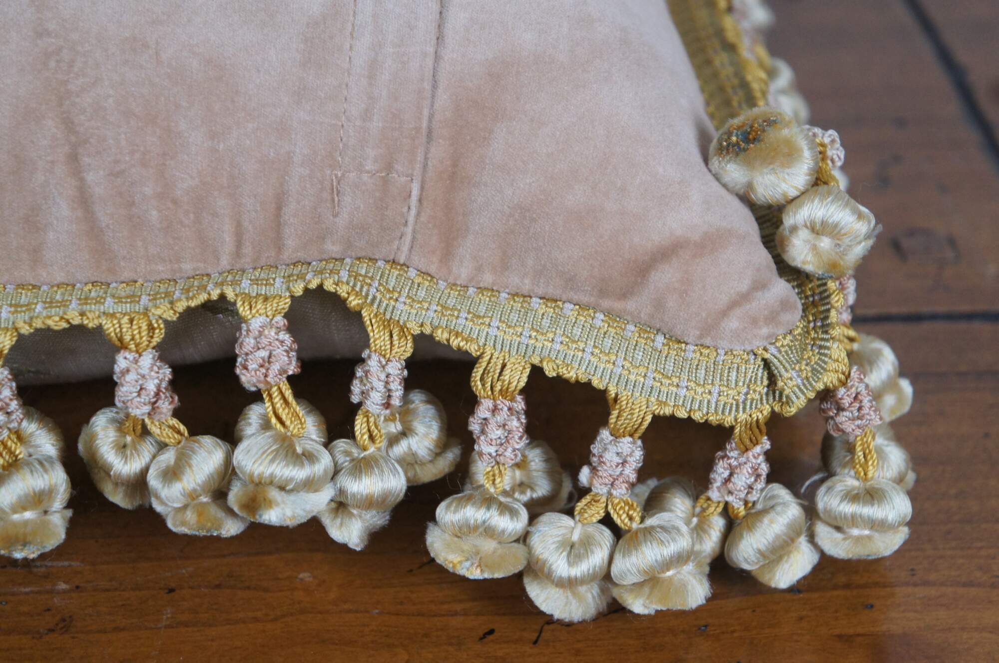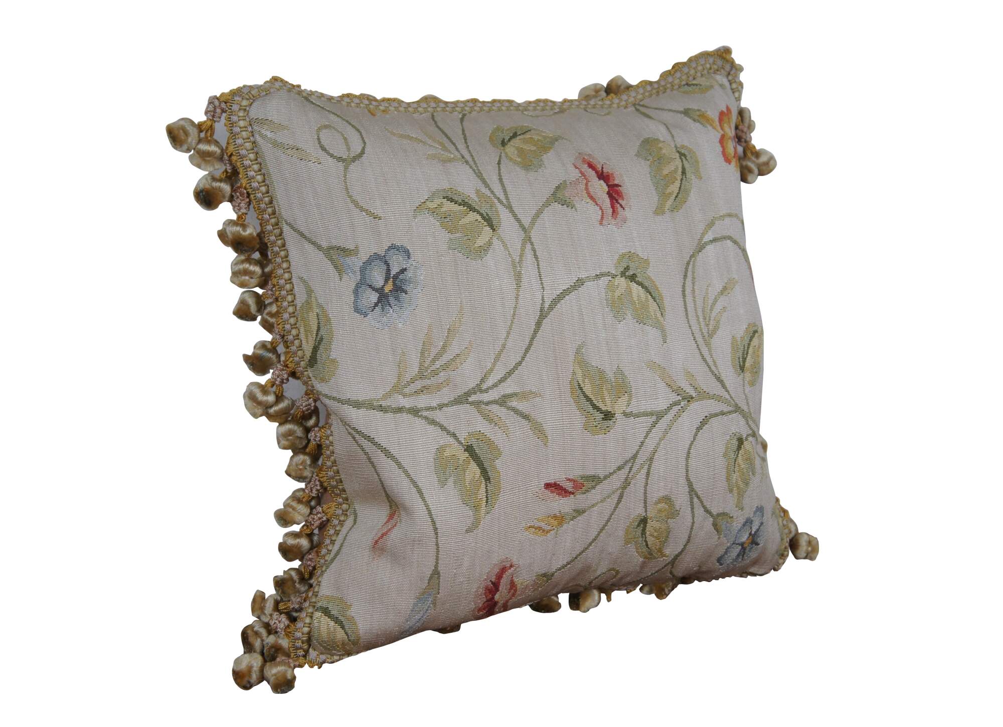 20th century square throw pillow, embroidered in silk with twisting green leafy stems sporting pink, blue, and orange morning glories. Cream and gold ball tassel trim. Beige velour back with zipper closure. Down filled.