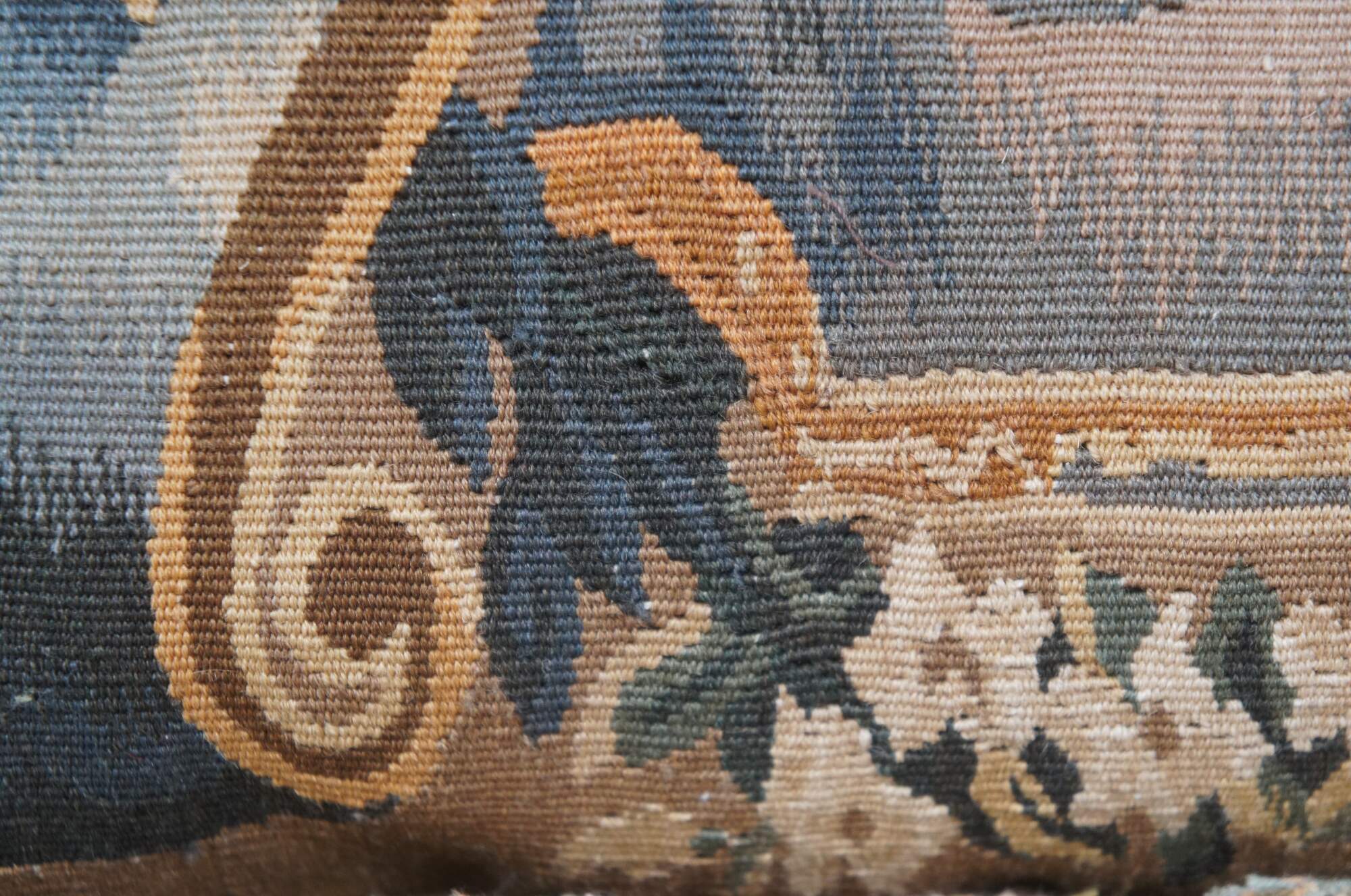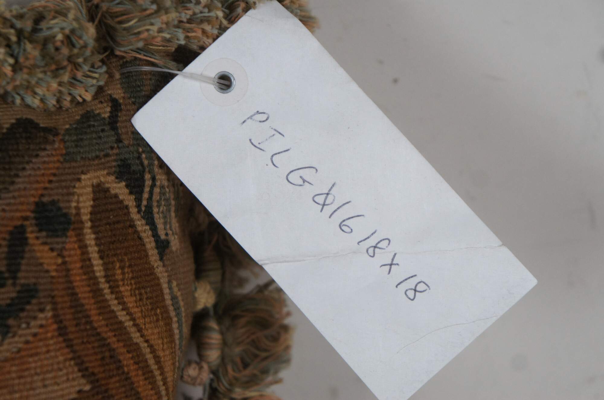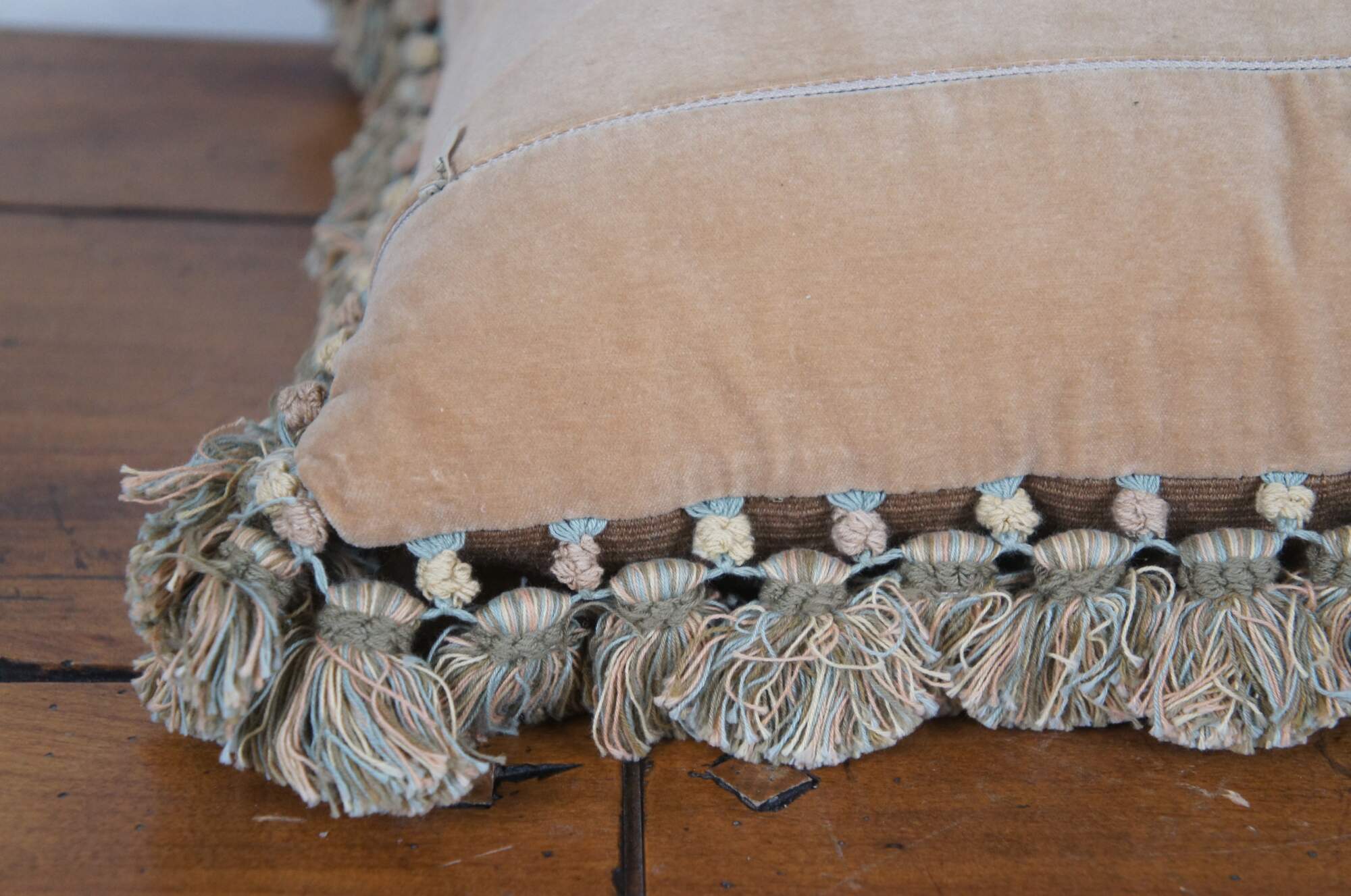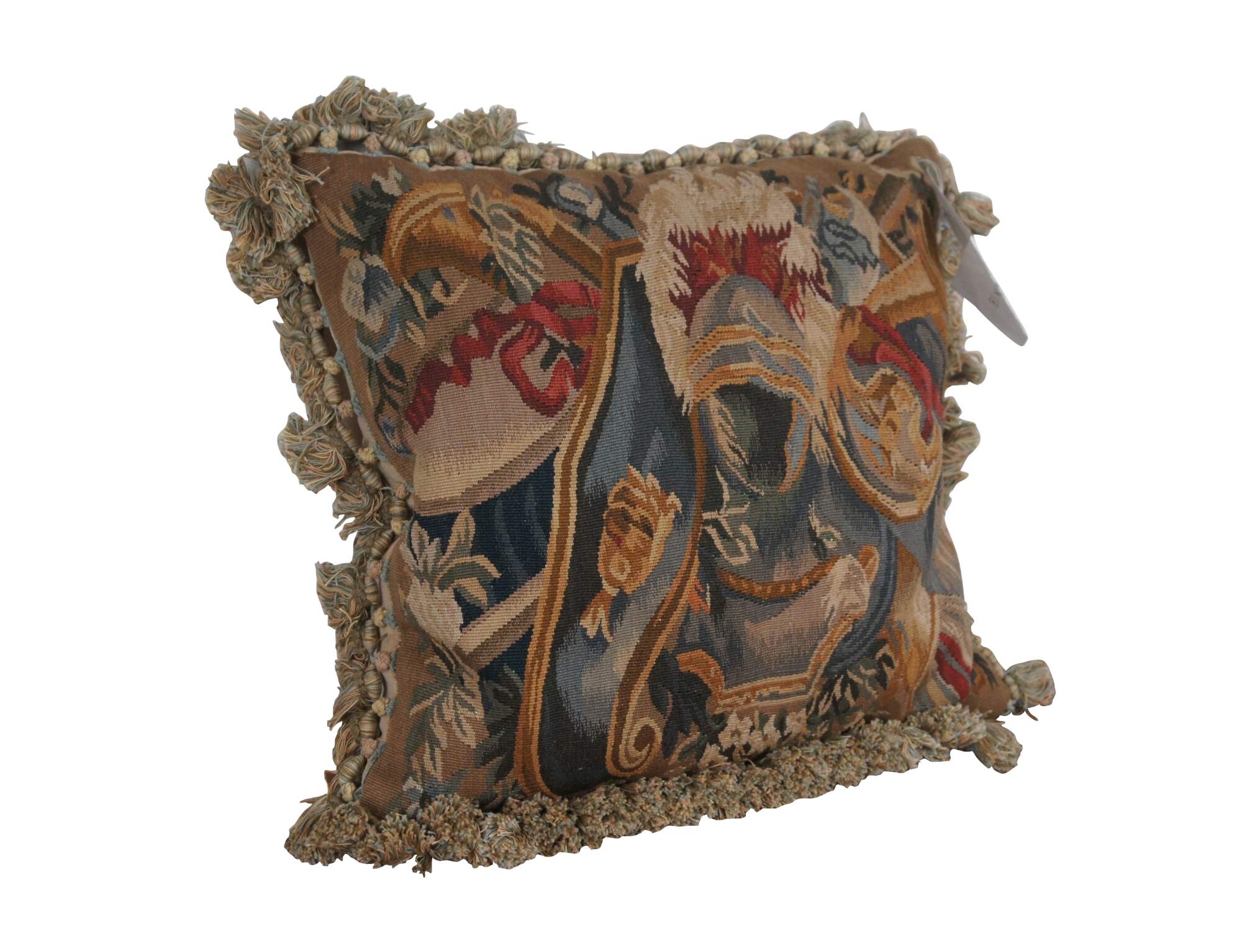 2 Available - 20th century square throw pillow, embroidered with the image of a knight in armor, flanked with trumpets and ribbons. Brown and green tassel trim. Light brown velour back with zipper closure. Down filled.