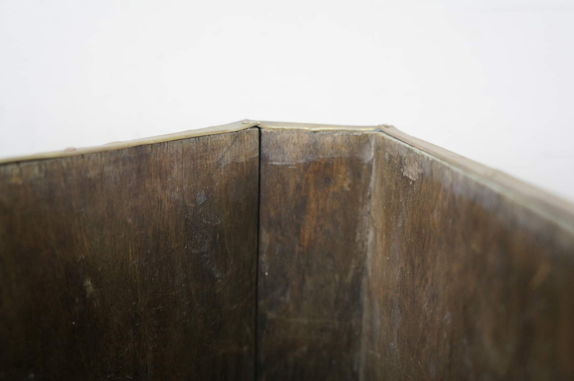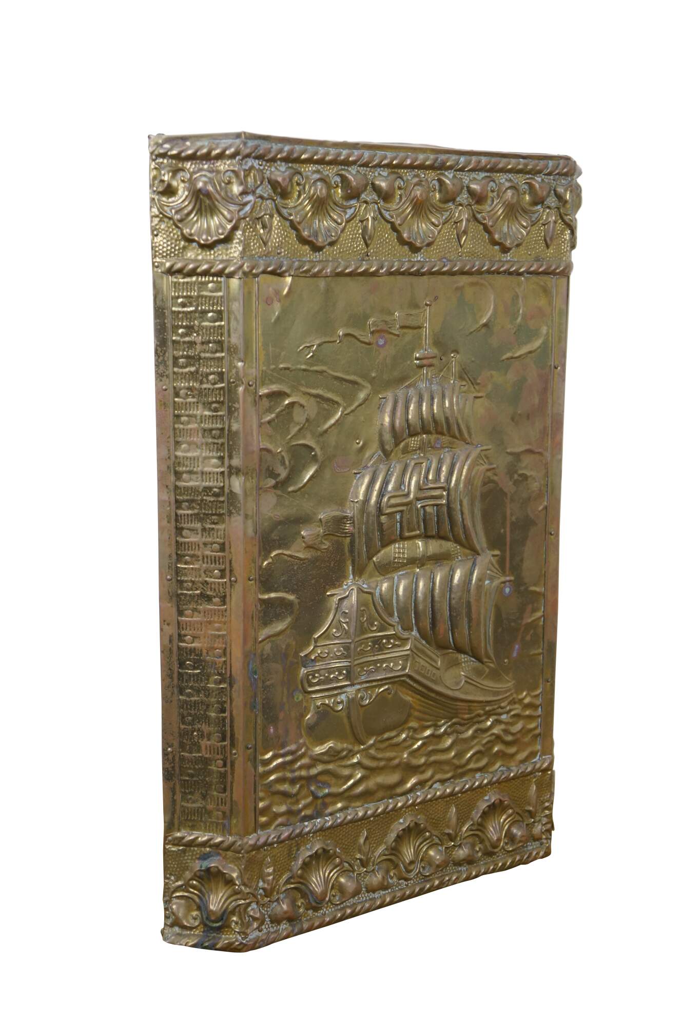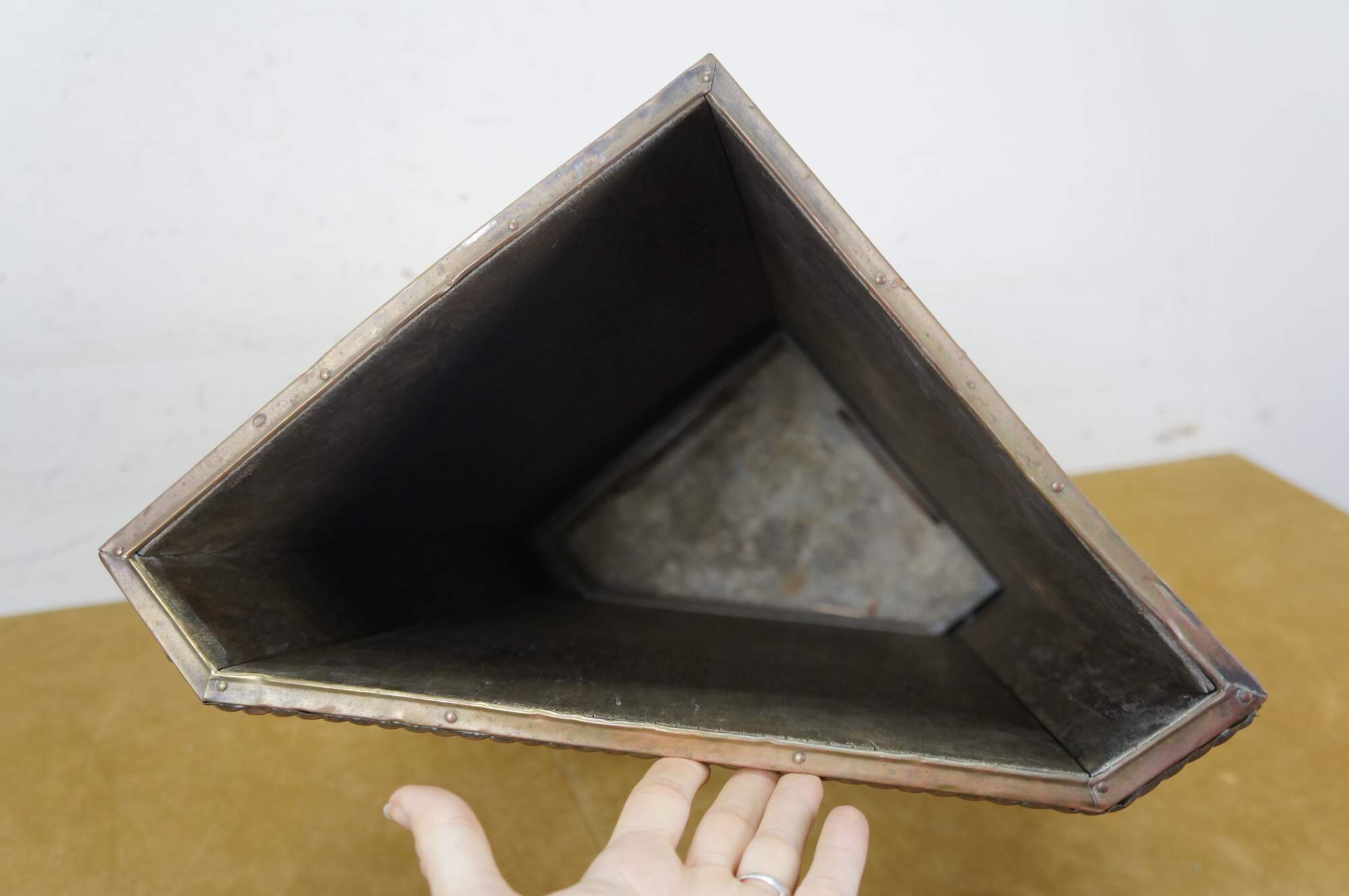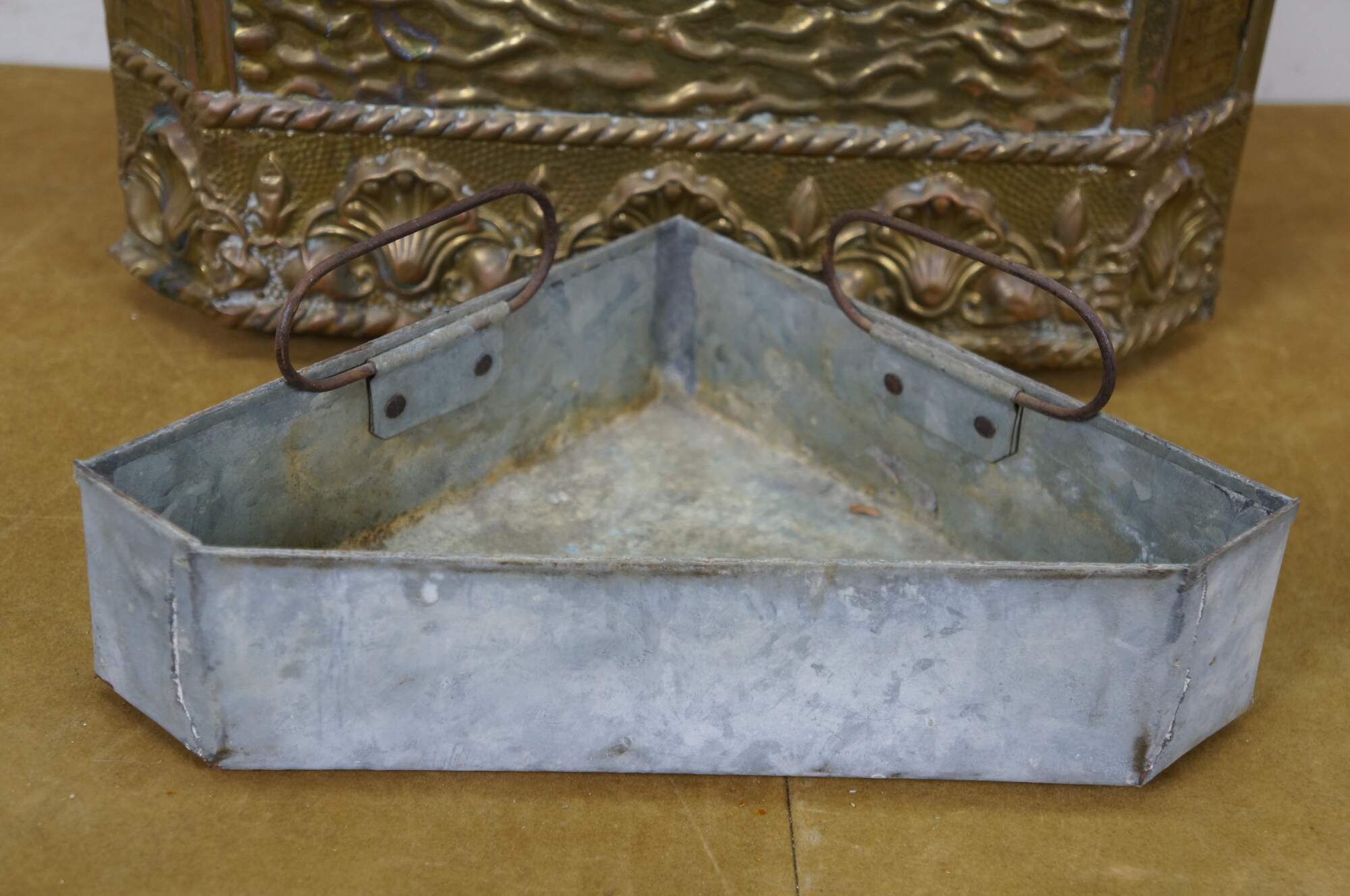 Antique circa early half of the 20th century wood and brass umbrella stand - triangular shape perfect for tucking into a corner, made of wood and clad in brass sheets embossed with large sailing ship and scallop shell trim. Includes tin insert to protect the interior of the base from dripping.