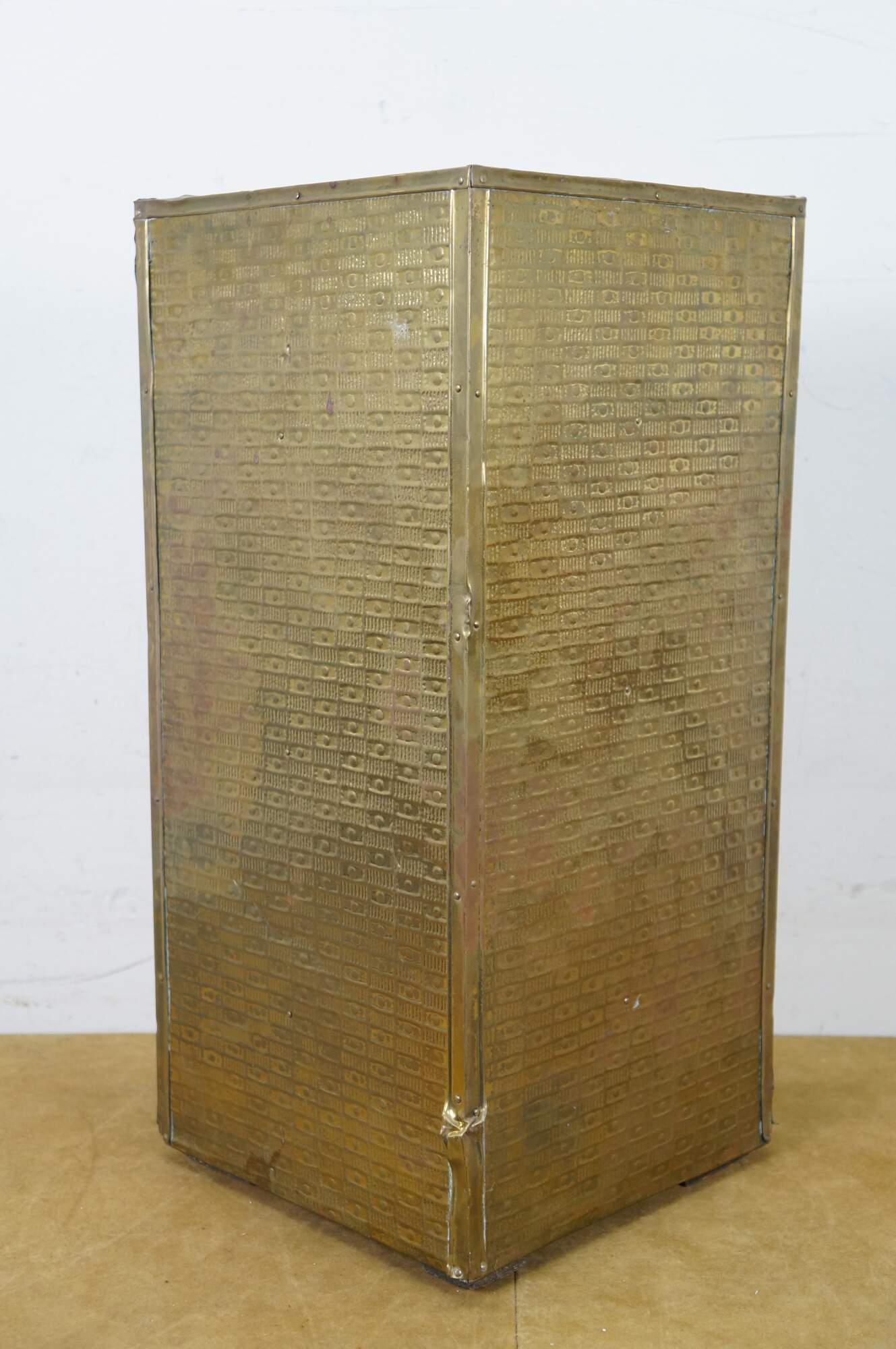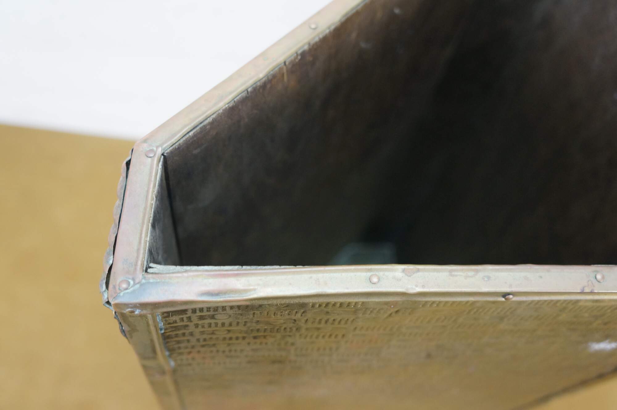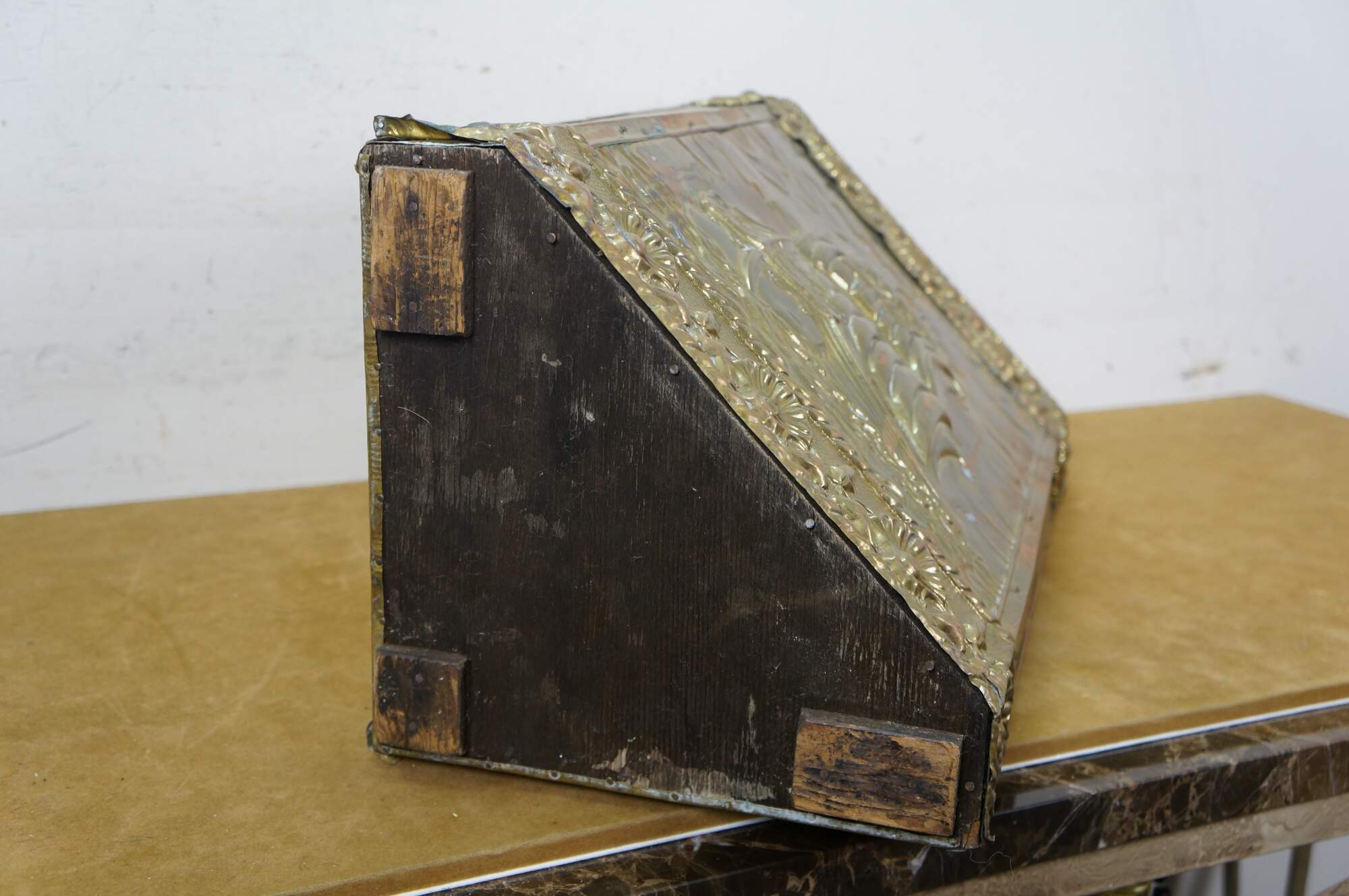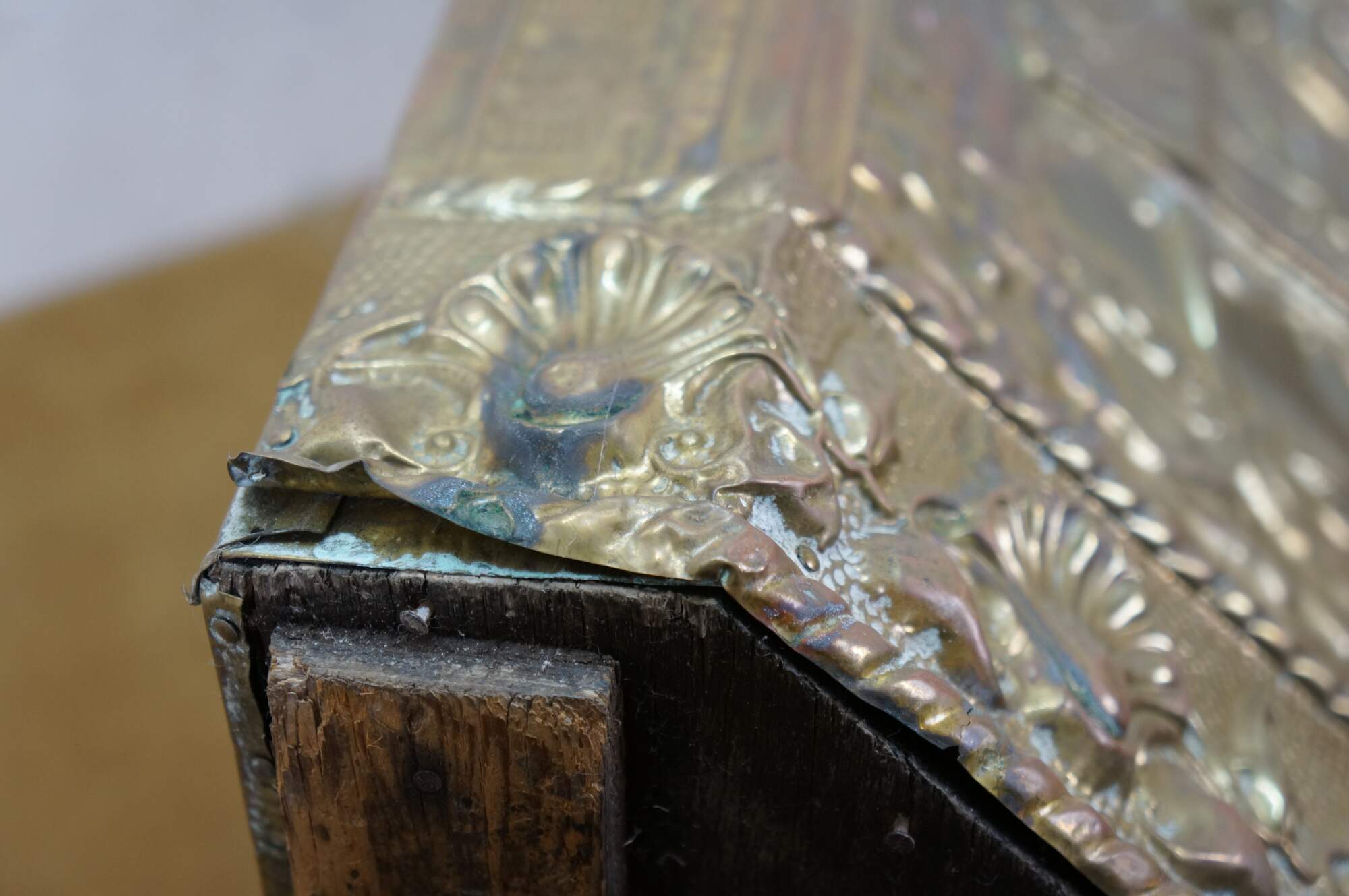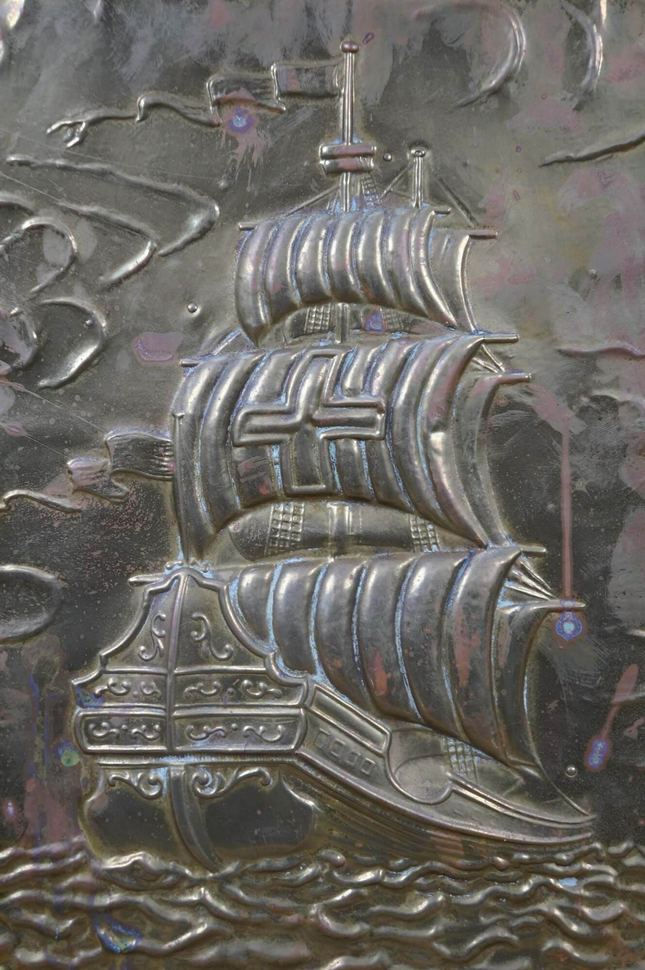 Antique circa early half of the 20th century wood and brass umbrella stand - triangular shape perfect for tucking into a corner, made of wood and clad in brass sheets embossed with large sailing ship and scallop shell trim. Includes tin insert to protect the interior of the base from dripping.