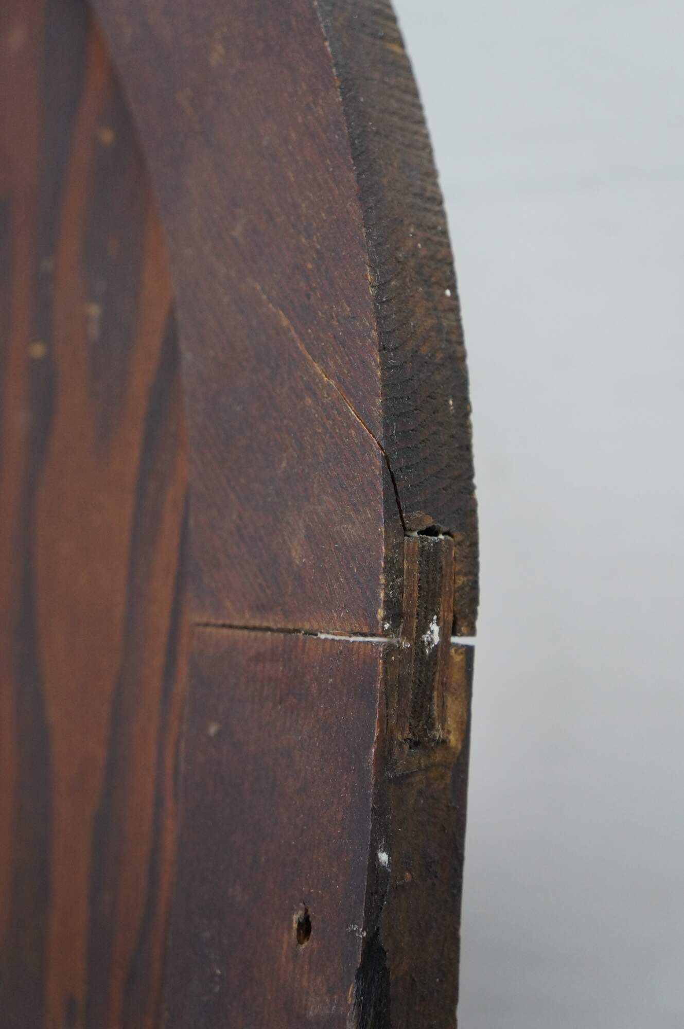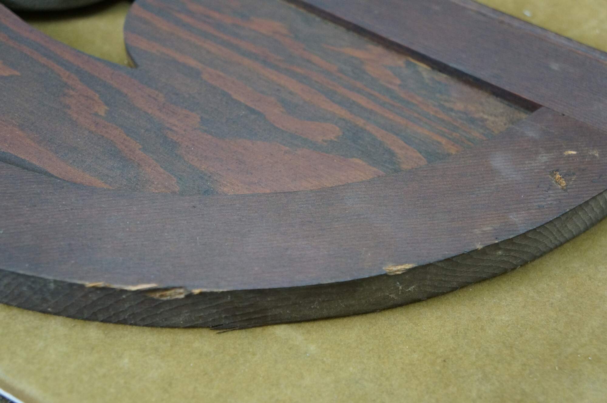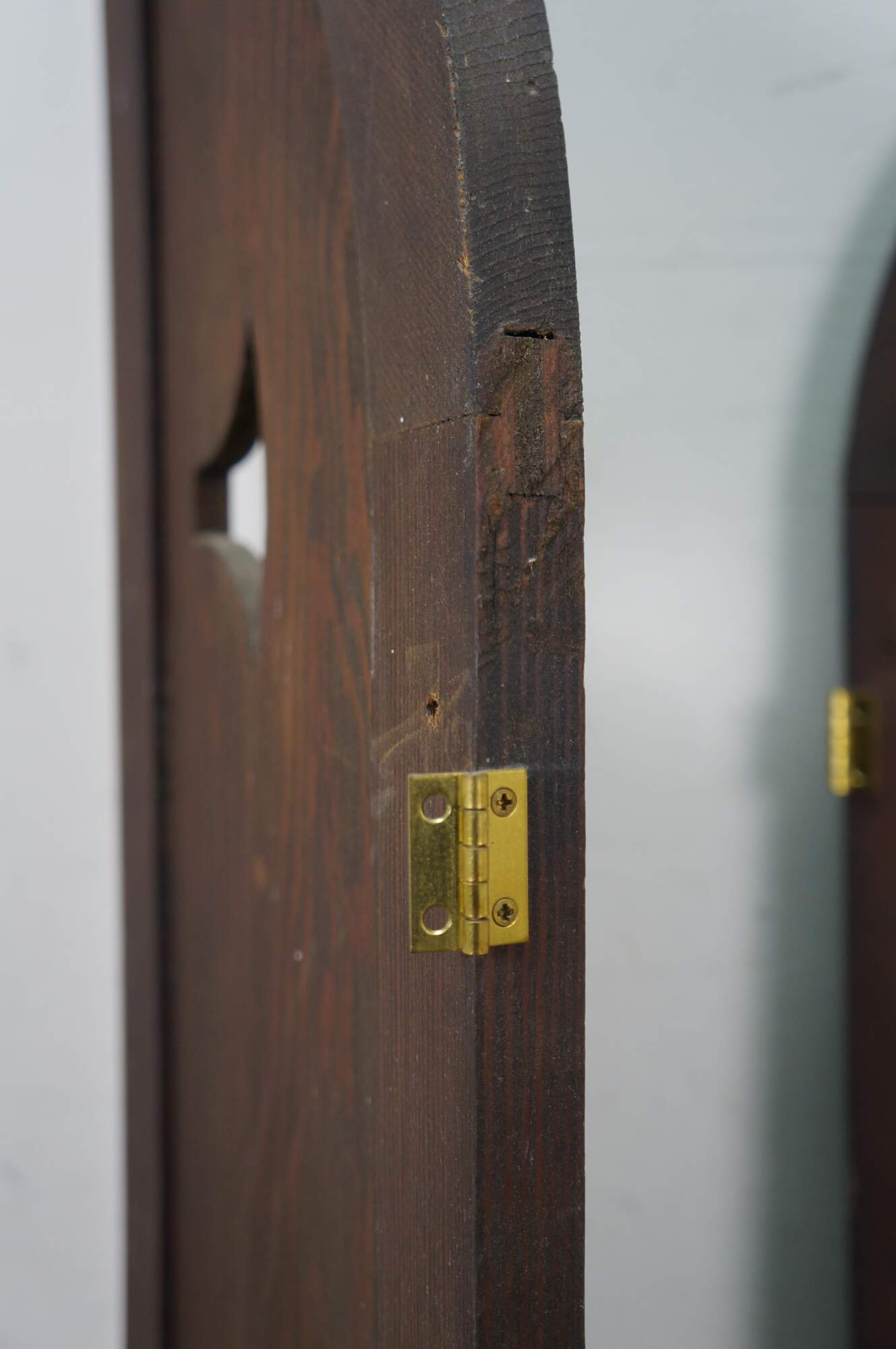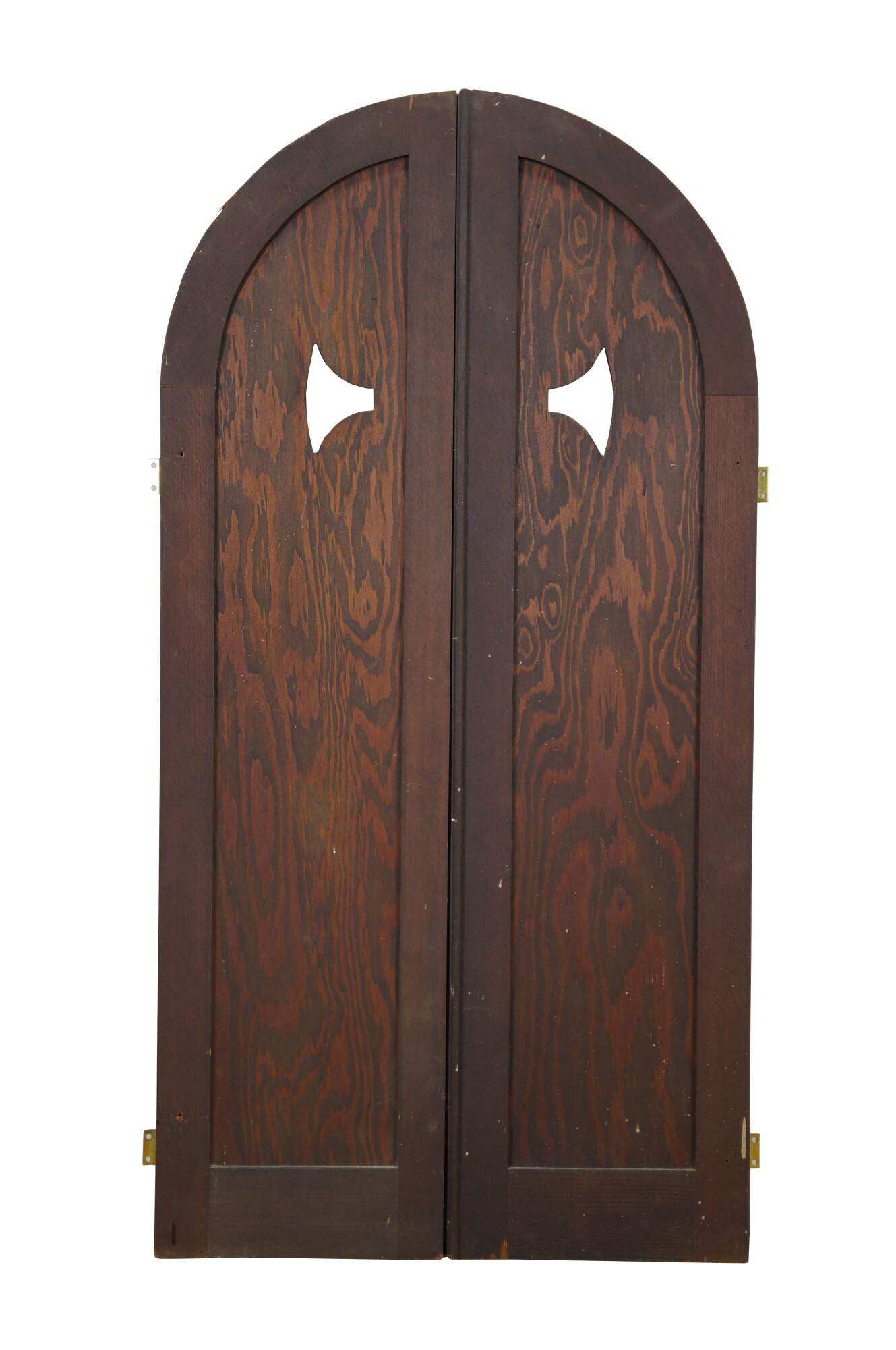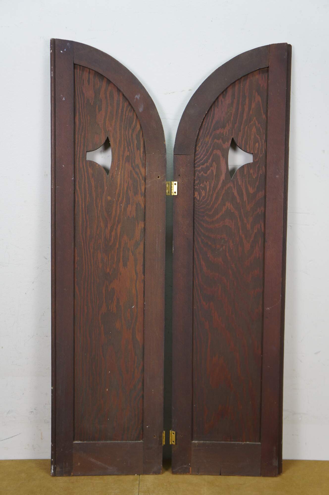 Two matching pairs of vintage window storm shutters. Made of oak with an arch shaped with axe head shaped cut outs. Contemporary hinges.