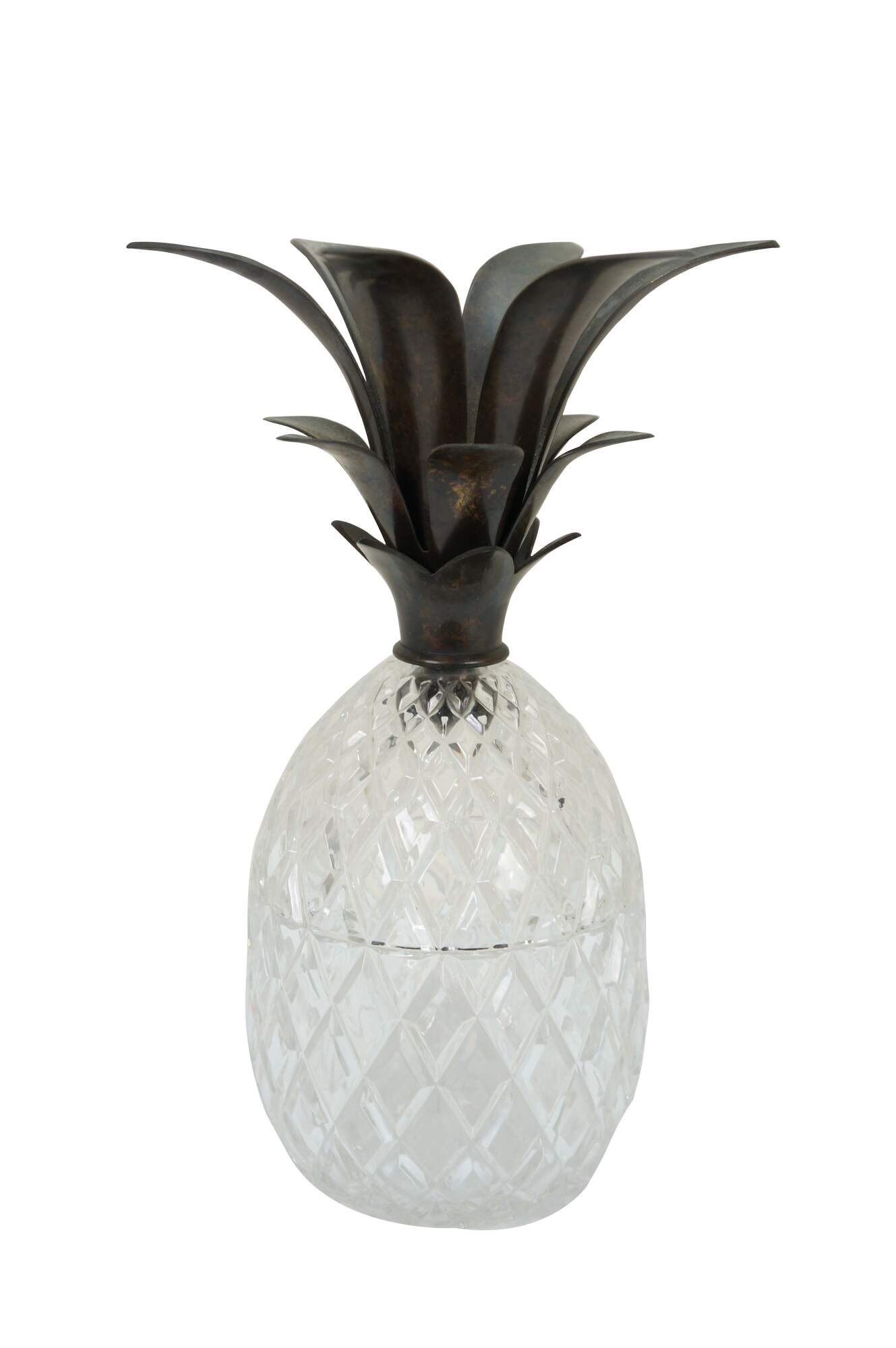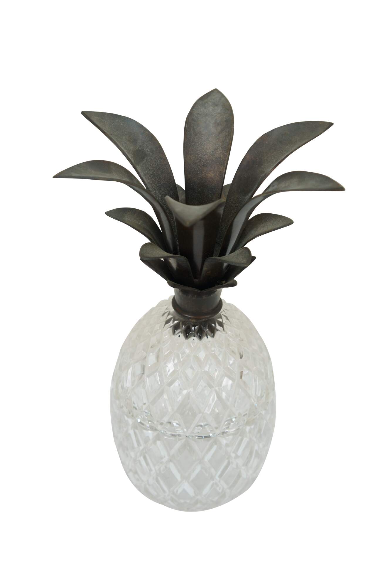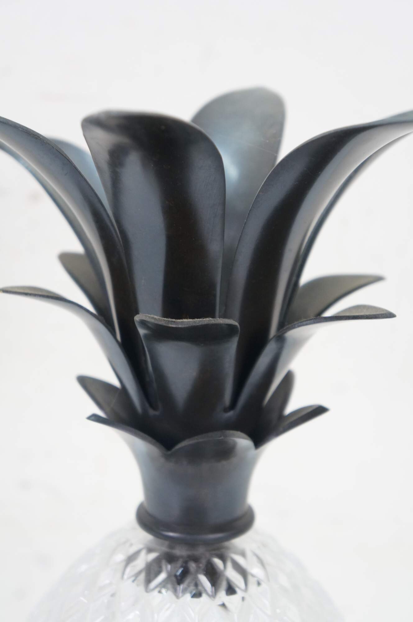 Pair of late 20th century diamond pattern cut crystal lidded jars / containers / mantel urns or compotes in the shape of pineapples with dark bronze leaves. Castilian Imports of Poland.