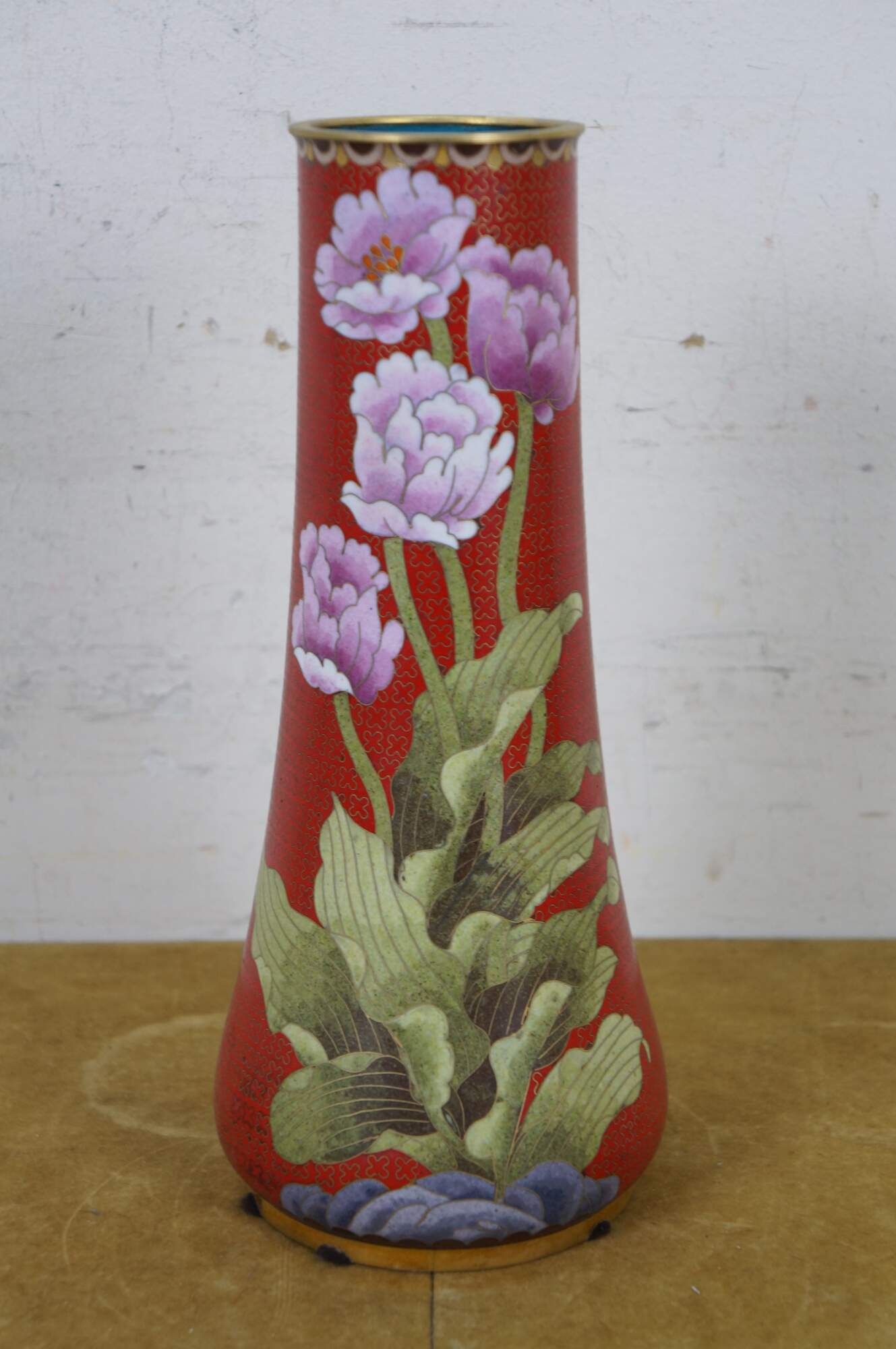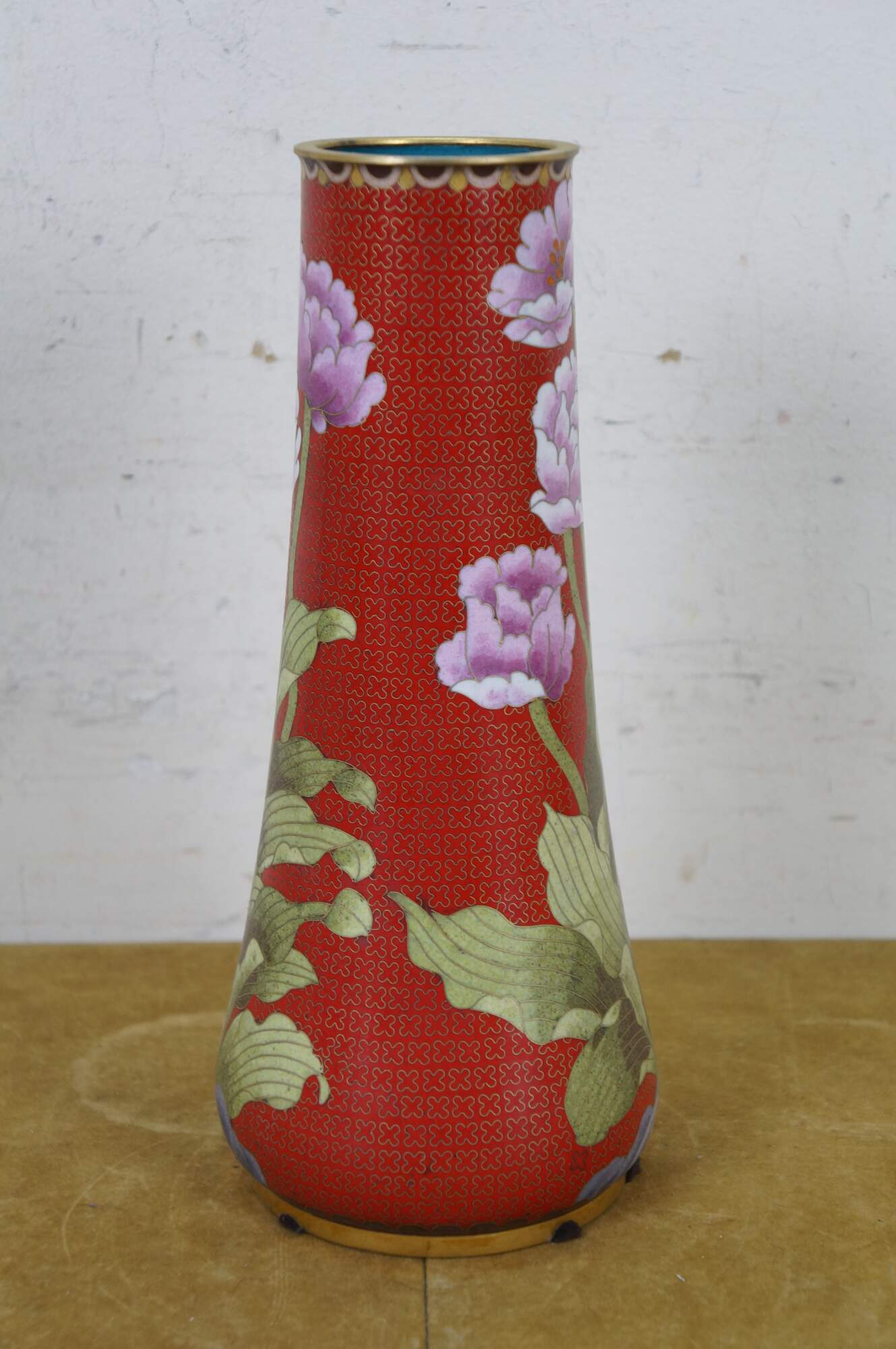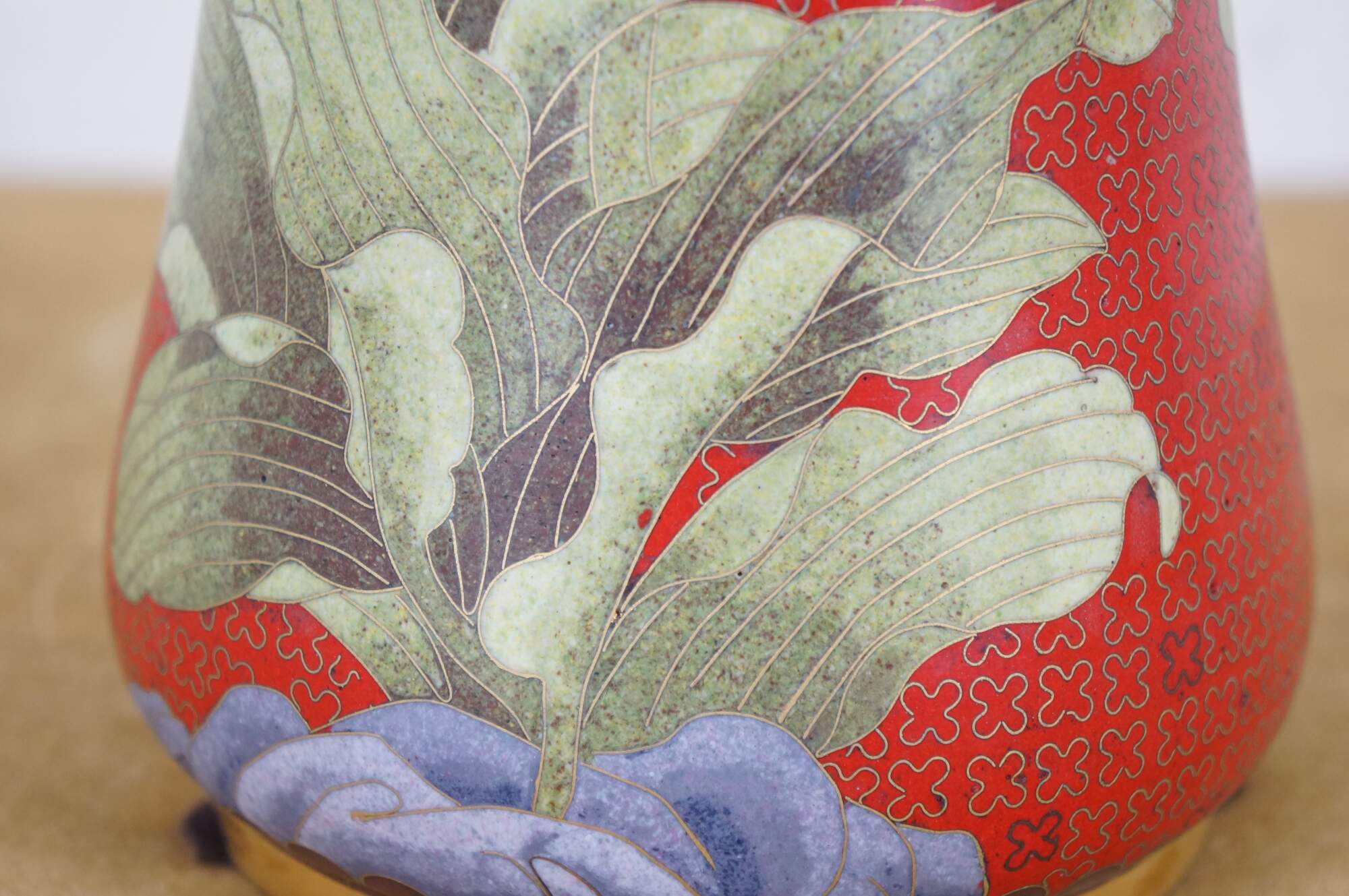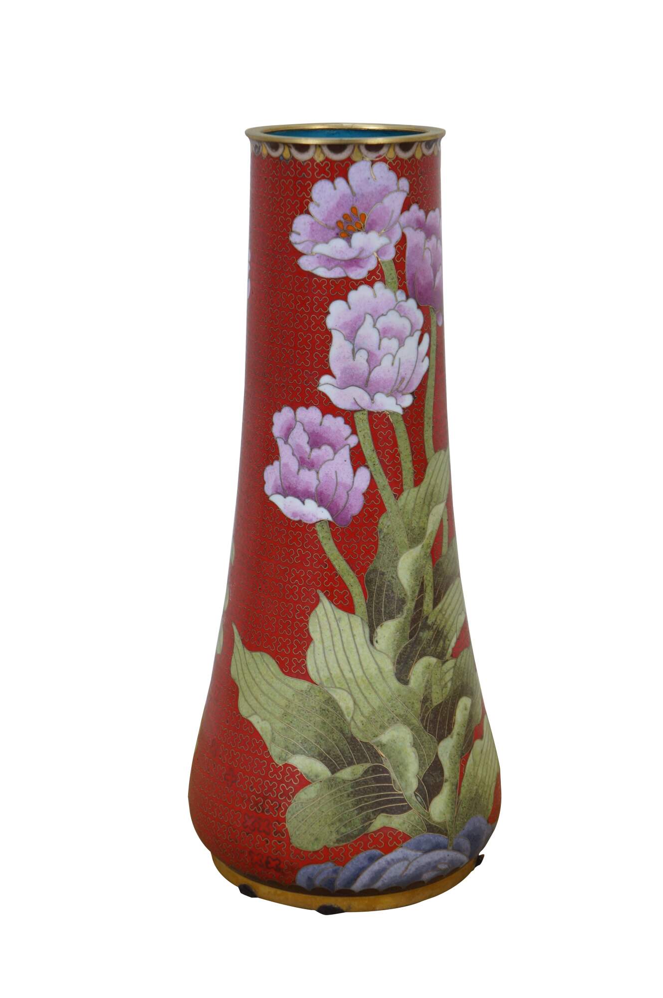 Large late 20th century Maitland Smith cloisonne flower vase - red enamel on brass featuring a design of pink / purple flowers.. Turquoise blue interior. Hand Made in China.