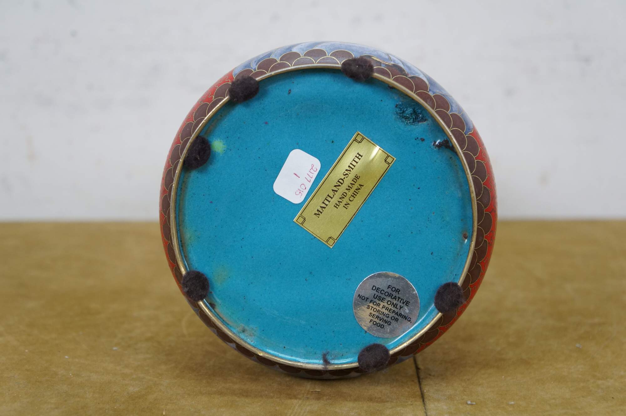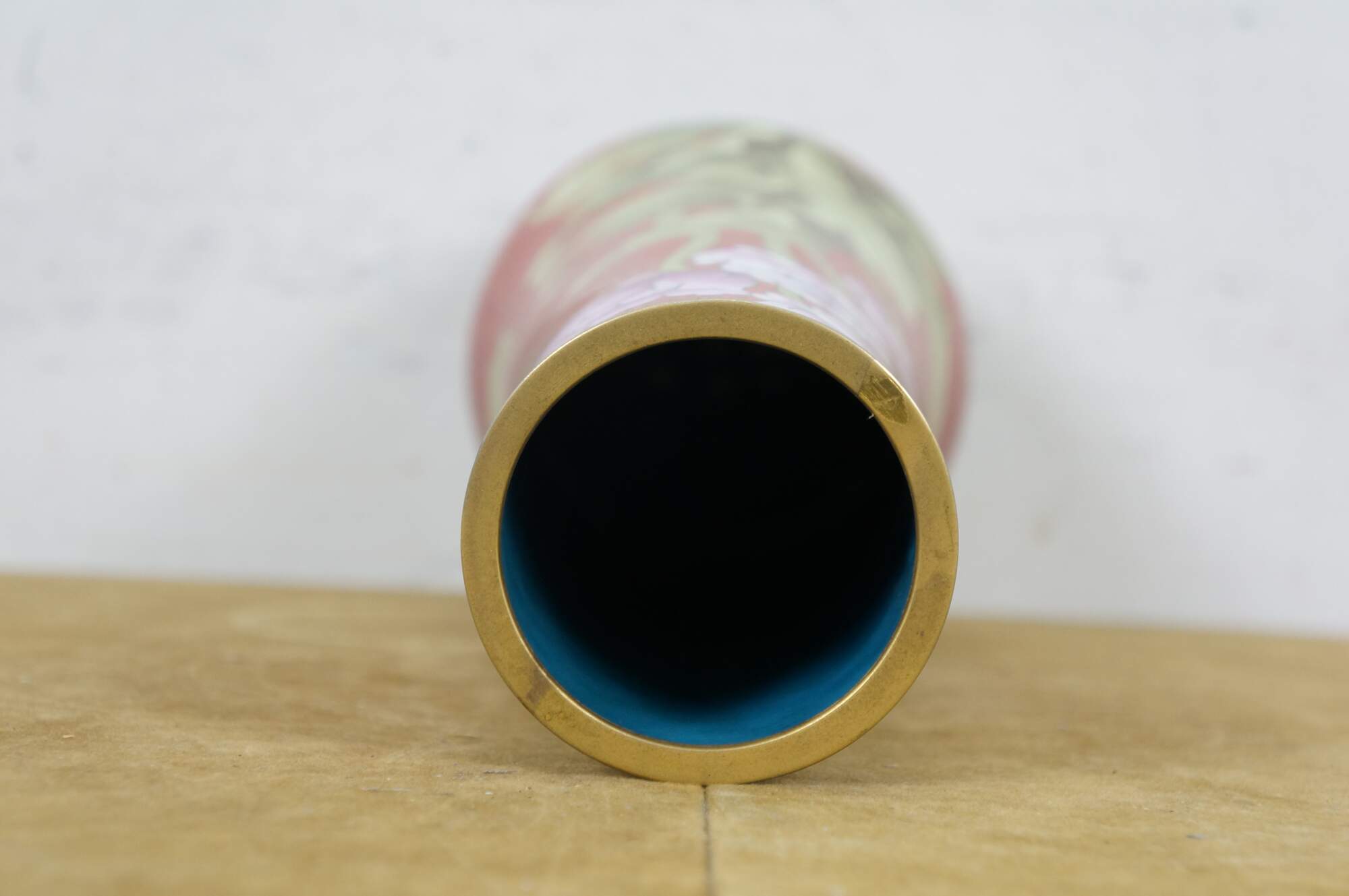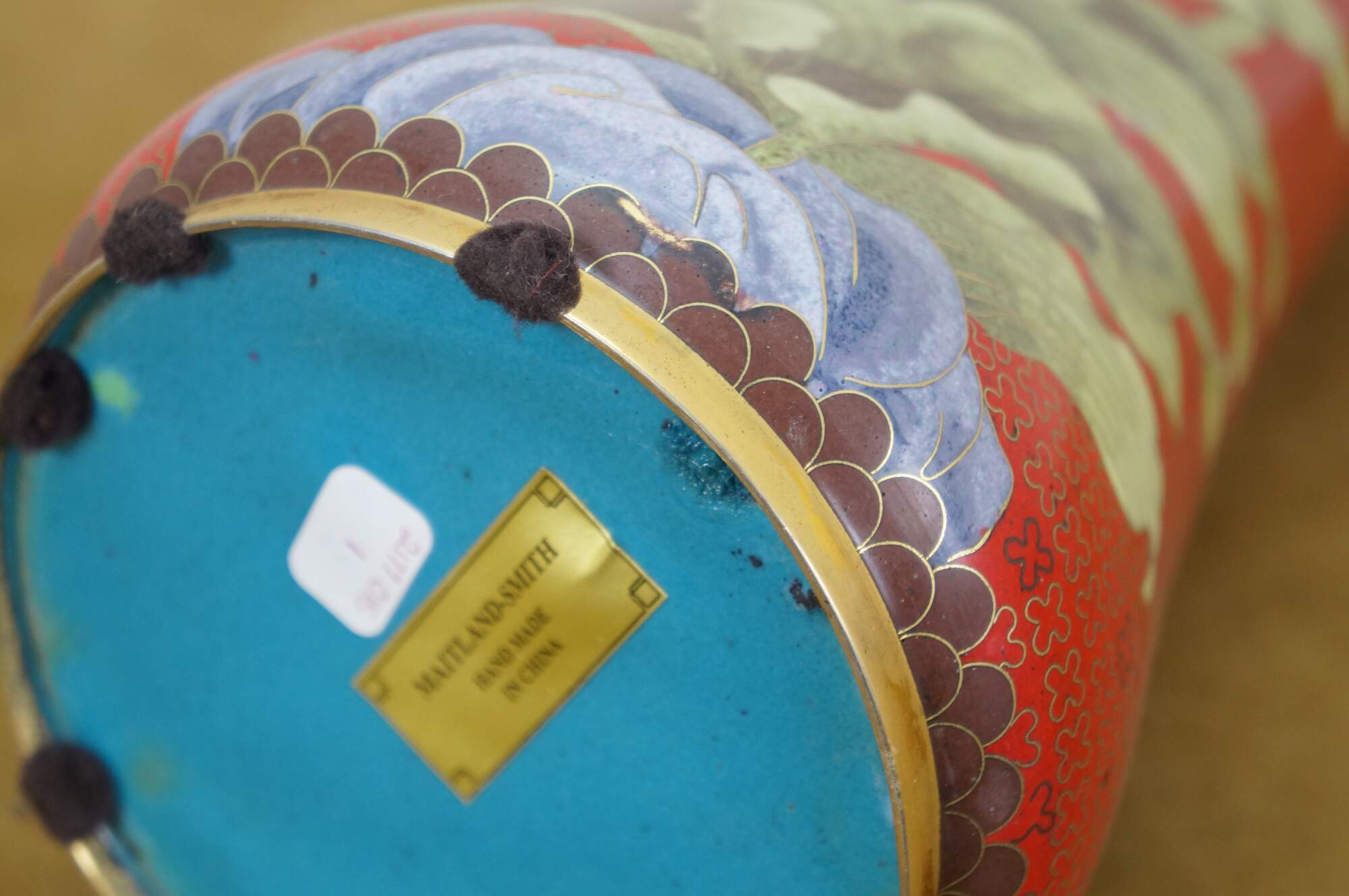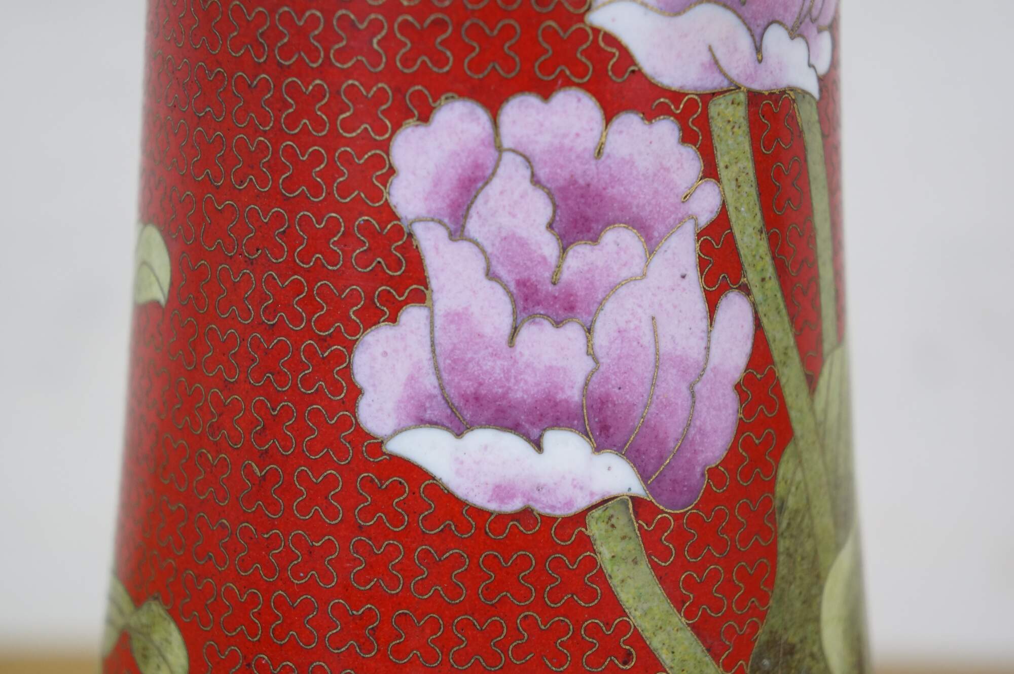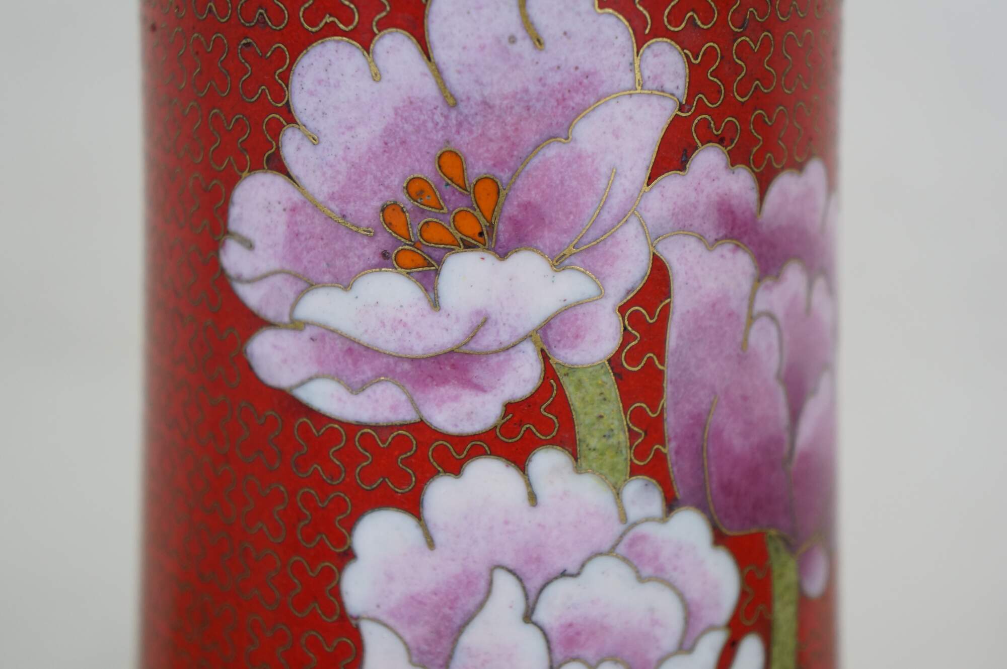 Large late 20th century Maitland Smith cloisonne flower vase - red enamel on brass featuring a design of pink / purple flowers.. Turquoise blue interior. Hand Made in China.