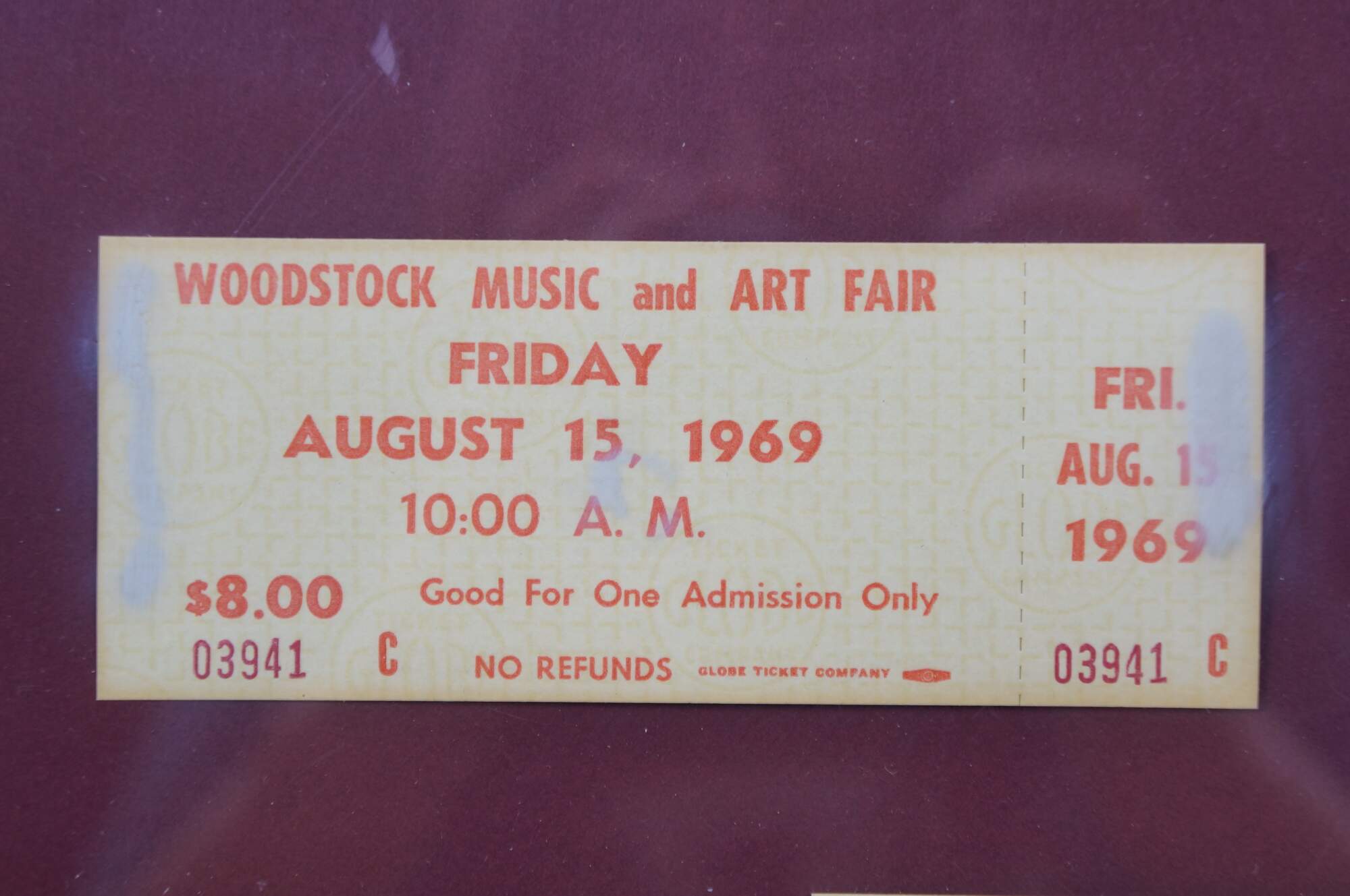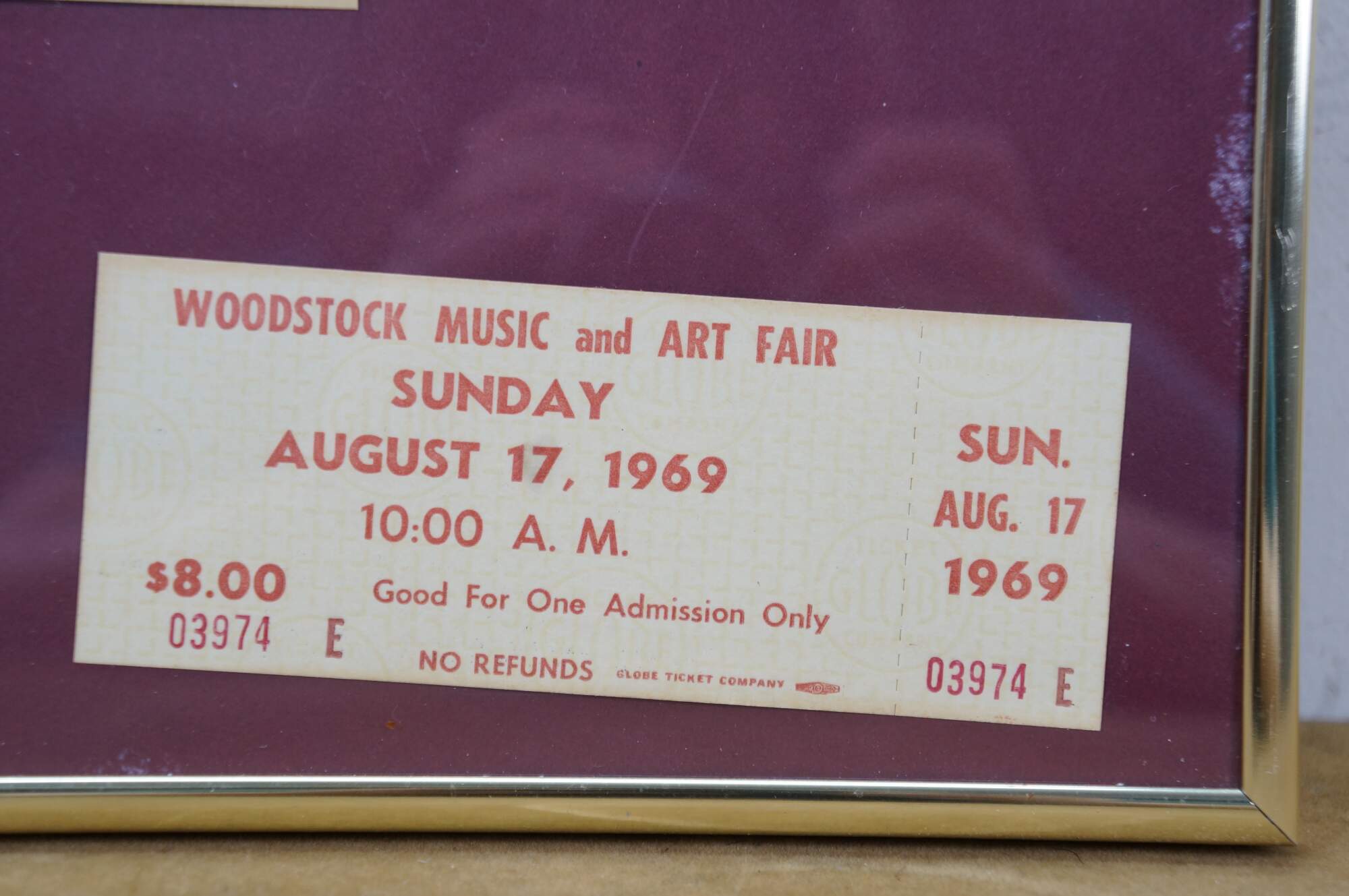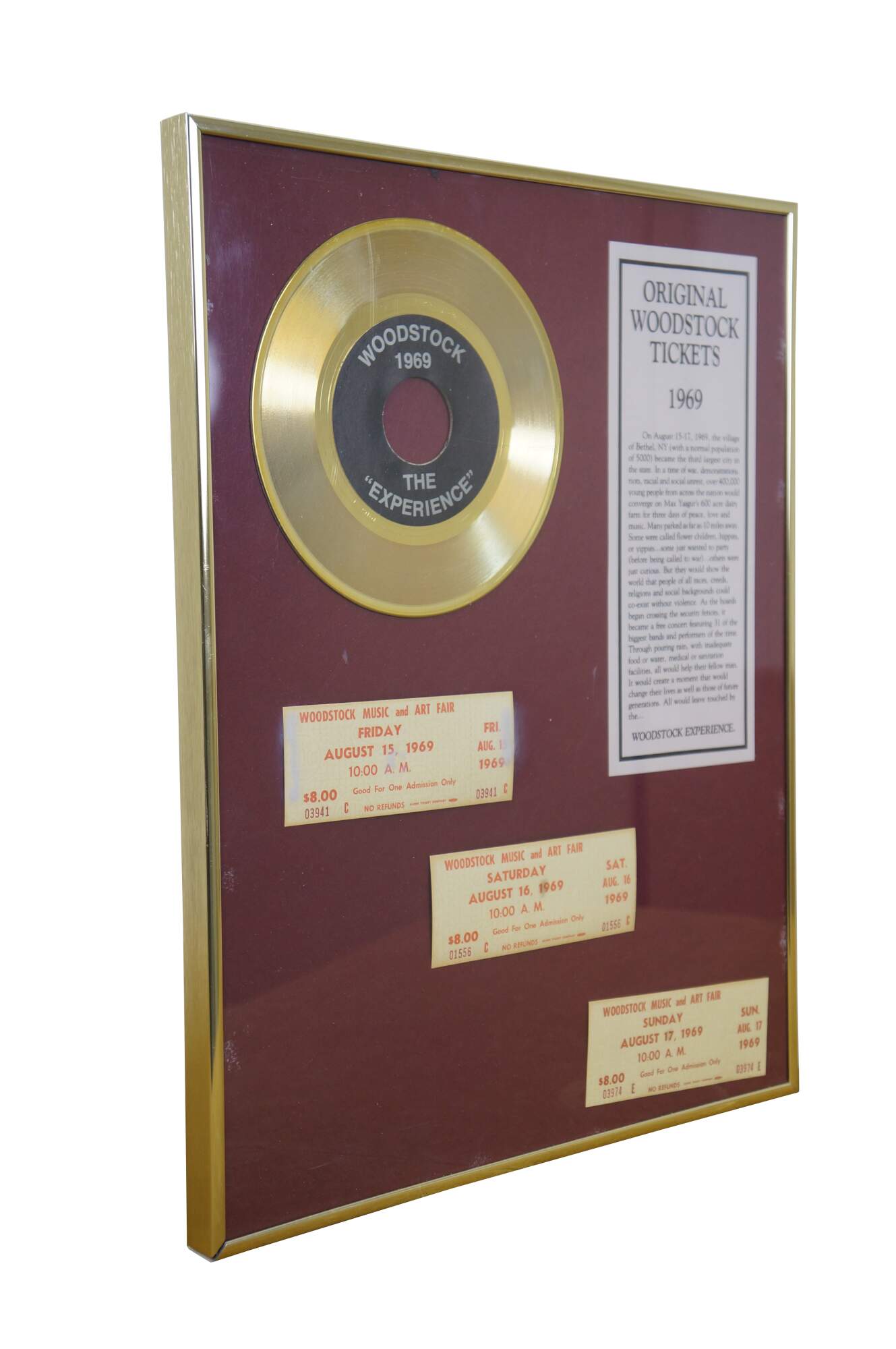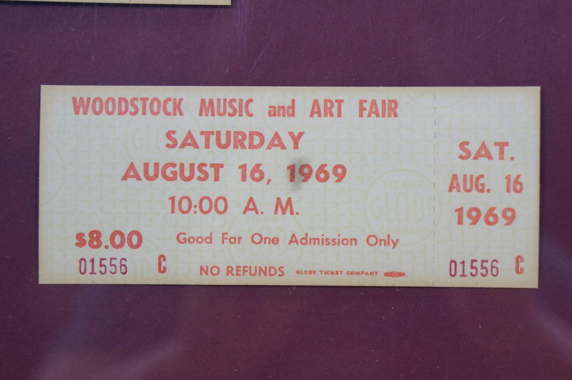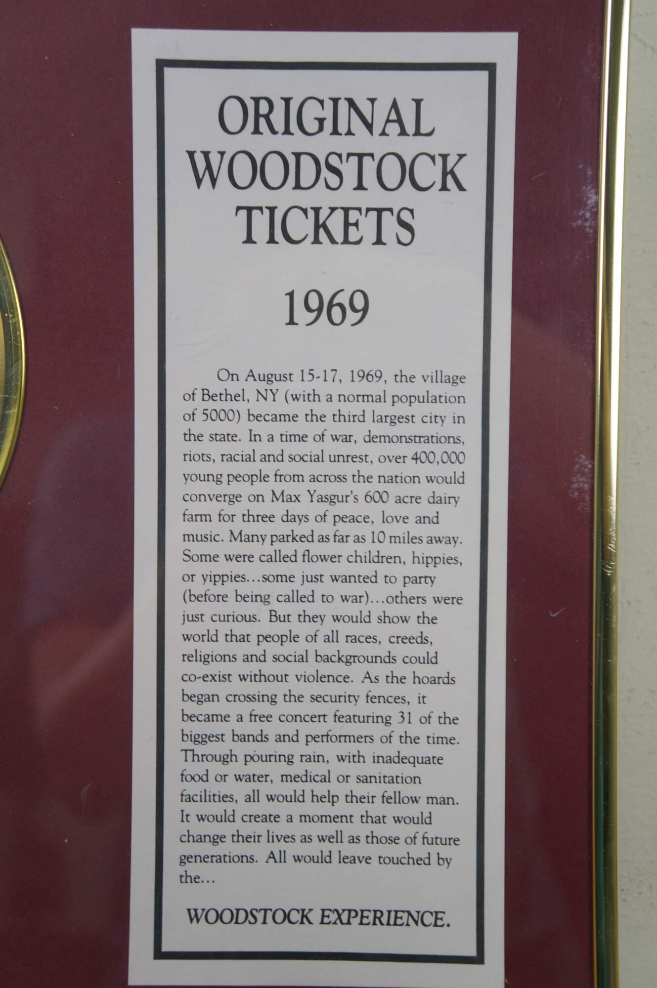 Framed display of three original 1969 tickets to woodstock, and Woodstock 1969 The "Experience" miniature LP. Includes 1991 Letters of Authenticity from Globe Ticket Company and Barnes Limited. Gold metal frame; maroon mat.
