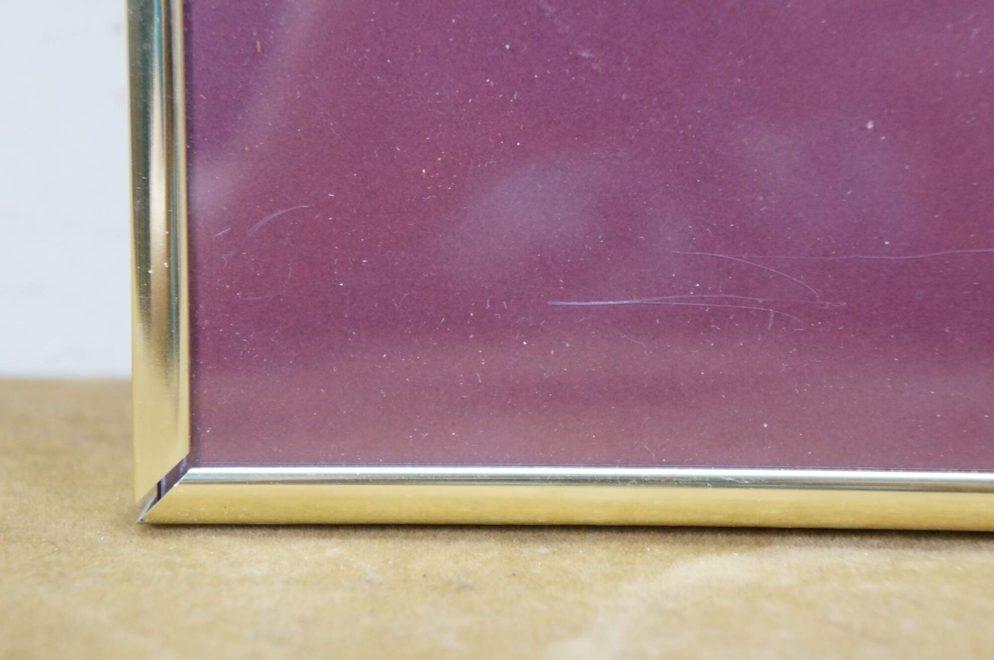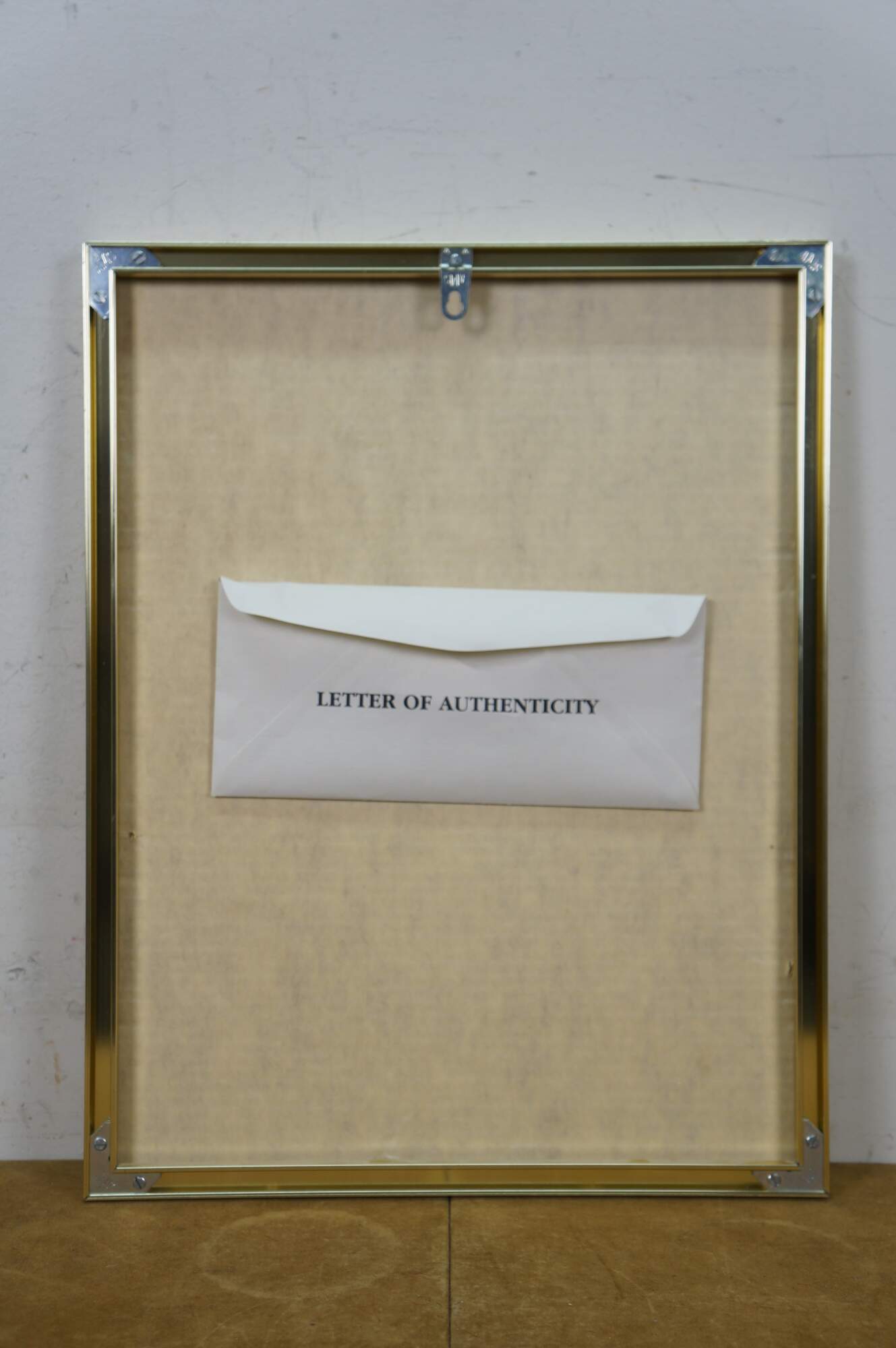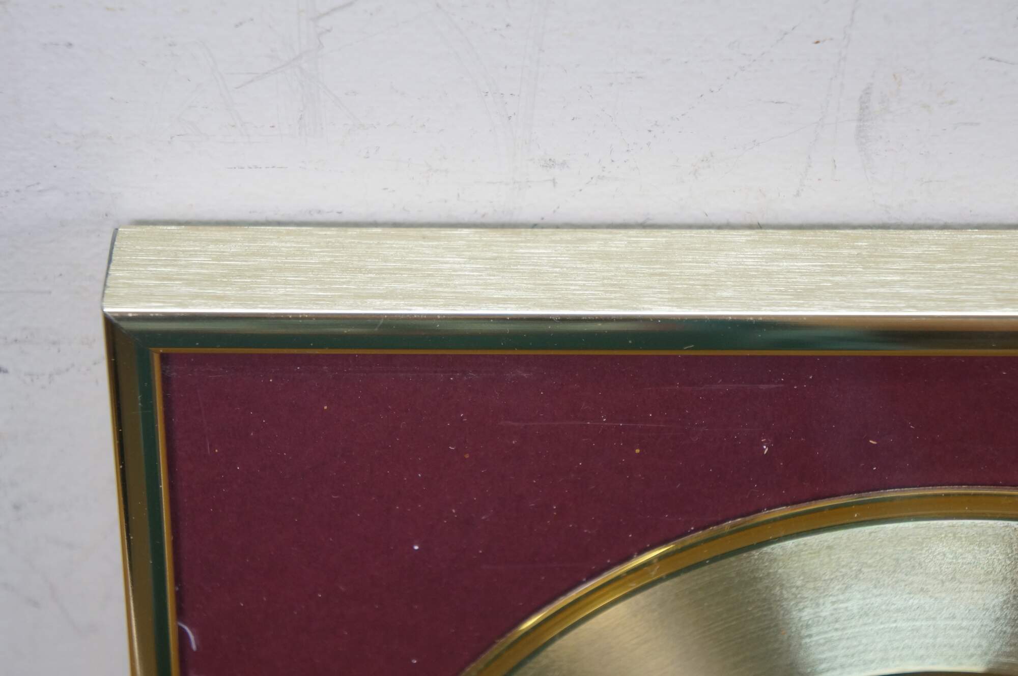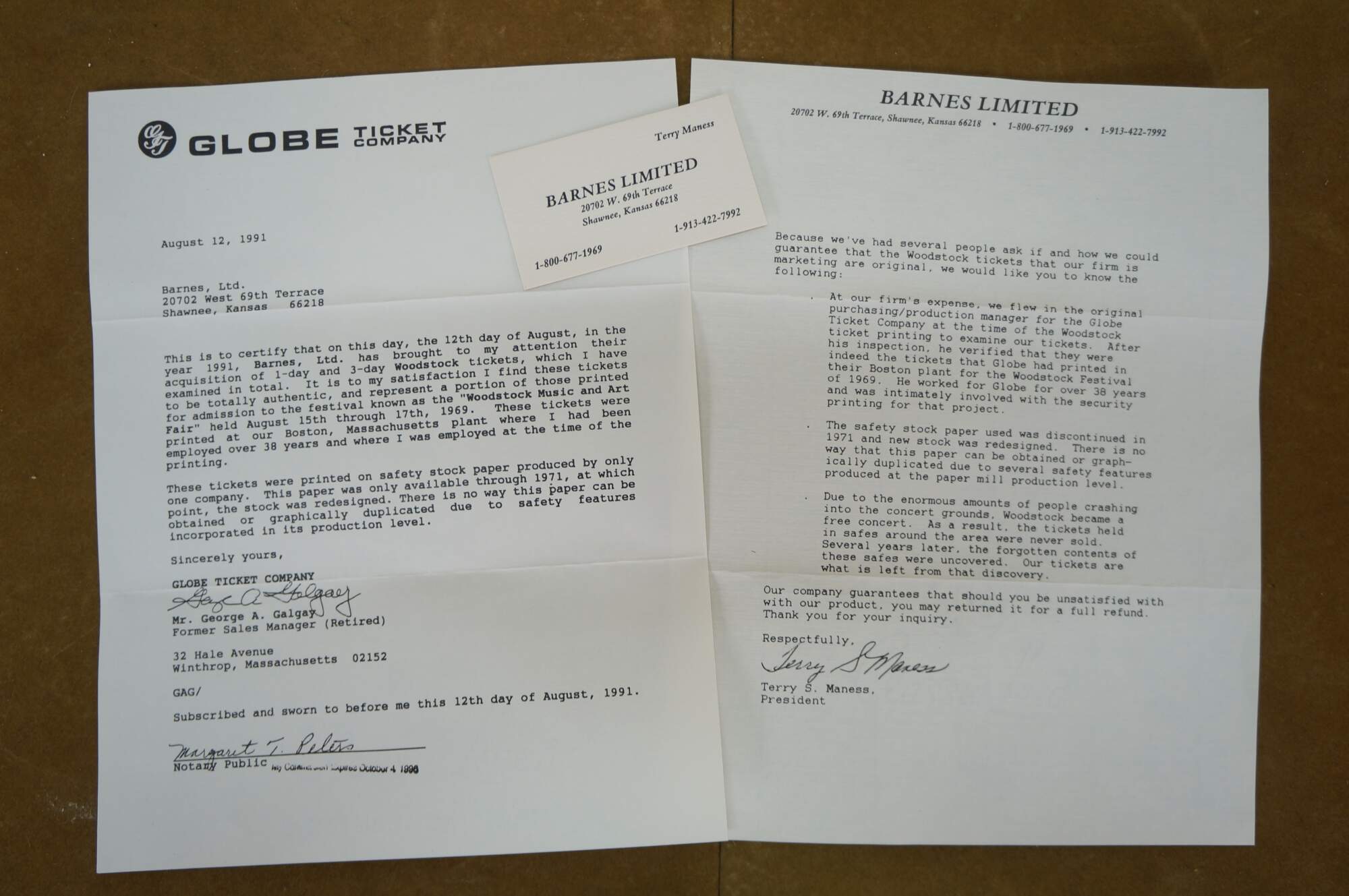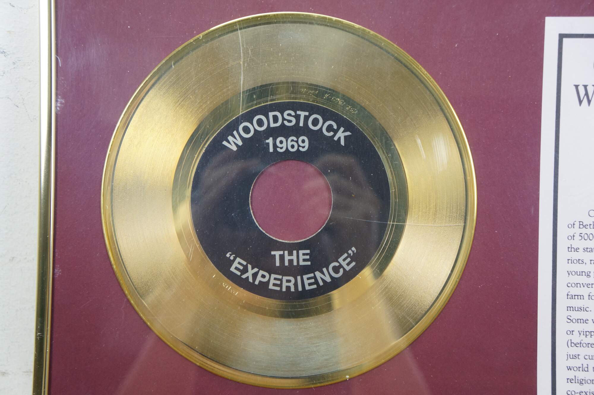 Framed display of three original 1969 tickets to woodstock, and Woodstock 1969 The "Experience" miniature LP. Includes 1991 Letters of Authenticity from Globe Ticket Company and Barnes Limited. Gold metal frame; maroon mat.