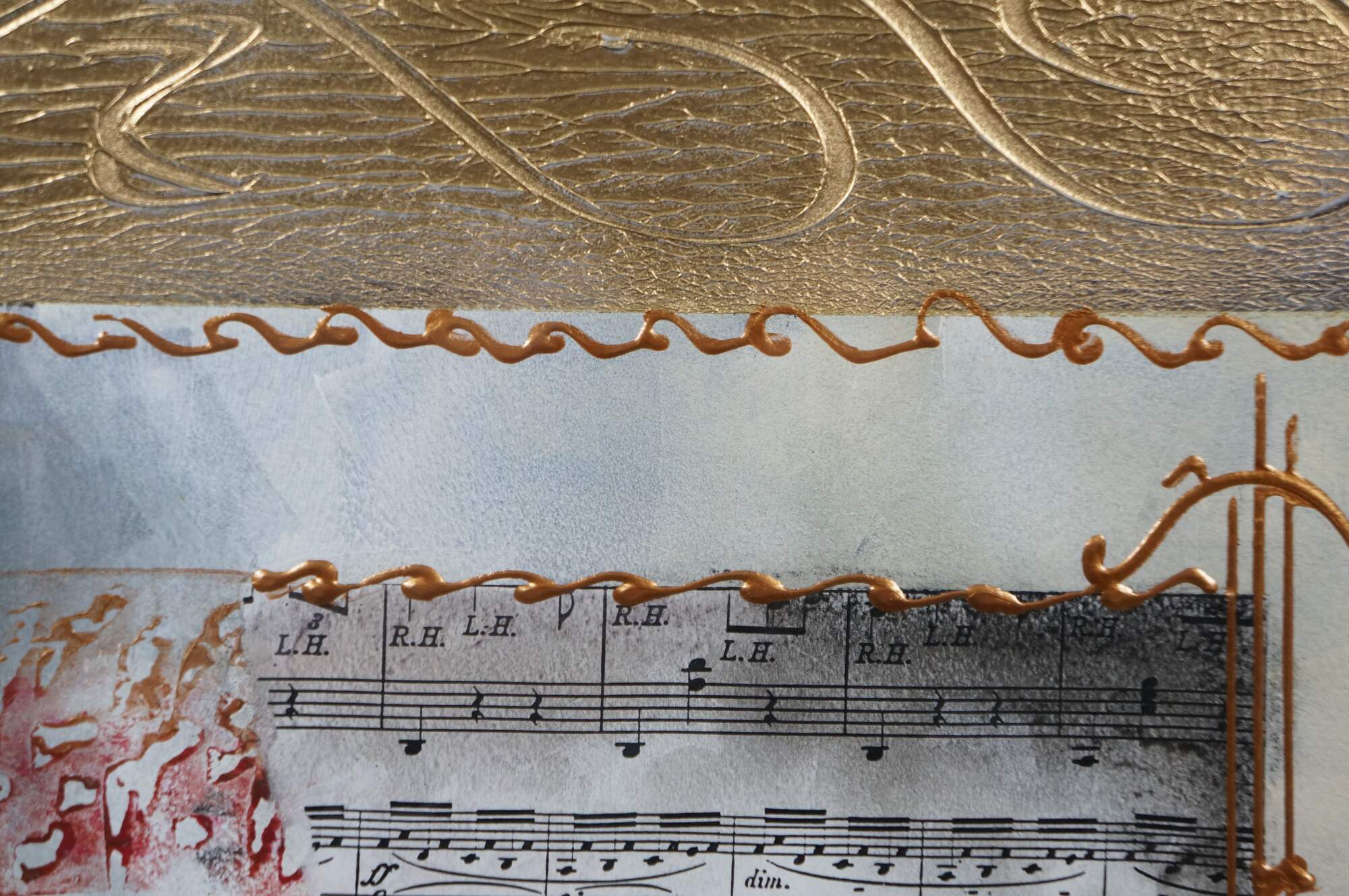 Set of three mixed media abstract triptych artworks by Kamy Deljou. Wood frames with a hint of gilding; white mat.